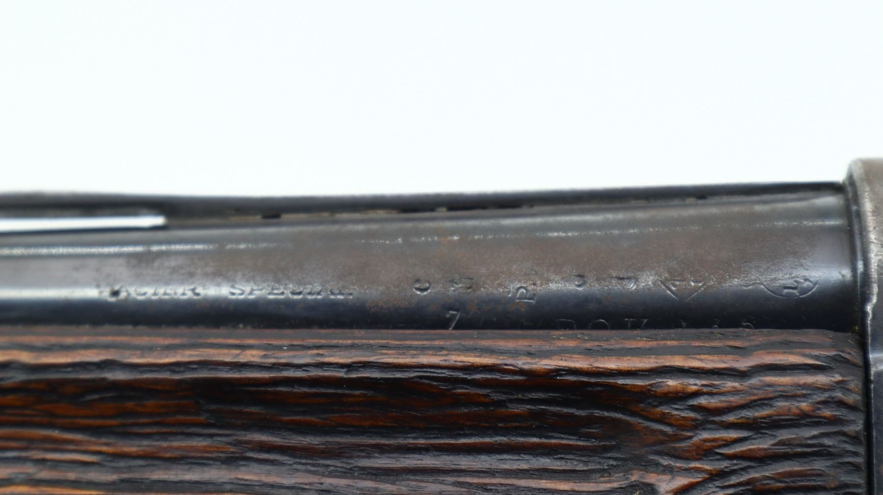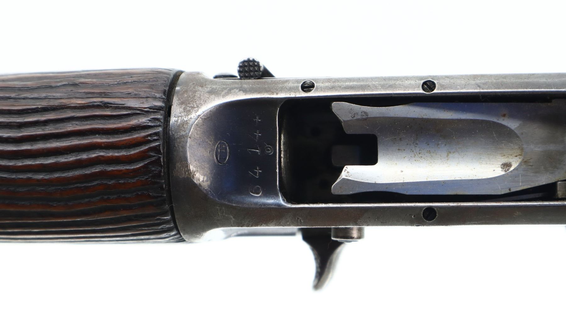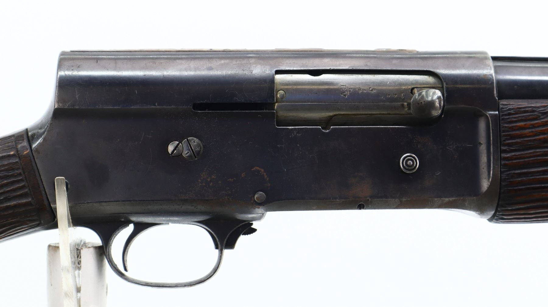 2/10, FN, MODEL: AUTO 5, CALIBER:12 G X 2 3/4", BORE IS FAIR. CUTTS COMPENSATOR AT MUZZLE, NO SIGHTS. VENT RIBBED BARREL WITH MODIFICATIONS AND REPAIRS, RECEIVER DRILLED AND TAPPED WITH SOLDERED/WELLED REMAINING ON TOP. REPLACED TWO PIECE WOOD STOCK, EXTENDED PISTOL GRIP, RAISED CHEEK PIECE, SMOOTH BUTT, STOCKS SHOW MODIFICATIONS AND TEXTURING. METAL FINISH SHOWS PITTING, LIGHT RUST, HANDLING MARKS AND WEAR. STOCKS SHOW MARKS, SCRATCHES AND WEAR. , ACTION: SEMI AUTOMATIC SHOTGUN, BARREL LENGTH: 23.75", SERIAL # 64144, CONDITION: 2/10, CLASS: CANADIAN NON RESTRICTED