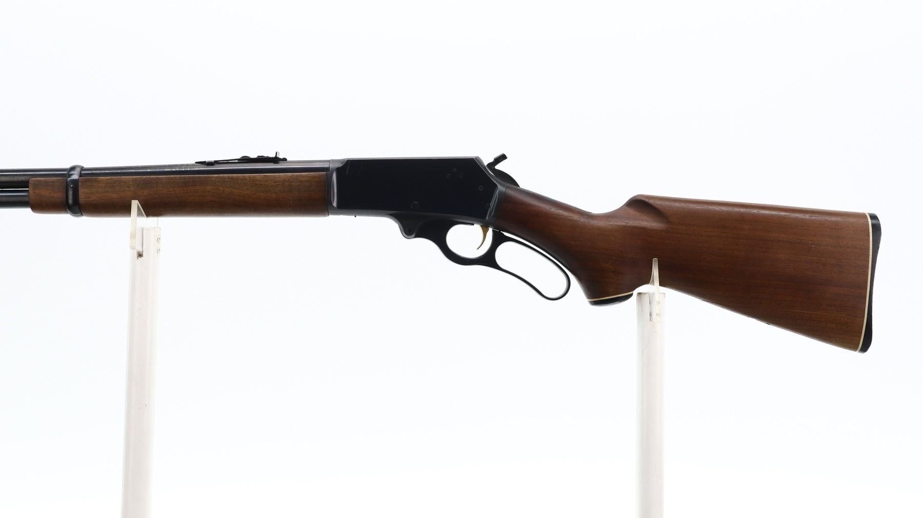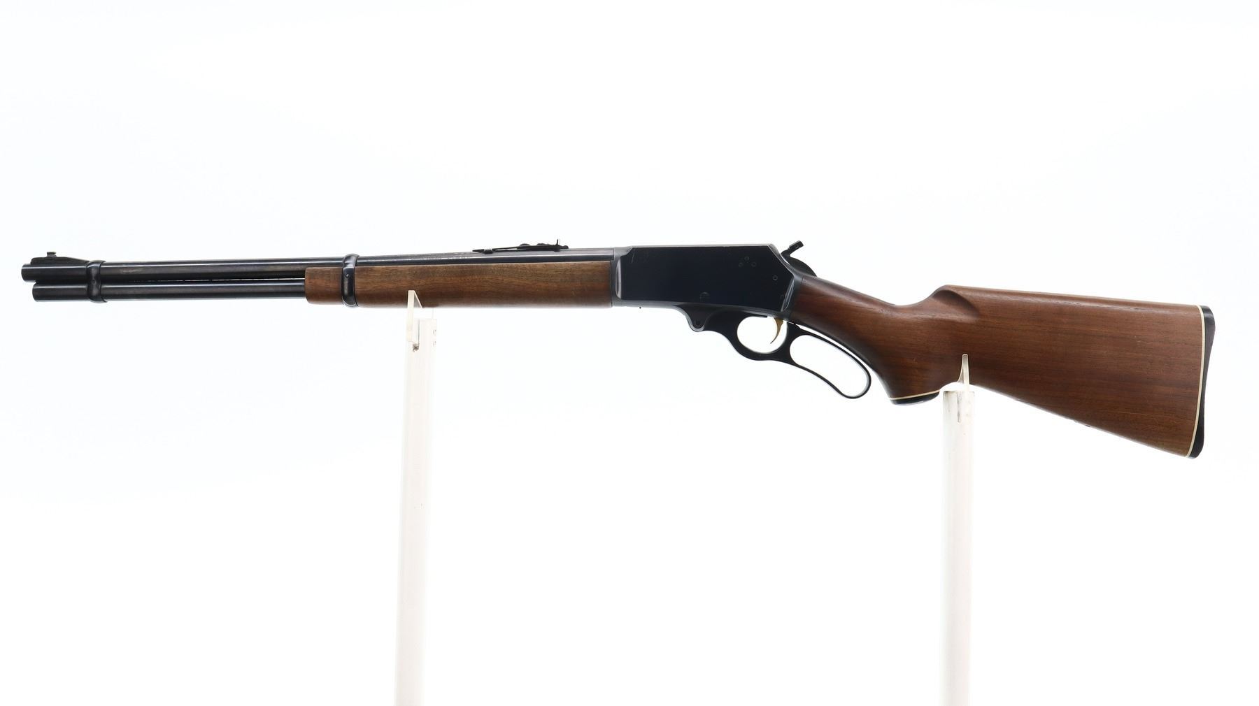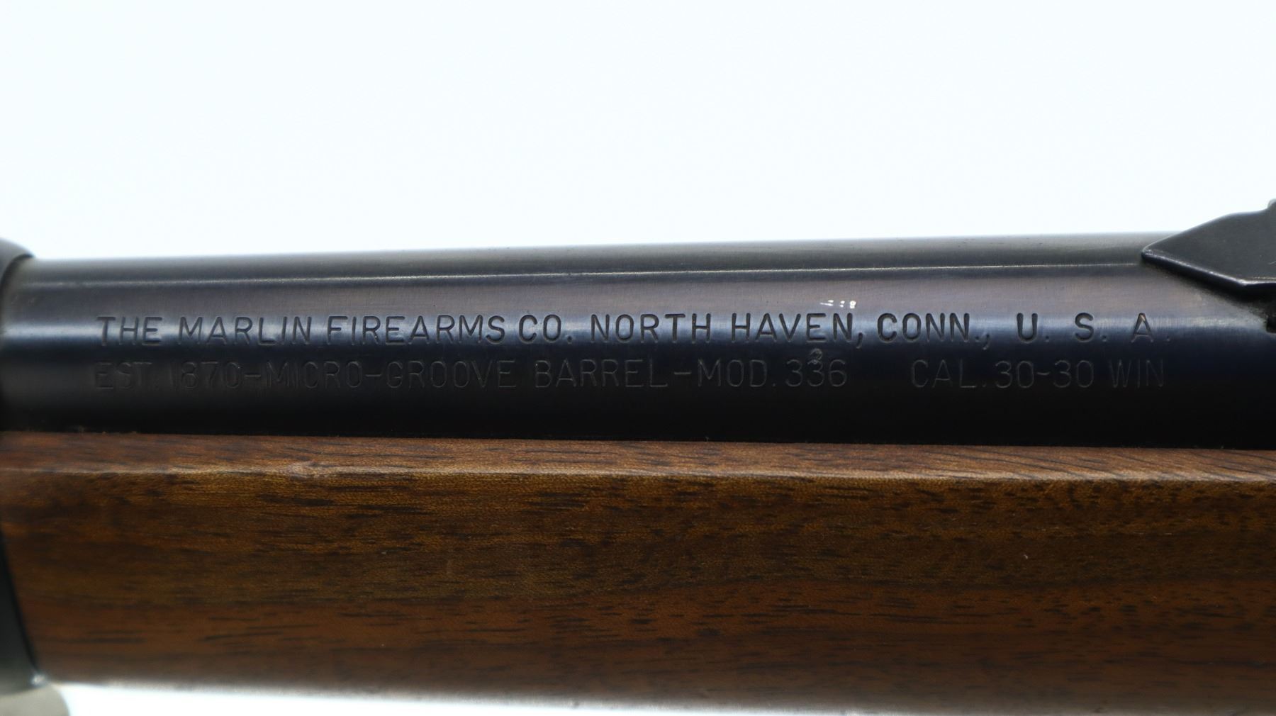 5/10, MARLIN JM, MODEL: 336, CALIBER:30-30 WIN, BORE IS VERY GOOD. BLADE FRONT SIGHT WITH RAMP, ADJUSTABLE U NOTCHED REAR SIGHT, BLUED FINISH, RECEIVER DRILLED AND TAPPED FOR SCOPE MOUNT, WITH PLUG SCREWS INSTALLED, GROOVED HAMMER WITH EXTENSION, GOLD TRIGGER. TWO PIECE SMOOTH WOOD STOCKS, PISTOL GRIP WITH CAP, CHECKERED BLACK POLYMER BUTT PLATE, TOW OF STOCK IS CRACKED WITH TWO HOLES, RIGHT SIDE OF STOCK HAS MARLIN MEDALLION 1870-1970, FULL LENGTH MAG TUBE. METAL FINISH SHOWS SOME SCRATCHES, HANDLING MARKS AND WEAR. STOCKS SHOW SOME MARKS, SCRATCHES AND WEAR., ACTION: LEVER ACTION RIFLE, BARREL LENGTH: 20", SERIAL # 69134302, CONDITION: 5/10, CLASS: CANADIAN NON RESTRICTED