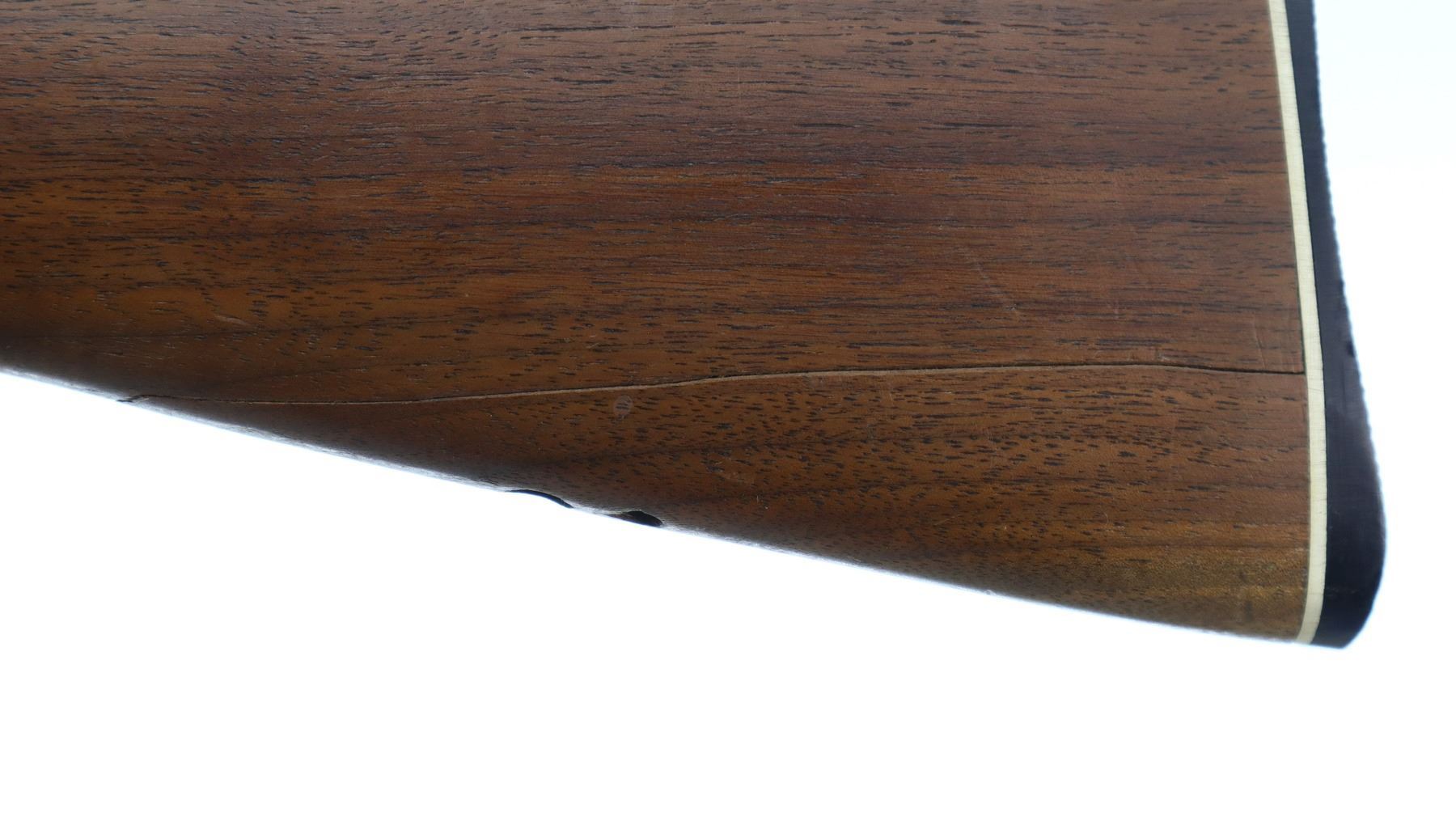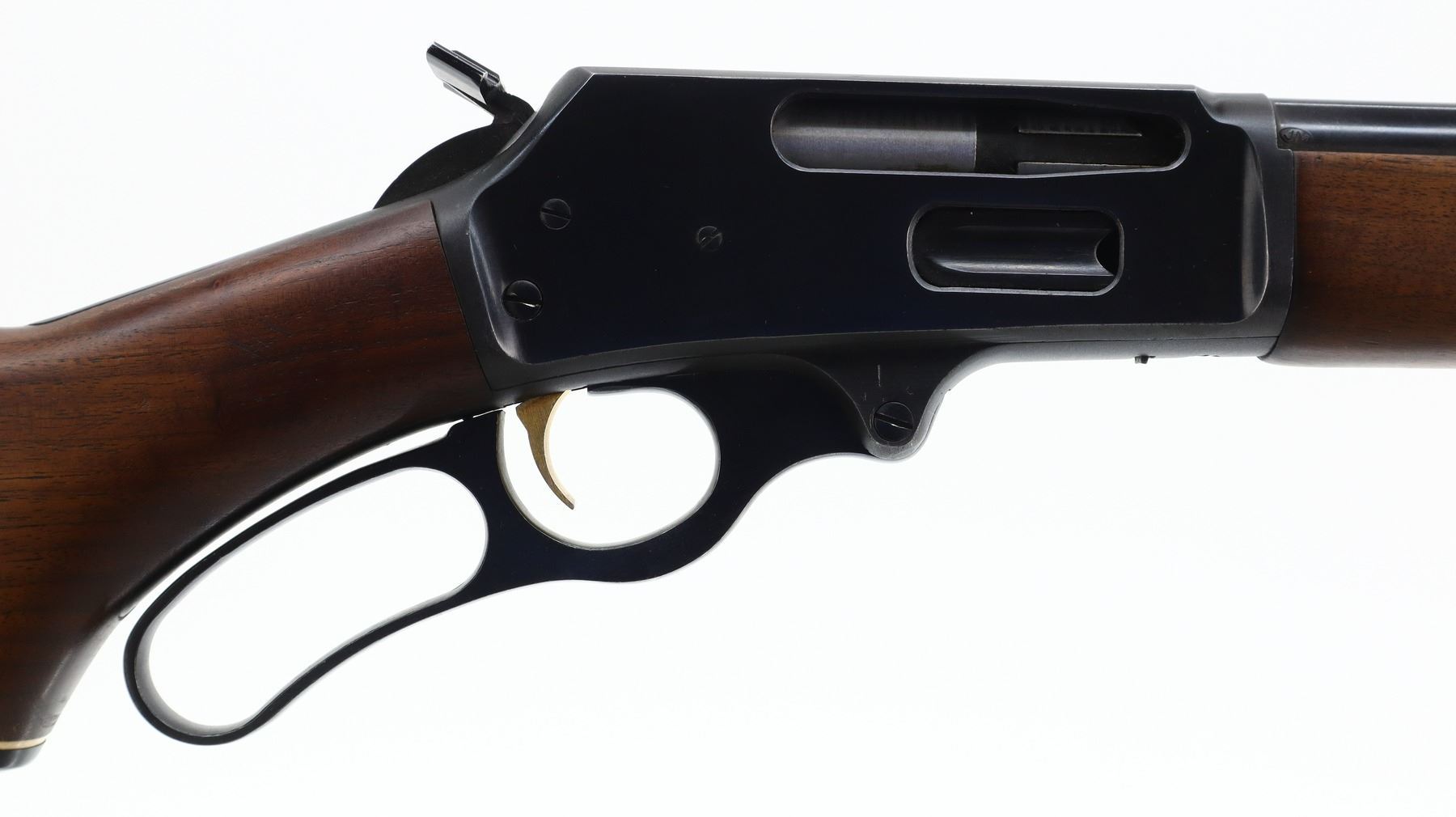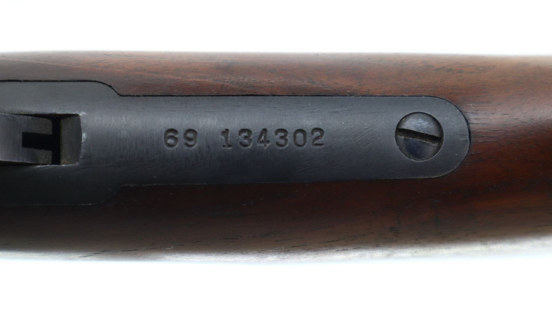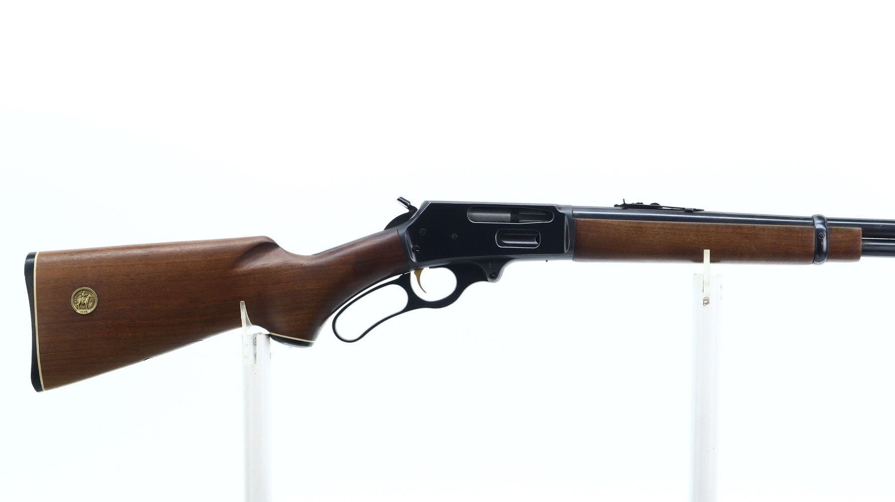5/10, MARLIN JM, MODEL: 336, CALIBER:30-30 WIN, BORE IS VERY GOOD. BLADE FRONT SIGHT WITH RAMP, ADJUSTABLE U NOTCHED REAR SIGHT, BLUED FINISH, RECEIVER DRILLED AND TAPPED FOR SCOPE MOUNT, WITH PLUG SCREWS INSTALLED, GROOVED HAMMER WITH EXTENSION, GOLD TRIGGER. TWO PIECE SMOOTH WOOD STOCKS, PISTOL GRIP WITH CAP, CHECKERED BLACK POLYMER BUTT PLATE, TOW OF STOCK IS CRACKED WITH TWO HOLES, RIGHT SIDE OF STOCK HAS MARLIN MEDALLION 1870-1970, FULL LENGTH MAG TUBE. METAL FINISH SHOWS SOME SCRATCHES, HANDLING MARKS AND WEAR. STOCKS SHOW SOME MARKS, SCRATCHES AND WEAR., ACTION: LEVER ACTION RIFLE, BARREL LENGTH: 20", SERIAL # 69134302, CONDITION: 5/10, CLASS: CANADIAN NON RESTRICTED
