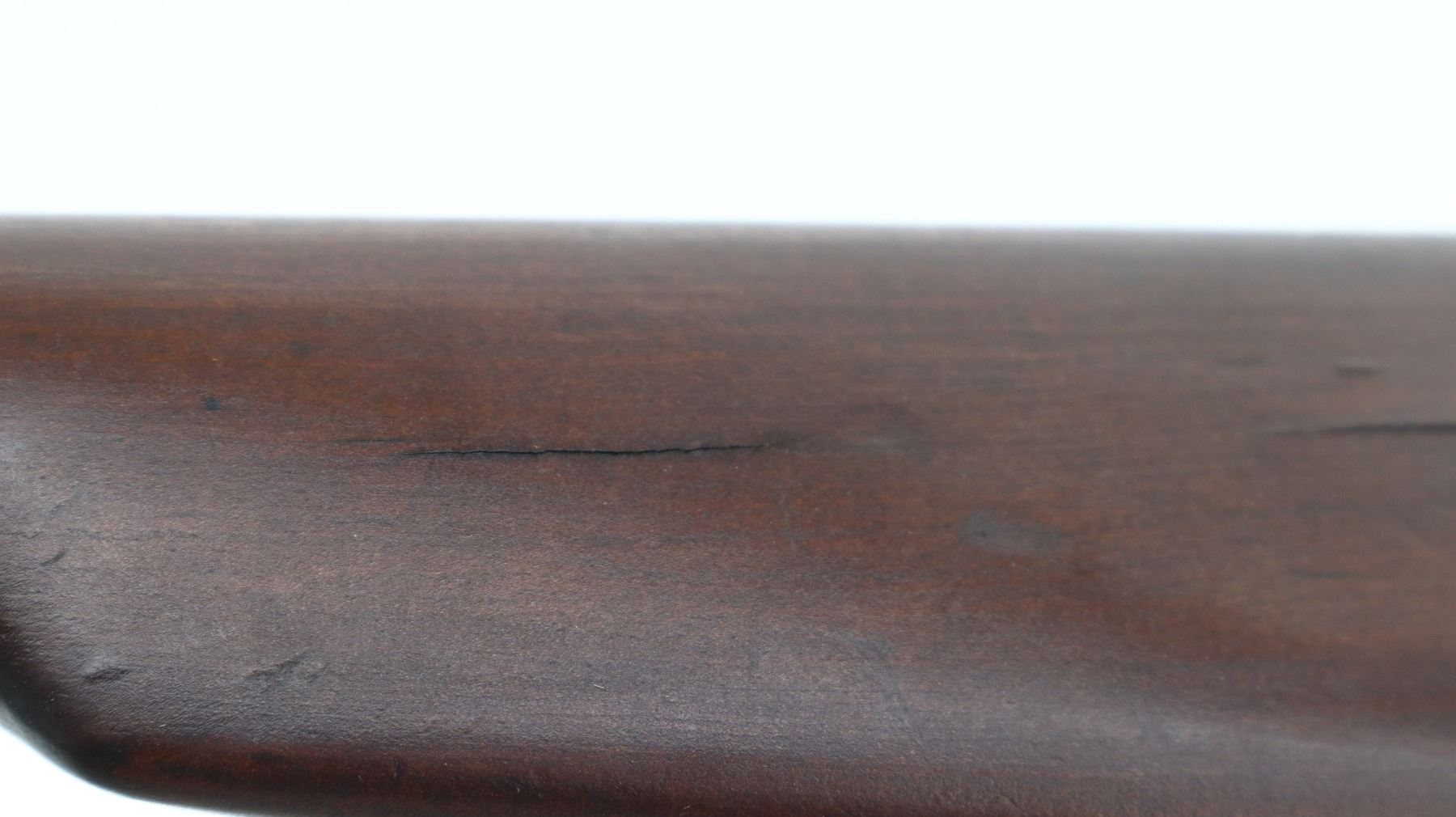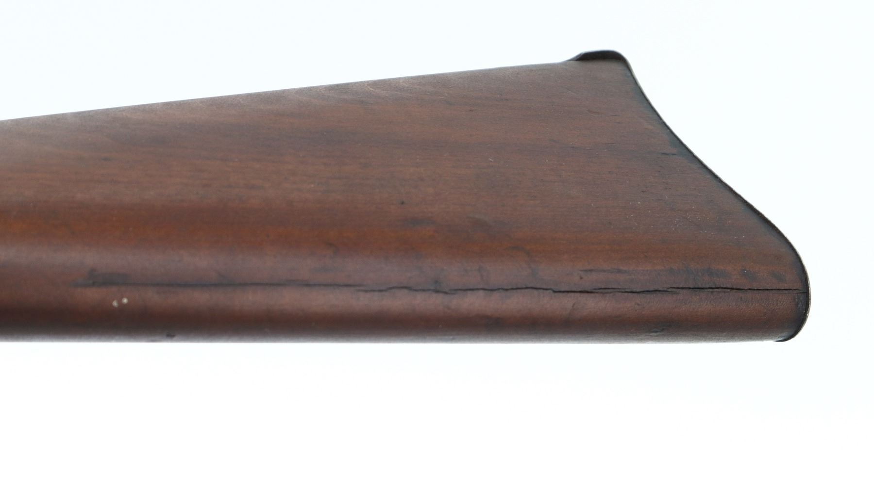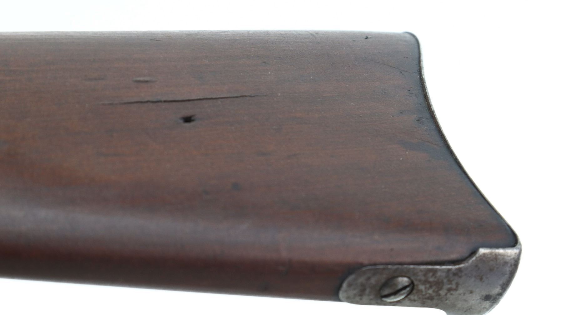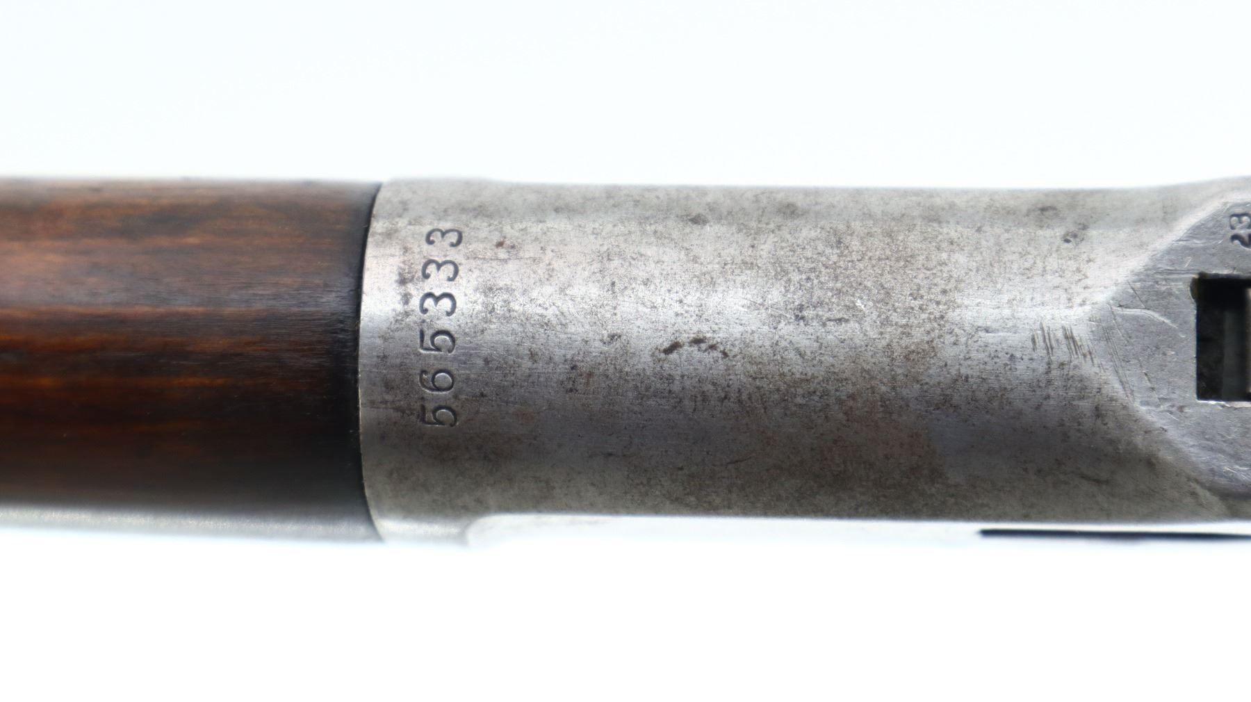 4/10, WINCHESTER, MODEL: 1892, CALIBER:25-20 WCF, BORE IS POOR, WORN, PITTED. MANUFACTURED 1910. BLADE FRONT SIGHT, REPLACED U NOTCHED REAR, MISSING ELEVATOR, CHECKERED SPUR HAMMER, SADDLE RING AND STUD REMOVED. TWO PIECE SMOOTH WOOD STOCKS, STRAIGHT GRIP, SMOOTH CURVED STEEL BUTT PLATE, STOCK SHOWS VARIOUS CRACKS. METAL FINISH SILVER GREY WITH PITTING, SCRATCHES, HANDLING MARKS AND WEAR. STOCKS SHOW MARKS, SCRATCHES AND WEAR., ACTION: LEVER ACTION RIFLE, BARREL LENGTH: 18", SERIAL # 565333, CONDITION: 4/10, CLASS: CANADIAN NON RESTRICTED
