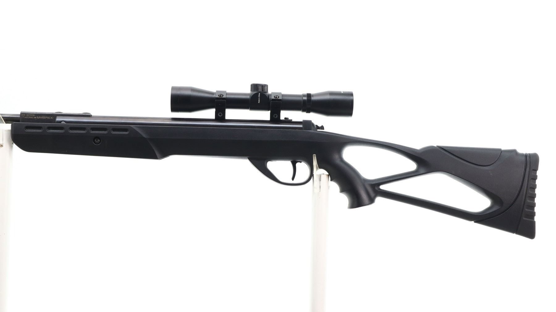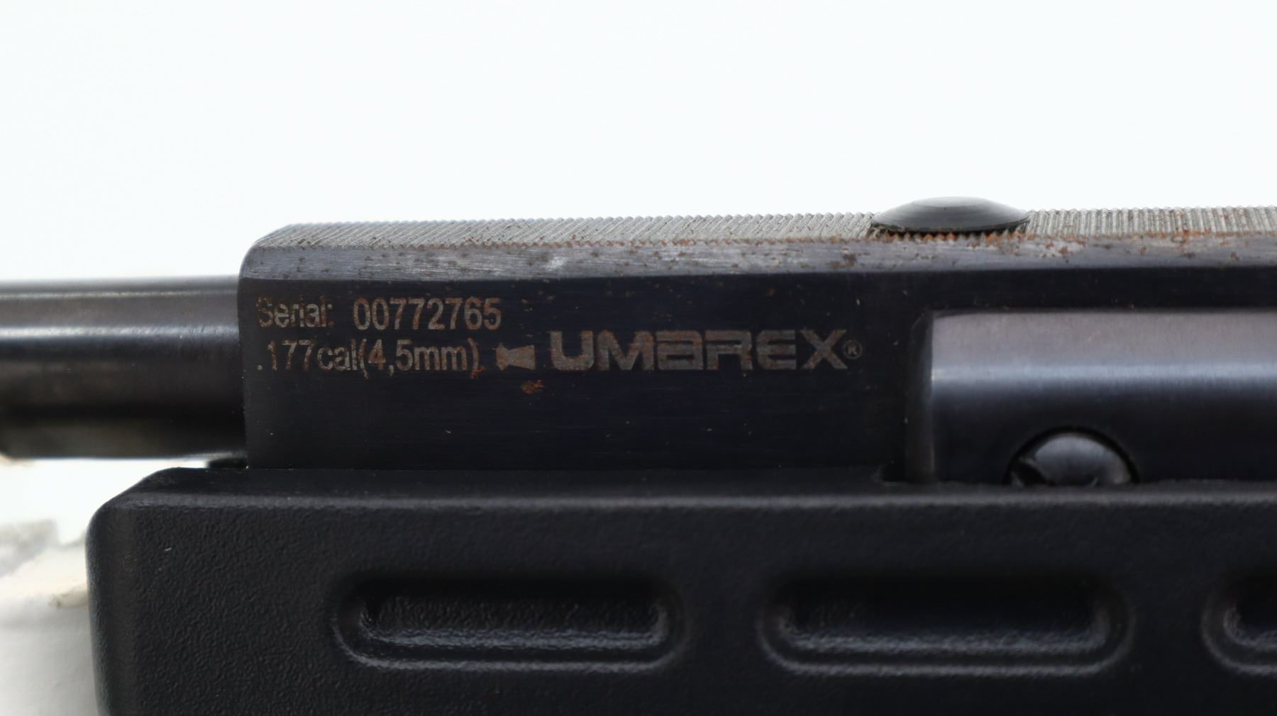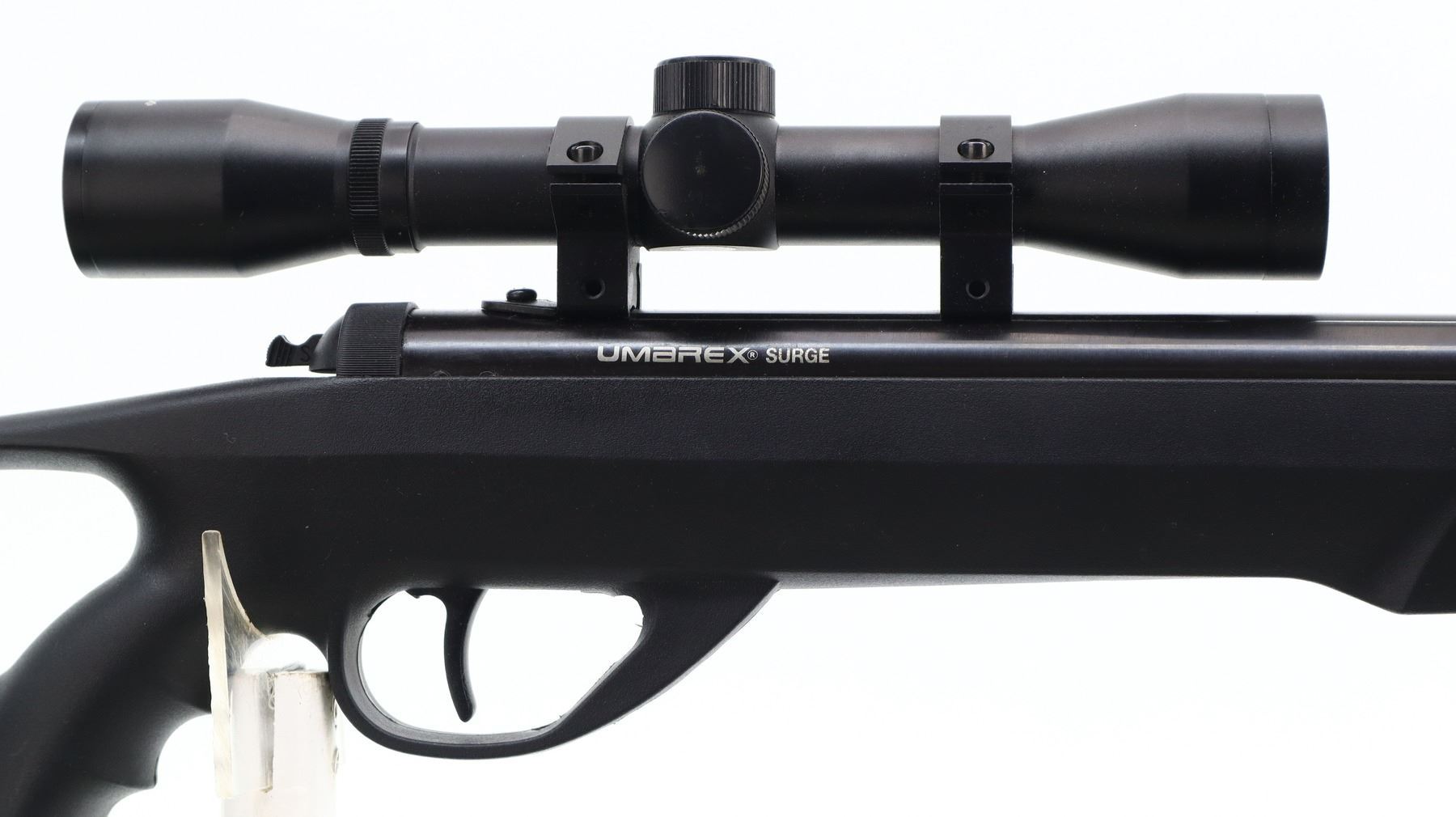 7/10, UMBREX, MODEL: SURGE, CALIBER:.177 PELLET, BORE IS VERY GOOD. NO SIGHTS, BLACK POLYMER MUZZLE EXTENSION, BLUED FINISH, GROOVED RECEIVER WITH UMBREX 4X32 SCOPE, CLEAR OPTICS, DUPLEX CROSSHAIR. ONE PIECE BLACK SYNTHETIC STOCK, GROOVED FOREND, THUMB HOLE PISTOL GRIP, GROOVED BLACK RUBBER RECOIL PAD. METAL FINISH SHOWS A FEW LIGHT RUST SPECKLES, SCRATCHES, HANDLING MARKS AND WEAR. STOCK SHOWS MARKS, SCRATCHES AND WEAR., ACTION: HINGE AIR RIFLE, BARREL LENGTH: 19", SERIAL # 00772765, CONDITION: 7/10, CLASS: CANADIAN NON RESTRICTED