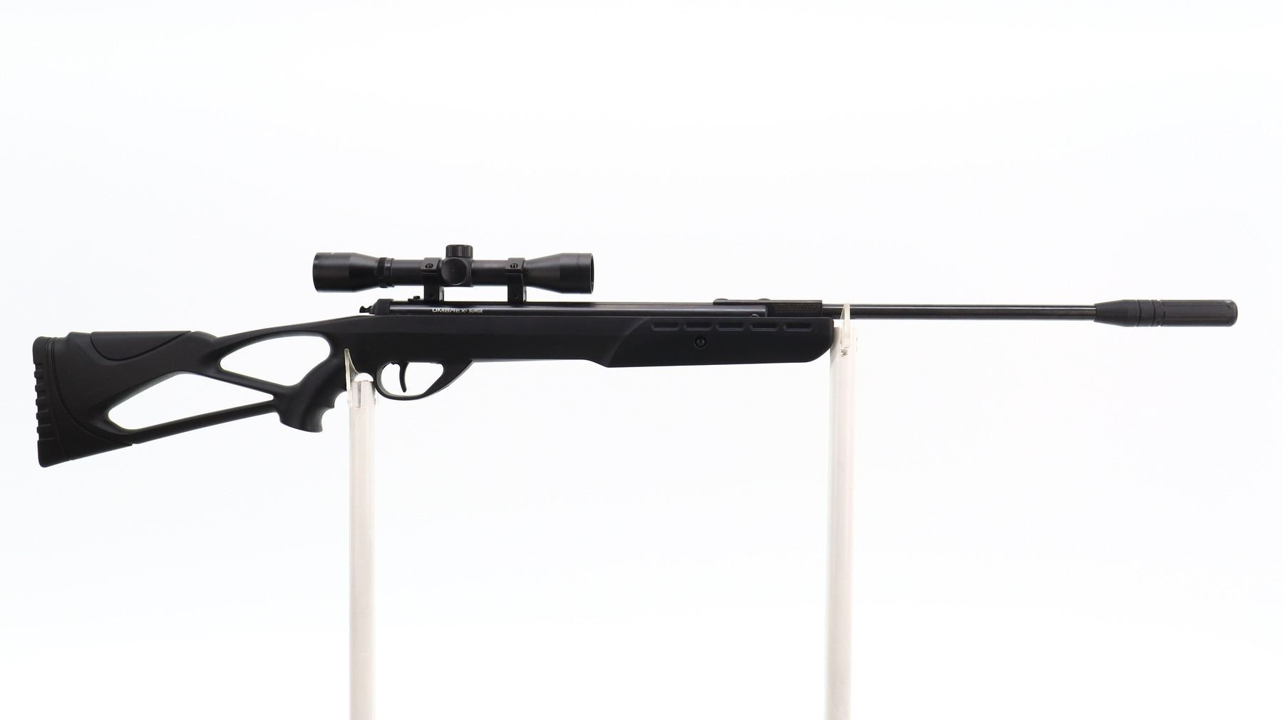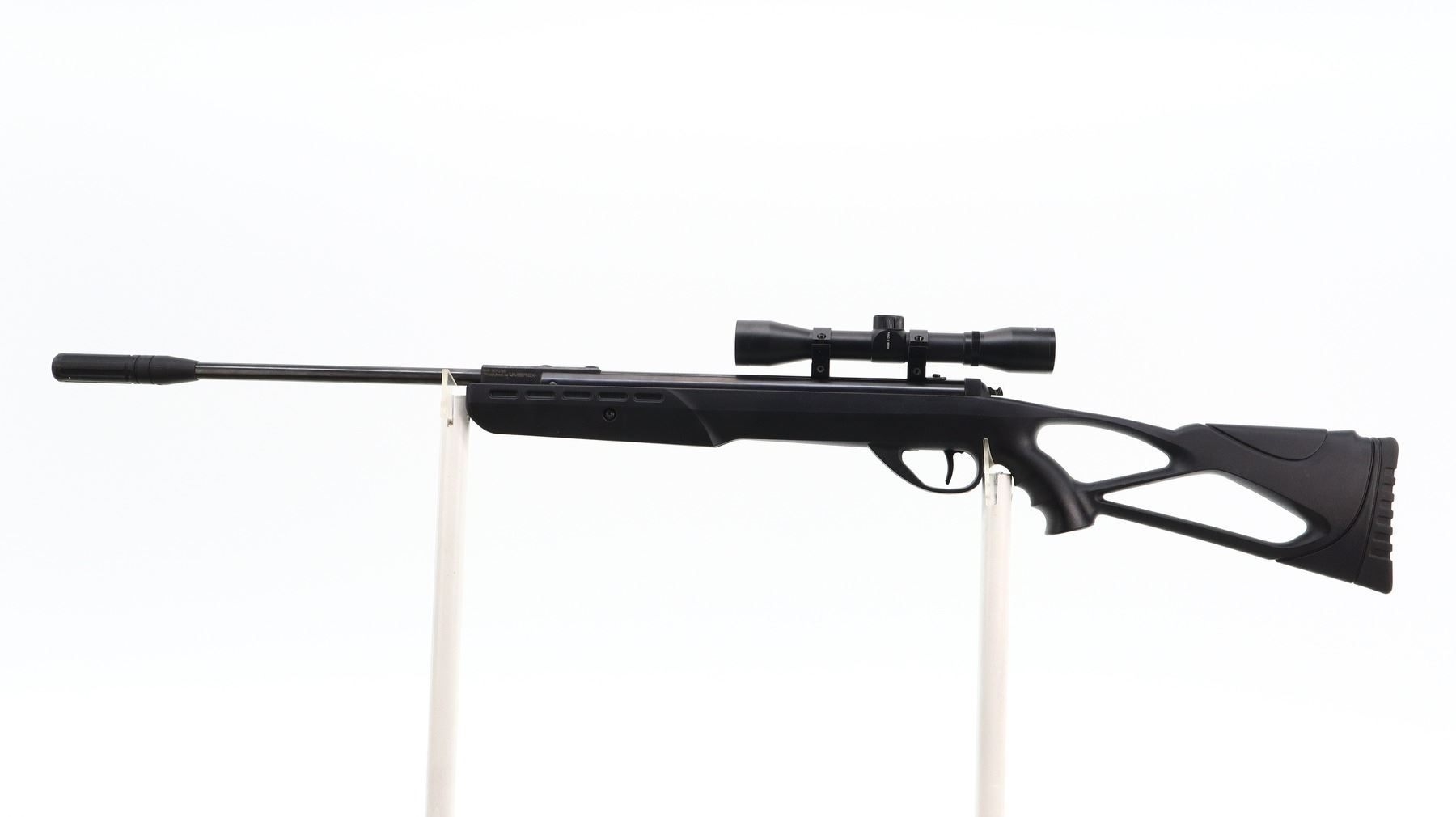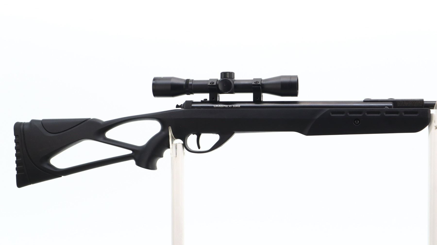 7/10, UMBREX, MODEL: SURGE, CALIBER:.177 PELLET, BORE IS VERY GOOD. NO SIGHTS, BLACK POLYMER MUZZLE EXTENSION, BLUED FINISH, GROOVED RECEIVER WITH UMBREX 4X32 SCOPE, CLEAR OPTICS, DUPLEX CROSSHAIR. ONE PIECE BLACK SYNTHETIC STOCK, GROOVED FOREND, THUMB HOLE PISTOL GRIP, GROOVED BLACK RUBBER RECOIL PAD. METAL FINISH SHOWS A FEW LIGHT RUST SPECKLES, SCRATCHES, HANDLING MARKS AND WEAR. STOCK SHOWS MARKS, SCRATCHES AND WEAR., ACTION: HINGE AIR RIFLE, BARREL LENGTH: 19", SERIAL # 00772765, CONDITION: 7/10, CLASS: CANADIAN NON RESTRICTED