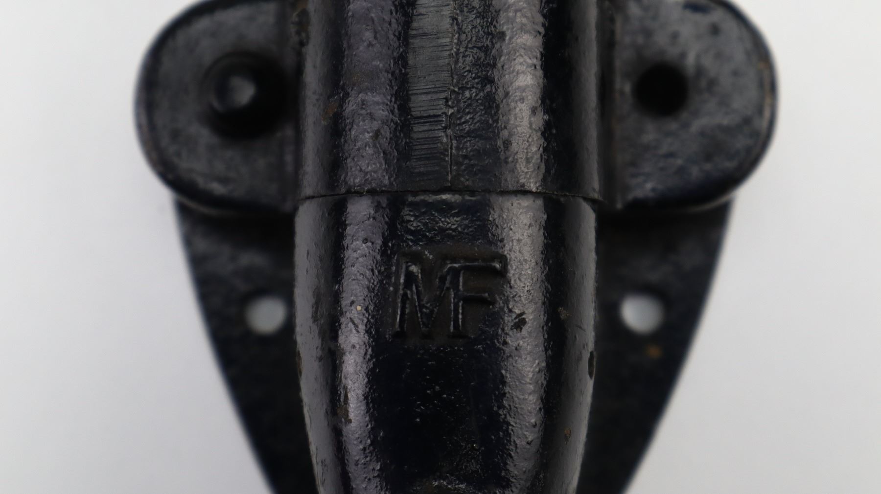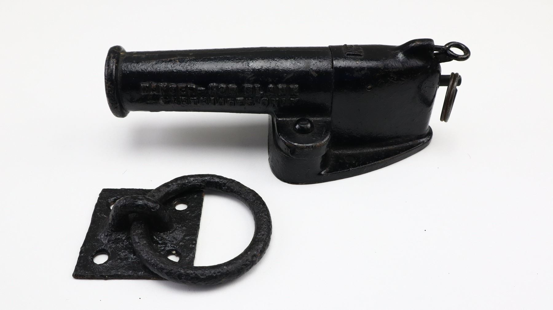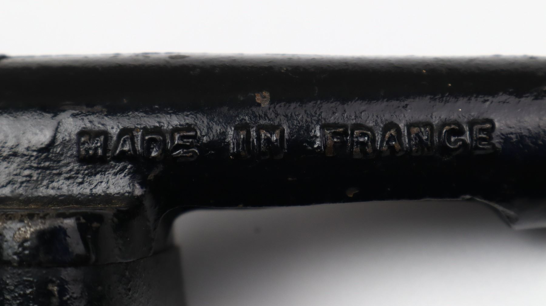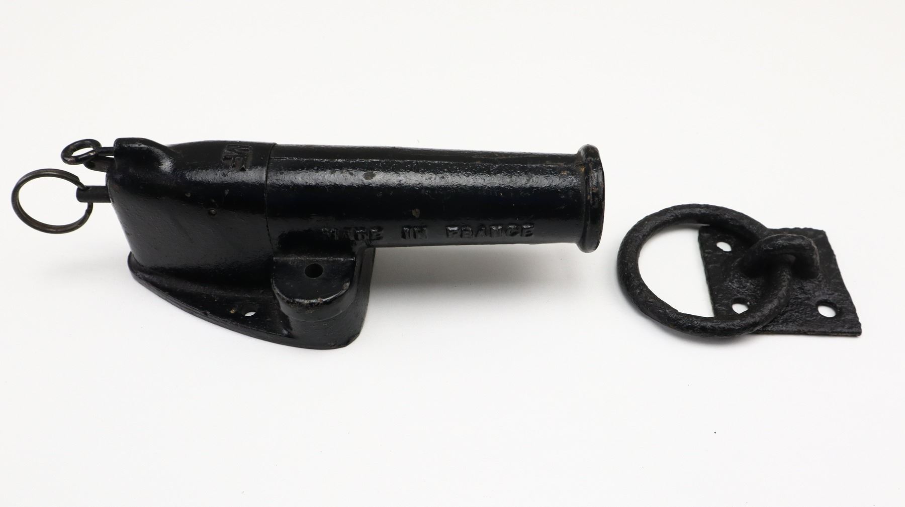 6/10, FRENCH, MODEL: SIGNAL CANNON, CALIBER:12 G BLANK ONLY, COMES WITH MOUNTING RING, BORE IS NA. MARKED MF. CAST STEEL WITH BLACK PAINTED FINISH, BARREL HINGES TO THE LEFT TO LOAD, MISSING LOCKING PIN. REQUIRES SCREWS OR BOLTS TO MOUNT TO A SOLID SURFACE, HAS A SPRING LOADING FIRING PIN WITH PULL RING. METAL FINISH SHOWS SOME SCRATCHES, HANDLING MARKS AND WEAR. , ACTION: HINGED SINGLE SHOT, BARREL LENGTH: 110MM, SERIAL # NA, CONDITION: 6/10, CLASS: FLARE, NO LICENSE REQUIRED