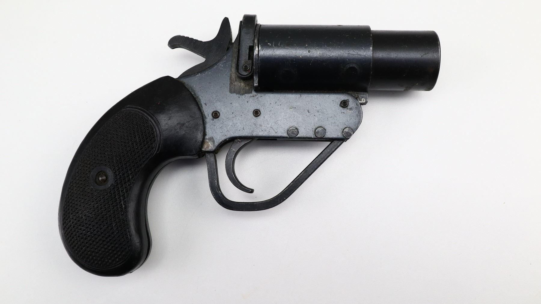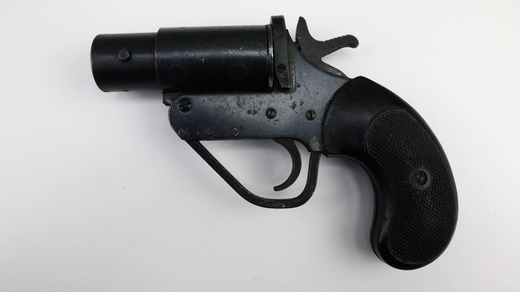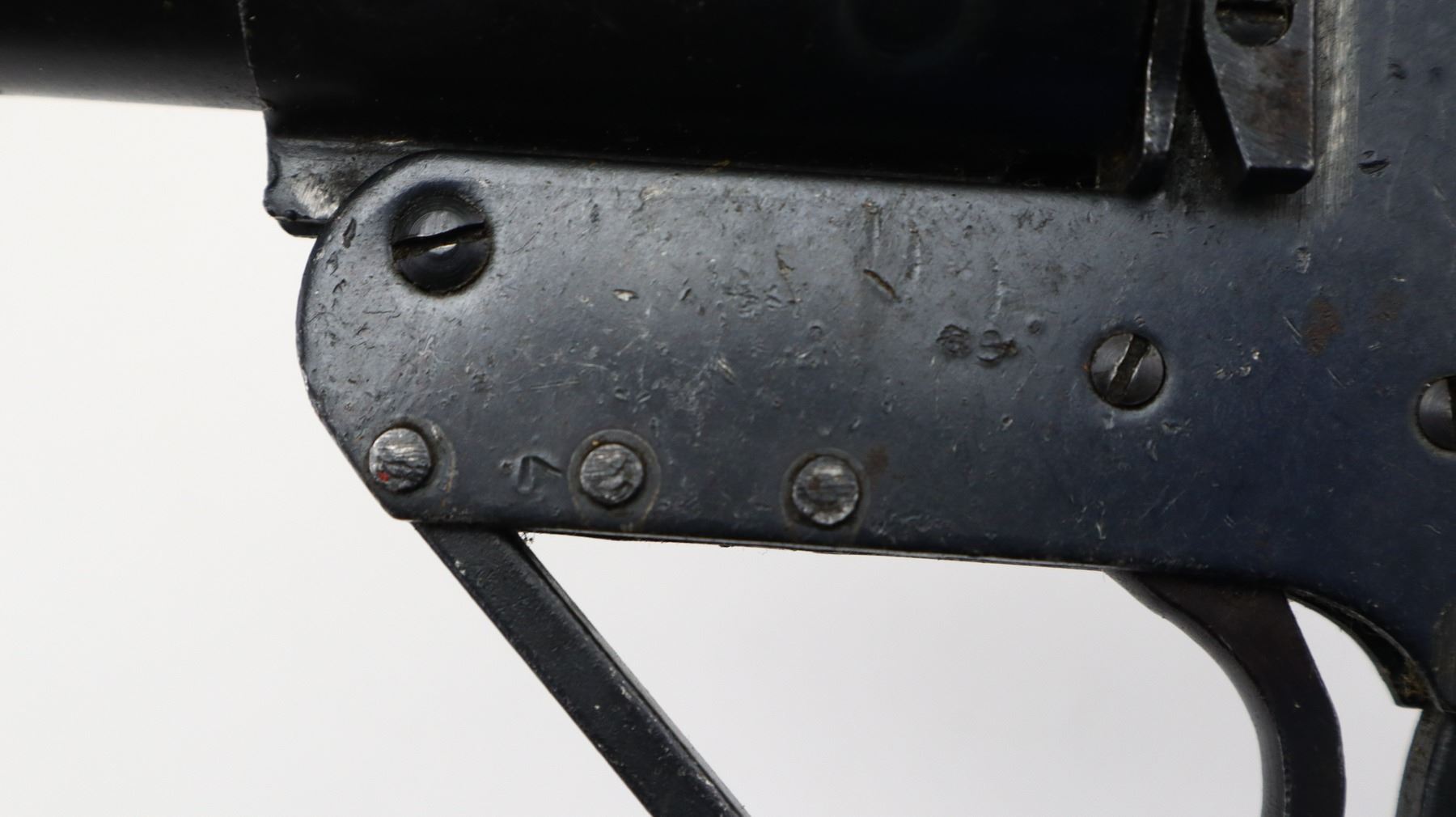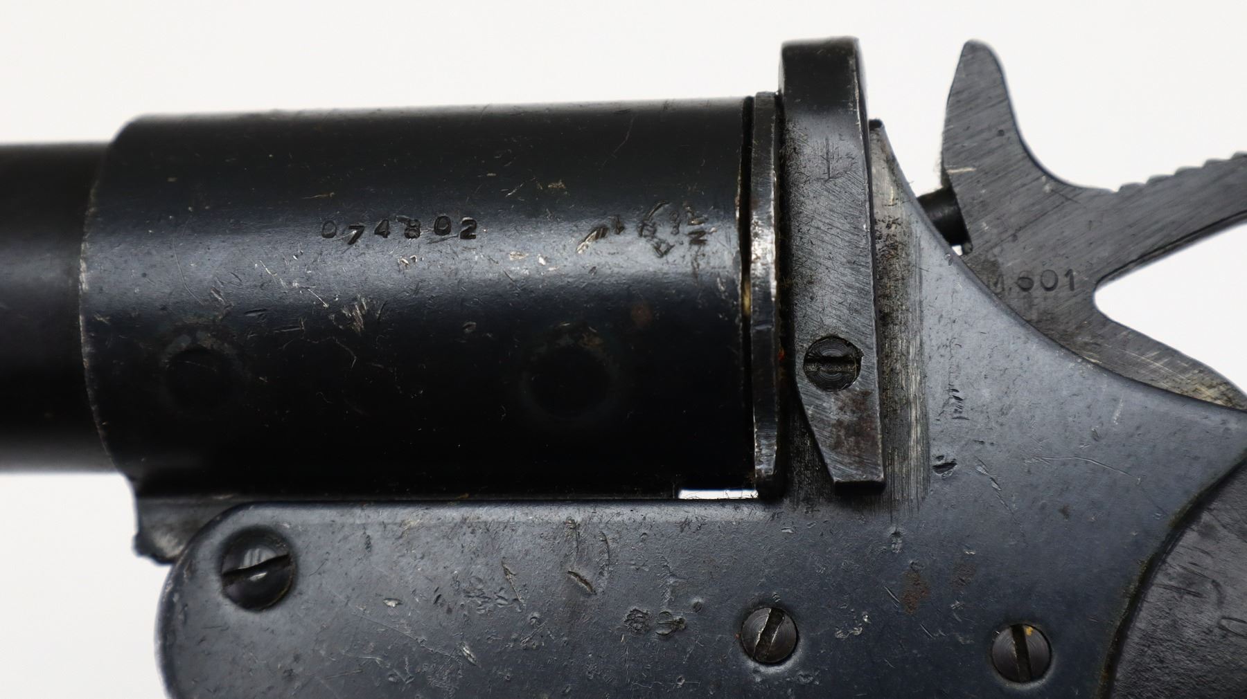 5/10, BRITISH , MODEL: NO2 MK5, CALIBER:1", BORE IS VERY GOOD. ROUND BARREL WITH SINGLE LUG ON LEFT SIDE, BLUED FINISH, GROOVED SPUR HAMMER AND SMOOTH TRIGGER, LARGE TRIGGER GUARD. TWO PIECE CHECKERED BLACK POLYMER GRIPS, RETRACTABLE LANYARD RING. BARREL HAS SLIGHT PLAY IN IT. METAL FINISH SHOWS SOME LIGHT RUST SPECKLES, SCRATCHES, HANDLING MARKS AND WEAR. GRIPS SHOW SOME MARKS, SCRATCHES AND WEAR. , ACTION: HINGED SINGLE SHOT, BARREL LENGTH: 90MM, SERIAL # 07802, CONDITION: 5/10, CLASS: FLARE, NO LICENSE REQUIRED