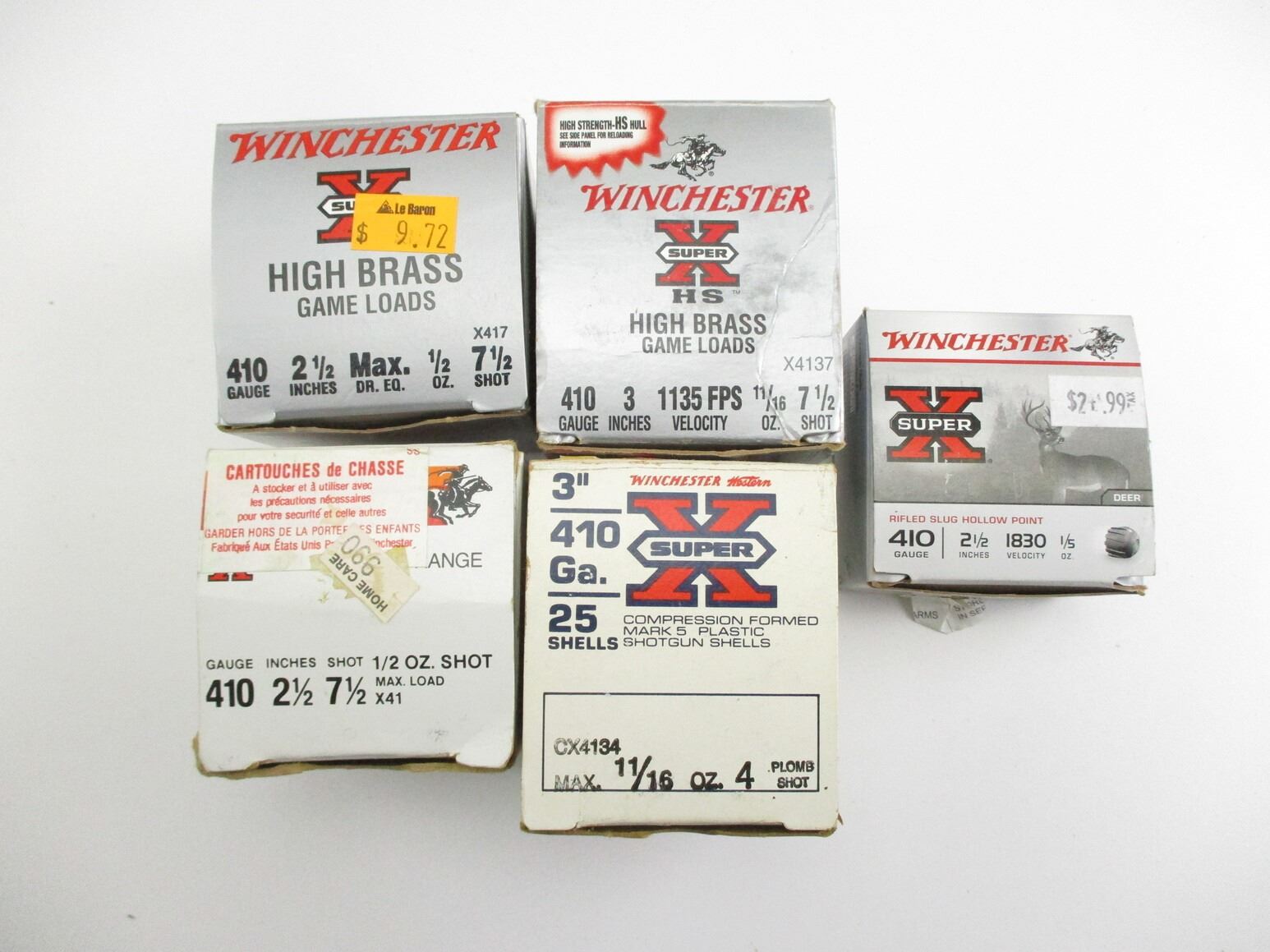 WINCHESTER SUPER-X .410 GAUGE SHOTSHELLS LOT, 97 RNDS, 2 1/2" & 3", INCLUDES #4 SHOT, #7 1/2 SHOT, & SLUGS
