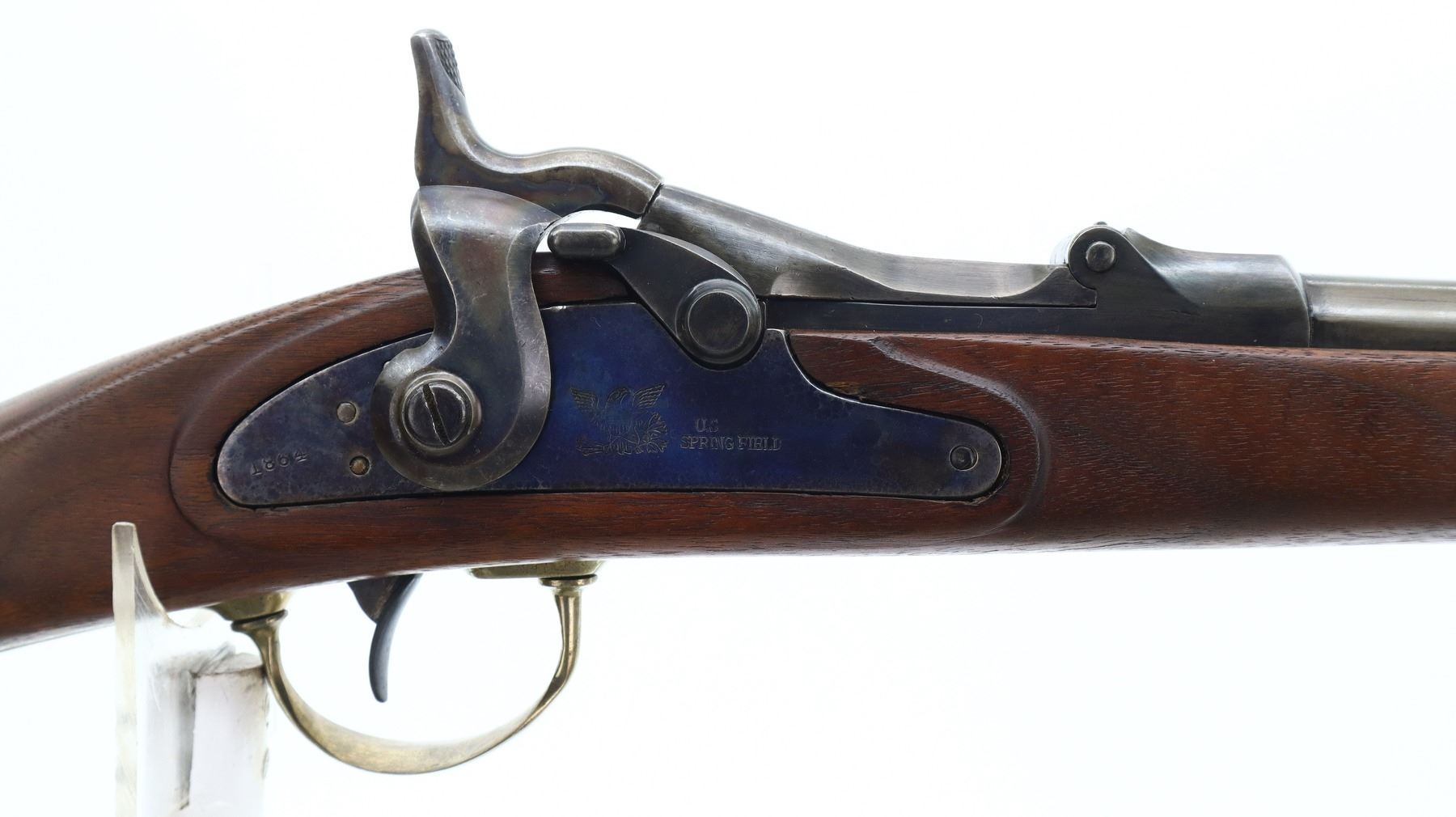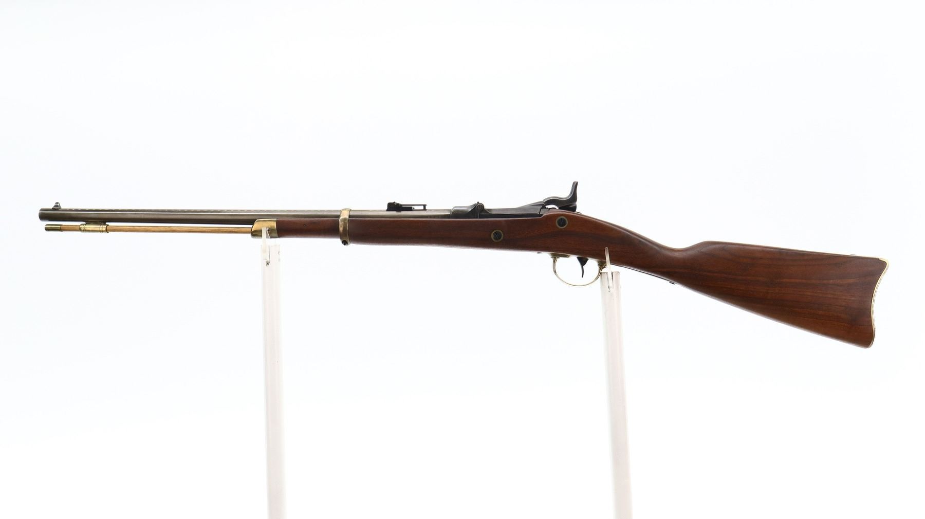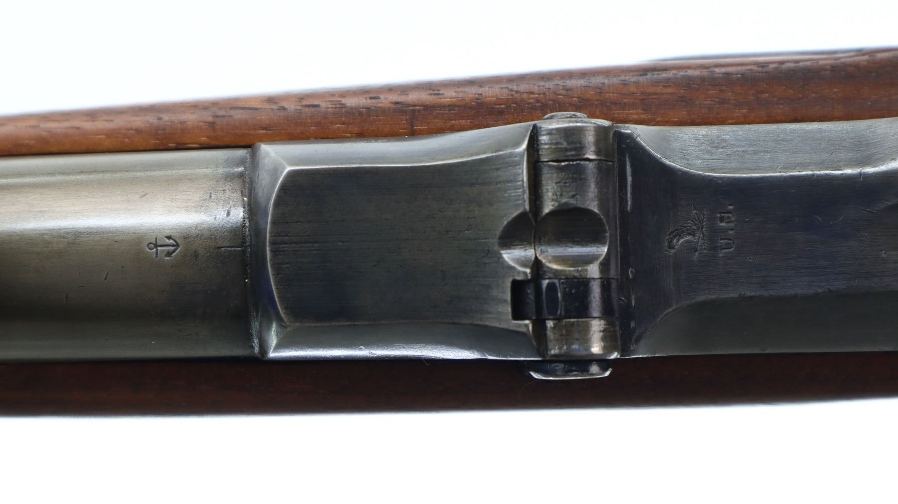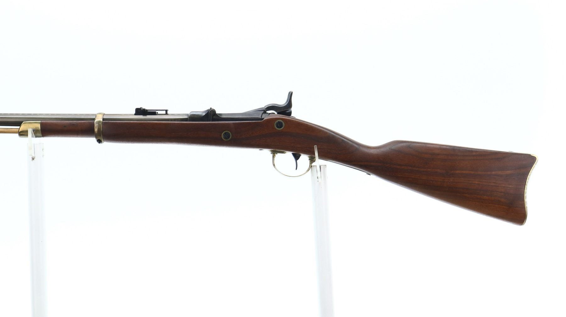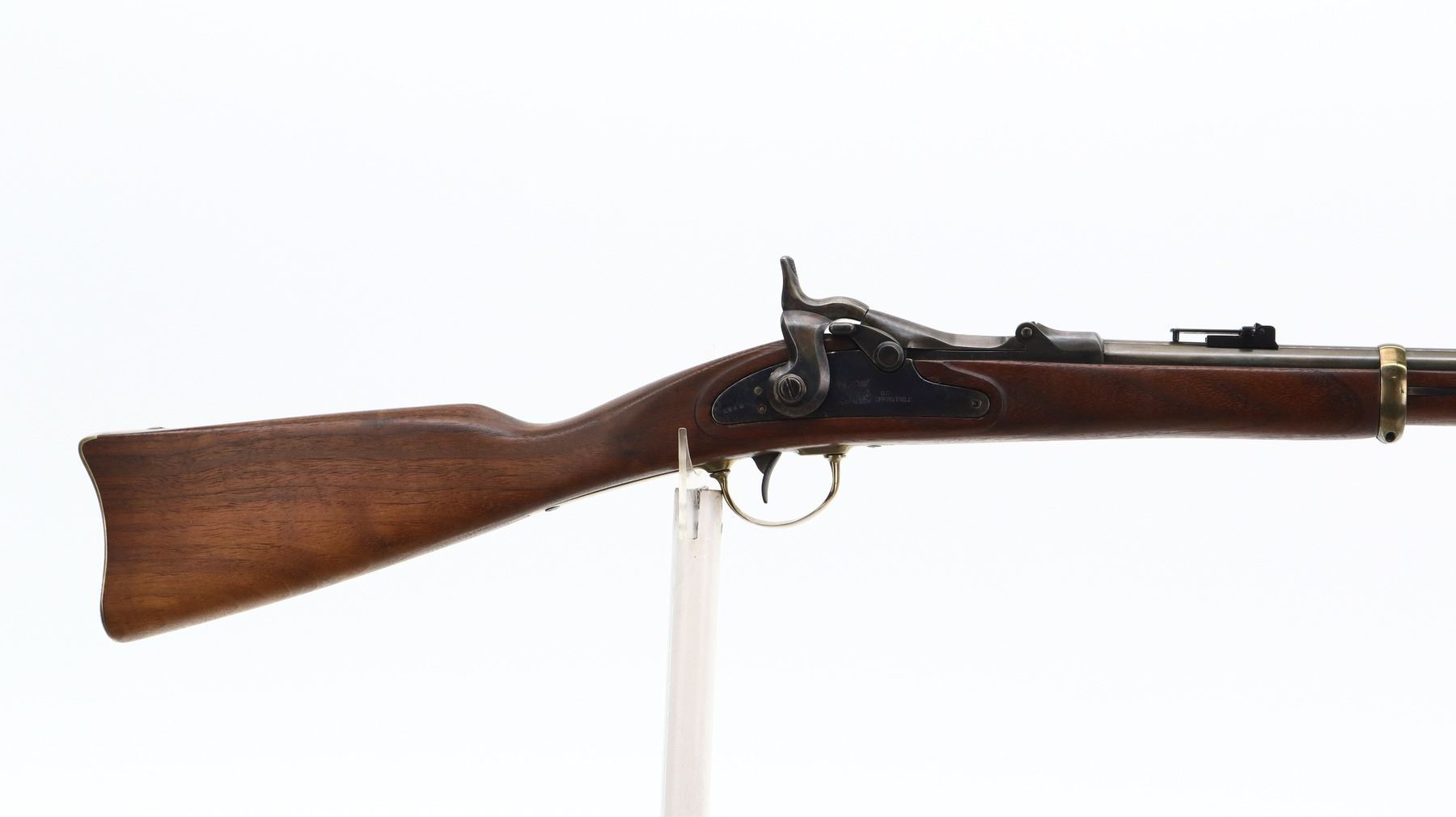 6/10, U.S. SPRINGFIELD, MODEL: TRAPDOOR SPORTER , CALIBER: 50-70 GOVT , BORE IS GOOD. BLADE FRONT SIGHT. REPLACED ADJUSTABLE U NOTCH LADDER REAR SIGHT. METAL HAS BEEN REBLUED. REPRODUCTION LOCK, WITH CHECKERED SPUR HAMMER. ONE PIECE SMOOTH REPRODUCTION WOOD STOCK. STRAIGHT GRIP. SMOOTH BRASS BUTT PLATE, TRIGGER GUARD, BARREL BAND AND NOSE CAP. WOOD RAM ROD WITH BRASS TIP. METAL FINISH SHOWS SOME SCRATCHES, HANDLING MARKS AND WEAR. STOCK SHOWS SOME MARKS, SCRATCHES AND WEAR. ACTION: HINGED SINGLE SHOT RIFLE, BARREL LENGTH: 23", SERIAL: 1393, CONDITION: 6/10, CLASS: CANADIAN ANTIQUE, NO LICENSE REQUIRED