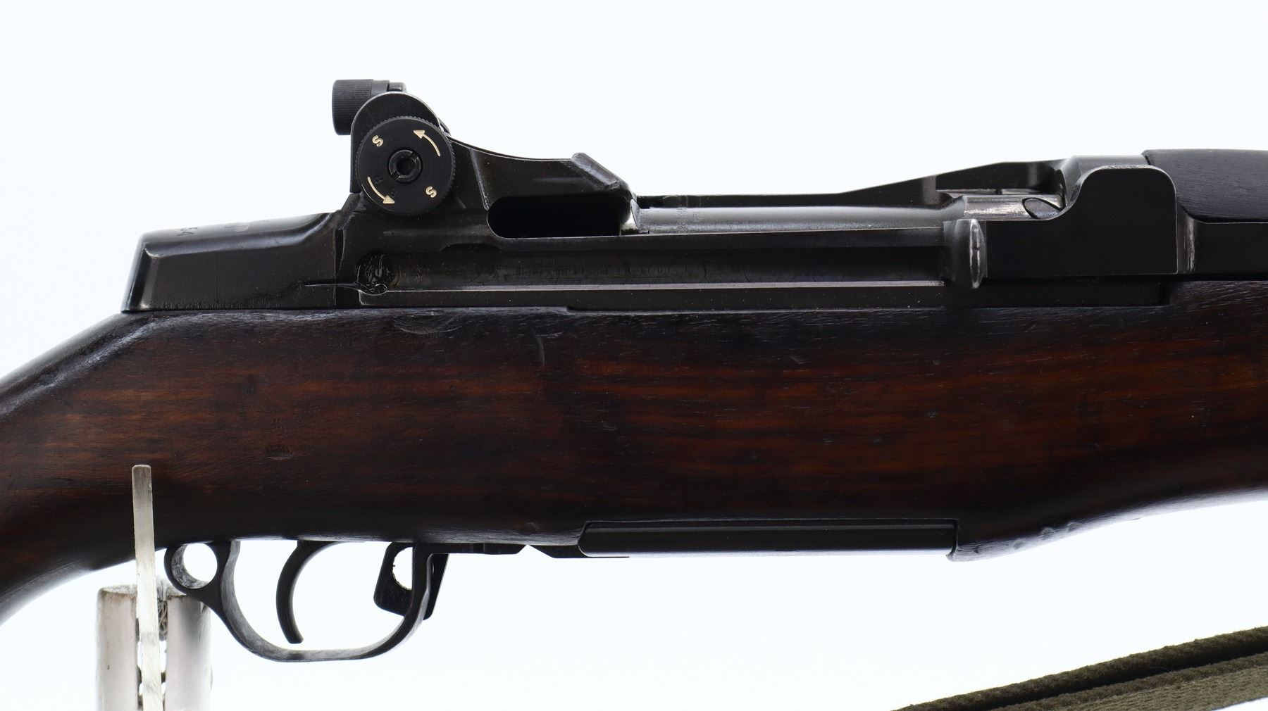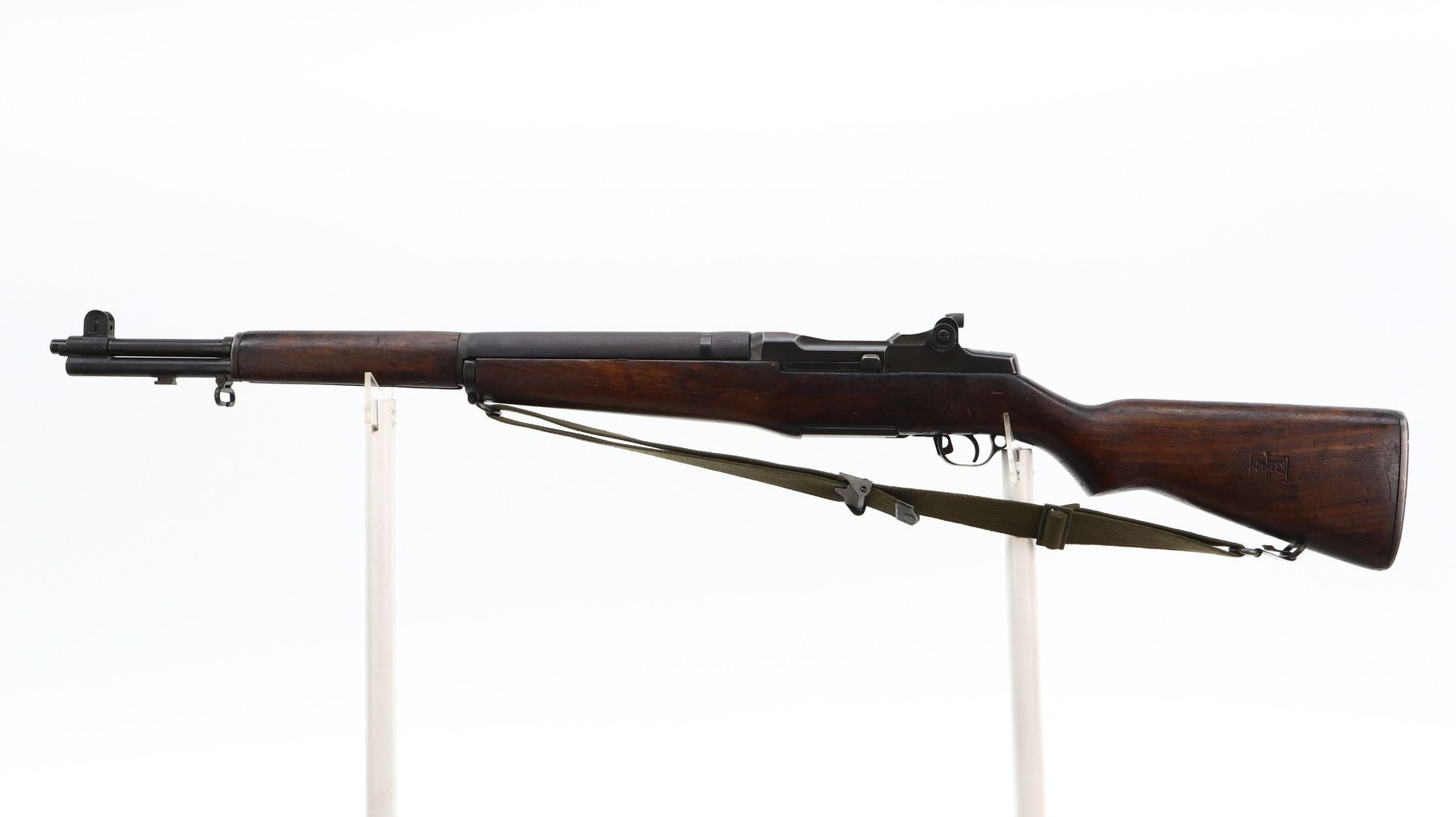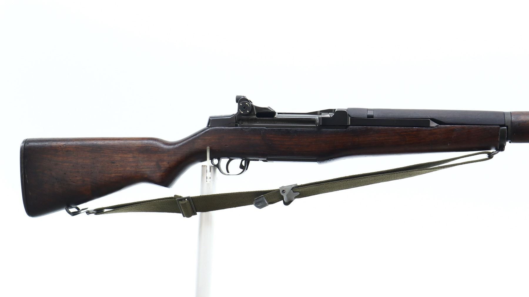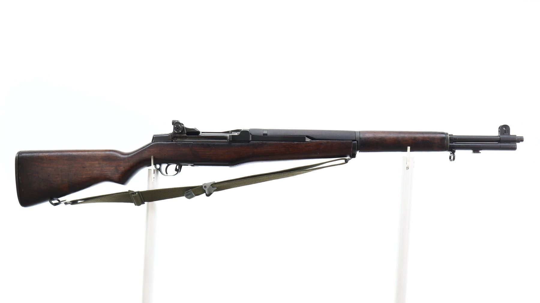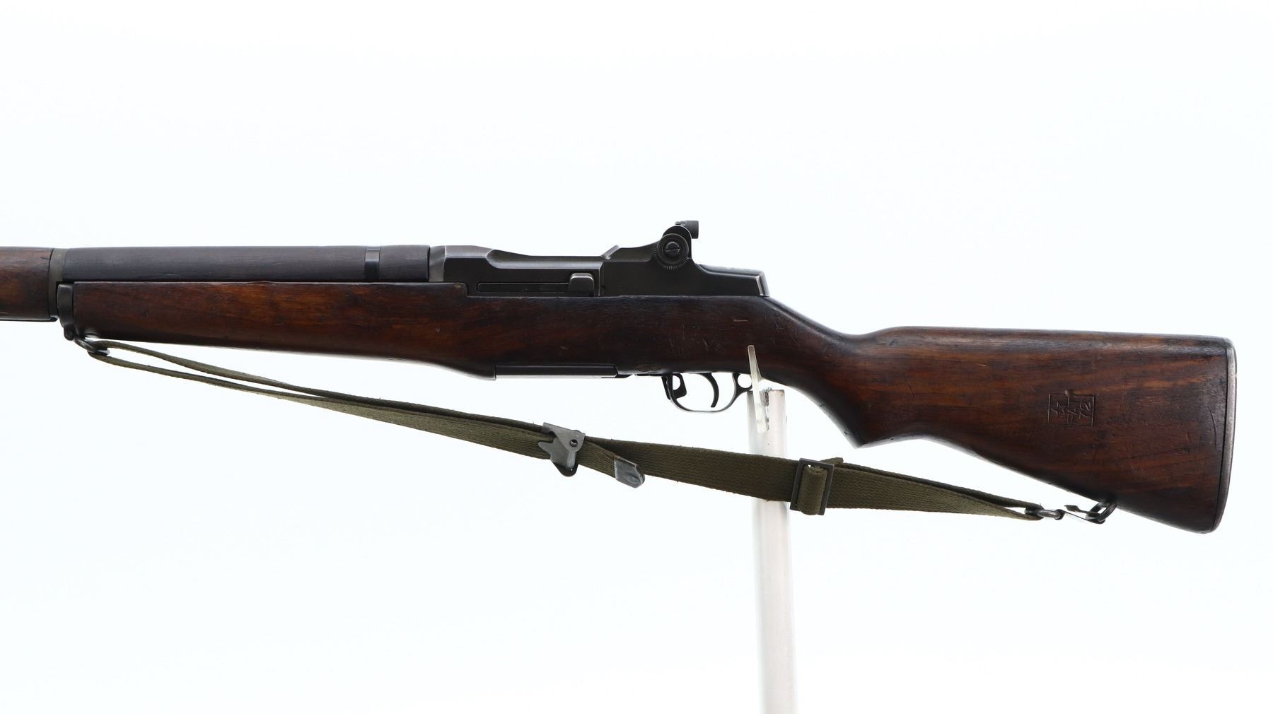 7/10, ITALIAN GARAND, MODEL: TIPO2, CALIBER: 7.62N, BORE IS VERY GOOD. ITALIAN CONVERSION OF A SPRINGFIELD M1 GARAND. BLADE FRONT SIGHT WITH EARS, ADJUSTABLE PEEP SIGHT WITH MATCH APERTURE, BLACK METAL FINISH. FOUR PIECE SMOOTH FULL MILITARY WOOD STOCKS, PISTOL GRIP, CHECKERED STEEL BUTT PLATE, LEFT SIDE OF STOCK HAVE A RECTANGLE WITH A STAR AND FAT 72 STAMPED IN IT, SWIVELS WITH GREEN CANVAS MILITARY SLING, STACKING SWIVEL AND BAYONET LUG. RIFLE HAS A MIXTURE OF US AND ITALIAN PARTS. METAL FINISH SHOWS SOME SCRATCHES, HANDLING MARKS AND WEAR. STOCKS SHOW SOME MARKS, SCRATCHES AND WEAR. ACTION: SEMI AUTOMATIC RIFLE, BARREL LENGTH: 23.5", SERIAL: 1110154, CONDITION: 7/10, CLASS: CANADIAN NON RESTRICTED