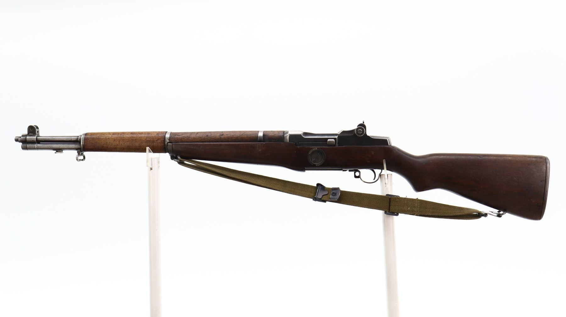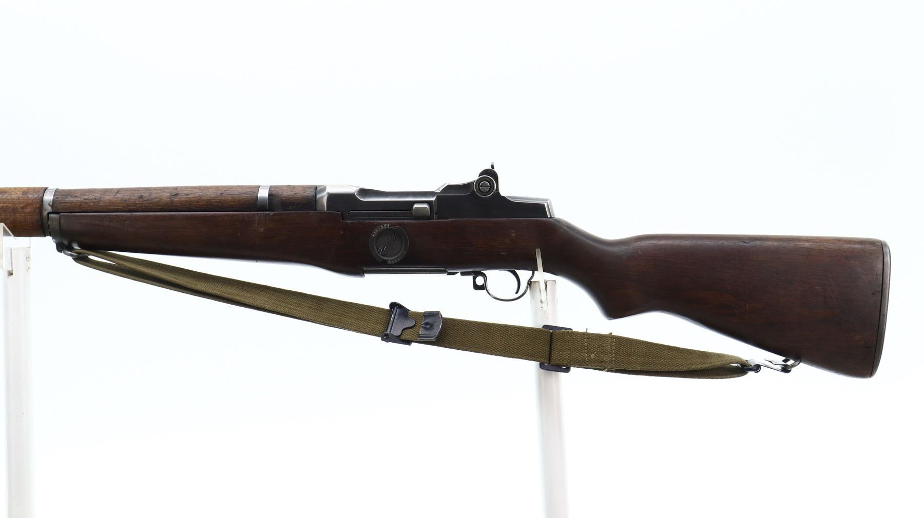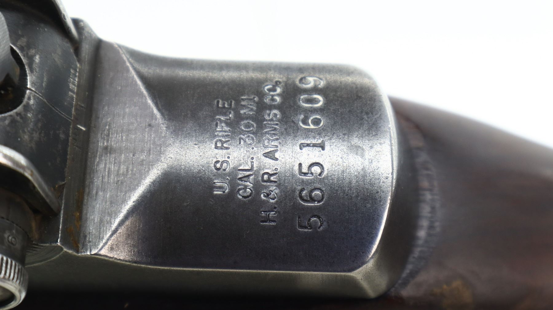 6+/10, US RIFLE, MODEL: M1 GARAND, CALIBER: 30-06 SPRG, BORE IS FAIR, WORN, LIGHT PITTING. MANUFACTURED BY HARRINGTON & RICHARDSON, BARREL MARKED HRA6-55. BLADE FRONT SIGHT WITH EARS, ADJUSTABLE REAR PEEP SIGHT. THREE PIECE FULL MILITARY WOOD STOCKS, PISTOL GRIP, CHECKERED STEEL BUTT PLATE WITH TRAP, SWIVELS WITH CANVAS MILITARY SLING, LEFT SIDE OF STOCK HAS GRENADE LAUNCHER SIGHT BASE, STACKING SWIVEL AND BAYONET LUG. METAL FINISH SHOWS SOME SCRATCHES, HANDLING MARKS AND WEAR. STOCKS SHOW SOME MARKS, SCRATCHES AND WEAR. ACTION: SEMI AUTOMATIC RIFLE, BARREL LENGTH: 24", SERIAL: 5651609, CONDITION: 6+/10, CLASS: CANADIAN NON RESTRICTED