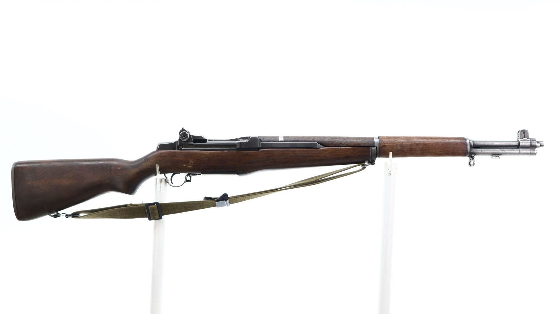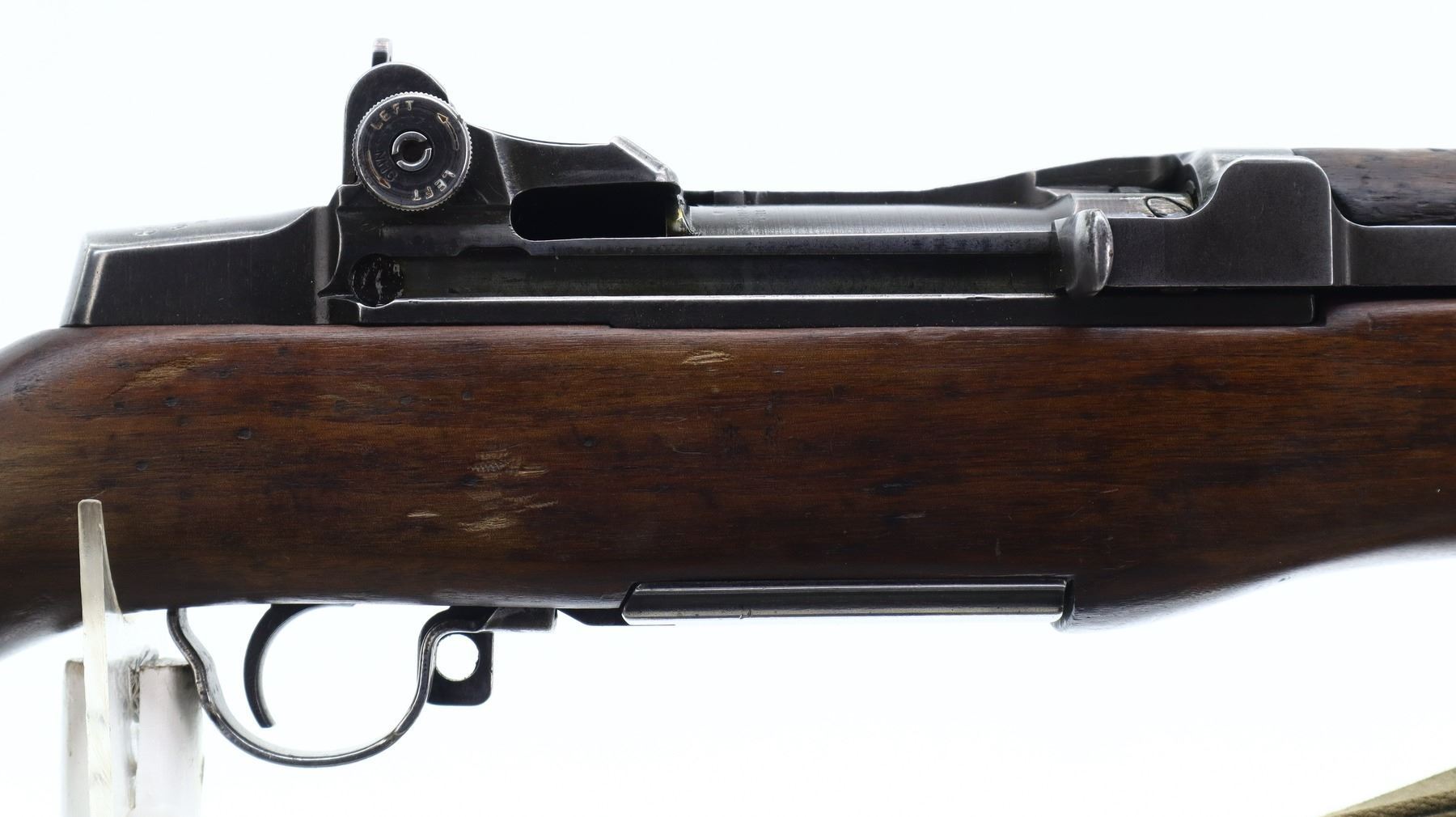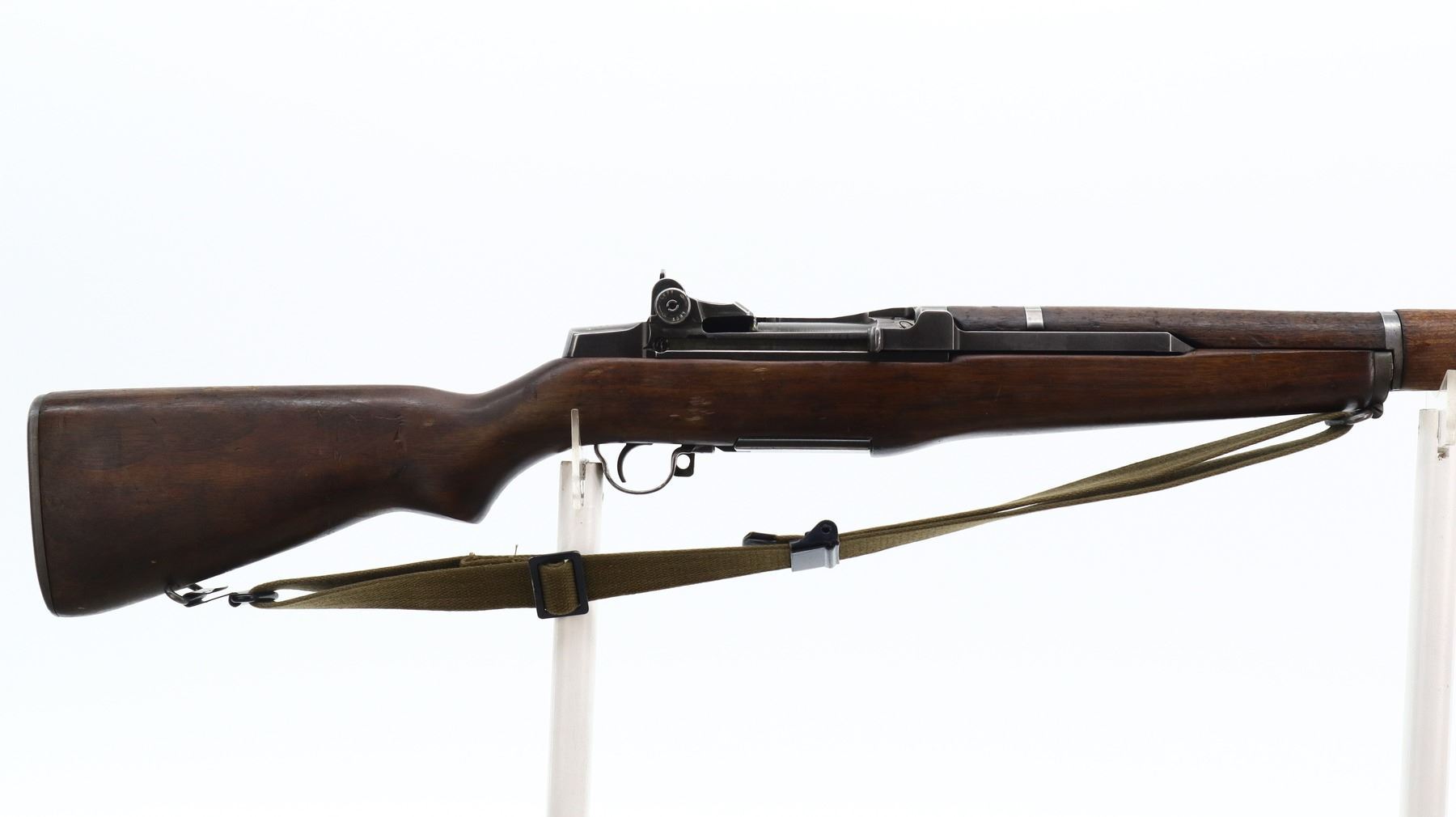 6+/10, US RIFLE, MODEL: M1 GARAND, CALIBER: 30-06 SPRG, BORE IS FAIR, WORN, LIGHT PITTING. MANUFACTURED BY HARRINGTON & RICHARDSON, BARREL MARKED HRA6-55. BLADE FRONT SIGHT WITH EARS, ADJUSTABLE REAR PEEP SIGHT. THREE PIECE FULL MILITARY WOOD STOCKS, PISTOL GRIP, CHECKERED STEEL BUTT PLATE WITH TRAP, SWIVELS WITH CANVAS MILITARY SLING, LEFT SIDE OF STOCK HAS GRENADE LAUNCHER SIGHT BASE, STACKING SWIVEL AND BAYONET LUG. METAL FINISH SHOWS SOME SCRATCHES, HANDLING MARKS AND WEAR. STOCKS SHOW SOME MARKS, SCRATCHES AND WEAR. ACTION: SEMI AUTOMATIC RIFLE, BARREL LENGTH: 24", SERIAL: 5651609, CONDITION: 6+/10, CLASS: CANADIAN NON RESTRICTED