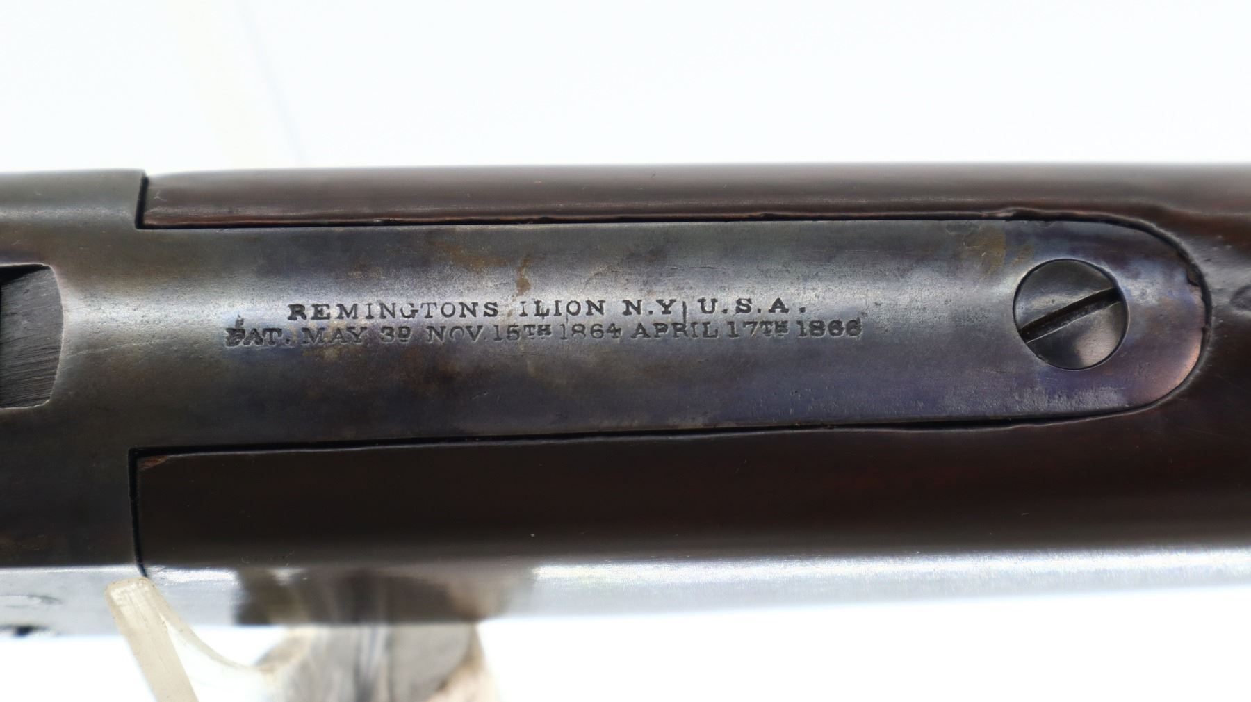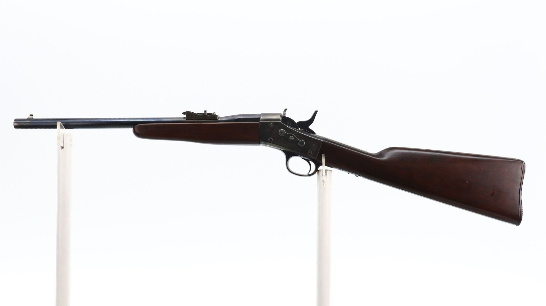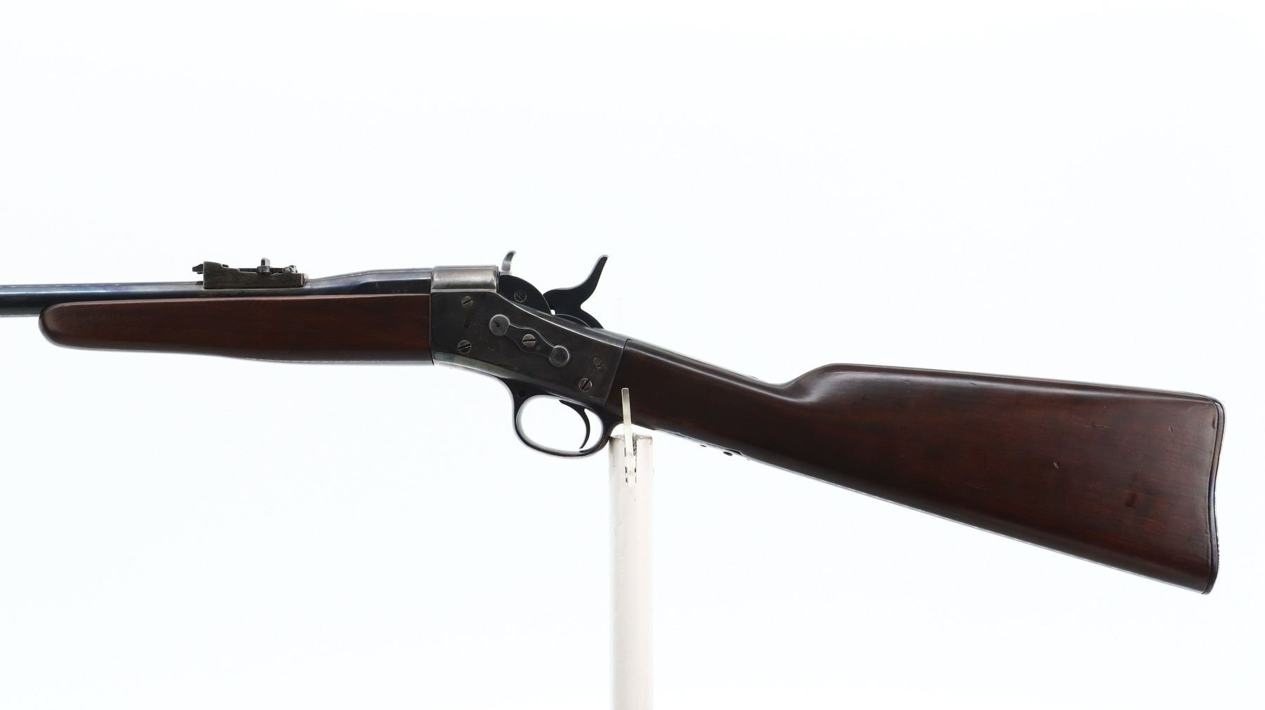 7/10, REMINGTON , MODEL: ROLLING BLOCK CUSTOM , CALIBER: 38 SPL, BORE IS VERY GOOD, SHINY. BLADE FRONT SIGHT. ADJUSTABLE U NOTCH LADDER REAR SIGHT. ROUND BARREL. TWO PIECE SMOOTH WOOD STOCKS. STRAIGHT GRIP, SMOOTH CURVED STEEL BUTT PLATE. METAL FINISH SHOWS SCRATCHES, HANDLING MARKS AND WEAR. STOCKS SHOW MARKS, SCRATCHES AND WEAR. ACTION: ROLLING BLOCK RIFLE , BARREL LENGTH: 18.25", SERIAL: 357, CONDITION: 7/10, CLASS: CANADIAN NON RESTRICTED