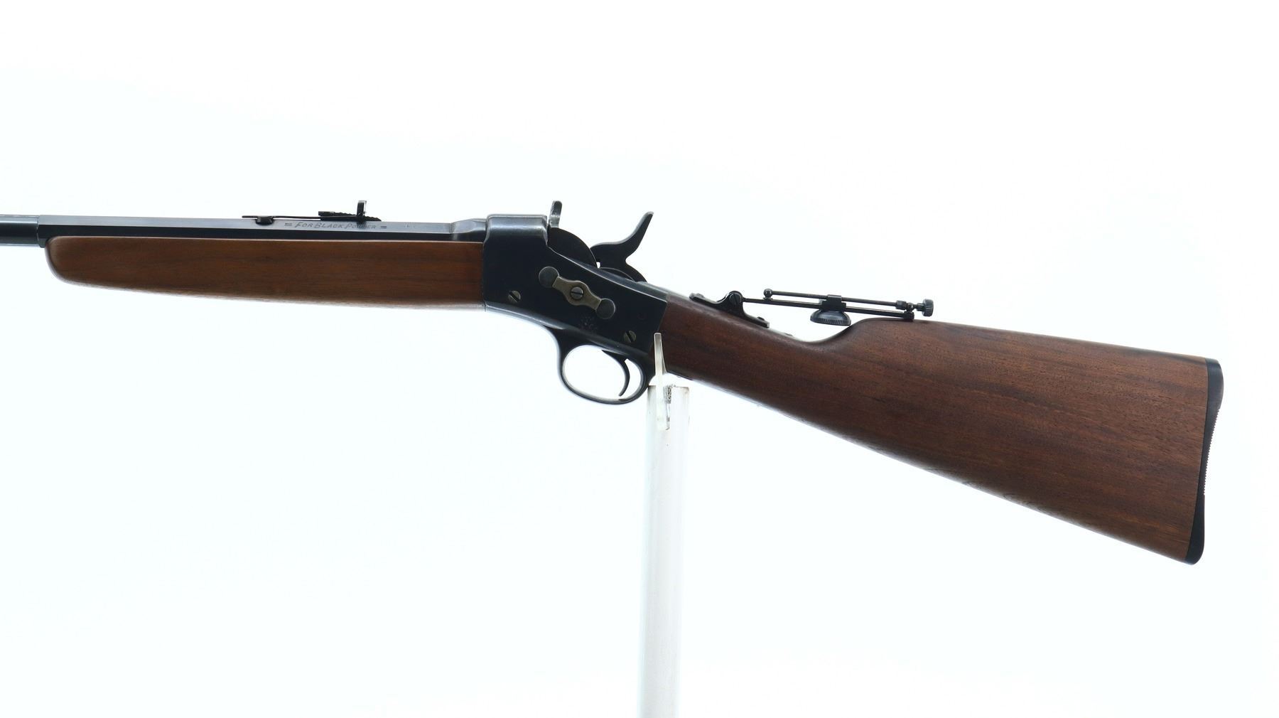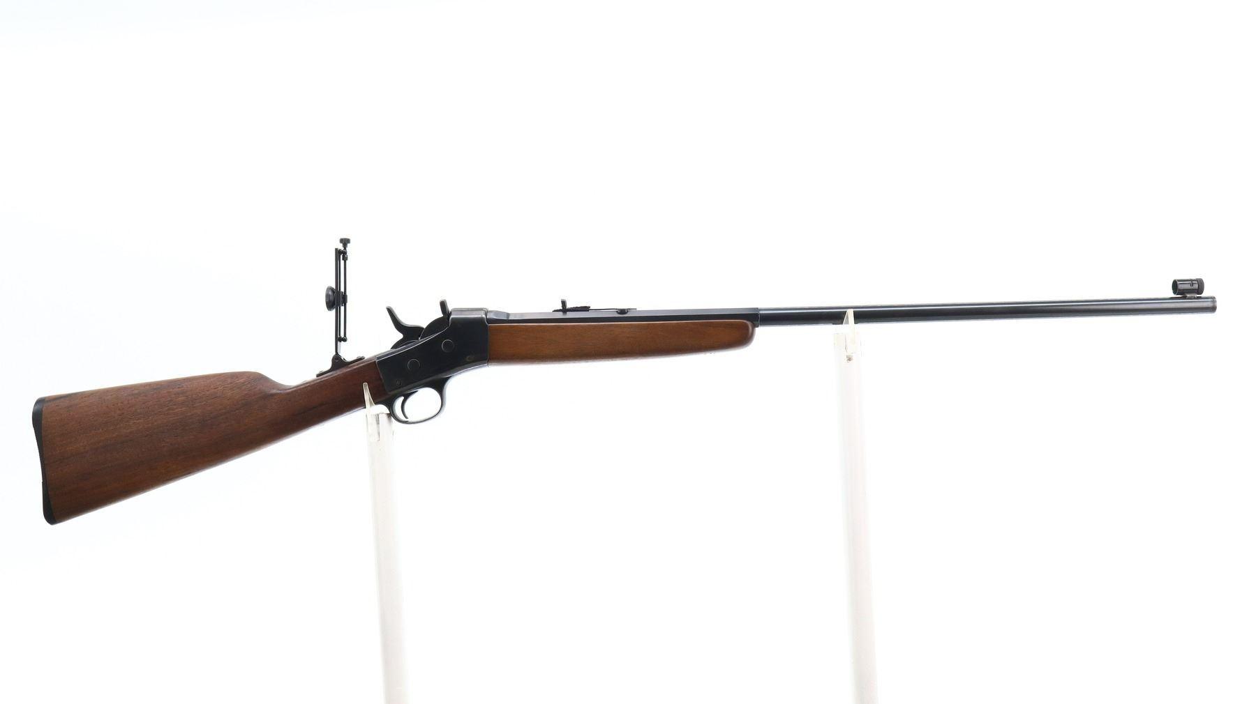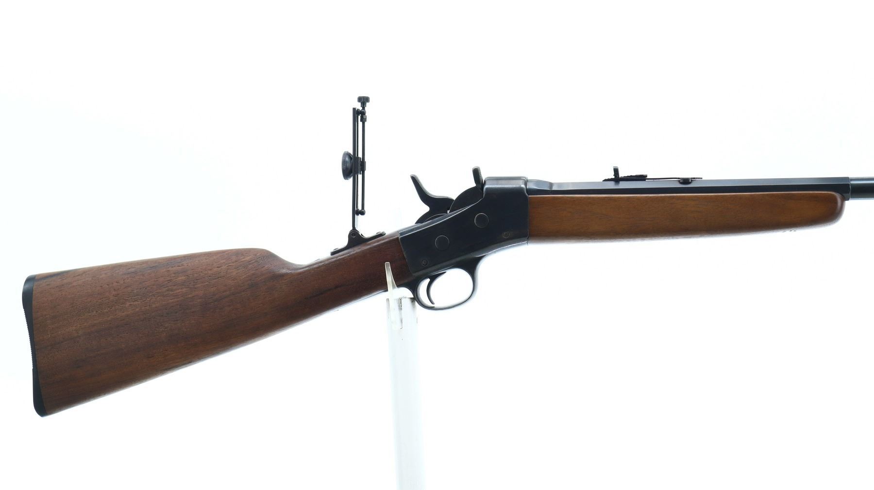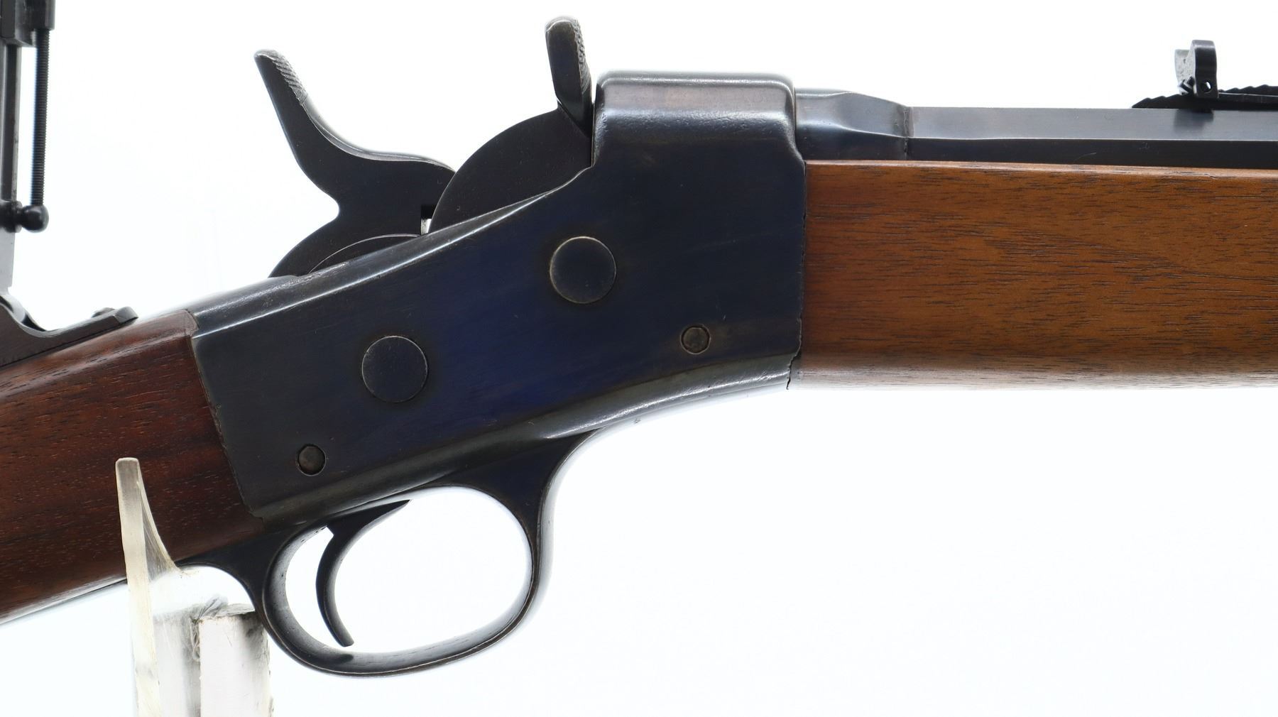 7/10, UNKNOWN, MODEL: ROLLING BLOCK CUSTOM , CALIBER: 38-55 WCF , BORE IS VERY GOOD, SHINY. GLOBE FRONT SIGHT WITH INSERT. ADJUSTABLE U NOTCH REAR SIGHT. 1/3 OCTAGONAL 2/3 ROUND BARREL. CHECKERED SPUR HAMMER. RECEIVER TANG DRILLED AND TAPPED. ELEVATION ADJUSTABLE FOLDING TANG PEEP SIGHT INSTALLED. TWO PIECE SMOOTH WOOD STOCKS. STRAIGHT GRIP. GROOVED BLACK POLYMER BUTT PLATE. METAL FINISH SHOWS SOME SCRATCHES, HANDLING MARKS AND WEAR, THERE ARE SOME PITTED SPOTS IN THE RECEIVER. STOCK SHOWS SOME MARKS AND SCRATCHES., ACTION: ROLLING BLOCK RIFLE , BARREL LENGTH: 28", SERIAL: NA, CONDITION: 7/10, CLASS: CANADIAN NON RESTRICTED