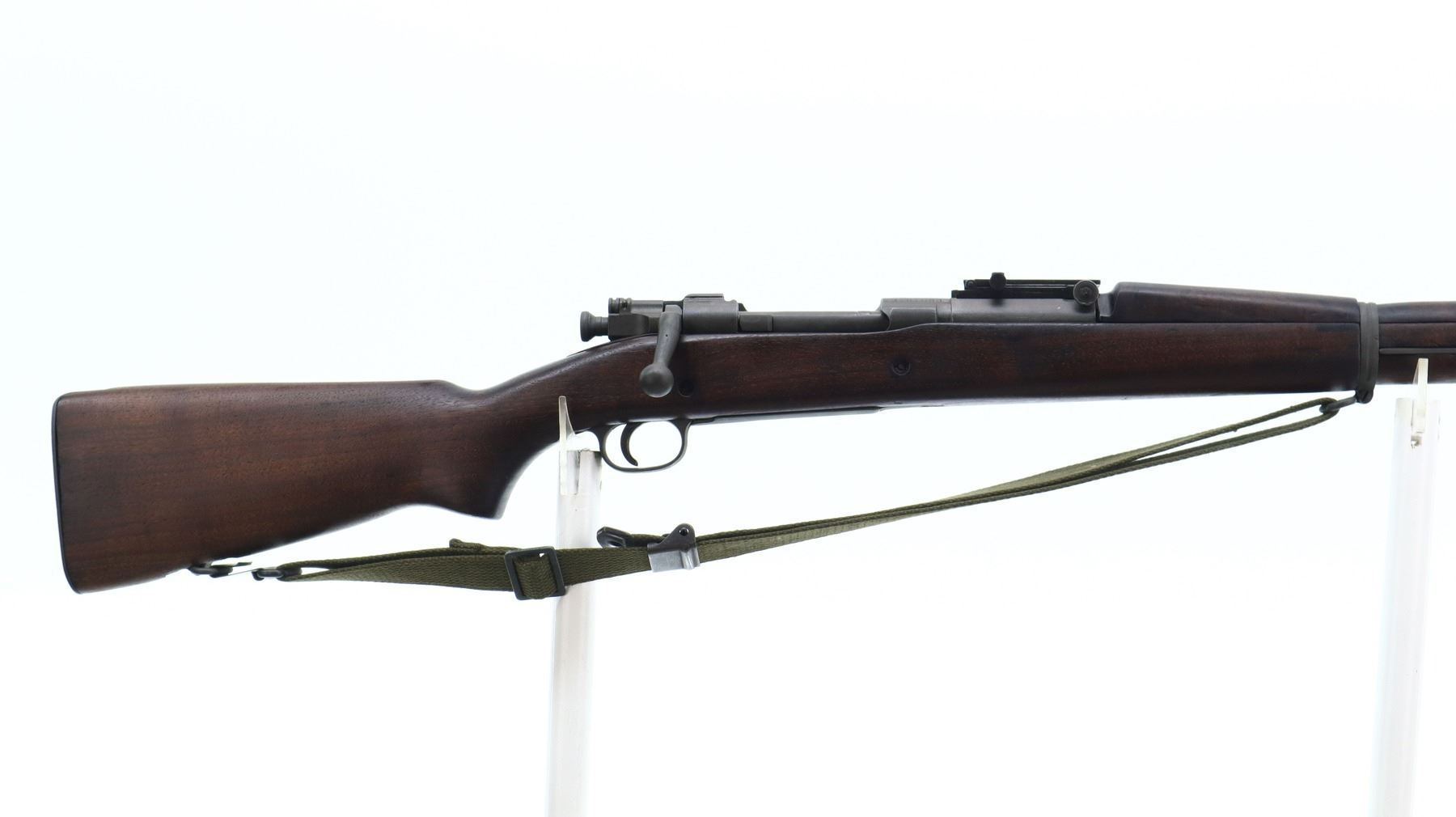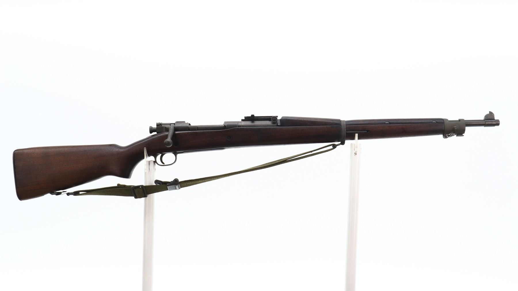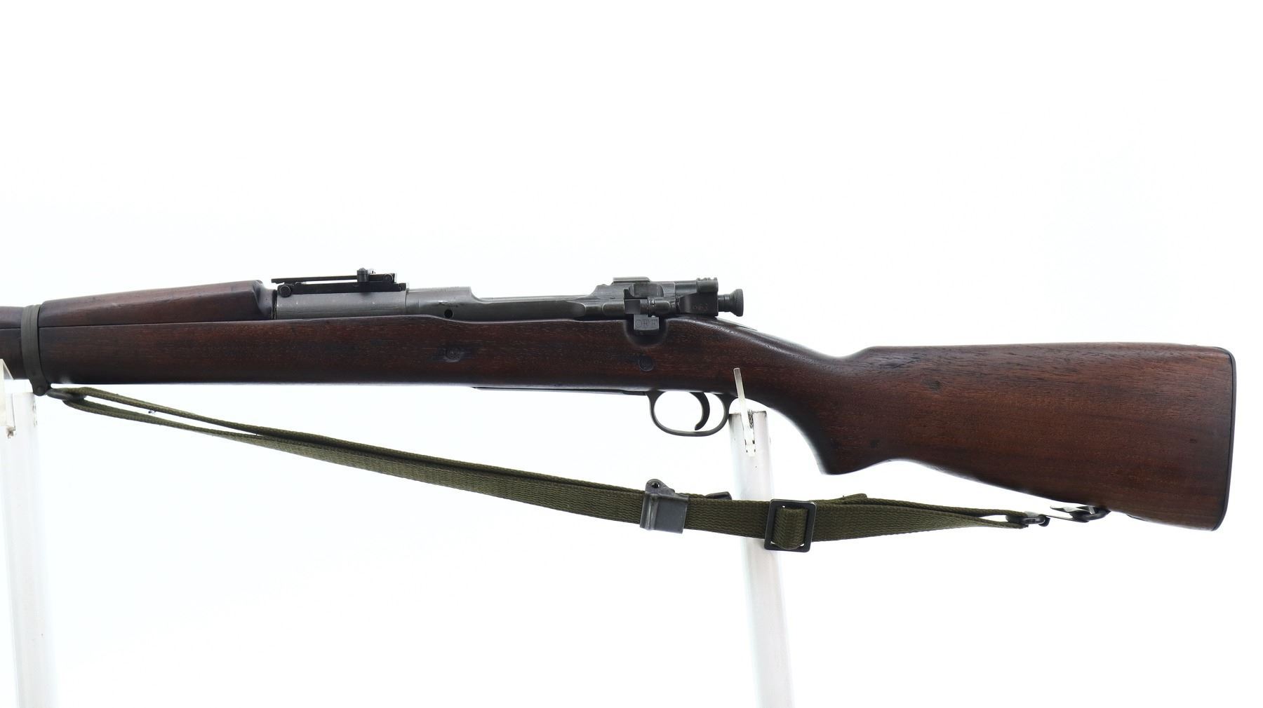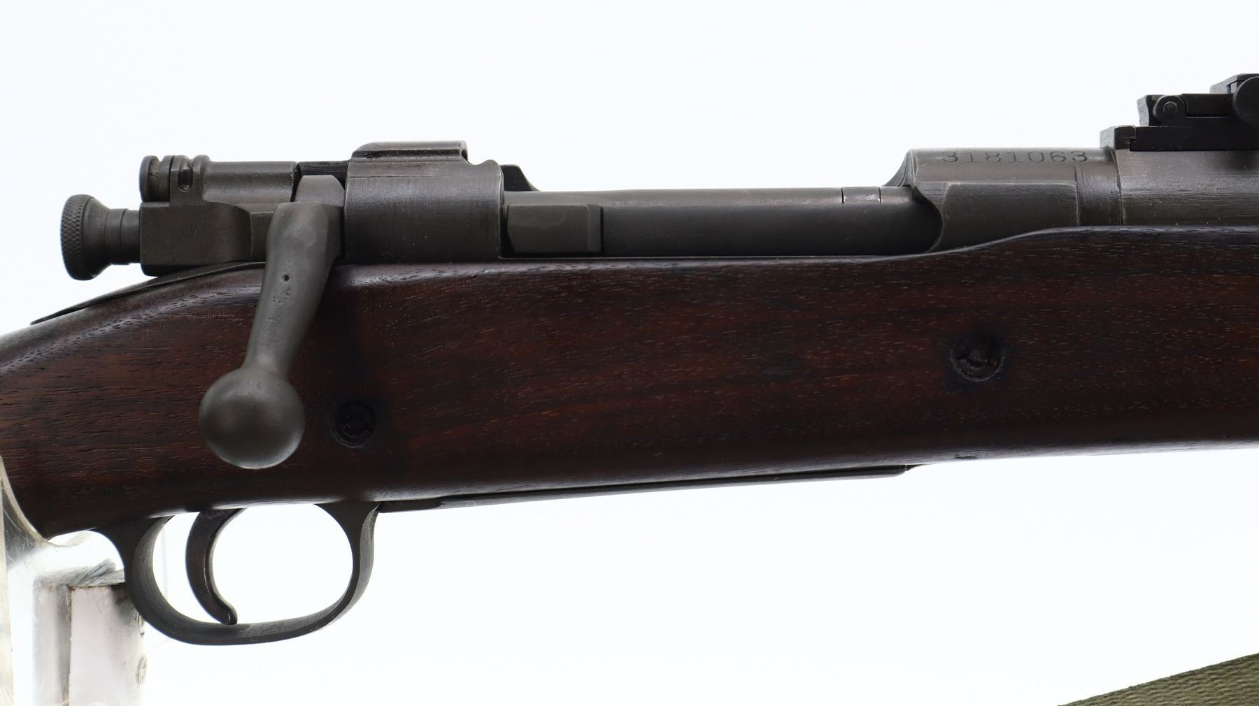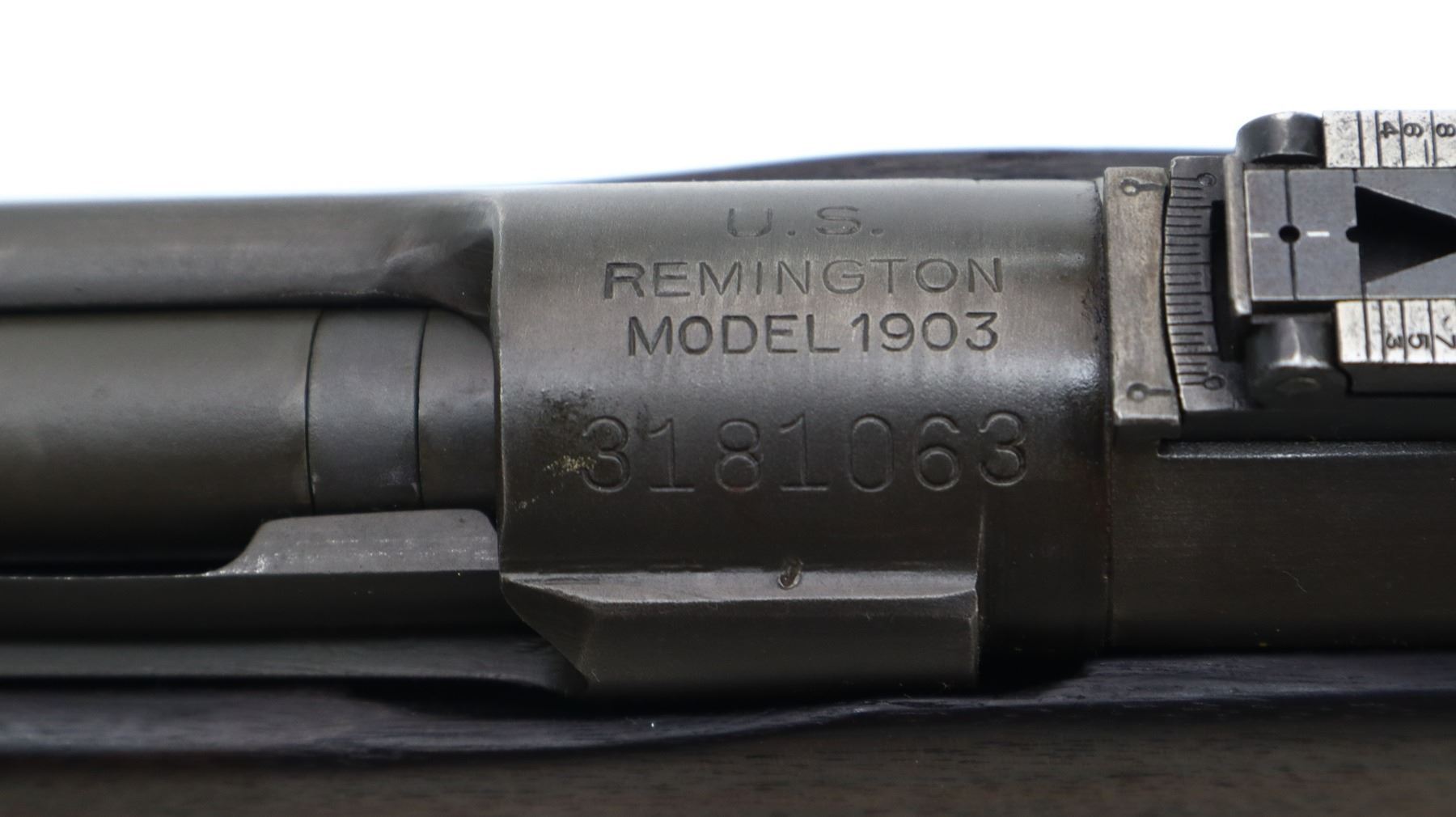 7+/10, US RIFLE , MODEL: 1903 , CALIBER: 30-06 SPRG, BORE IS GOOD WITH SLIGHT WEAR, SOME SHINE. MANUFACTURED BY REMINGTON. BOLT MARKED WITH AN R. BLADE FRONT SIGHT WITH RAMP. ADJUSTABLE U NOTCH LADDER REAR SIGHT. PARKERIZED FINISH. BARREL MARKED RA 3-42. TWO PIECE FULL MILITARY WOOD STOCKS. PISTOL GRIP. CHECKERED STEEL BUTT PLATE WITH TRAP. SWIVELS WITH CANVAS MILITARY SLING. BAYONET LUG. STACKING SWIVEL. METAL FINISH SHOWS SOME SCRATCHES, HANDLING MARKS AND WEAR. STOCK SHOWS SOME MARKS, SCRATCHES AND WEAR. ACTION: BOLT ACTION RIFLE , BARREL LENGTH: 24", SERIAL: 3181063, CONDITION: 7+/10, CLASS: CANADIAN NON RESTRICTED
