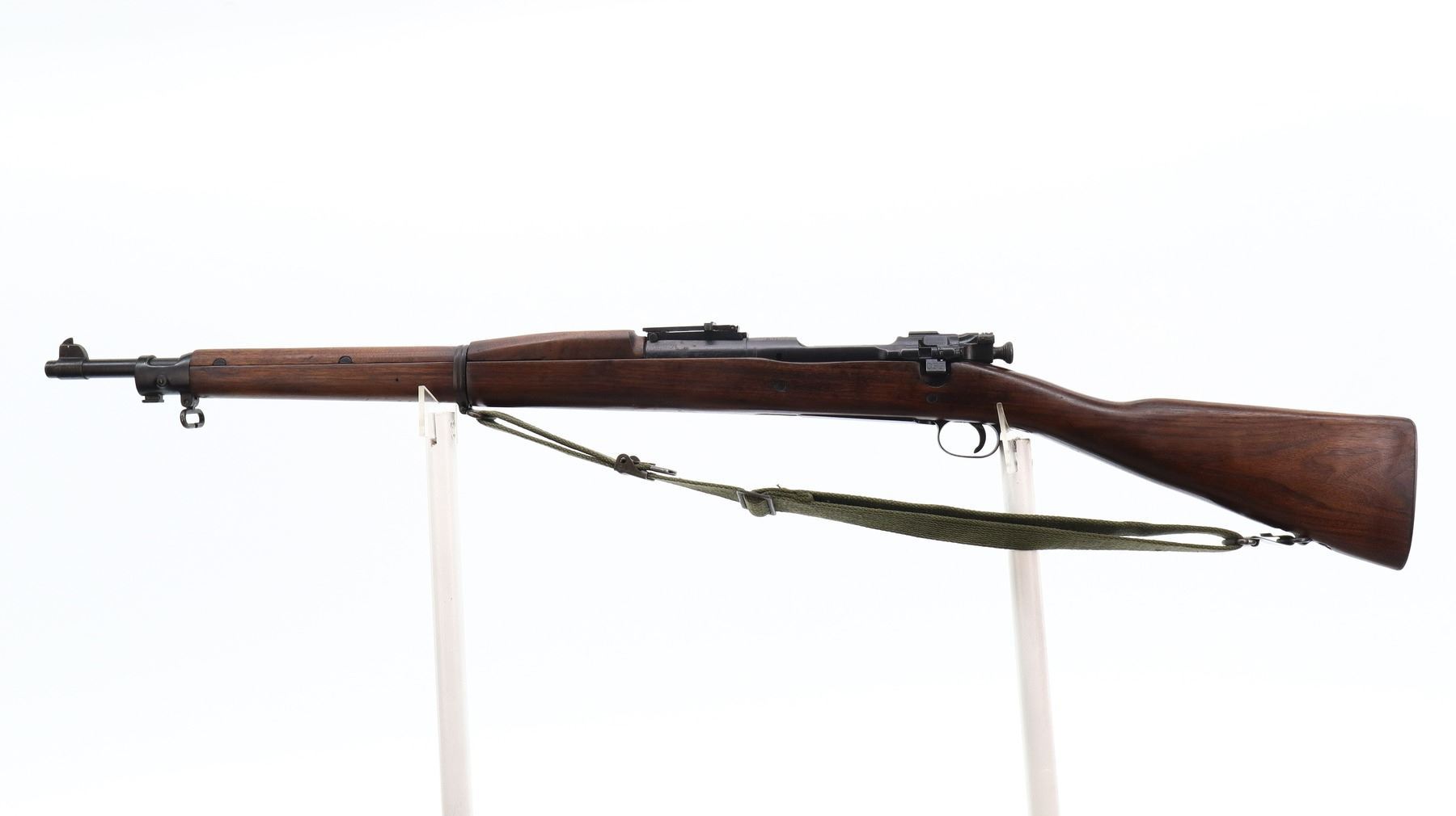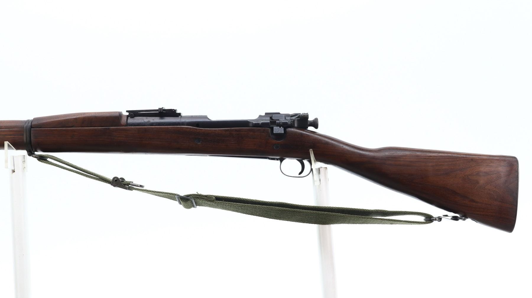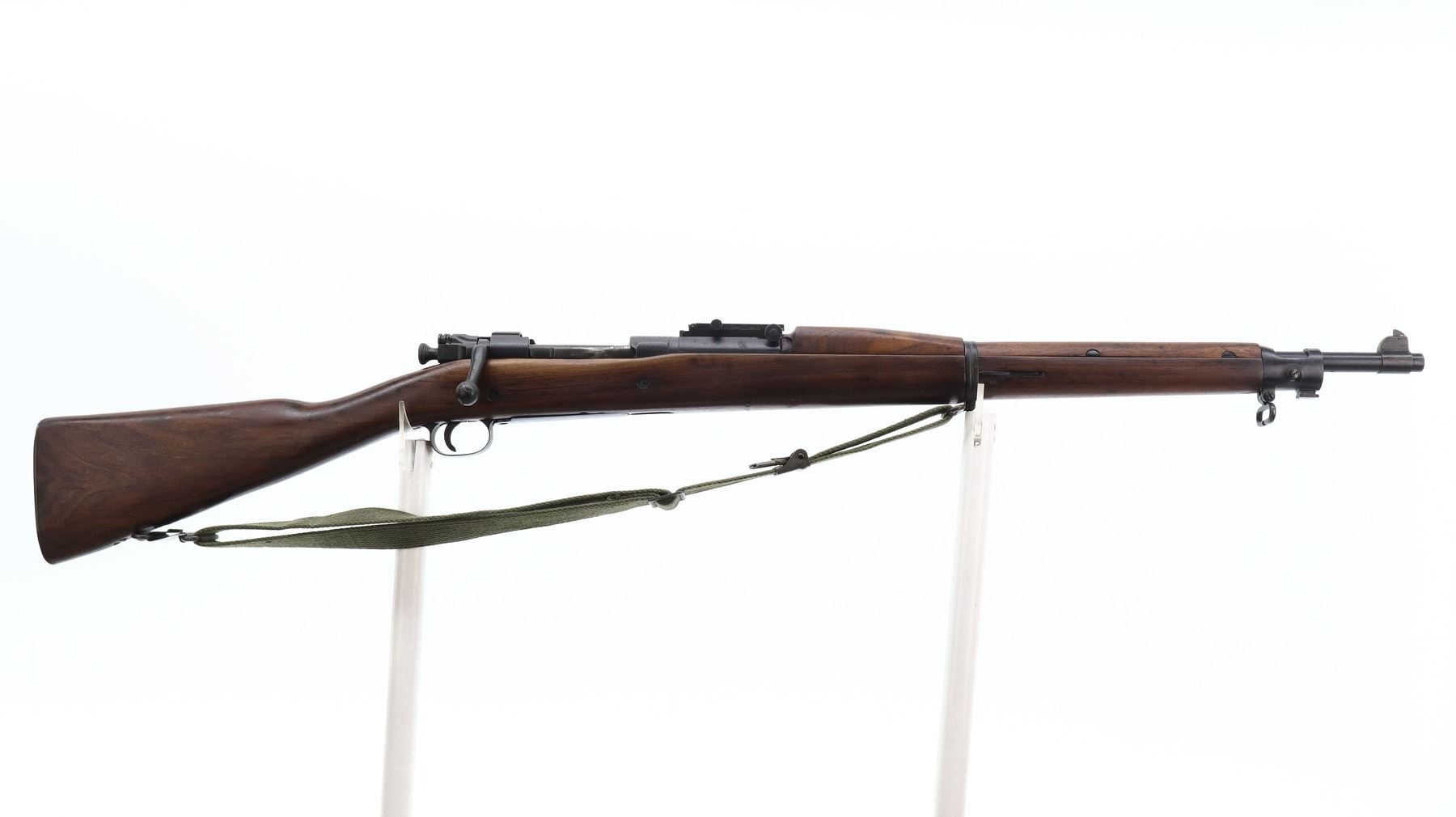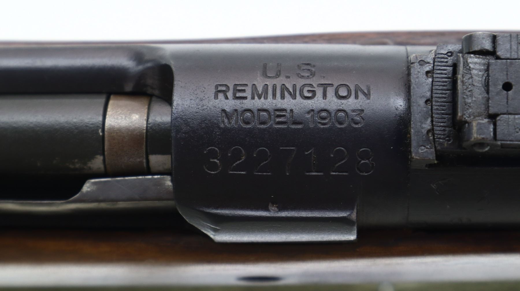 7/10, US RIFLE , MODEL: 1903, CALIBER: 30-06 SPRG, BORE IS FAIR, WORN, LIGHT PITTING, COUNTER BORED. MANUFACTURED BY REMINGTON. BOLT MARKED WITH AN R. BLADE FRONT SIGHT WITH RAMP. ADJUSTABLE U NOTCH LADDER REAR SIGHT. PARKERIZED FINISH. BARREL MARKED RA 9-42. TWO PIECE FULL MILITARY WOOD STOCKS. STRAIGHT GRIP. CHECKERED STEEL BUTT PLATE WITH TRAP. SWIVELS WITH CANVAS MILITARY SLING. BAYONET LUG. STACKING SWIVEL. METAL FINISH SHOWS SOME SCRATCHES, HANDLING MARKS AND WEAR. STOCK SHOWS SOME MARKS, SCRATCHES AND WEAR. ACTION: BOLT ACTION RIFLE , BARREL LENGTH: 24", SERIAL: 3227128, CONDITION: 7/10, CLASS: CANADIAN NON RESTRICTED