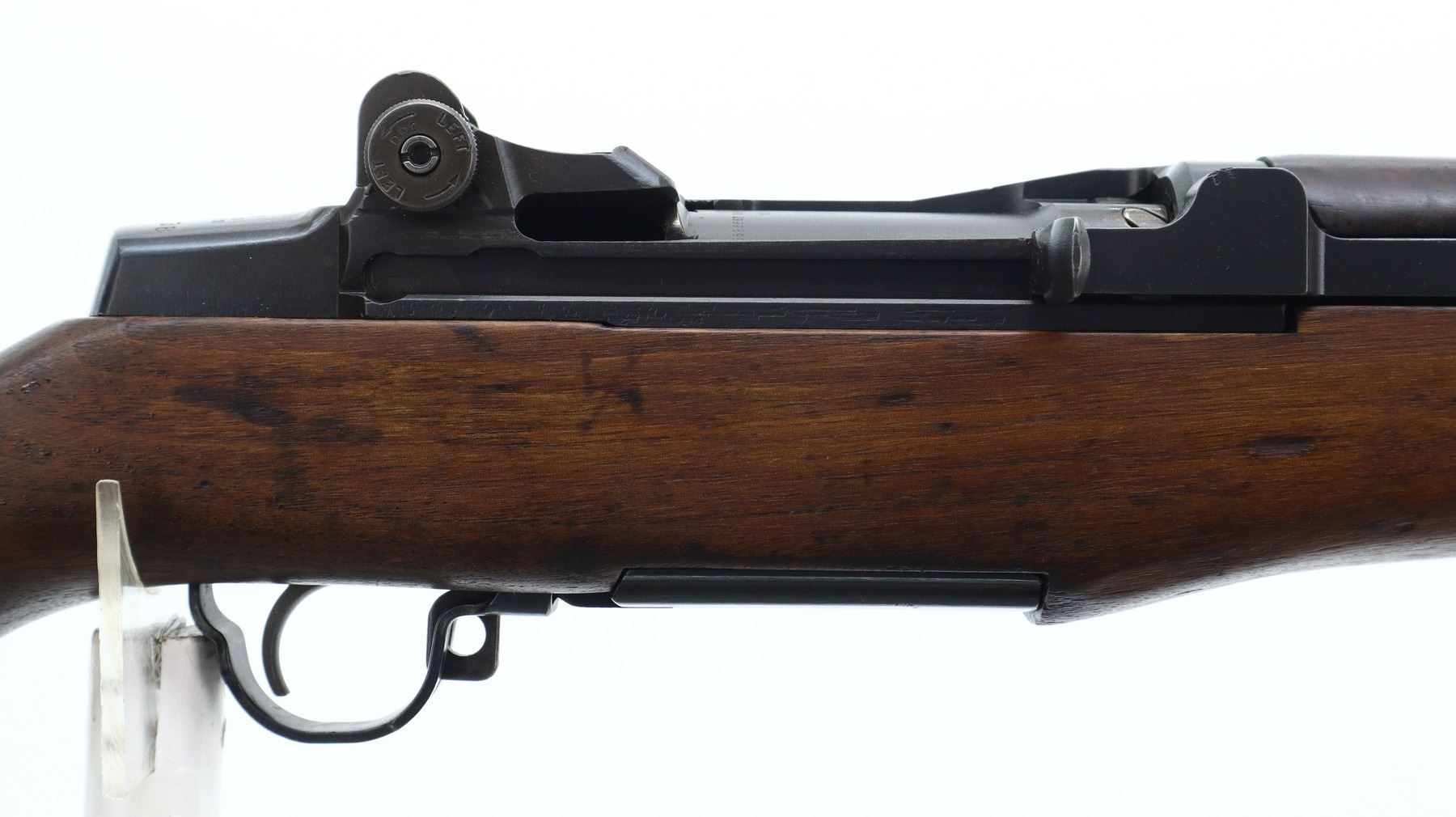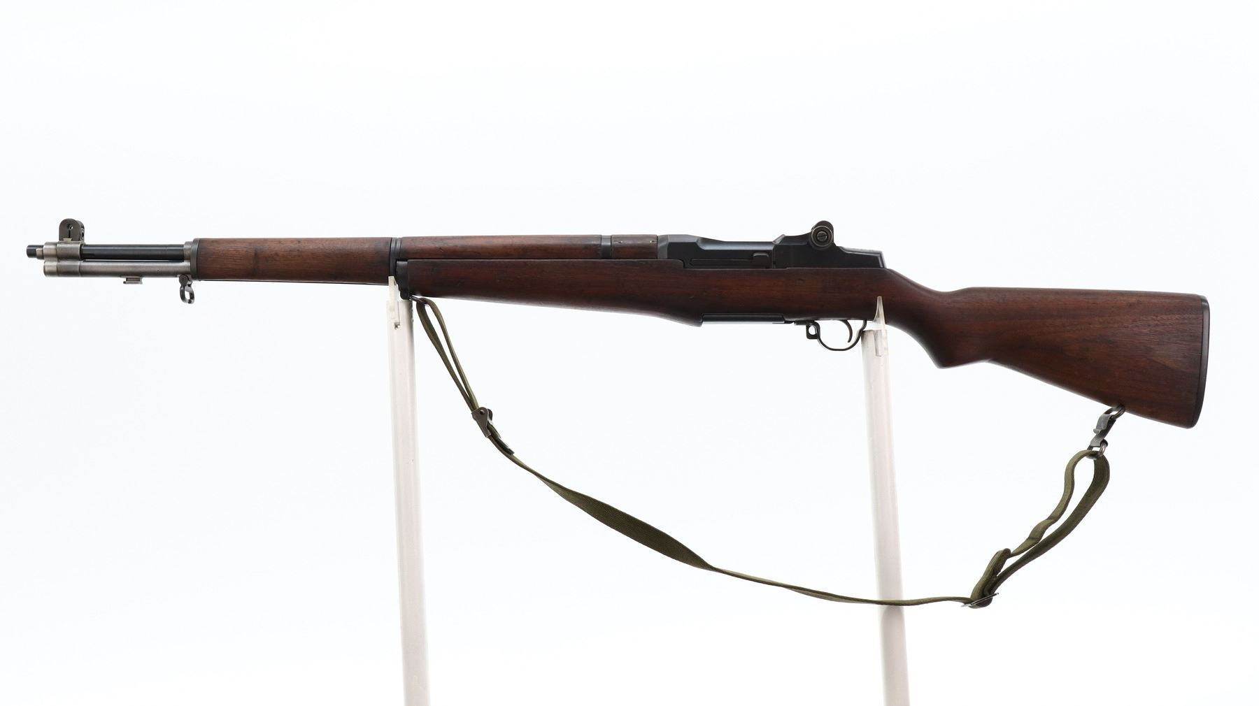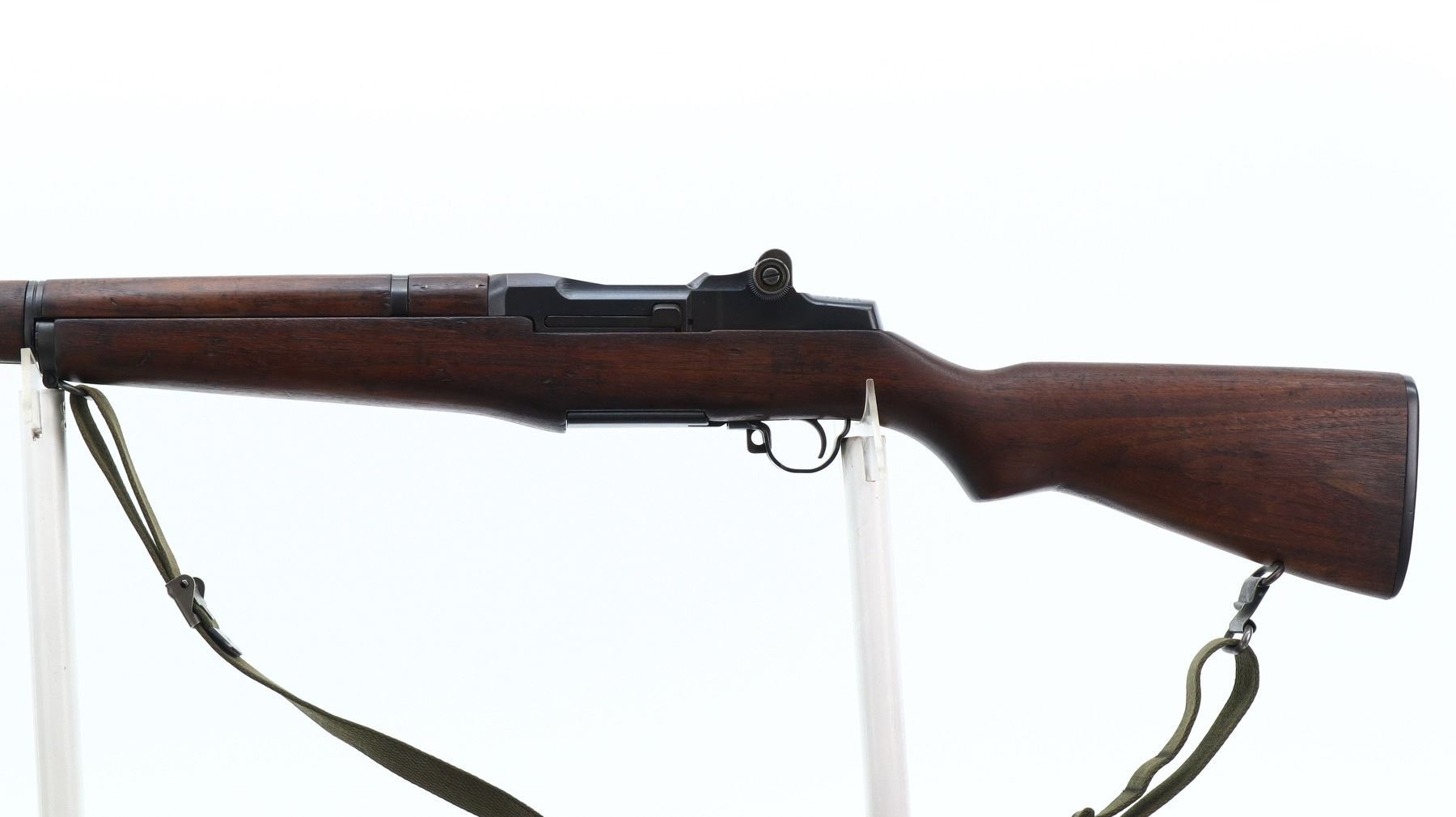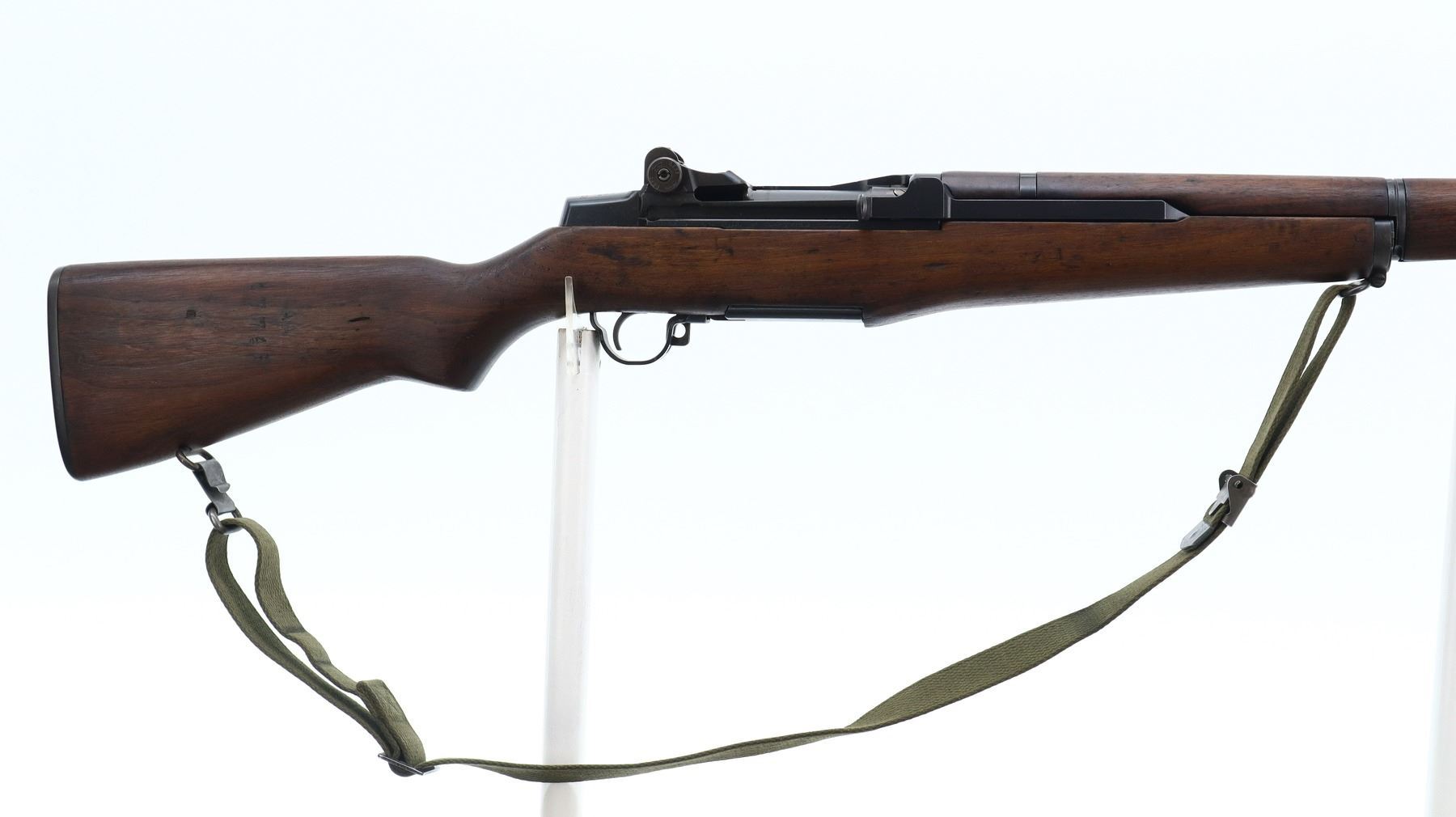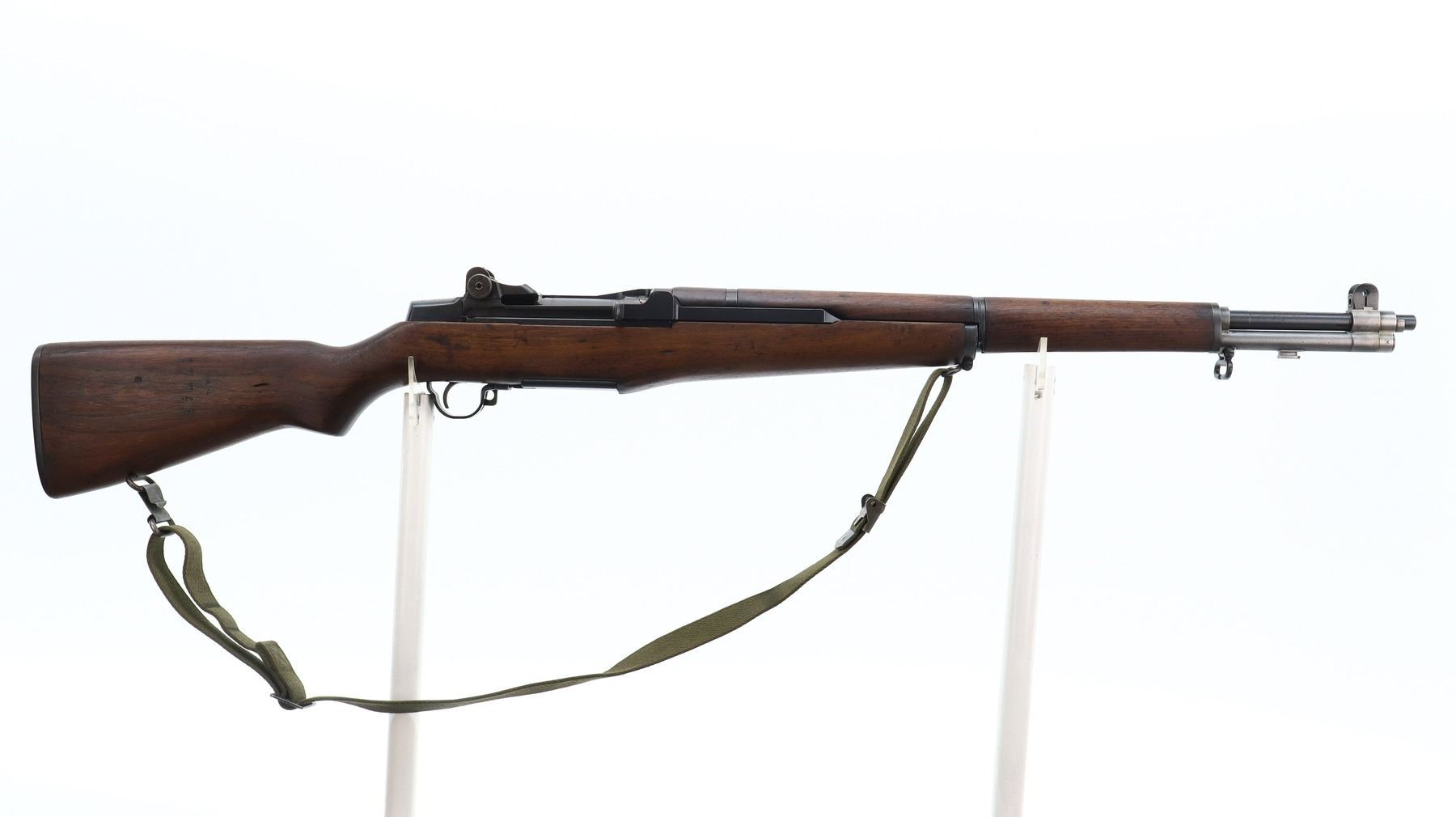 7/10, US RIFLE , MODEL: M1 GARAND, CALIBER: 30-06 SPRG, BORE IS FAIR, WORN, LIGHT PITTING. MANUFACTUREED BY SPRINGFIELD ARMOURY. BLADE FRONT SIGHT WITH EARS. ADJUSTABLE REAR PEEP SIGHT. BARREL MARKED LMR 9-53. 3 PIECE SMOOTH FULL MILITARY WOOD STOCKS. REAR HANDGUARD REPAIRED. PISTOL GRIP. CHECKERED STEEL BUTT PLATE WITH TRAP. SLING SWIVELS WITH CANVAS MILITARY SLING. BAYONET LUG. STACKING SWIVEL. METAL FINISH SHOWS SOME PITTED SPOTS, SCRATCHES, HANDLING MARKS AND WEAR. STOCKS SHOW SOME MARKS, SCRATCHES AND WEAR. ACTION: SEMI AUTOMATIC RIFLE , BARREL LENGTH: 24", SERIAL: 1026538, CONDITION: 7/10, CLASS: CANADIAN NON RESTRICTED