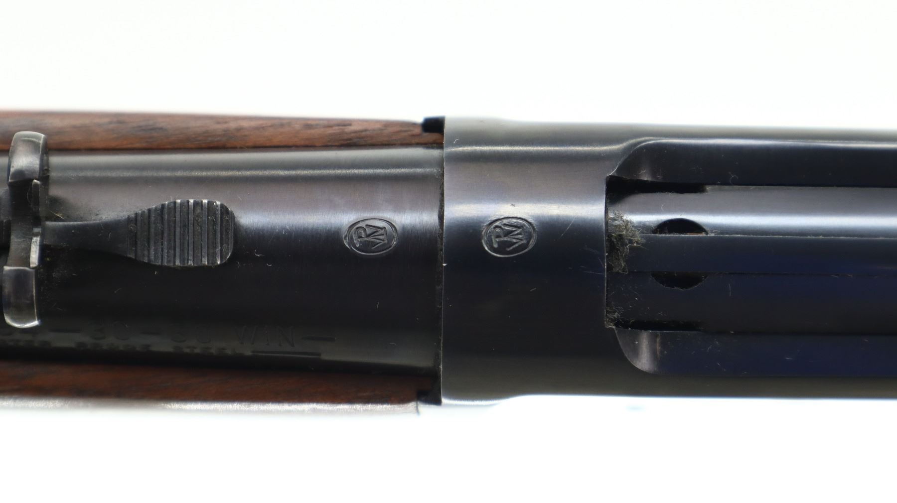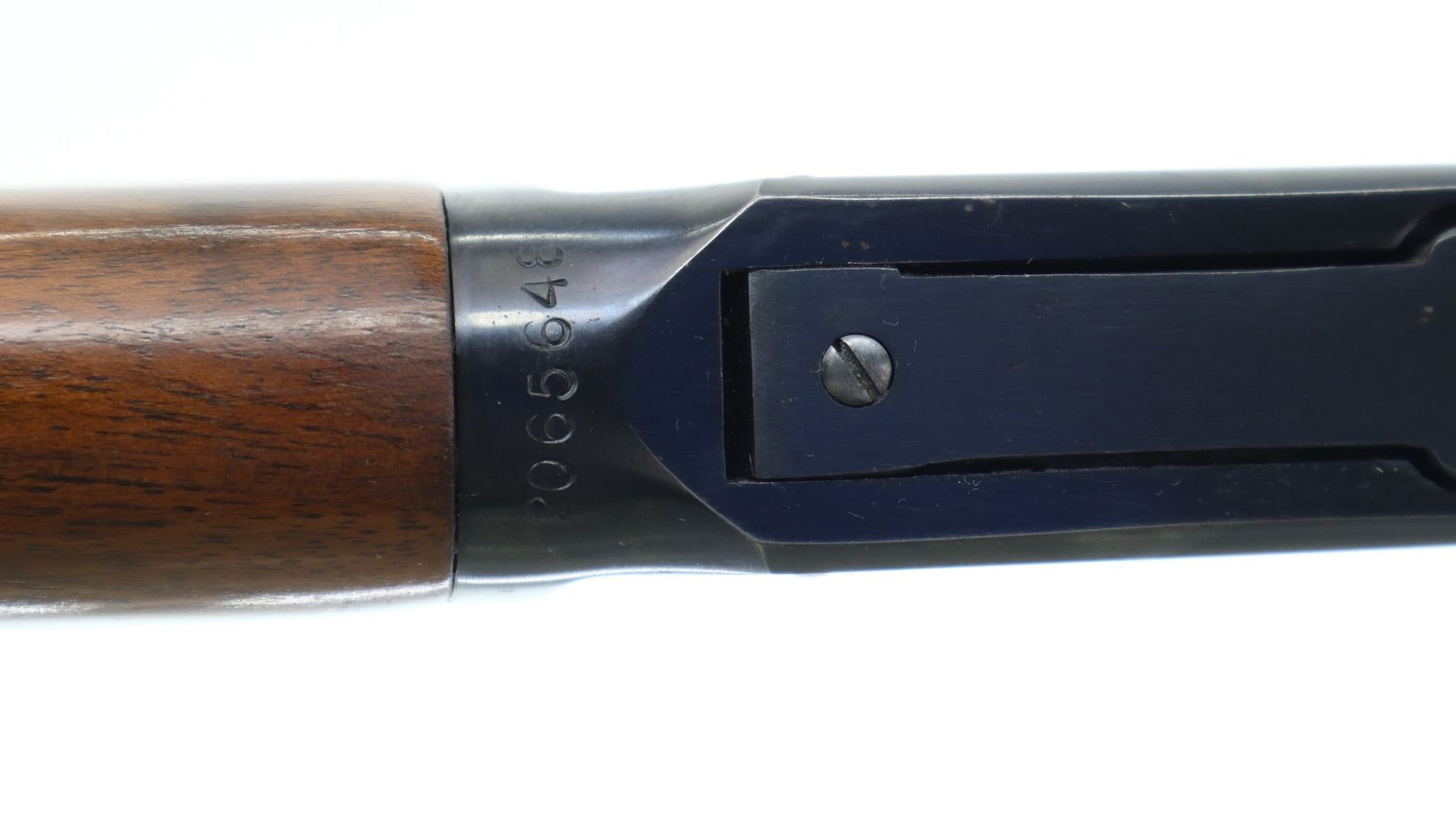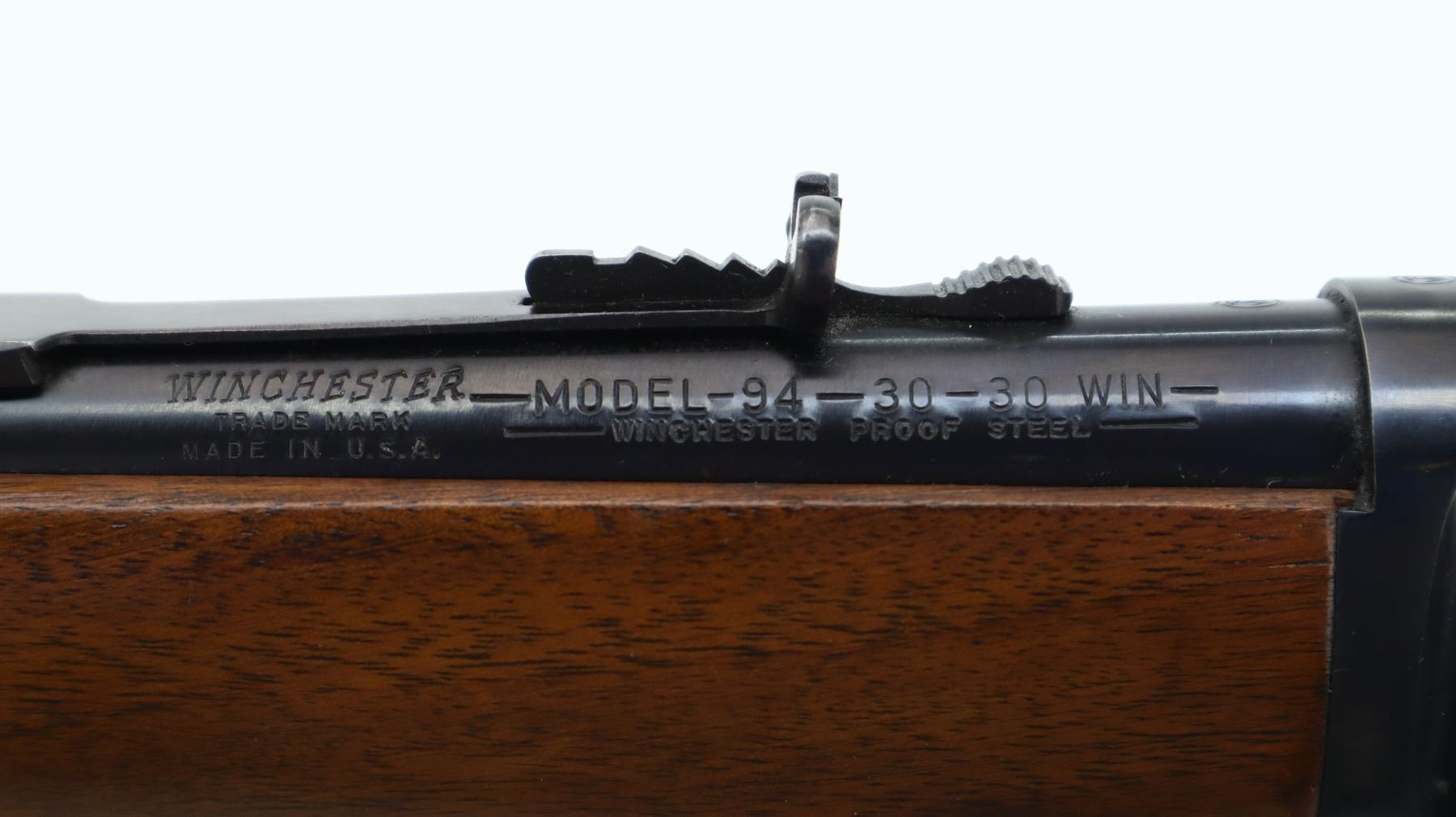 7+/10, WINCHESTER, MODEL: 94 PRE 64, CALIBER: 30-30 WIN , BORE IS EXCELLENT. MANUFACTURED 1954. BLADE FRONT SIGHT WITH HOOD AND RAMP. ADJUSTABLE U NOTCH REAR SIGHT. BLUED FINISH. GROOVED SPUR HAMMER. TWO PIECE SMOOTH WOOD STOCKS. STRAIGHT GRIP. CHECKERED STEEL BUTT PLATE. FULL LENGTH MAG TUBE. METAL FINISH SHOWS SCRATCHES, HANDLING MARKS AND WEAR. STOCKS SHOWS SOME MARKS, SCRATCHES AND WEAR., ACTION: LEVER ACTION RIFLE, BARREL LENGTH: 20", SERIAL: 2065648, CONDITION: 7+/10, CLASS: CANADIAN NON RESTRICTED