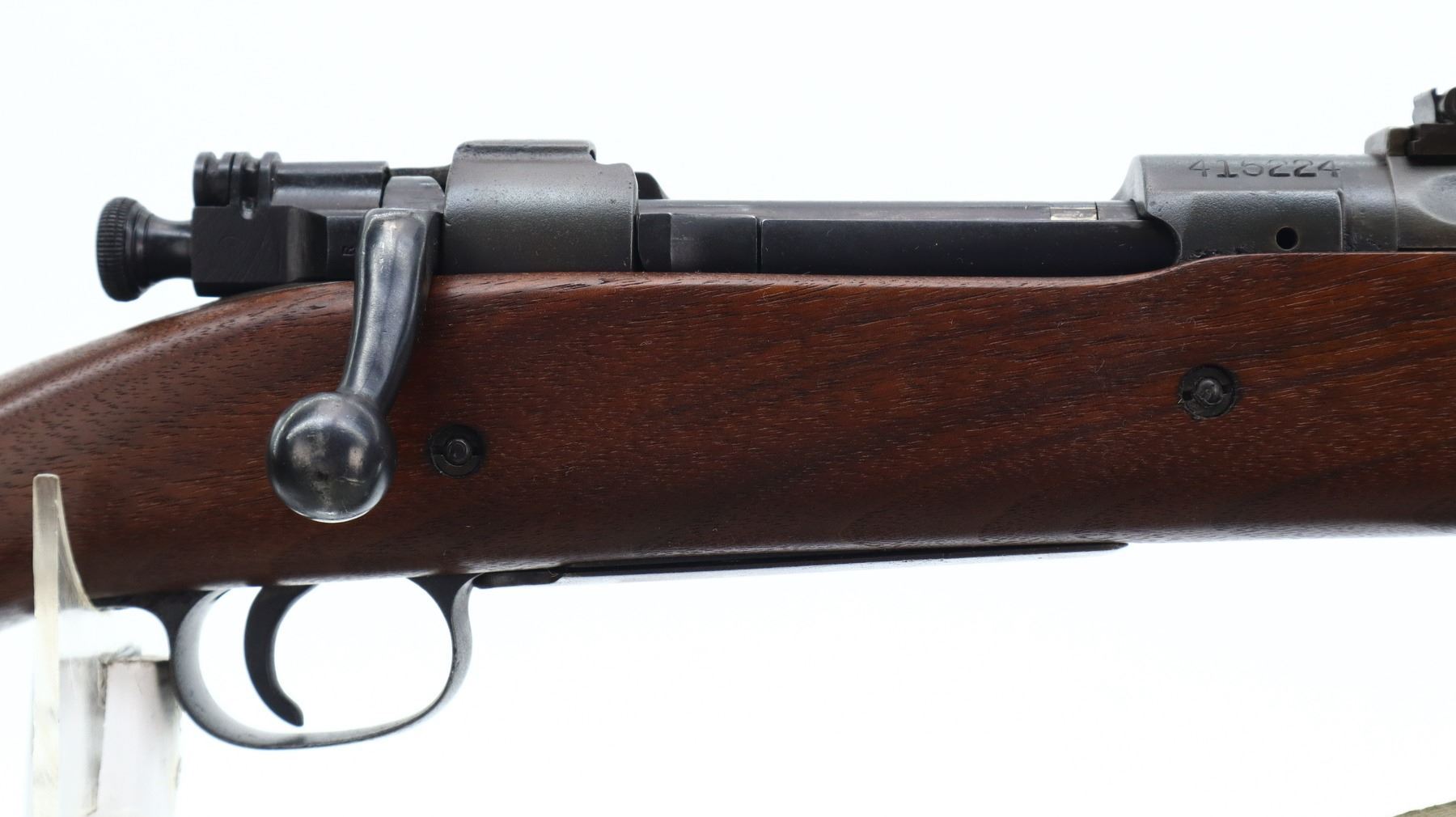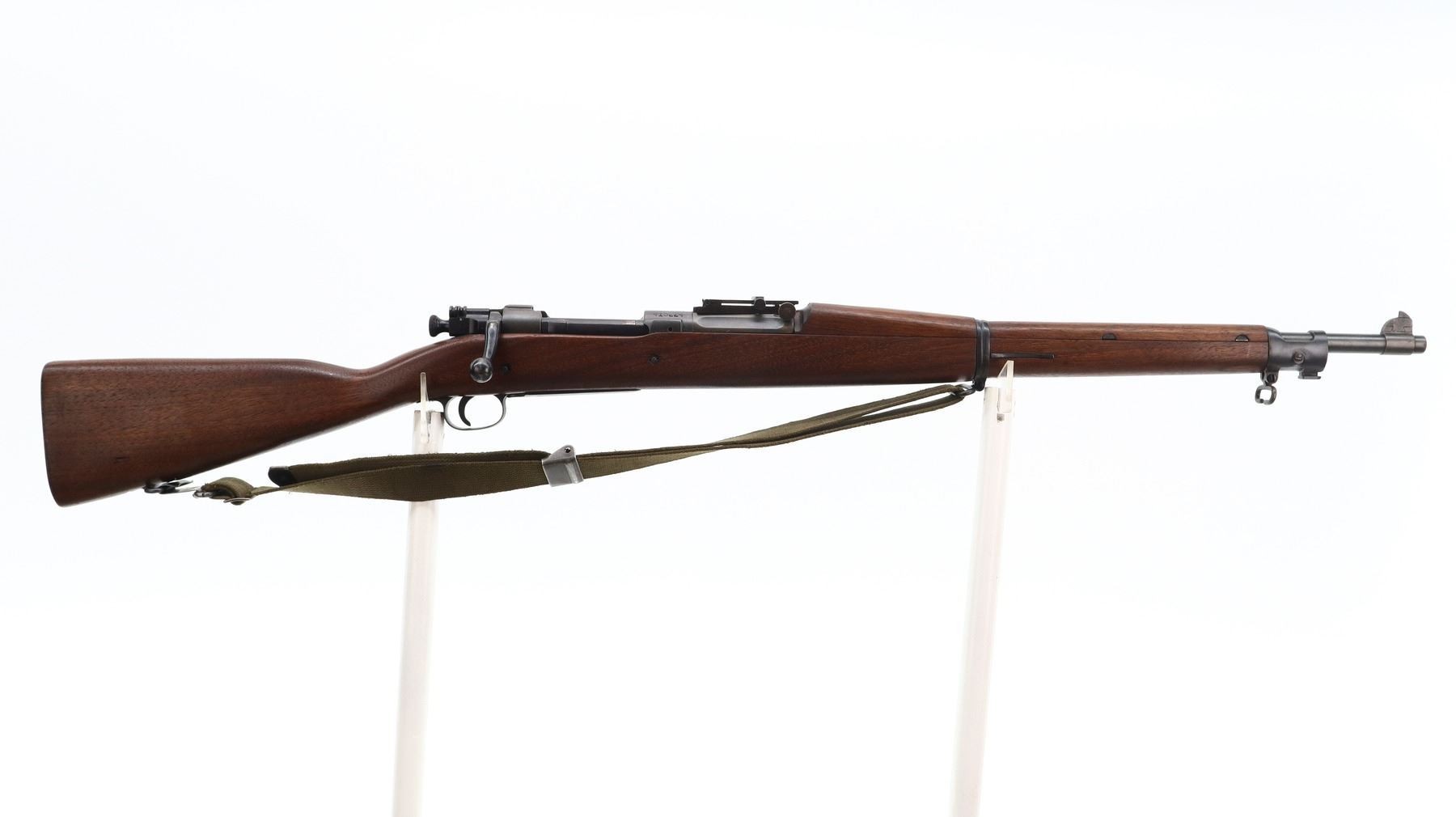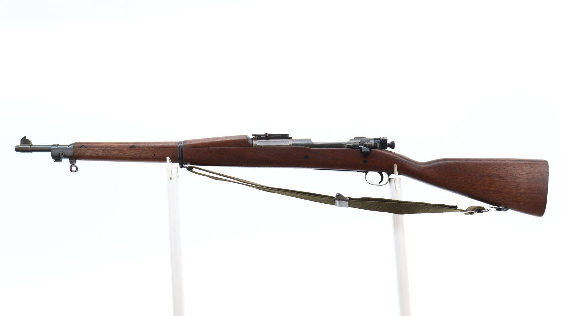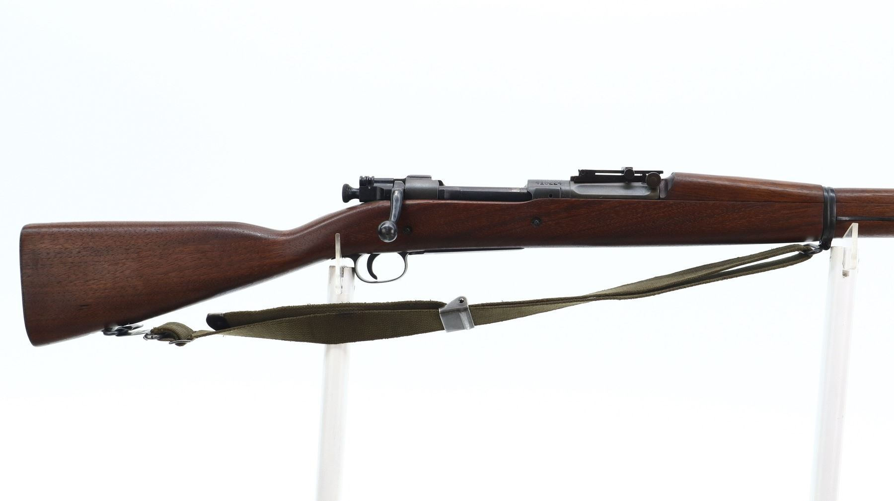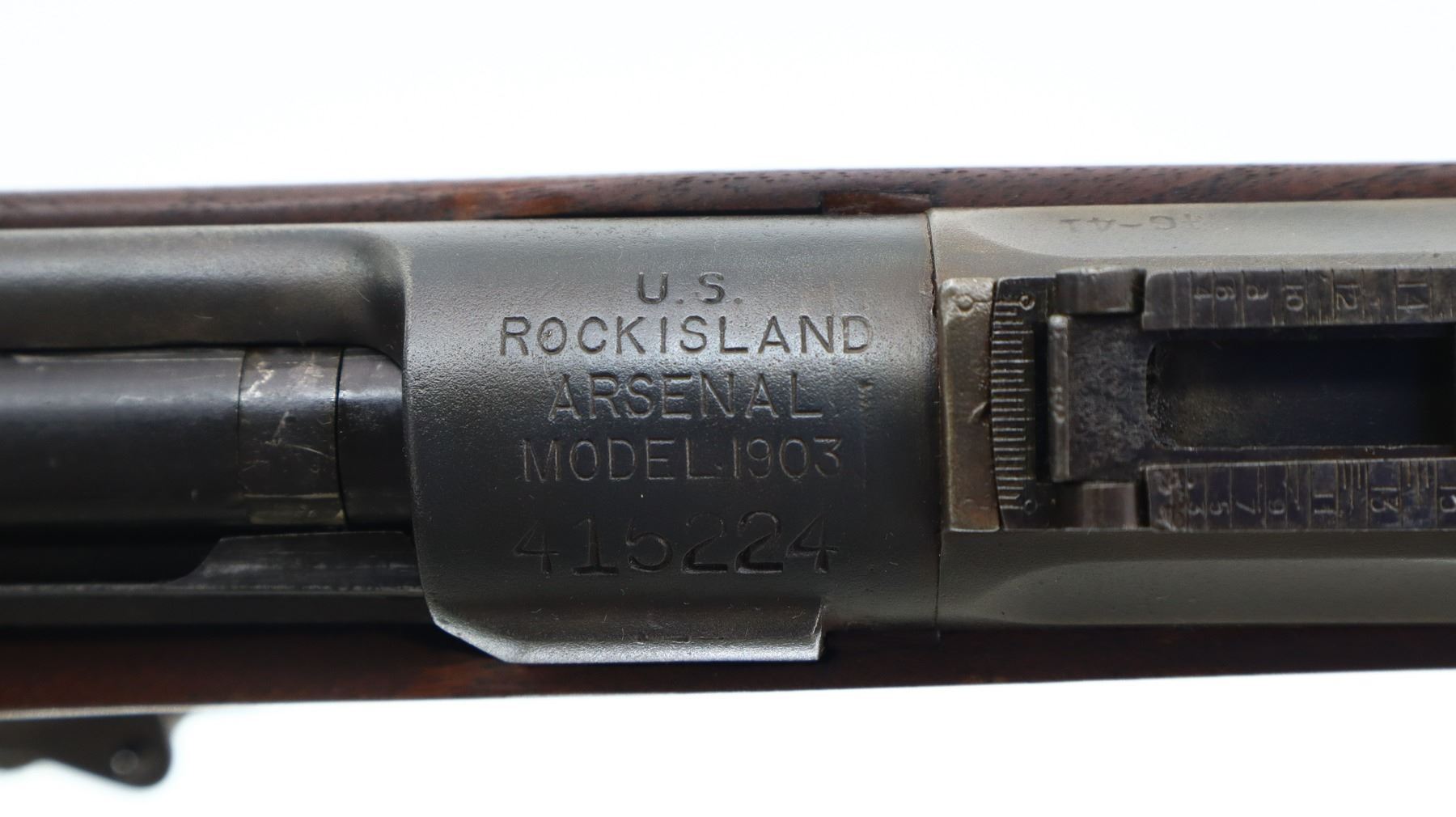 6/10, US RIFLE , MODEL: 1903, CALIBER: 30-06 SPRG, BORE IS POOR, WORN AND PITTED. MANUFACTURED BY ROCK ISLAND ARSENAL. BLADE FRONT SIGHT WITH RAMP. ADJUSTABLE U NOTCH LADDER REAR SIGHT. BARREL MARKED AV. TWO PIECE FULL MILITARY WOOD STOCKS. STRAIGHT GRIP. CHECKERED STEEL BUTT PLATE WITH TRAP. SWIVELS WITH CANVAS MILITARY SLING. BAYONET LUG. STACKING SWIVEL. METAL FINISH SHOWS SOME PITTING, SCRATCHES, HANDLING MARKS AND WEAR. STOCK SHOWS SOME MARKS, SCRATCHES AND WEAR. ACTION: BOLT ACTION RIFLE , BARREL LENGTH: 24", SERIAL: 415224, CONDITION: 6/10, CLASS: CANADIAN NON RESTRICTED