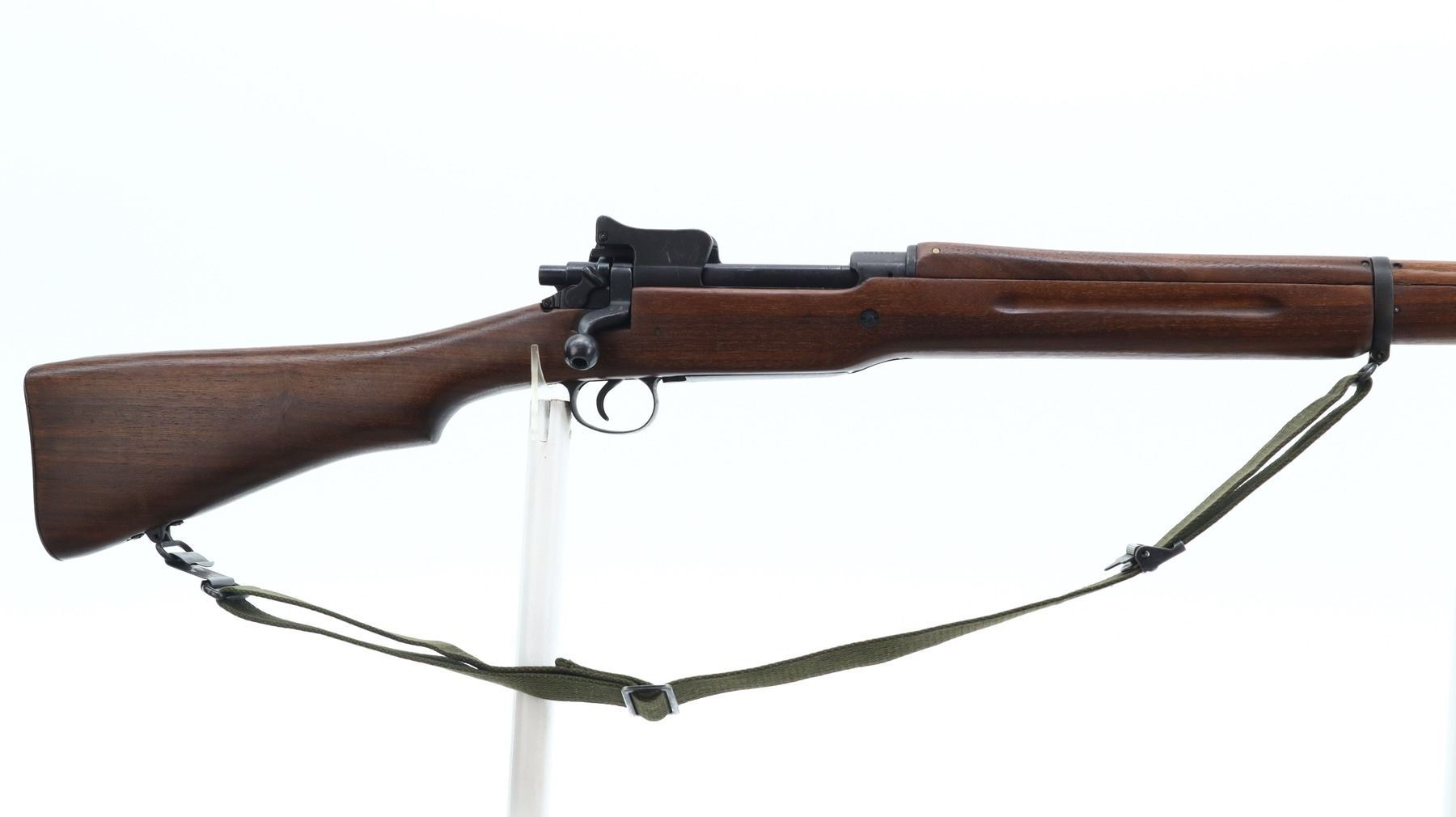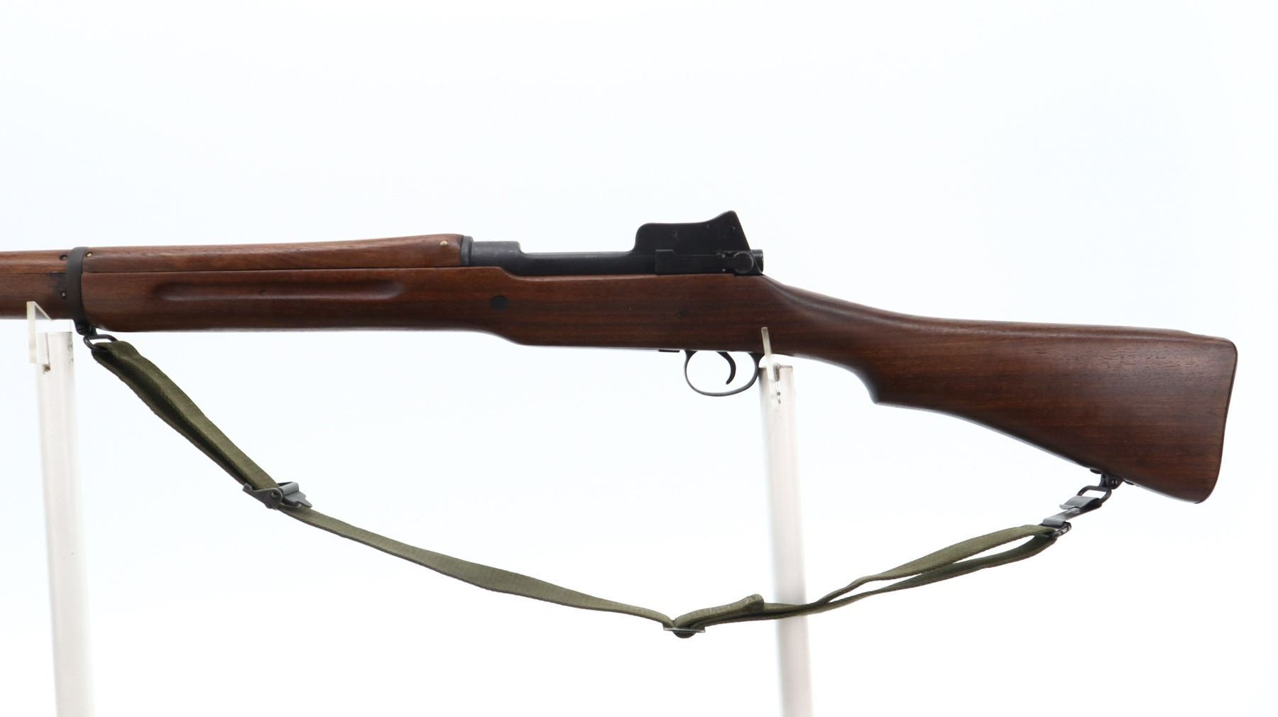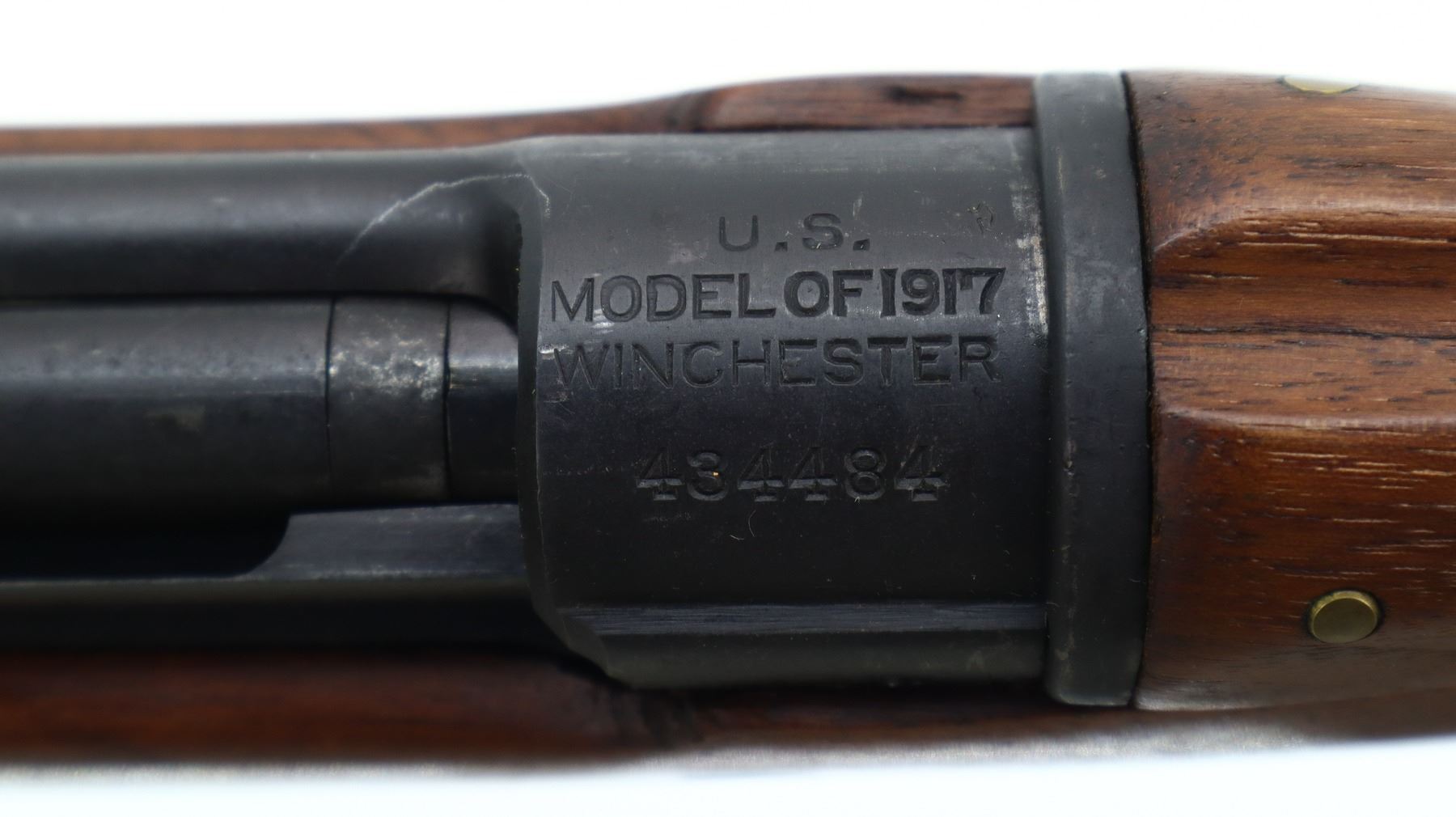 8/10, US RIFLE , MODEL: 1917, CALIBER: 30-06 SPRG, BORE IS VERY GOOD. MANUFACTURED BY WINCHESTER. BOLT NUMBERED TO MATCH. BLADE FRONT SIGHT WITH EARS AND RAMP. ADJUSTABLE REAR PEEP SIGHT WITH EARS. BLACK METAL FINISH. 3 PIECE FULL MILITARY WOOD STOCKS. FINGER GROOVED FOREND. PISTOL GRIP. SMOOTH STEEL BUTT PLATE WITH TRAP. SWIVELS WITH CANVAS MILITARY SLING. BAYONET LUG. STACKING SWIVEL. METAL FINISH SHOWS SOME SCRATCHES, HANDLING MARKS AND WEAR. STOCKS SHOWS SOME MARKS, SCRATCHES AND WEAR. ACTION: BOLT ACTION RIFLE , BARREL LENGTH: 26", SERIAL: 434484, CONDITION: 8/10, CLASS: CANADIAN NON RESTRICTED