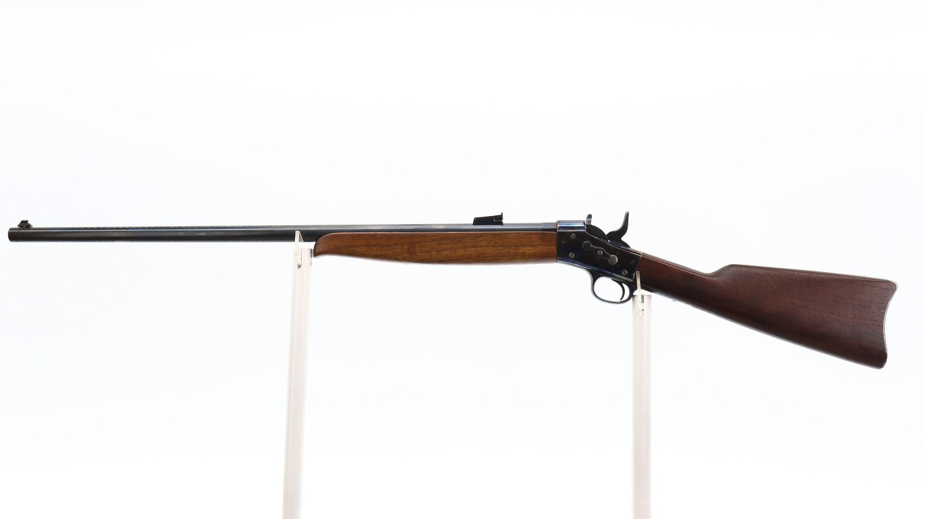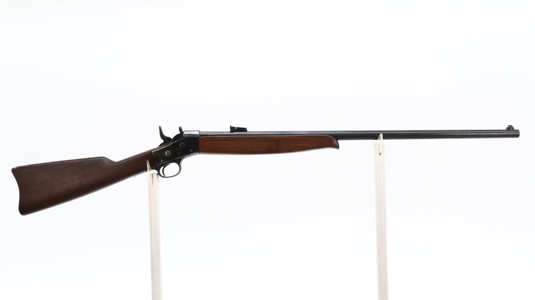 7/10, REMINGTON , MODEL: ROLLING BLOCK CUSTOM , CALIBER: 50-140 REMINGTON , COMES WITH HARDCASE, ACCESSORIES , BORE IS VERY GOOD. BLADE FRONT SIGHT. ADJUSTABLE U NOTCH REAR SIGHT. ROUND BARREL. CHECKERED SPUR HAMMER. TWO PIECE SMOOTH WOOD STOCKS. STRAIGHT GRIP. SMOOTH CURVED STEEL BUTT PLATE. INCLUDES CUSTOM HARD CASE, WITH CLEANING ROD, BRUSHES, WOOD AMMO BLOCK, OILER AND JAGS. AMMO IS AVAILABLE FOR THIS ITEM AS LOT 10798, RELOADING DIES AVAILABLE AS LOT 16104. METAL FINISH SHOWS SOME SCRATCHES, HANDLING MARKS AND WEAR. STOCK SHOWS SOME MARKS AND SCRATCHES. ACTION: ROLLING BLOCK RIFLE , BARREL LENGTH: 30", SERIAL: NA, CONDITION: 7/10, CLASS: CANADIAN NON RESTRICTED