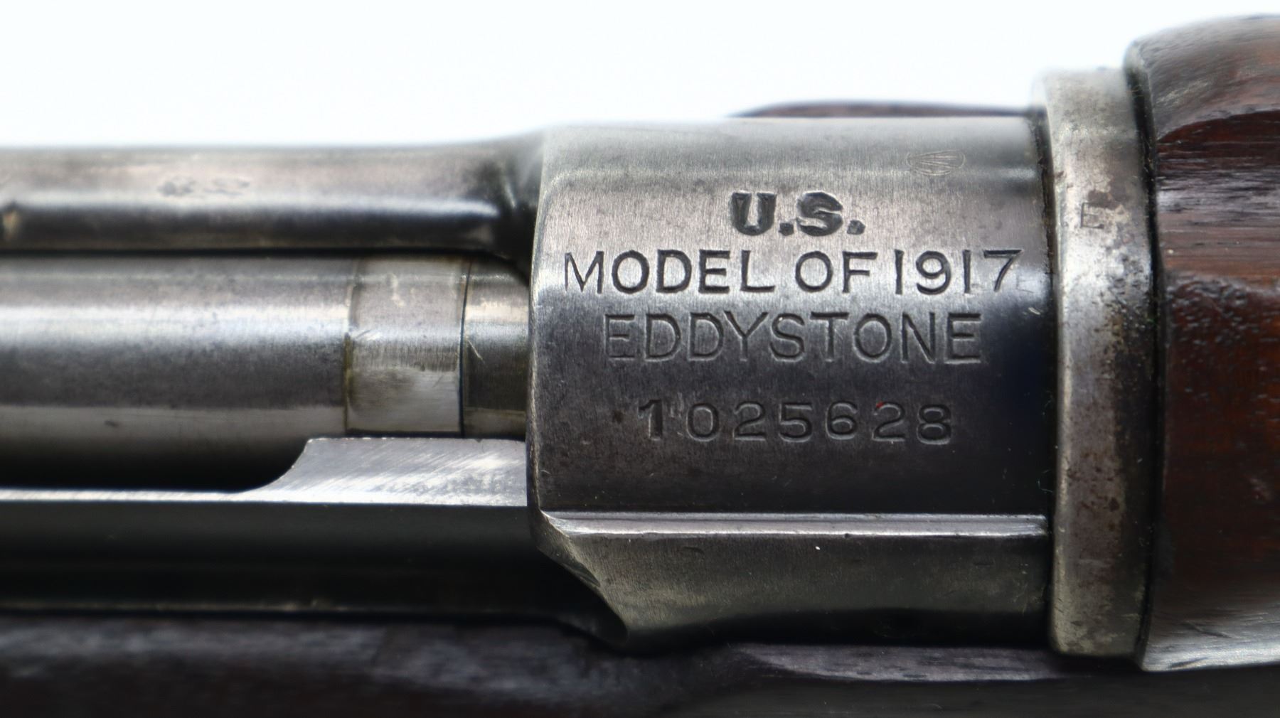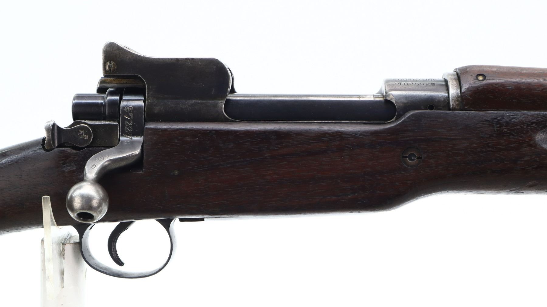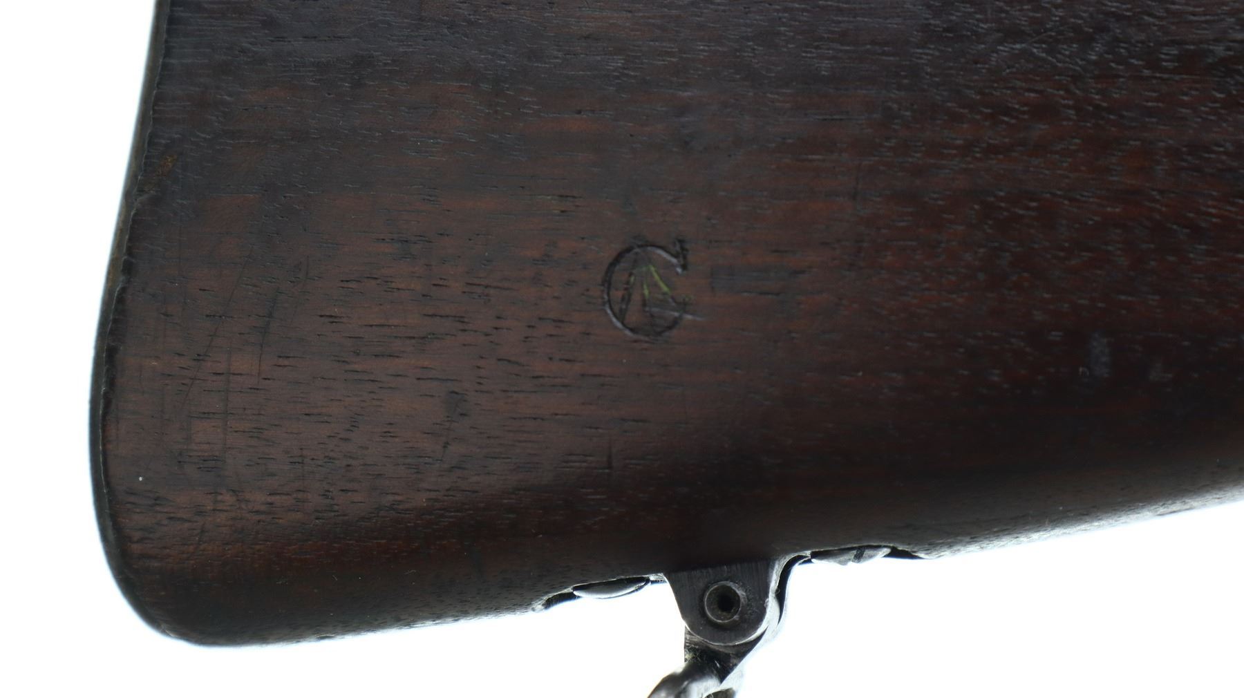 7/10, US ENFIELD , MODEL: 1917 CANADIAN , CALIBER: 30-06 SPRG , BORE IS FAIR WITH LIGHT PITTING. MANUFACTURED BY EDDYSTONE. BOLT IS MISMATCHED BY SERIAL #. RECEIVER AND STOCK BOTH MARKED WITH C BRD ARROW, INDICATING CANADIAN MILITARY OWNERSHIP. BLADE FRONT SIGHT WITH RAMP AND EARS. ADJUSTABLE REAR PEEP SIGHT WITH EARS. BARREL MARKED WITH LETTER E 9-18. 3 PIECE FULL MILITARY WOOD STOCKS. FINGER GROOVED FOREND. PISTOL GRIP. SMOOTH STEEL BUTT PLATE WITH TRAP. SLING SWIVELS. BAYONET LUG. STACKING SWIVEL. FOREND TIP MARKED WITH THE LETTER E. METAL FINISH SHOWS SOME SCRATCHES, HANDLING MARKS AND WEAR. STOCKS SHOWS SOME MARKS, SCRATCHES AND WEAR. ACTION: BOLT ACTION RIFLE , BARREL LENGTH: 25.75", SERIAL: 1022628, CONDITION: 7/10, CLASS: CANADIAN NON RESTRICTED