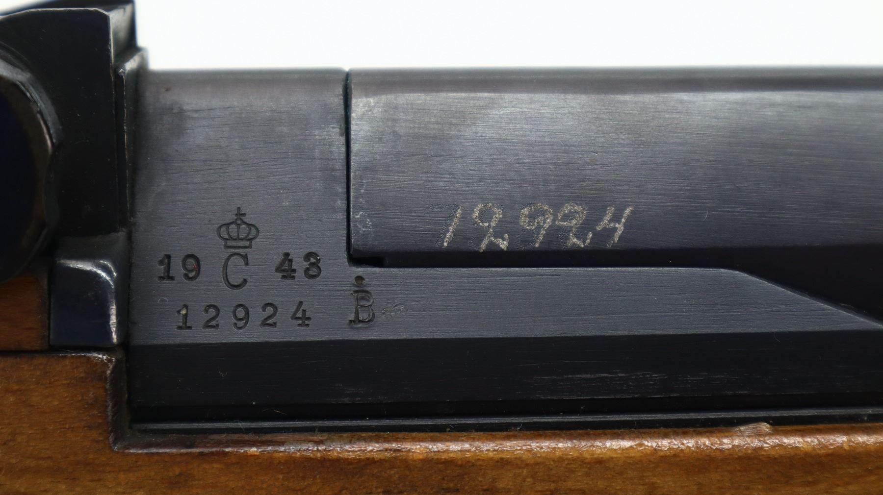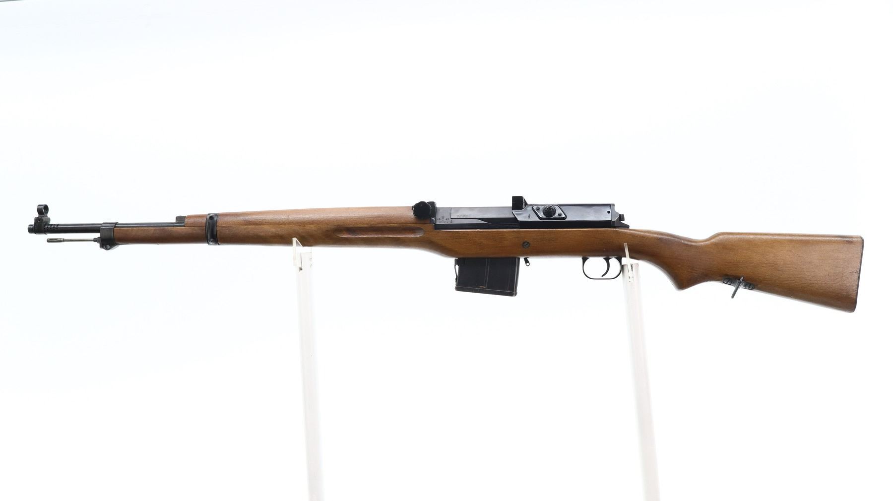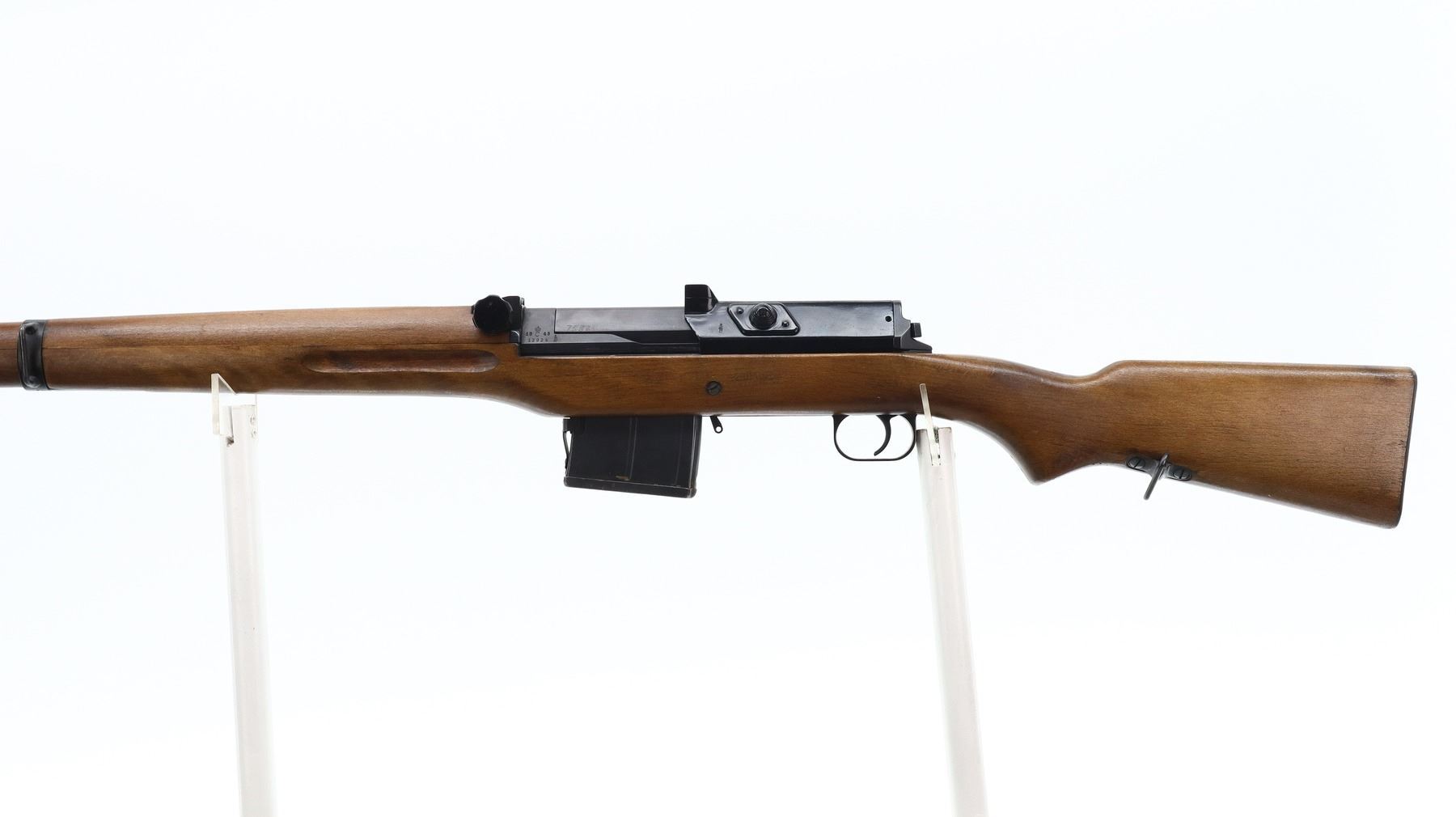 7+/10, SWEDISH LJUNGMAN, MODEL: AG42B, CALIBER: 6.5 X 55 SWEDISH , COMES WITH MAGAZINE , BORE IS FAIR, WORN, LIGHT PITTING. MANUFACTURED 1943. BLADE FRONT SIGHT WITH HOOD AND RAMP. ADJUSTABLE U NOTCH REAR SIGHT. BLUED FINISH. BLACK RUBBER CASE DEFLECTOR. TWO PIECE SMOOTH FULL MILITARY WOOD STOCKS. FINGER GROOVED FOREND. PISTOL GRIP. SMOOTH STEEL BUTT PLATE. SLING SWIVELS. CLEANING ROD. MUZZLE BREAK. METAL FINISH SHOWS SOME SCRATCHES, HANDLING MARKS AND WEAR. STOCK SHOWS SOME MARKS, SCRATCHES AND WEAR. ACTION: SEMI AUTOMATIC RIFLE , BARREL LENGTH: 23.5", SERIAL: 12924, CONDITION: 7+/10, CLASS: CANADIAN NON RESTRICTED