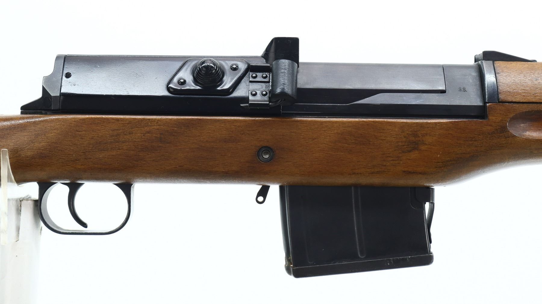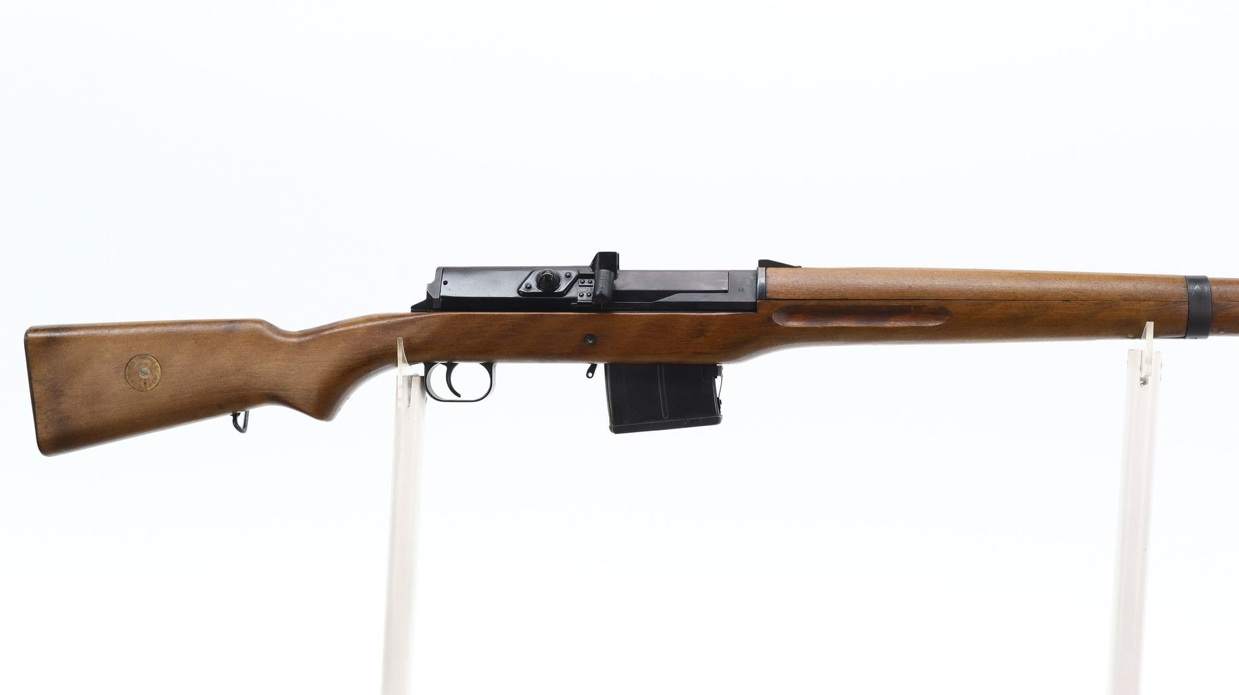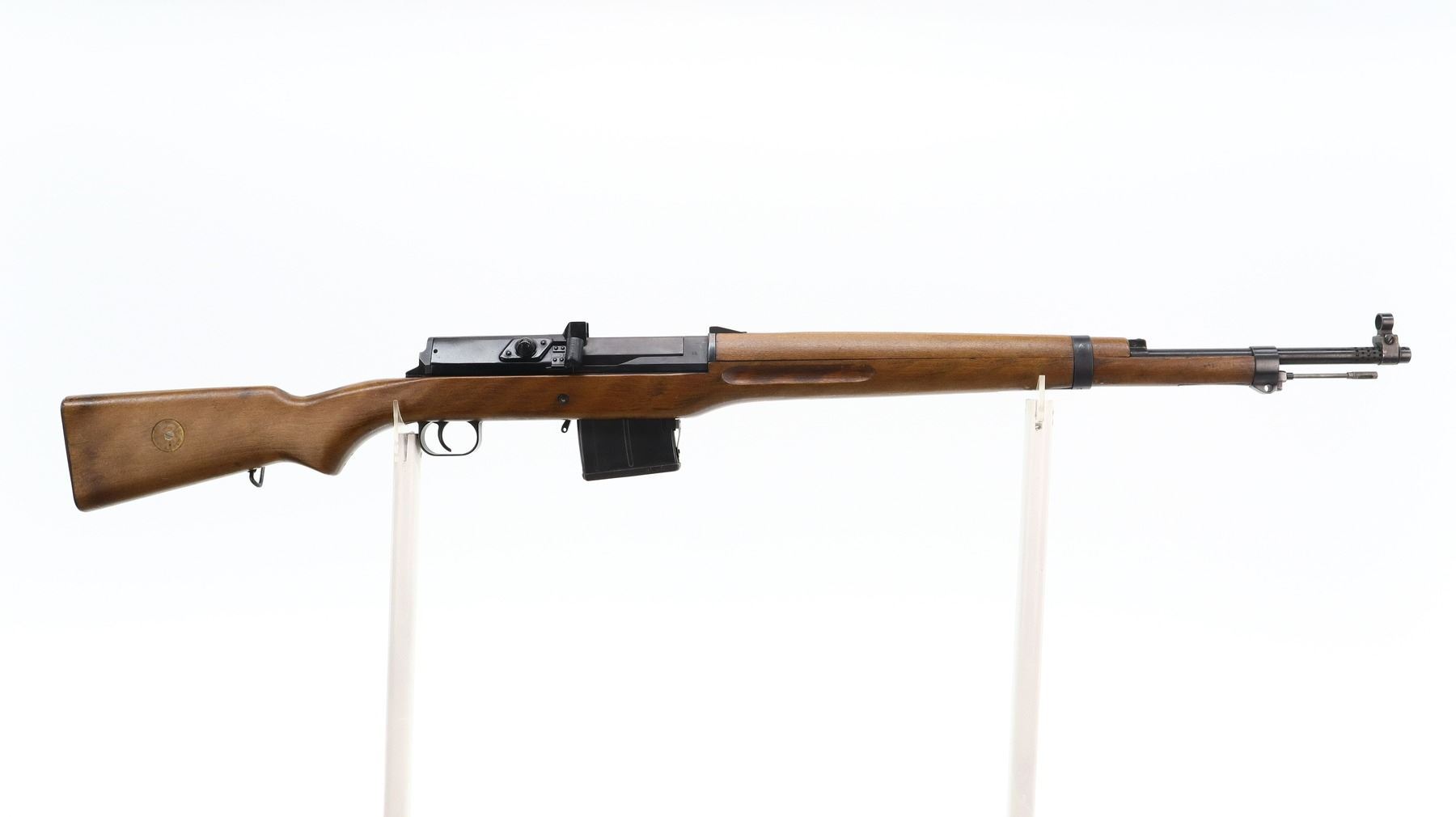 7+/10, SWEDISH LJUNGMAN, MODEL: AG42B, CALIBER: 6.5 X 55 SWEDISH , COMES WITH MAGAZINE , BORE IS FAIR, WORN, LIGHT PITTING. MANUFACTURED 1943. BLADE FRONT SIGHT WITH HOOD AND RAMP. ADJUSTABLE U NOTCH REAR SIGHT. BLUED FINISH. BLACK RUBBER CASE DEFLECTOR. TWO PIECE SMOOTH FULL MILITARY WOOD STOCKS. FINGER GROOVED FOREND. PISTOL GRIP. SMOOTH STEEL BUTT PLATE. SLING SWIVELS. CLEANING ROD. MUZZLE BREAK. METAL FINISH SHOWS SOME SCRATCHES, HANDLING MARKS AND WEAR. STOCK SHOWS SOME MARKS, SCRATCHES AND WEAR. ACTION: SEMI AUTOMATIC RIFLE , BARREL LENGTH: 23.5", SERIAL: 12924, CONDITION: 7+/10, CLASS: CANADIAN NON RESTRICTED