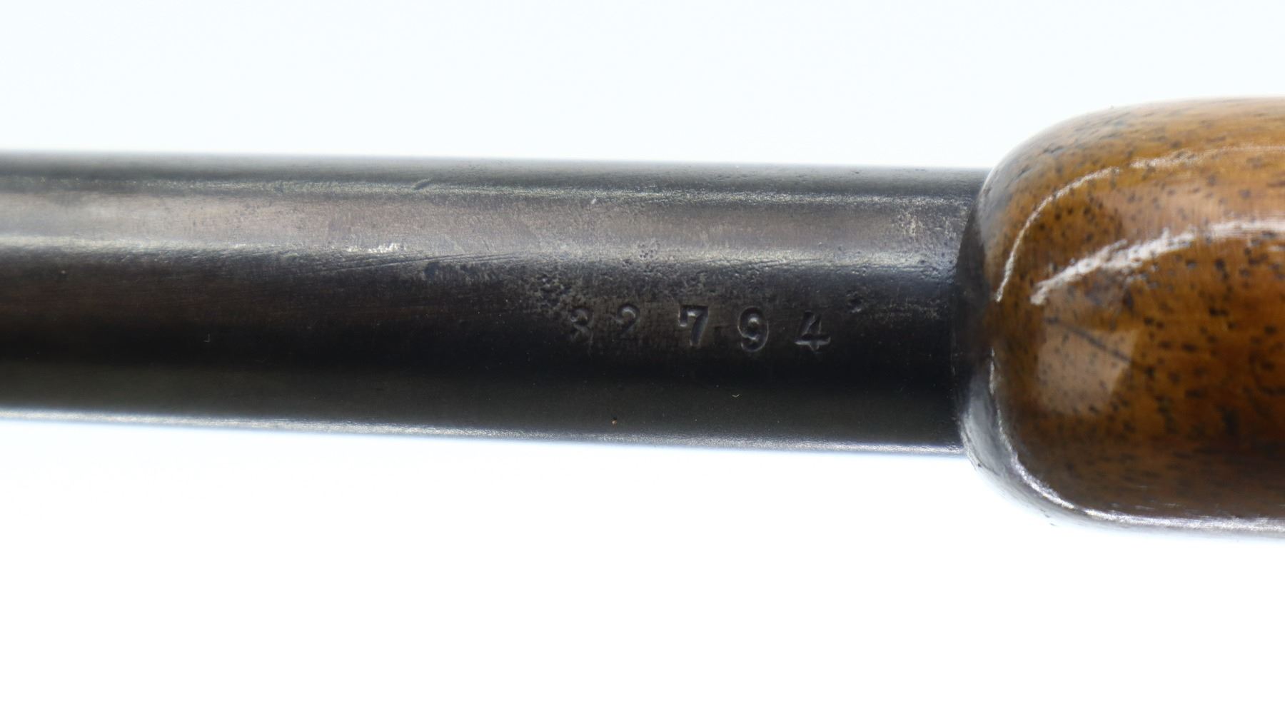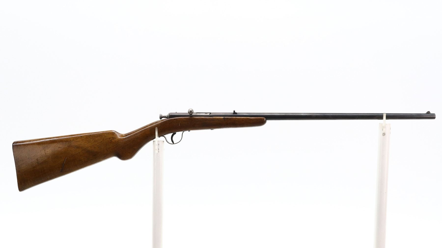 5/10, PIEPER 22, MODEL: MODEL 1921 BOY RIFLE, CALIBER: 22 LR, BORE IS FAIR, WORN, PITTED. BLADE FRONT SIGHT, U NOTCHED REAR SIGHT, STRAIGHT BOLT HANDLE. ONE PIECE SMOOTH WOOD STOCK, PISTOL GRIP, SMOOTH BUTT. METAL FINISH SHOWS SCRATCHES, HANDLING MARKS AND WEAR. STOCK SHOWS MARKS, SCRATCHES AND WEAR. ACTION: BOLT ACTION RIFLE, BARREL LENGTH: 19.25", SERIAL: 32794, CONDITION: 5/10, CLASS: CANADIAN NON RESTRICTED