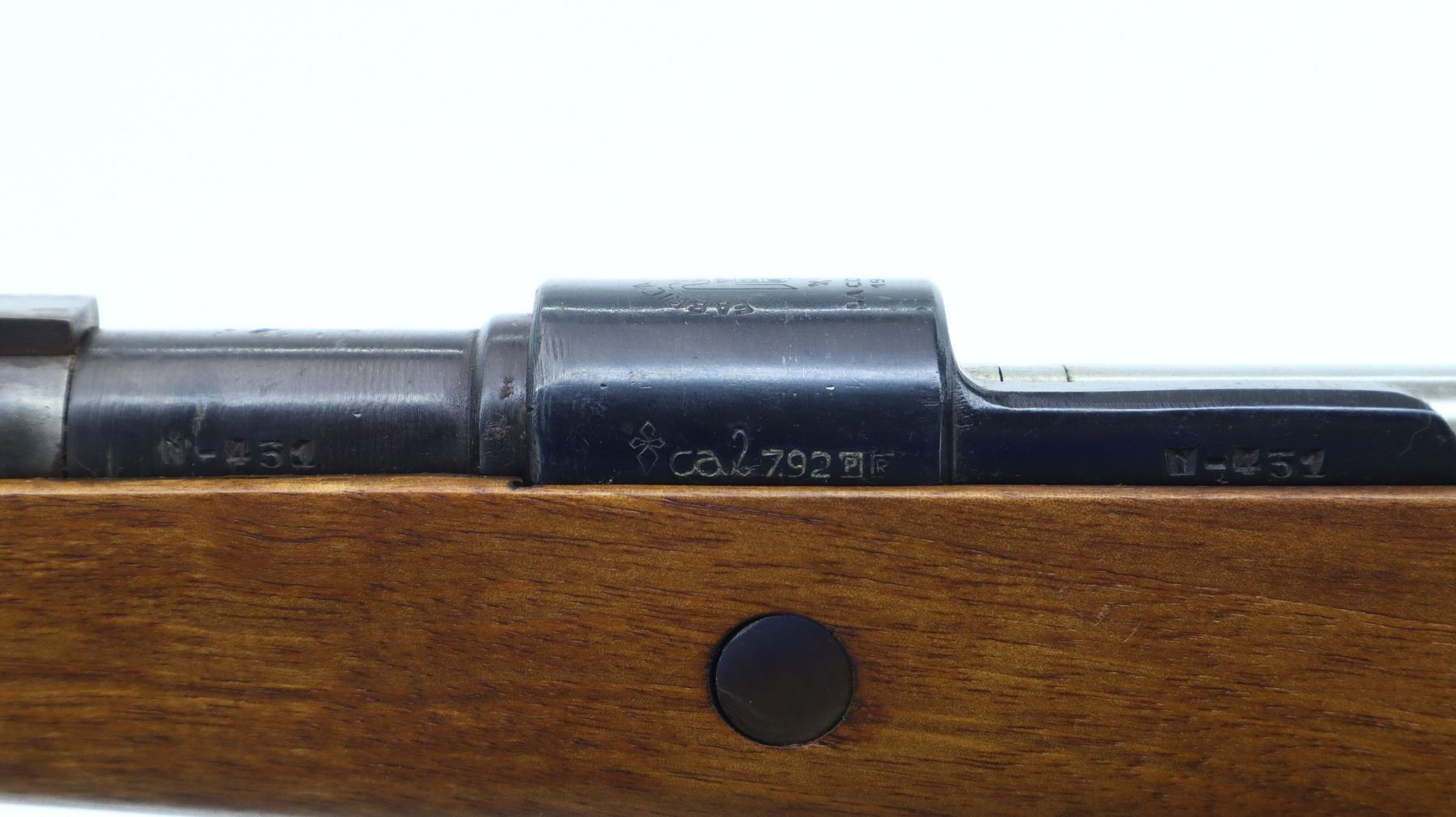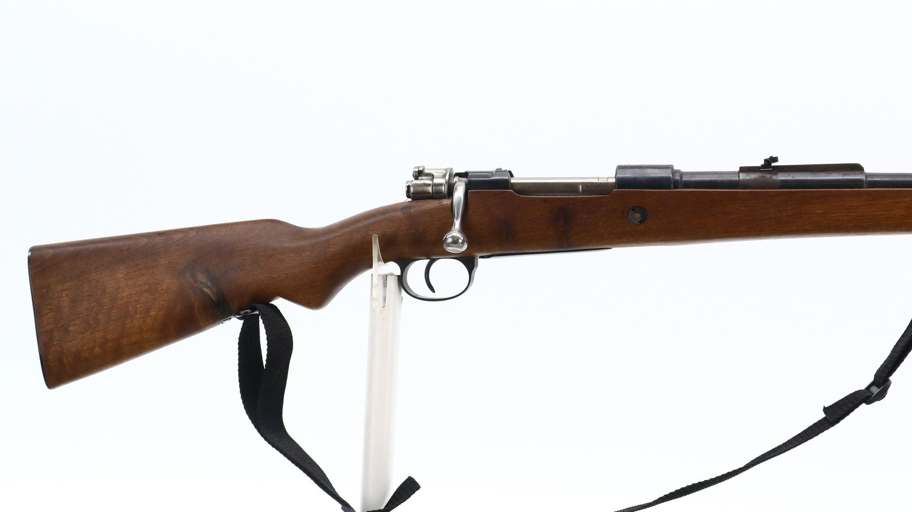 5/10, SPANISH MAUSER , MODEL: SPORTER , CALIBER: 8MM MAUSER, BORE IS POOR, WORN, PITTED. BLADE FRONT SIGHT WITH RAMP. ADJUSTABLE FOLDING U NOTCH REAR SIGHT. BLUED FINISH. SILVER BOLT WITH MODIFIED HANDLE. ONE PIECE SMOOTH WOOD STOCK. PISTOL GRIP. CHECKERED STEEL BUTT PLATE. SWIVELS WITH BLACK NYLON SLING. METAL FINISH SHOWS SOME RUST SPECKLES, SCRATCHES, HANDLING MARKS AND WEAR. STOCKS SHOWS SOME MARKS, SCRATCHES AND WEAR. ACTION: BOLT ACTION RIFLE, BARREL LENGTH: 19.5", SERIAL: 431, CONDITION: 5/10, CLASS: CANADIAN NON RESTRICTED