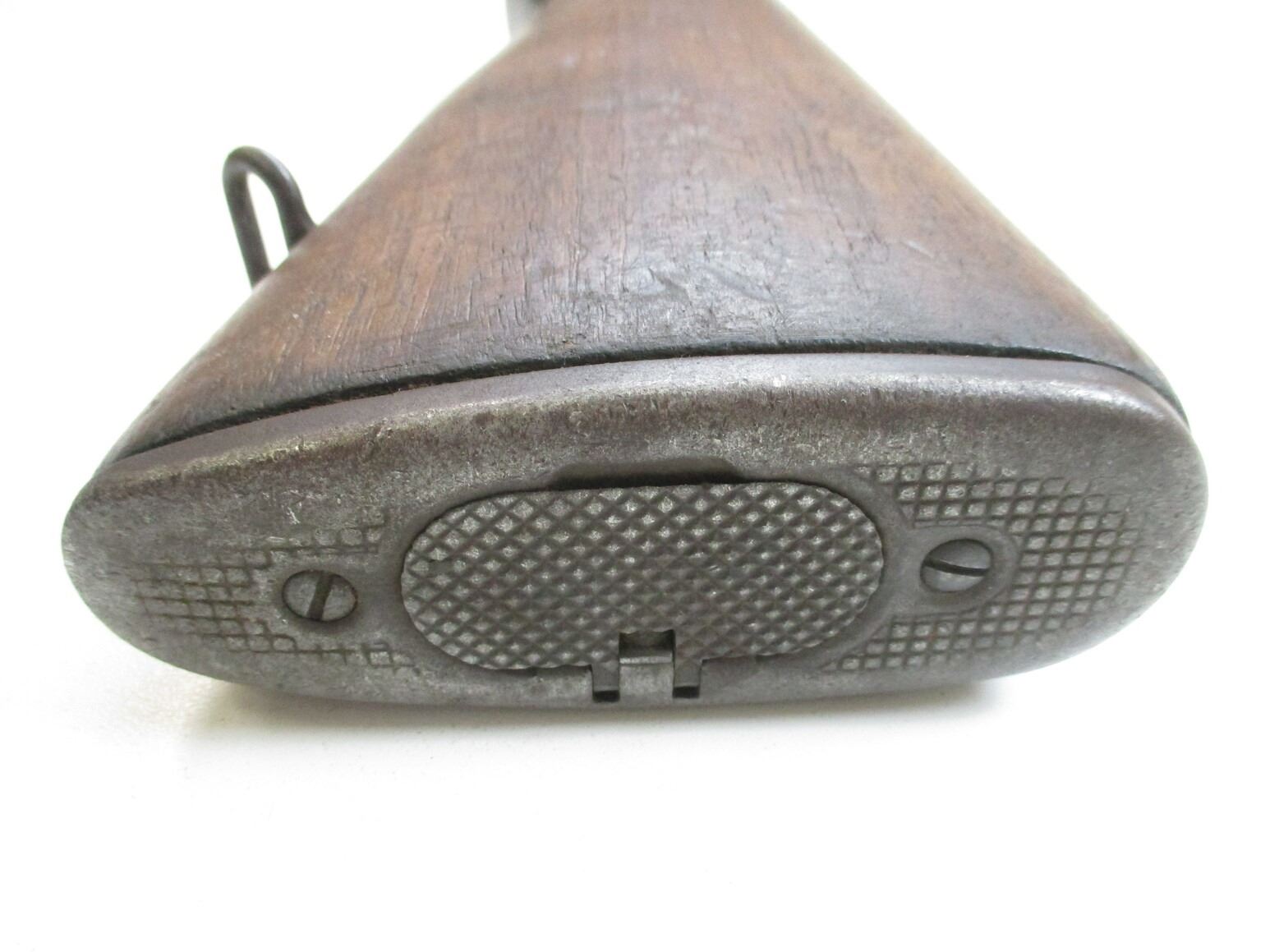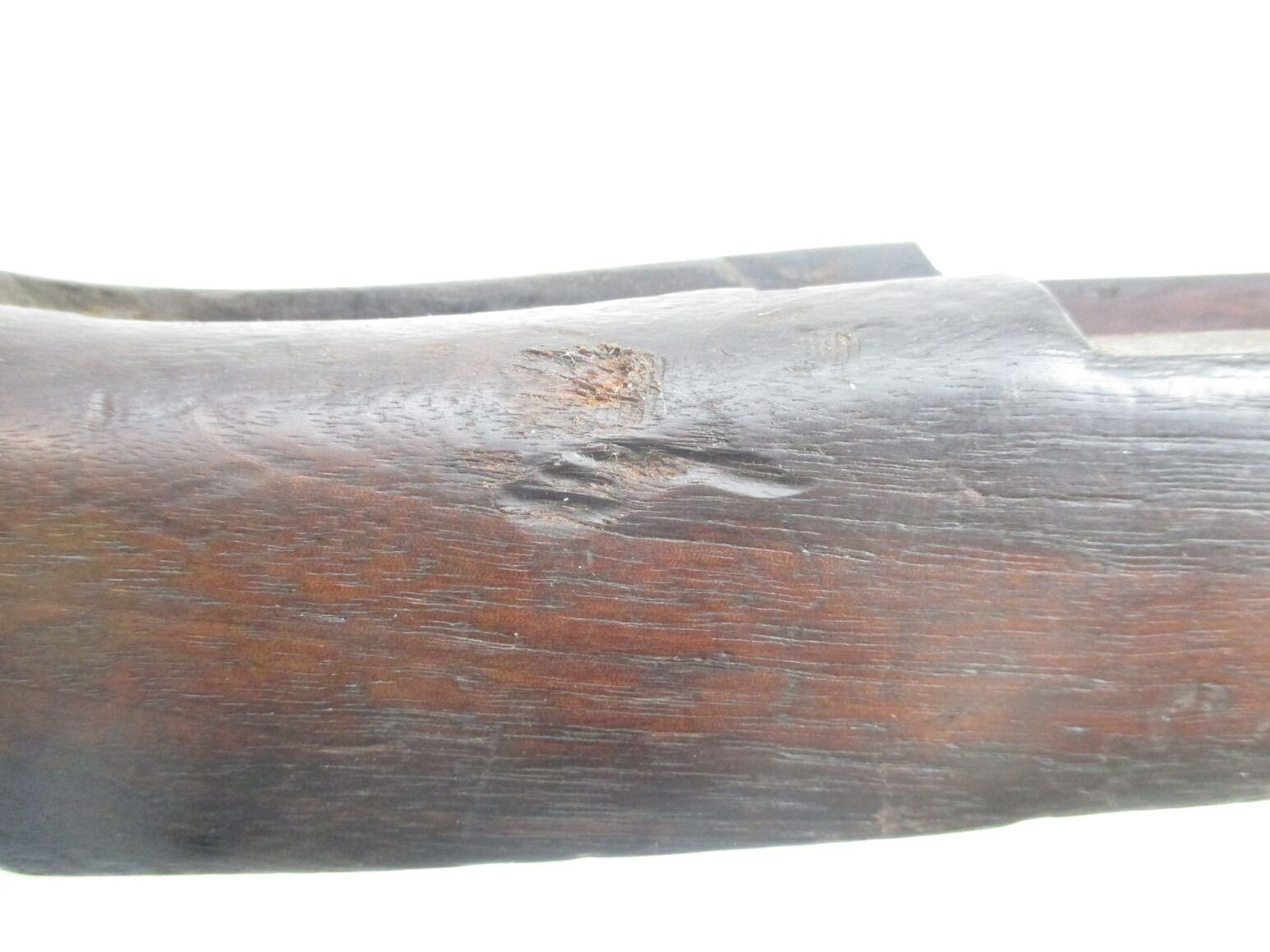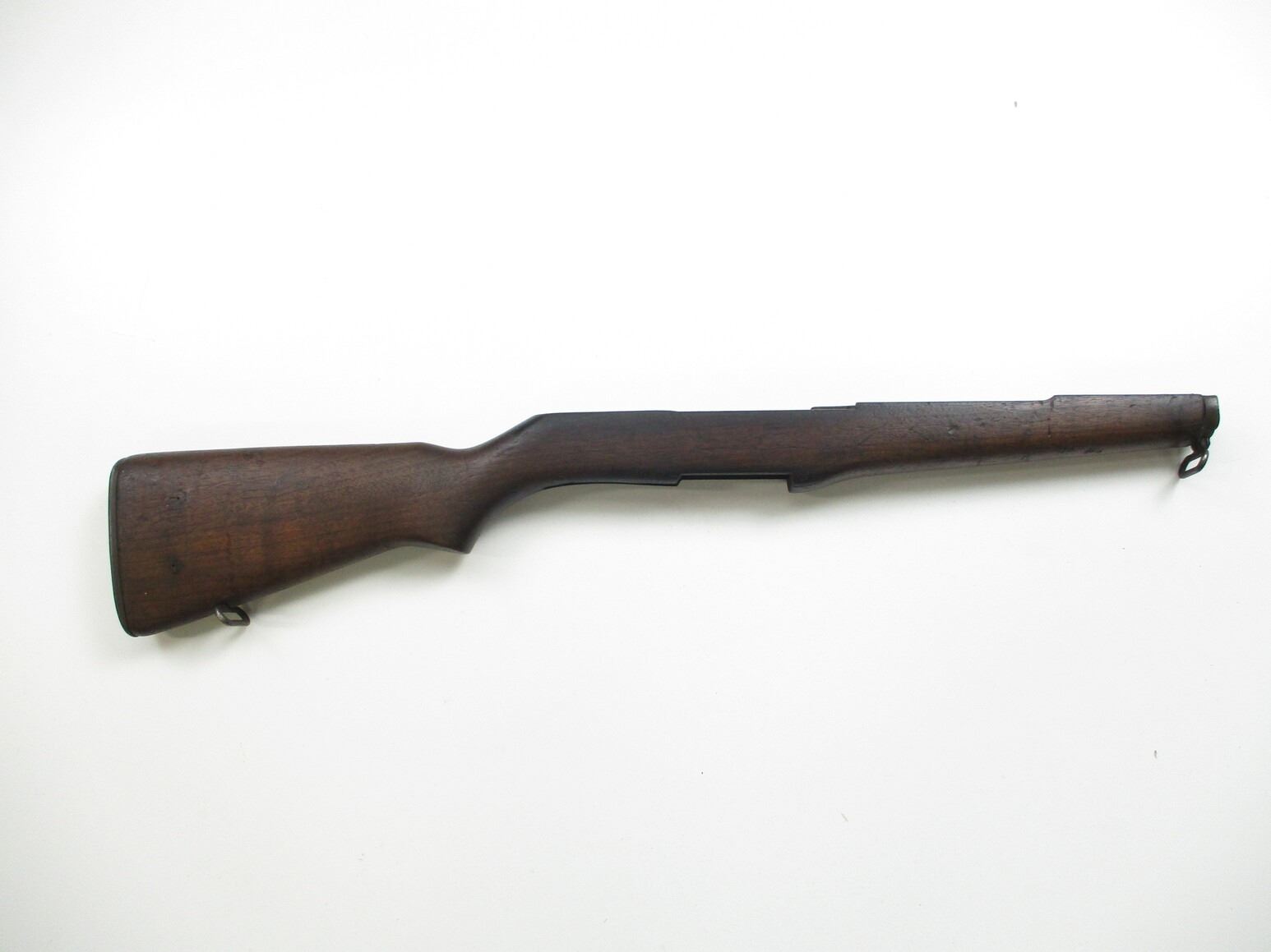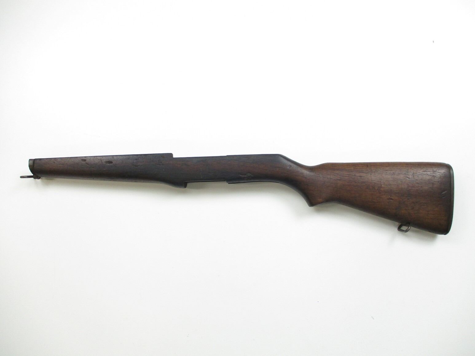 M-1 GARAND RIFLE STOCK , WOOD, APPROX. 29.75" OAL, WITH BUTT PLATE, SWIVELS, NOSE CAP & OTHER METAL PARTS, MARKED "P" ON RIFLE GRIP, STOCK MAY HAVE SCUFFS, SCRATCHES, GROOVES, & OR CHIPS. MAY REQUIRE FITTING. SEE PHOTO.
