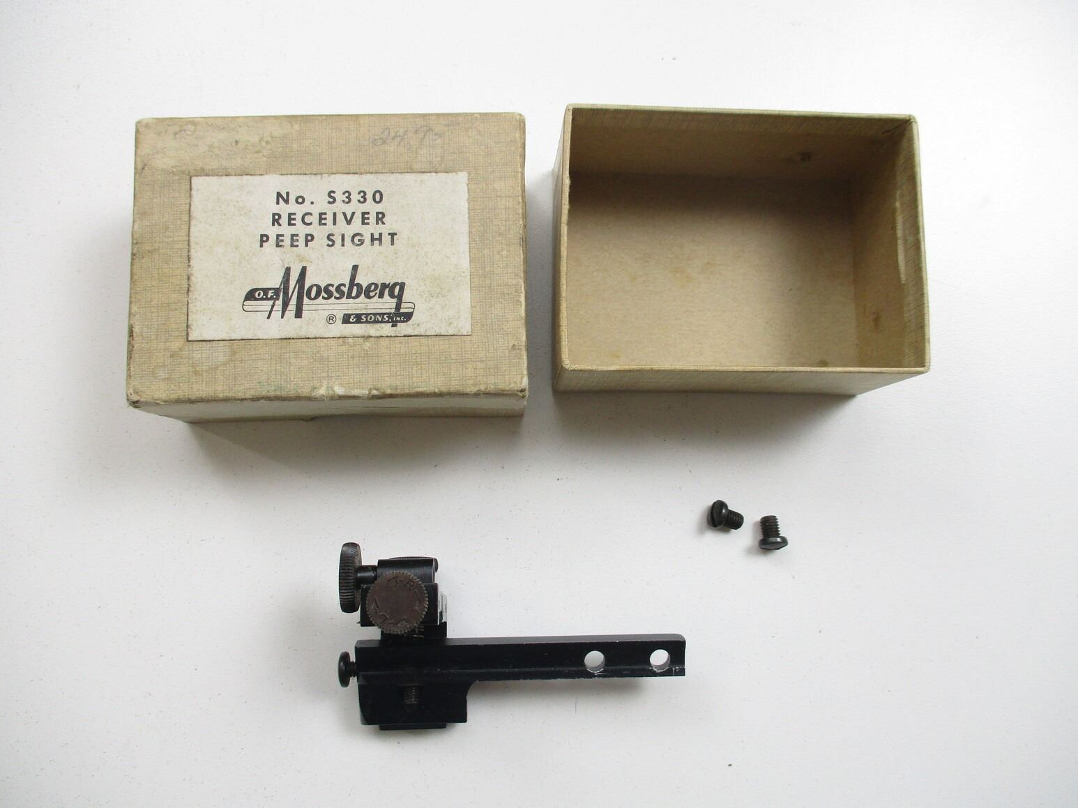 MOSSBERG NOS330 RECEIVER PEEP SIGHT , APPEARS COMPLETE, WITH APERTURE, WINDAGE & ELEVATION ADJUSTMENT, INCLUDES MOUNTING SCREWS, IN ORIGINAL PACKAGE.
