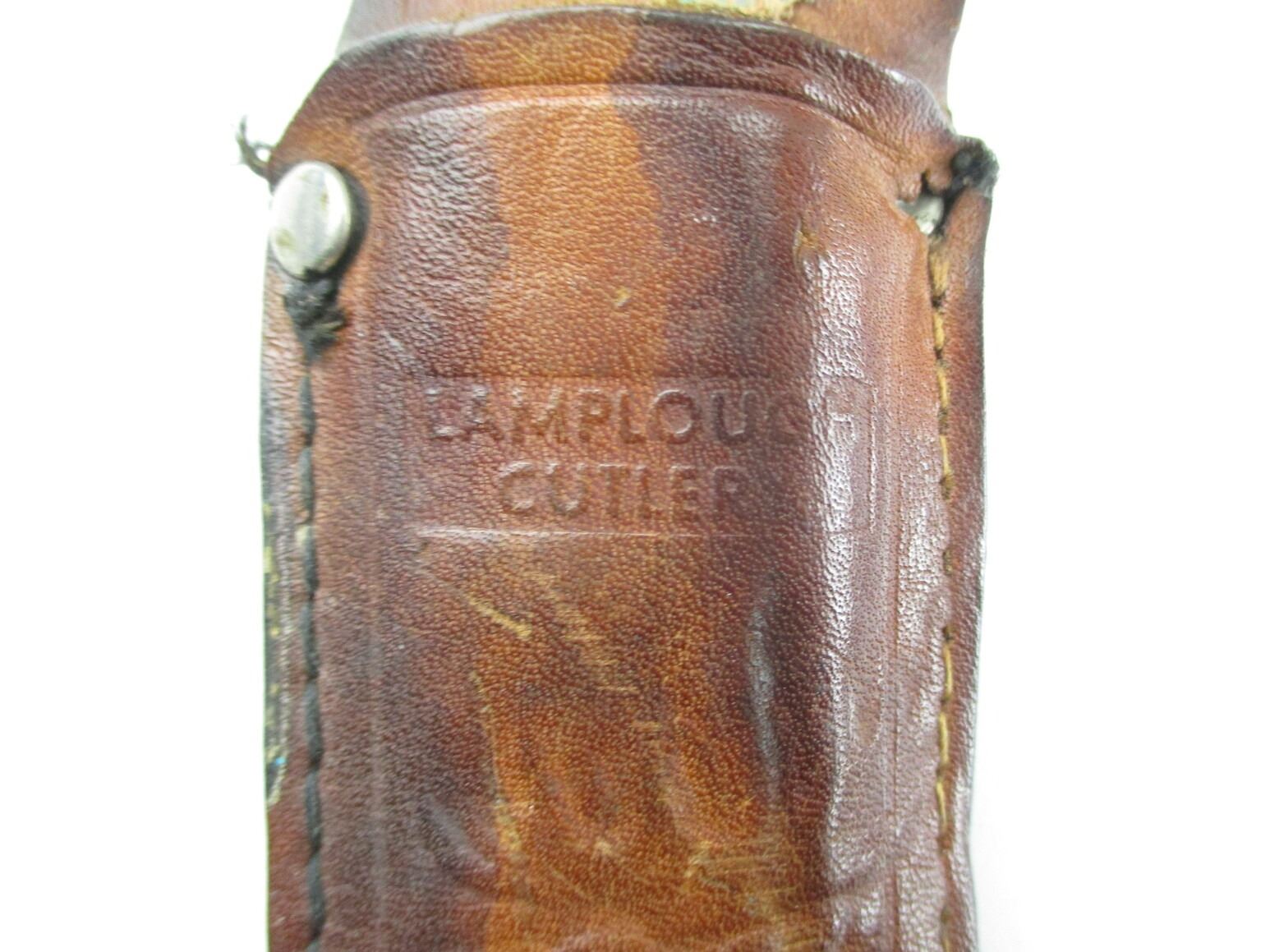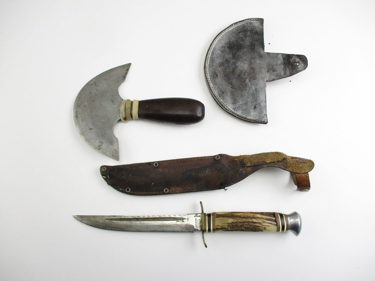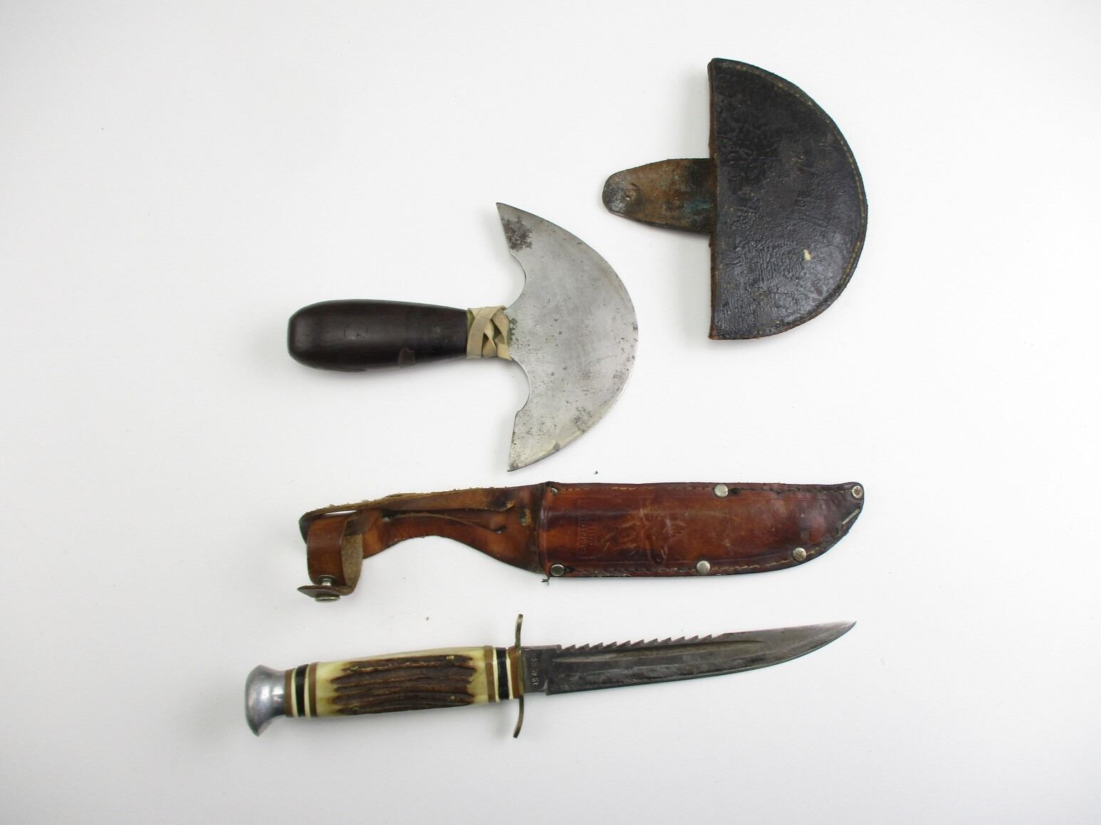 ASSORTED KNIVES , (1) AMPLOUGH CUTLERY KNIFE, STEEL, APPROX. 5.75" SAW BACK BLADE, WITH BONE LIKE HANDLE & LEATHER SHEATH, (1) HALF CIRCLE KNIFE, WITH APPROX. 5" STEEL BLADE, & WOODEN HANDLE, MARKING ON BLADE, WITH LEATHER SHEATH.