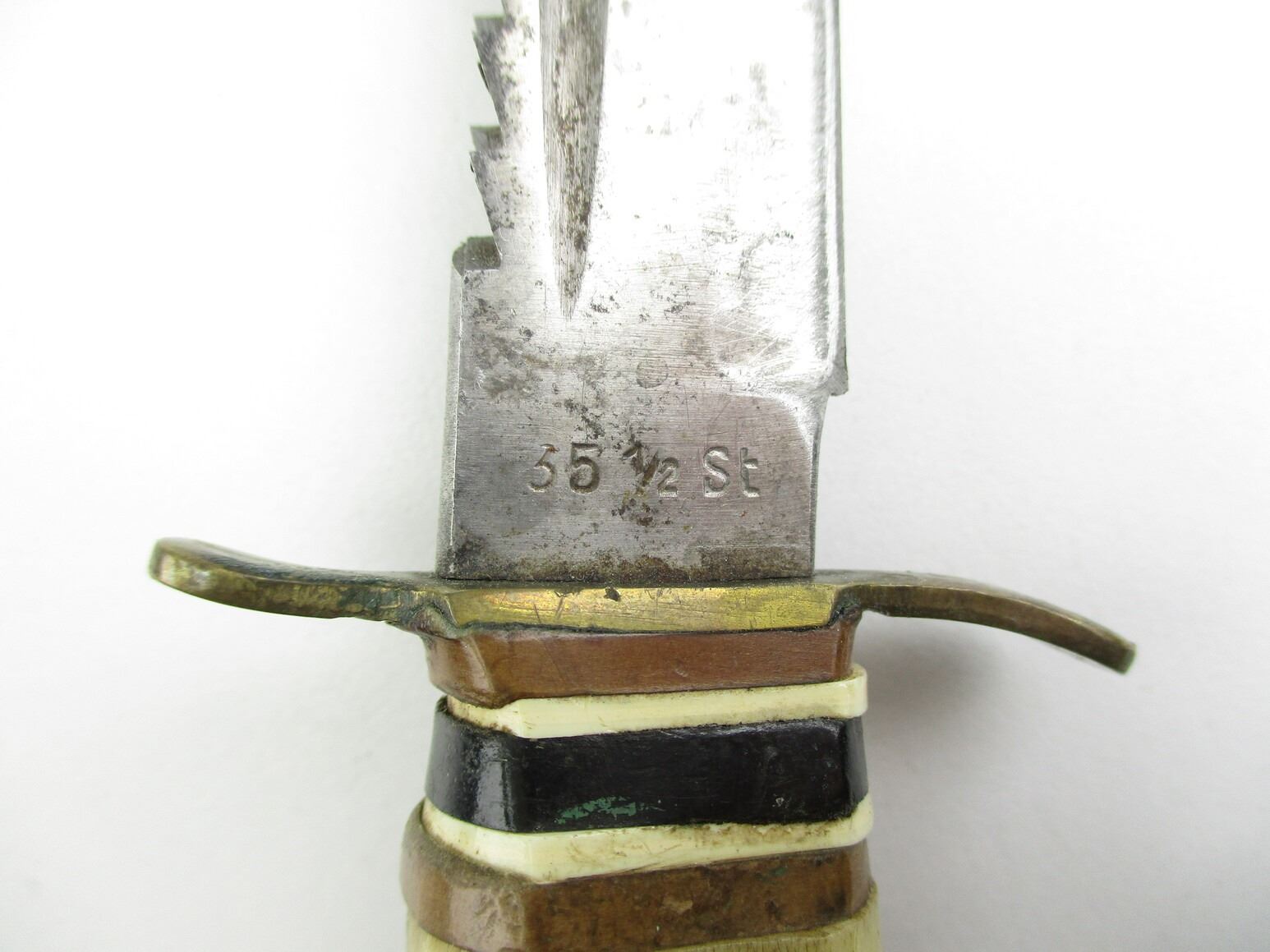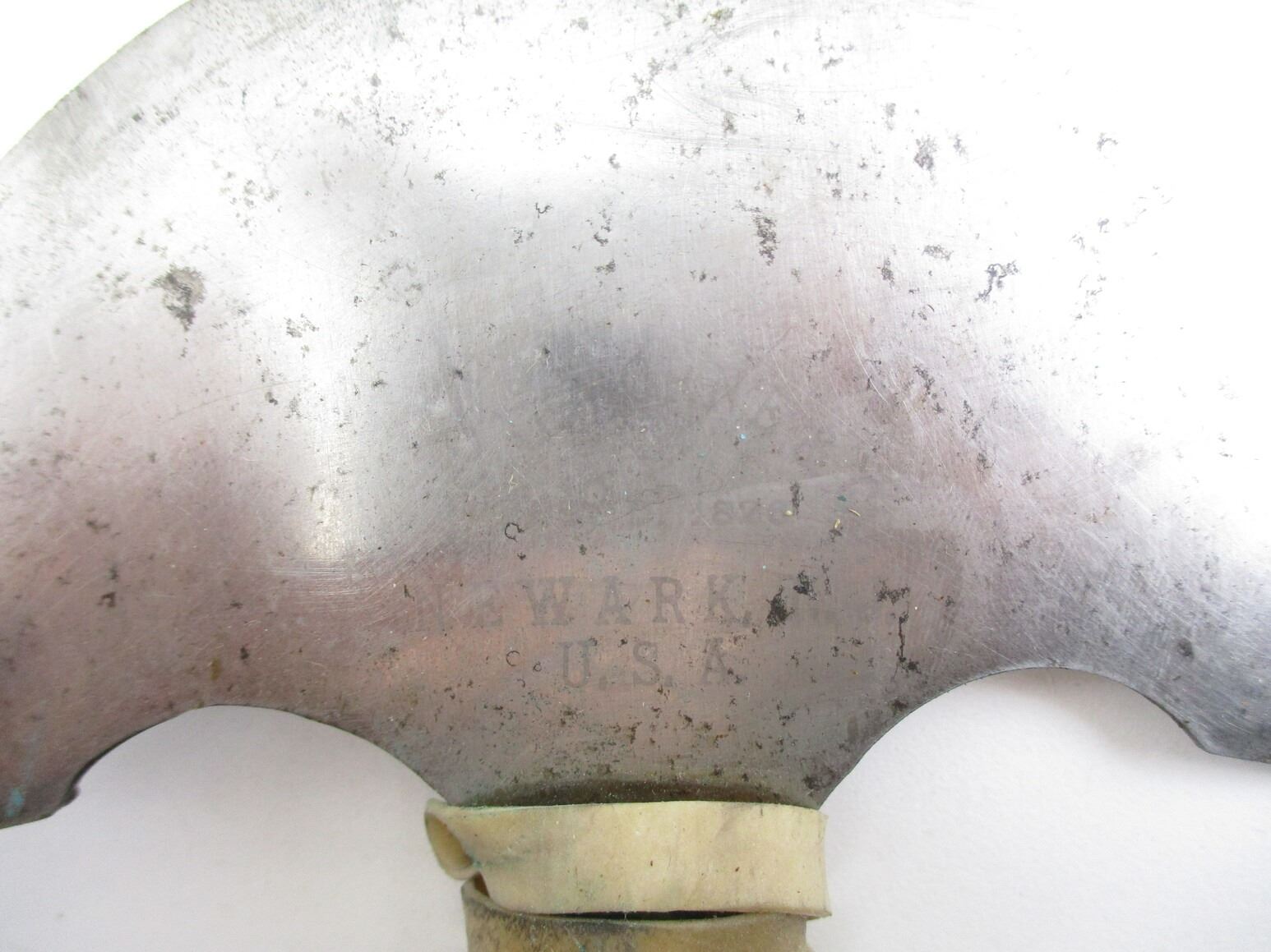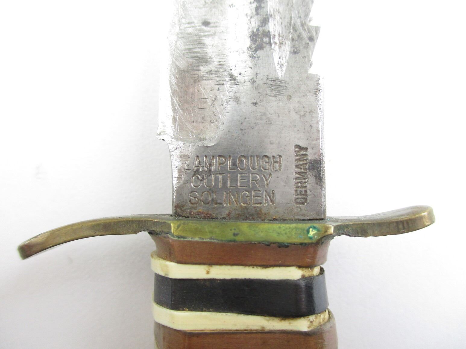 ASSORTED KNIVES , (1) AMPLOUGH CUTLERY KNIFE, STEEL, APPROX. 5.75" SAW BACK BLADE, WITH BONE LIKE HANDLE & LEATHER SHEATH, (1) HALF CIRCLE KNIFE, WITH APPROX. 5" STEEL BLADE, & WOODEN HANDLE, MARKING ON BLADE, WITH LEATHER SHEATH.