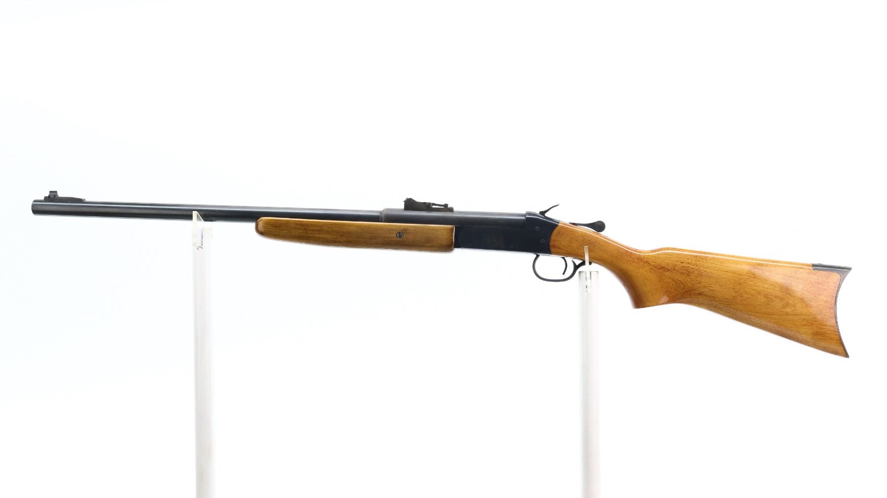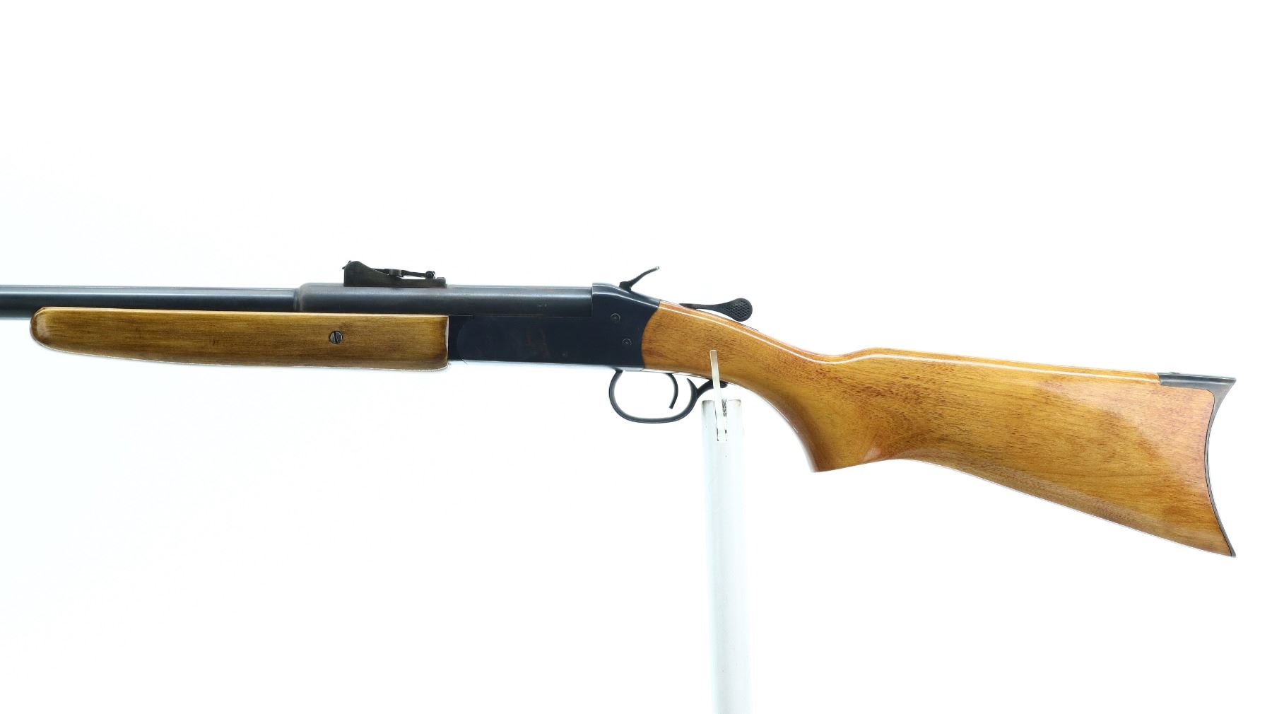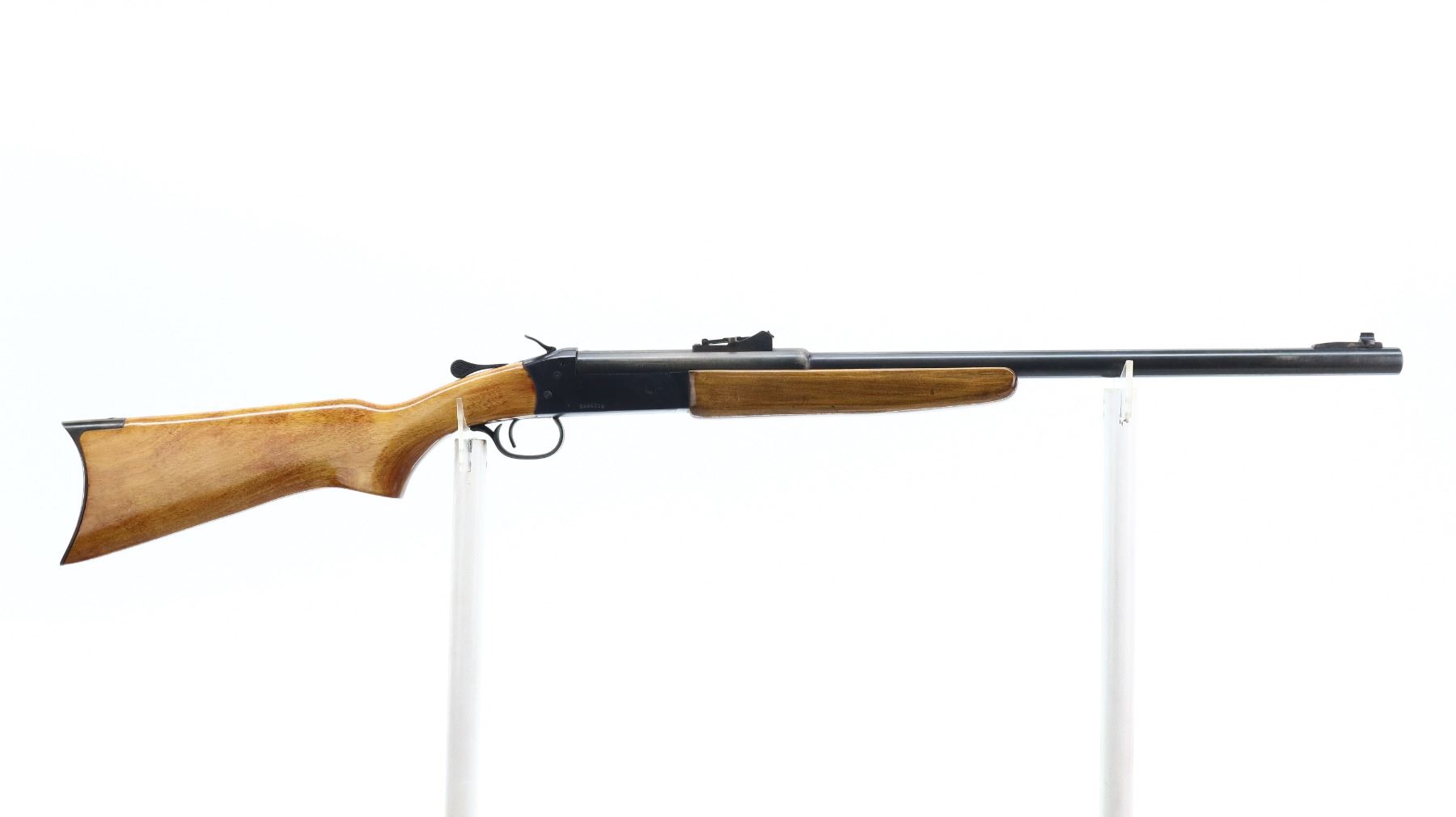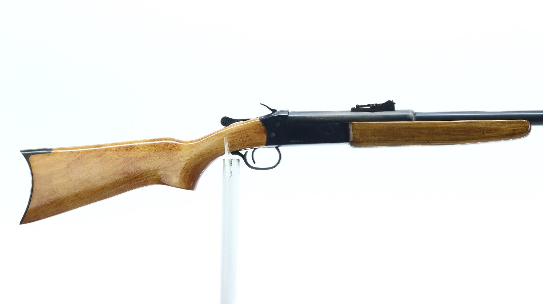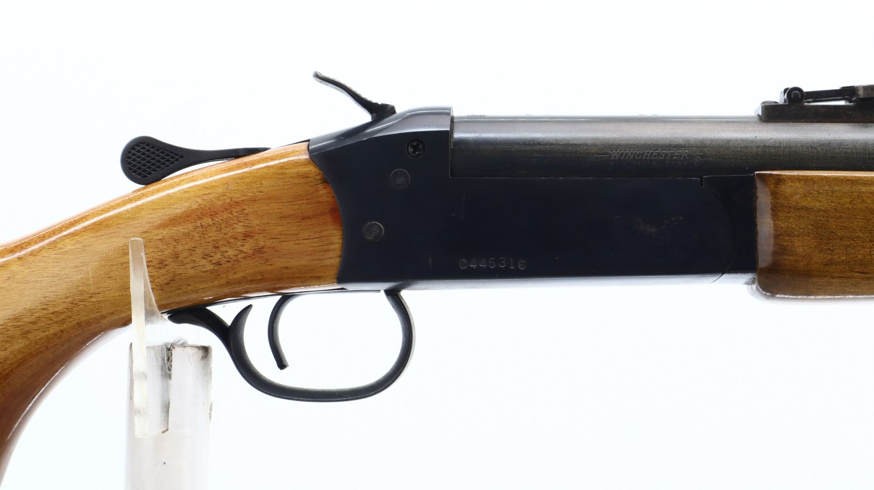7/10, WINCHESTER, MODEL: 840 CUSTOM, CALIBER: 45 COLT, BORE IS EXCELLENT. BLADE FRONT SIGHT WITH RAMP. ADJUSTABLE U NOTCH LADDER REAR SIGHT. ROUND BARREL. MODIFIED GROOVED SPUR HAMMER. EJECTOR. TWO PIECE SMOOTH WOOD STOCKS. PISTOL GRIP. SMOOTH CURVED STEEL BUTT PLATE. METAL FINISH SHOWS SOME SCRATCHES, HANDLING MARKS AND WEAR. STOCKS SHOW SOME MARKS, SCRATCHES AND WEAR. ACTION: HINGE SINGLE SHOT RIFLE , BARREL LENGTH: 24.25", SERIAL # C445316, CONDITION: 7/10, CLASS: CANADIAN NON RESTRICTED