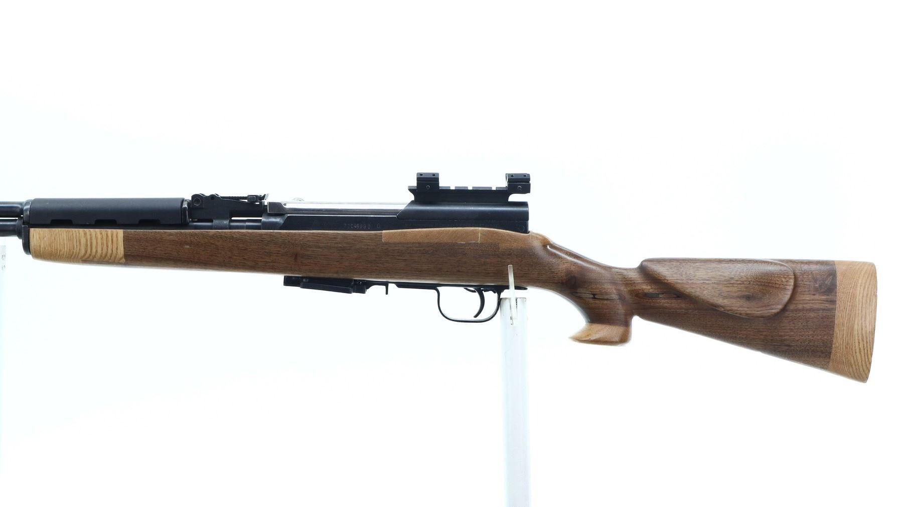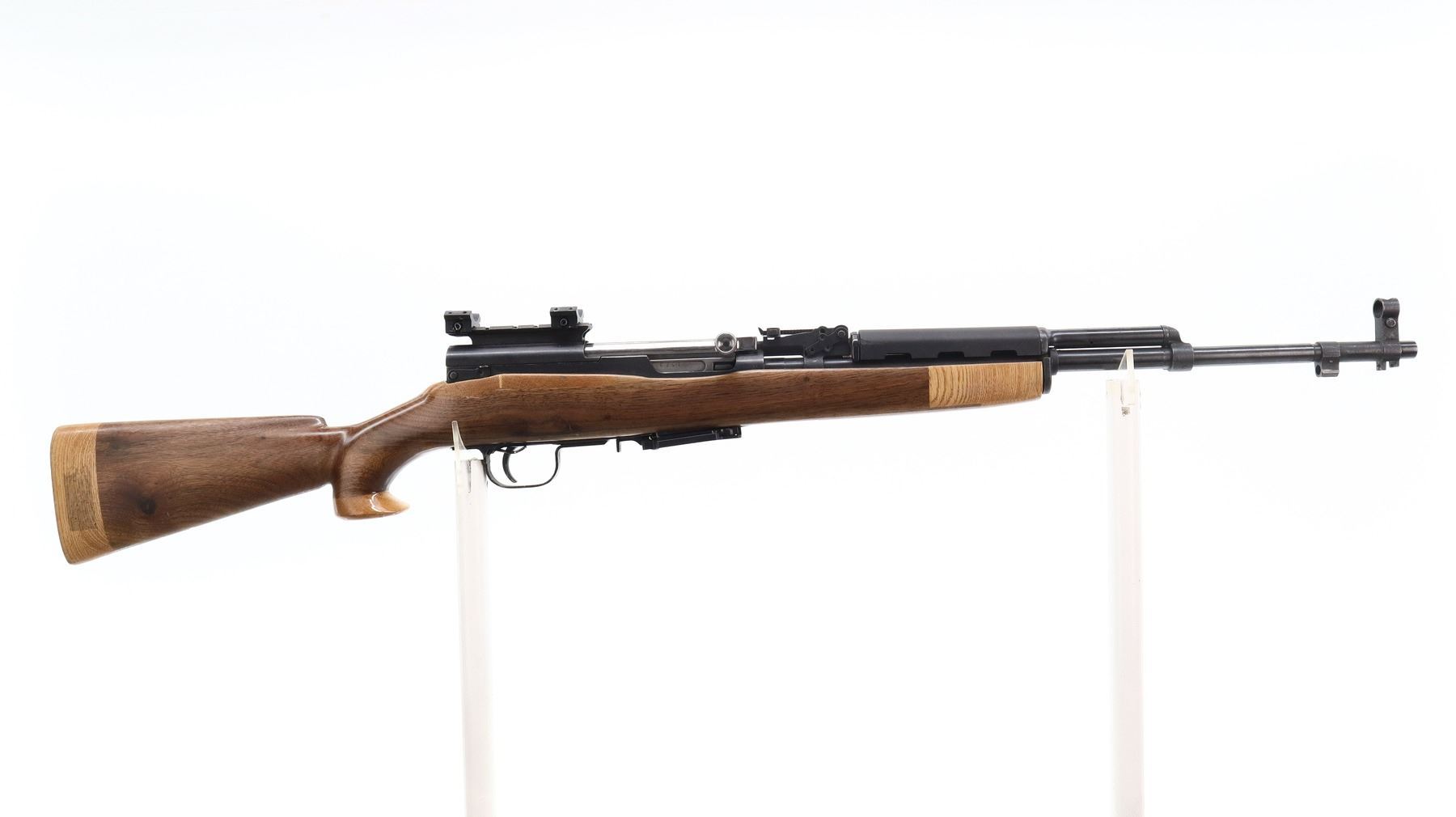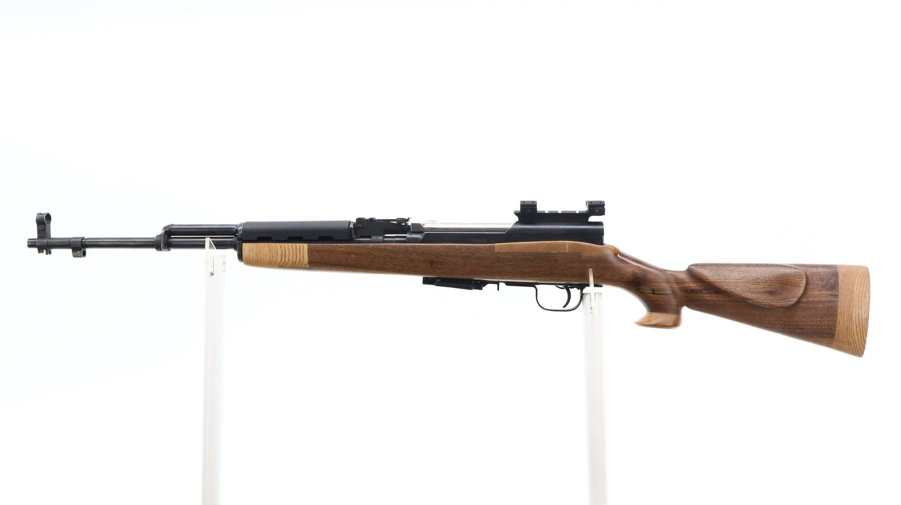 6/10, NORINCO, MODEL: SKS 56, CALIBER: 7.62X39, BORE IS VERY GOOD. SERIAL NUMBERS MISMATCHED. POST FRONT SIGHT WITH HOOD AND RAMP, ADJUSTABLE U NOTCHED REAR SIGHT, SILVER BOLT AND CARRIER, RECEIVER COVER HAS ONE PIECE SCOPE BASE AND BOTTOM HALF ONLY OF 1" RINGS, ONE PIECE BLACK SYNTHETIC TOP HAND GUARD. ONE PIECE CUSTOM SMOOTH WOOD STOCK, PISTOL GRIP WITH FLARED CAP, CHEEK REST, SMOOTH WOOD BUTT EXTENSION, STOCK HAS REPAIRS AROUND RECEIVER AND AT FOREARM TIP, FRONT SWIVEL ONLY, MISSING CLEANING ROD, BAYONET MOUNT AND BAYONET. METAL FINISH SHOWS SOME SCRATCHES, HANDLING MARKS AND WEAR. STOCKS SHOW SOME MARKS, SCRATCHES AND WEAR. ACTION: SEMI AUTOMATIC RIFLE, BARREL LENGTH: 20.5", SERIAL # 22045880, CONDITION: 6/10, CLASS: CANADIAN NON RESTRICTED