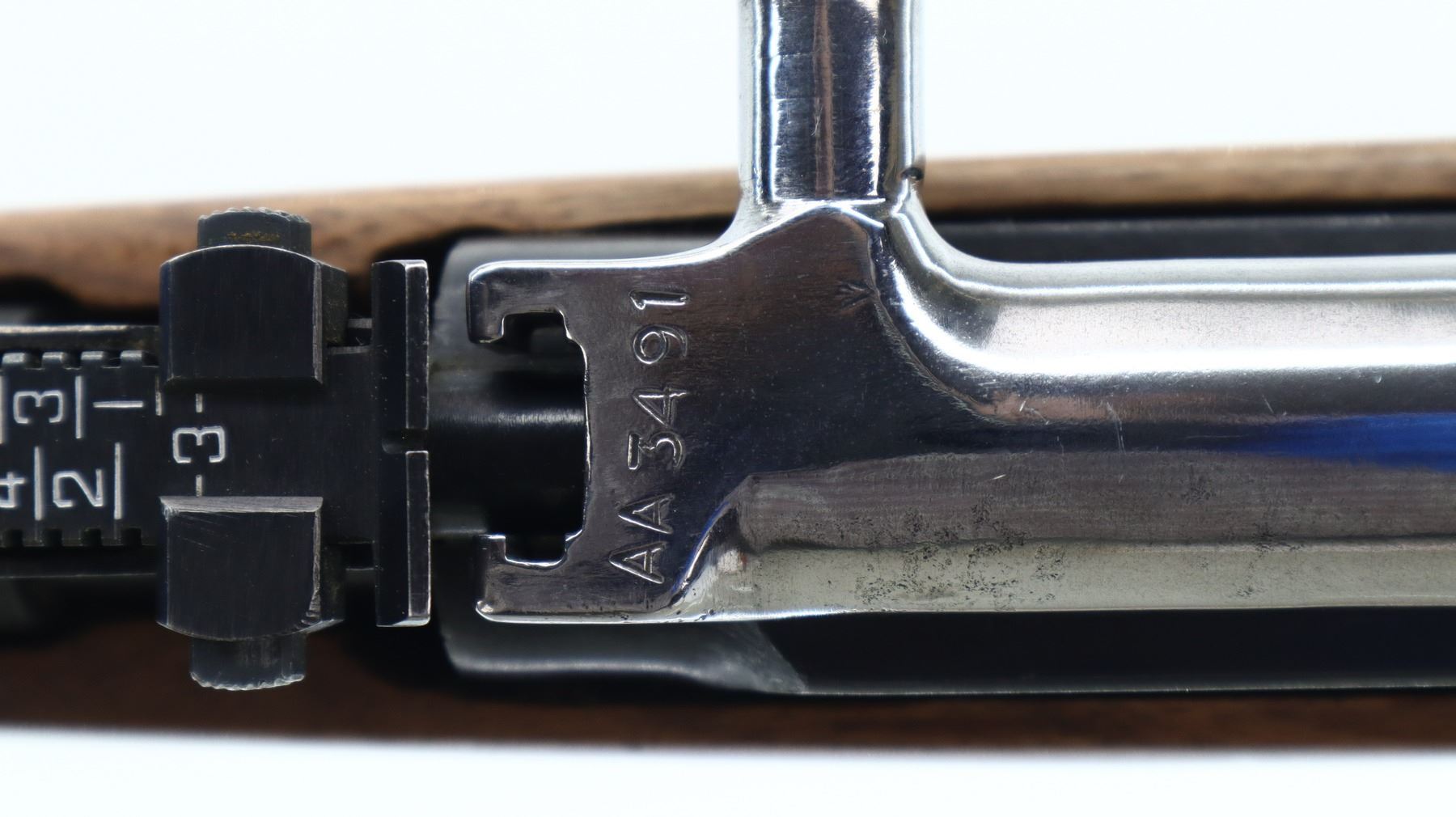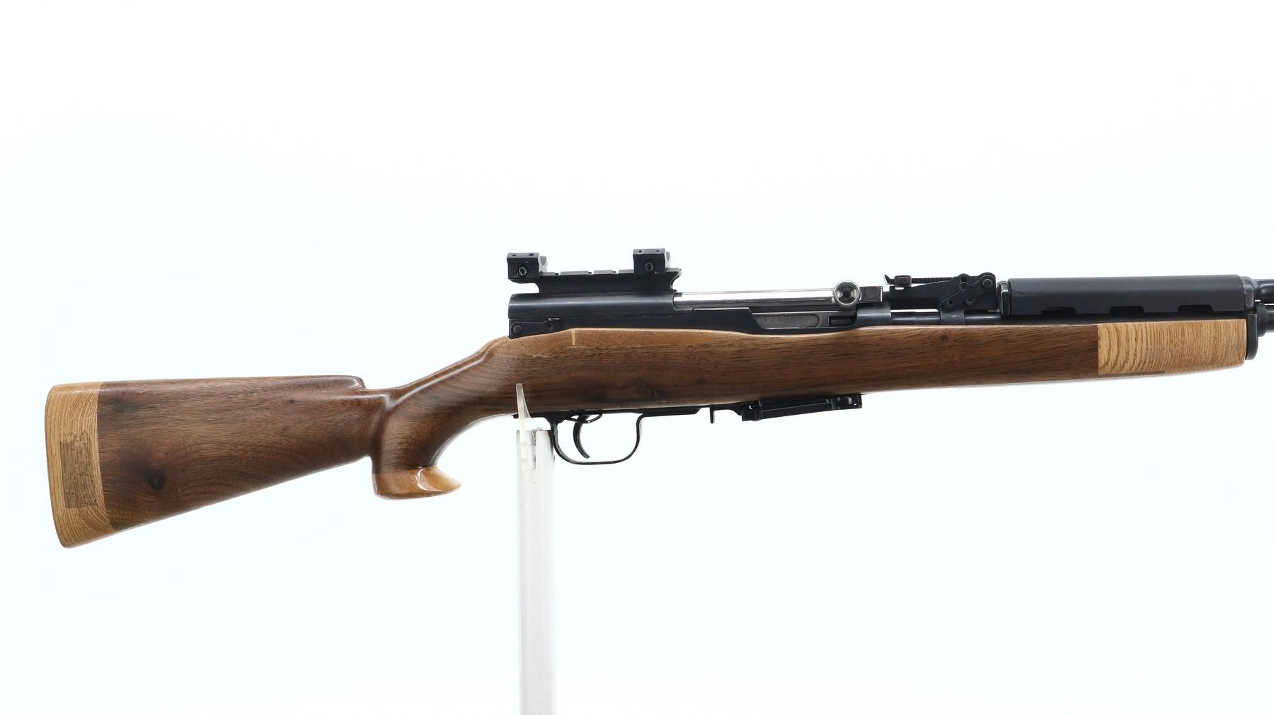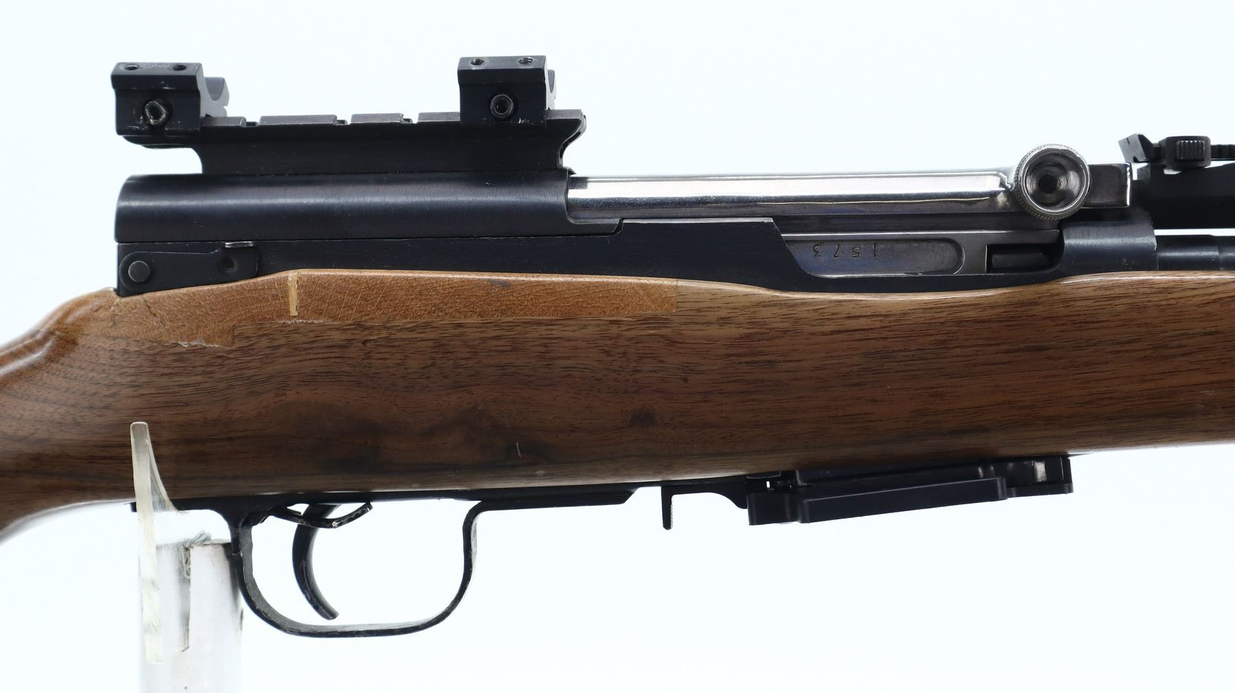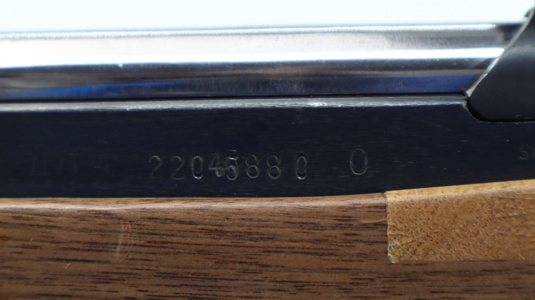6/10, NORINCO, MODEL: SKS 56, CALIBER: 7.62X39, BORE IS VERY GOOD. SERIAL NUMBERS MISMATCHED. POST FRONT SIGHT WITH HOOD AND RAMP, ADJUSTABLE U NOTCHED REAR SIGHT, SILVER BOLT AND CARRIER, RECEIVER COVER HAS ONE PIECE SCOPE BASE AND BOTTOM HALF ONLY OF 1" RINGS, ONE PIECE BLACK SYNTHETIC TOP HAND GUARD. ONE PIECE CUSTOM SMOOTH WOOD STOCK, PISTOL GRIP WITH FLARED CAP, CHEEK REST, SMOOTH WOOD BUTT EXTENSION, STOCK HAS REPAIRS AROUND RECEIVER AND AT FOREARM TIP, FRONT SWIVEL ONLY, MISSING CLEANING ROD, BAYONET MOUNT AND BAYONET. METAL FINISH SHOWS SOME SCRATCHES, HANDLING MARKS AND WEAR. STOCKS SHOW SOME MARKS, SCRATCHES AND WEAR. ACTION: SEMI AUTOMATIC RIFLE, BARREL LENGTH: 20.5", SERIAL # 22045880, CONDITION: 6/10, CLASS: CANADIAN NON RESTRICTED