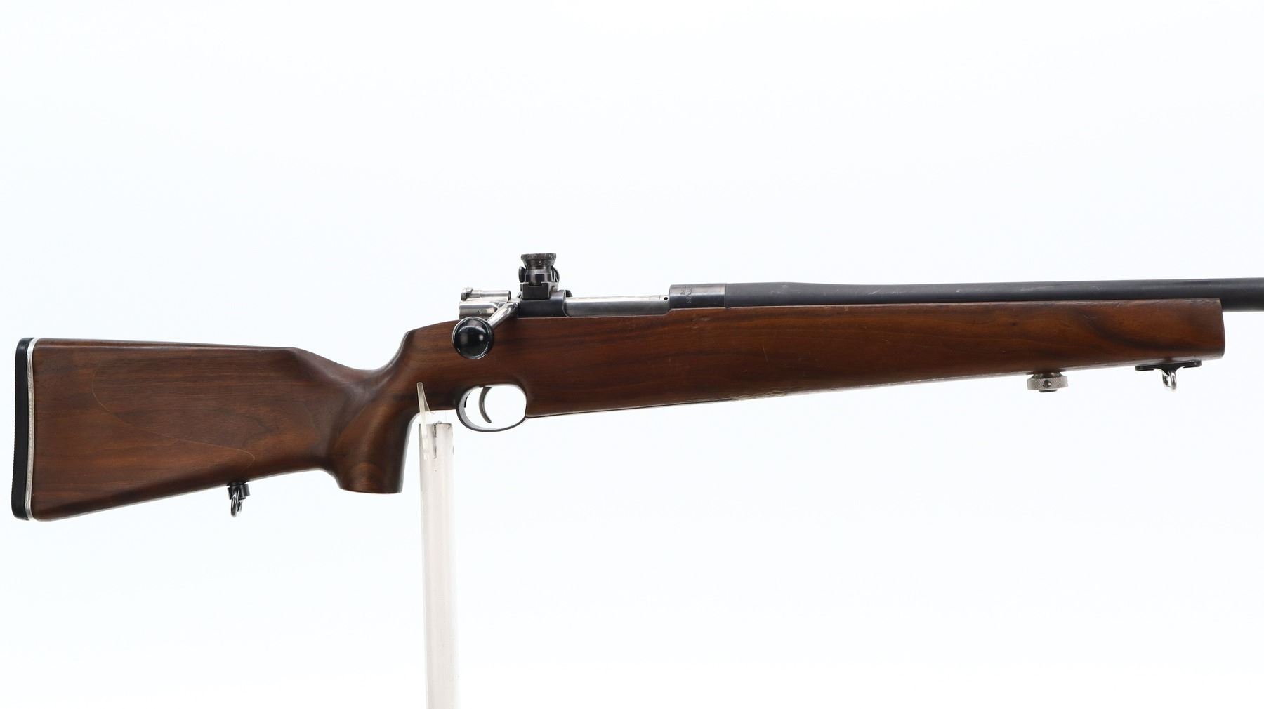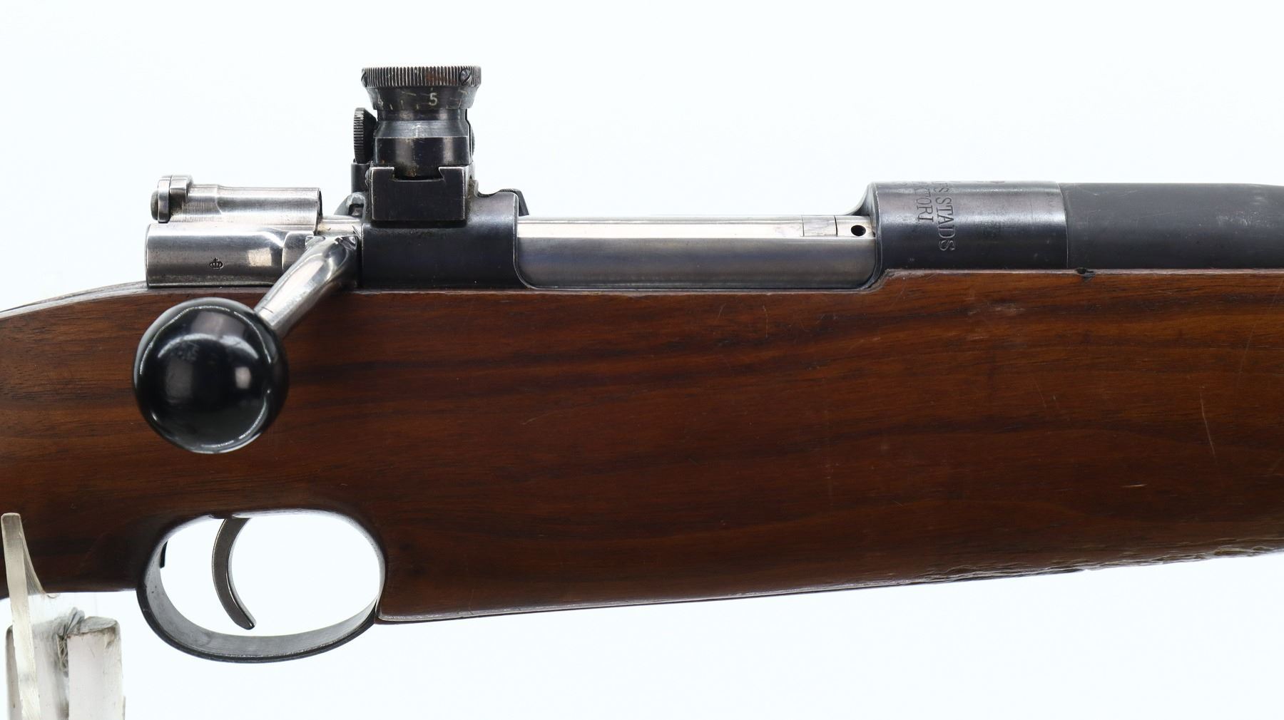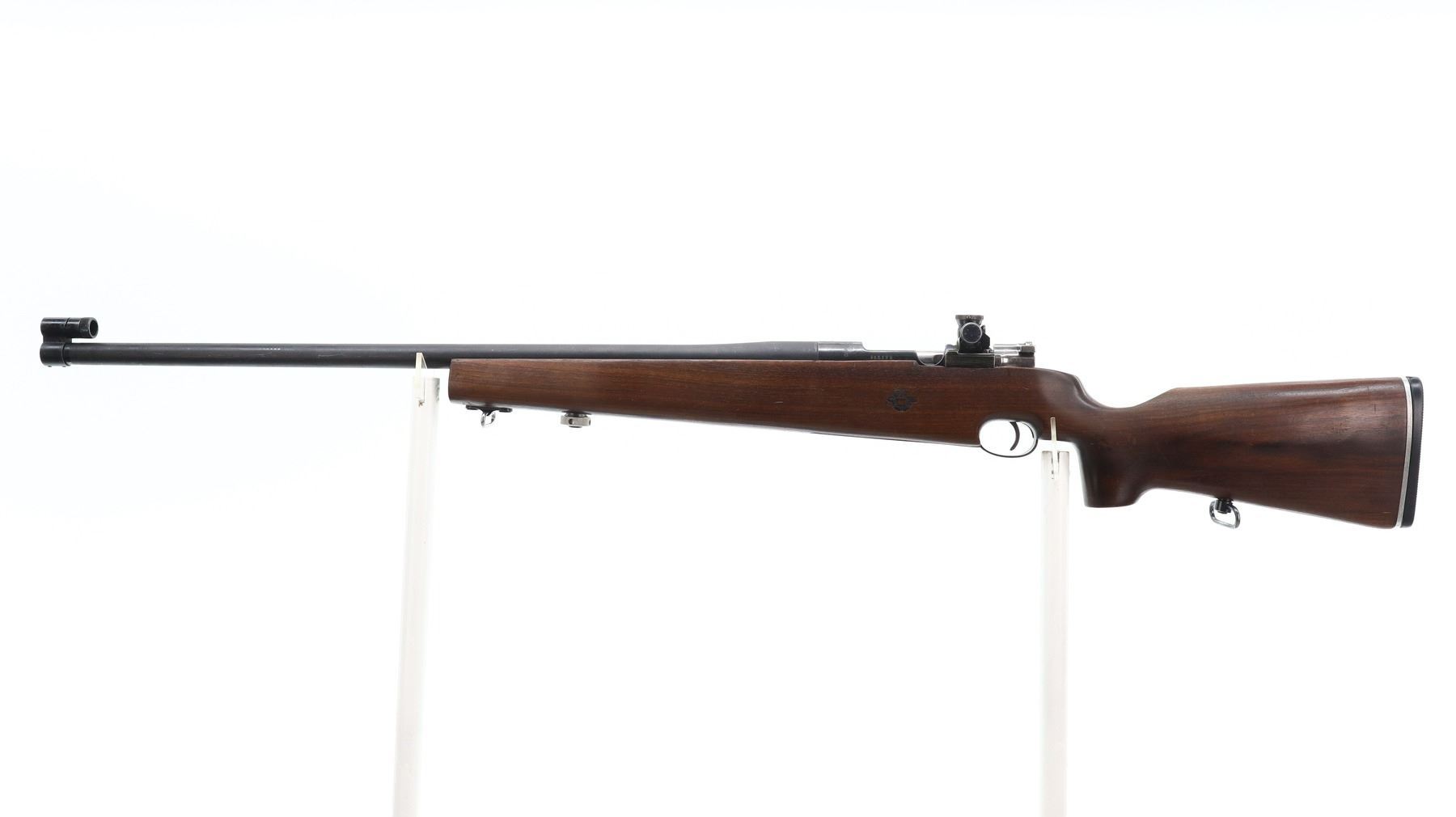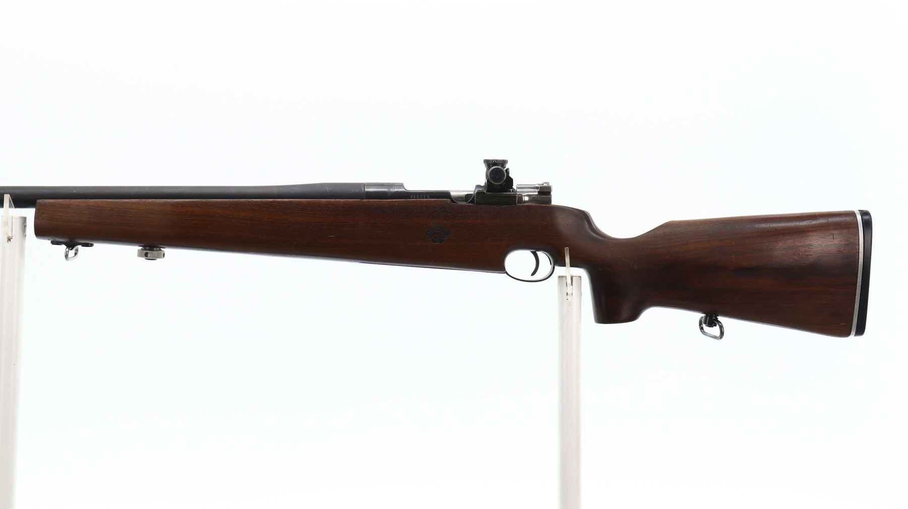 7/10, SWEDISH MAUSER, MODEL: CUSTOM TARGET, CALIBER: 6.5X55 SWEDE, BORE IS GOOD, SHINY. MANUFACTURED 1932, NUMBERS MISMATCHED. GLOBE FRONT SIGHT WITH INSERT, ADJUSTABLE REAR PEEP SIGHT, HEAVY BARREL, SILVER BOLT WITH MODIFIED HANDLE AND LARGE BLACK POLYMER BOLT KNOB. ONE PIECE SMOOTH TARGET STYLE WOOD STOCK, PISTOL GRIP, GROOVED BLACK POLYMER BUTT PLATE, SLING SWIVELS, ALUMINUM RAIL INLET INTO FOR STOCK WITH ADJUSTABLE SWIVEL STUD. METAL FINISH SHOWS SOME SCRATCHES, HANDLING MARKS AND WEAR. STOCK SHOWS SOME MARKS, SCRATCHES AND WEAR., ACTION: BOLT ACTION RIFLE, BARREL LENGTH: 29", SERIAL # 254172, CONDITION: 7/10, CLASS: CANADIAN NON RESTRICTED