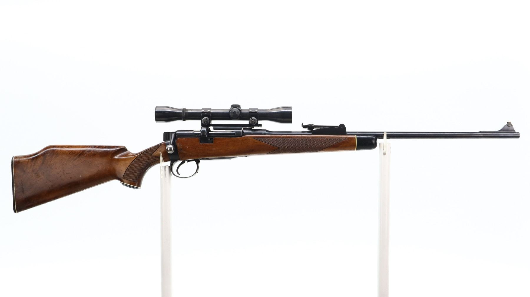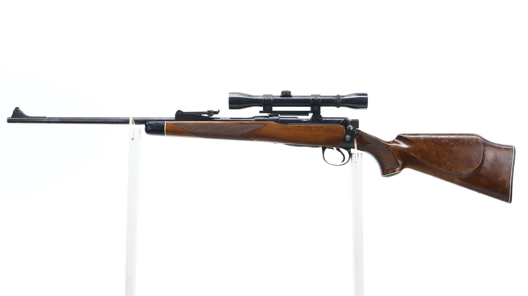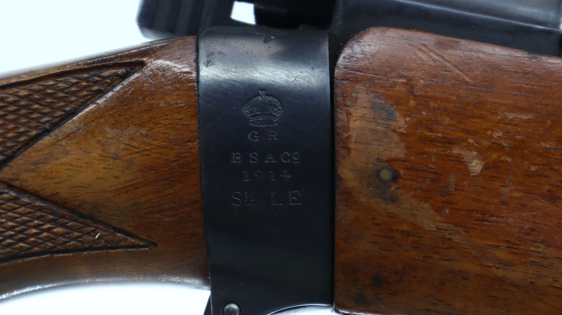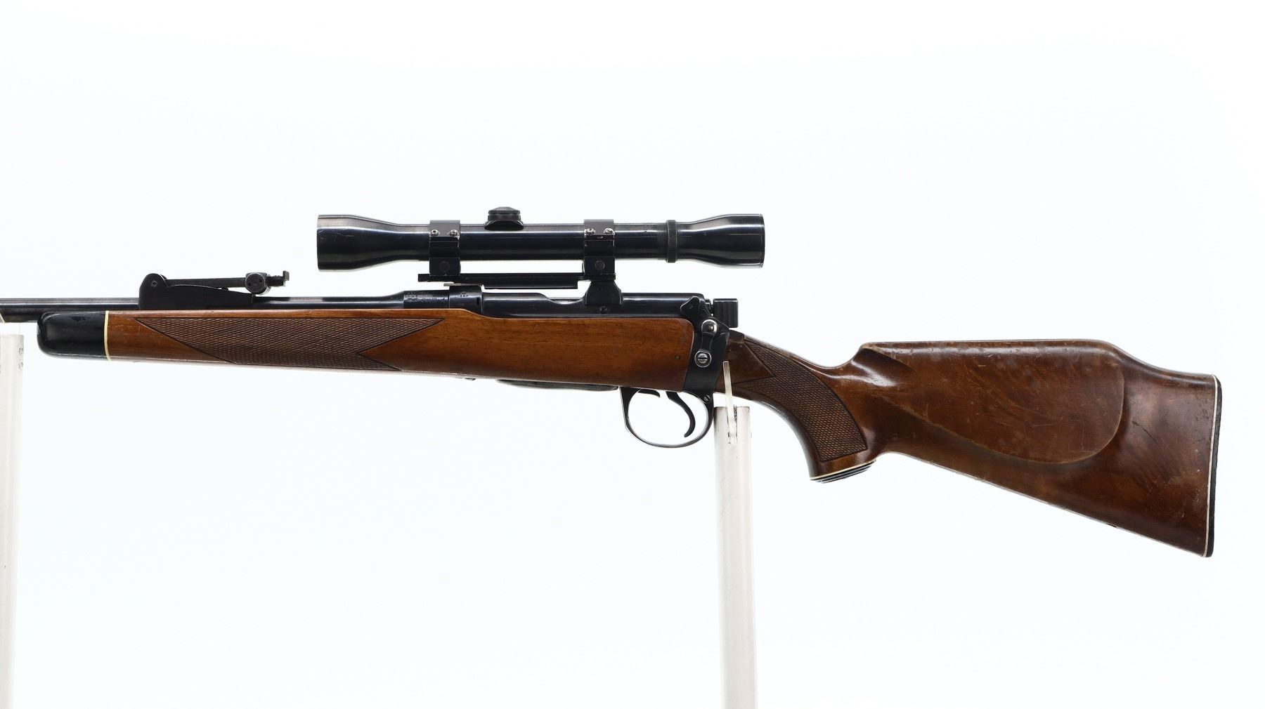 7/10, LEE ENFIELD, MODEL: NO1 MKIII SPORTER, CALIBER: 303 BR, COMES WITH MAGAZINE, BORE IS GOOD. MANUFACTURED BY BSA CO 1914, BOLT MISMATCHED. BLADE FRONT SIGHT WITH RAMP, ADJUSTABLE U NOTCHED REAR SIGHT, BLUED FINISH, RECEIVER DRILLED AND TAPPED WITH WEAVER K460-C SCOPE, CLEAR OPTICS, FINE CROSSHAIR. TWO PIECE MONTE CARLO WOOD STOCKS, BLACK POLYMER FOREND TIP AND PISTOL GRIP CAP, CHECKERED FOREARM AND PISTOL GRIP, CHEEK REST, CHECKERED BLACK POLYMER BUTT PLATE. METAL FINISH SHOWS SOME SCRATCHES, HANDLING AMRS AND WEAR. STOCKS SHOW SOME MARKS, SCRATCHES AND WEAR. ACTION: BOLT ACTION RIFLE, BARREL LENGTH: 23.25", SERIAL # W24699, CONDITION: 7/10, CLASS: CANADIAN NON RESTRICTED