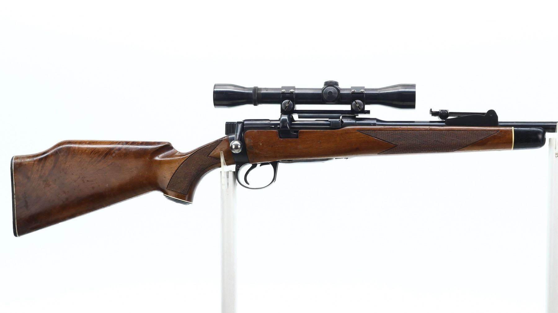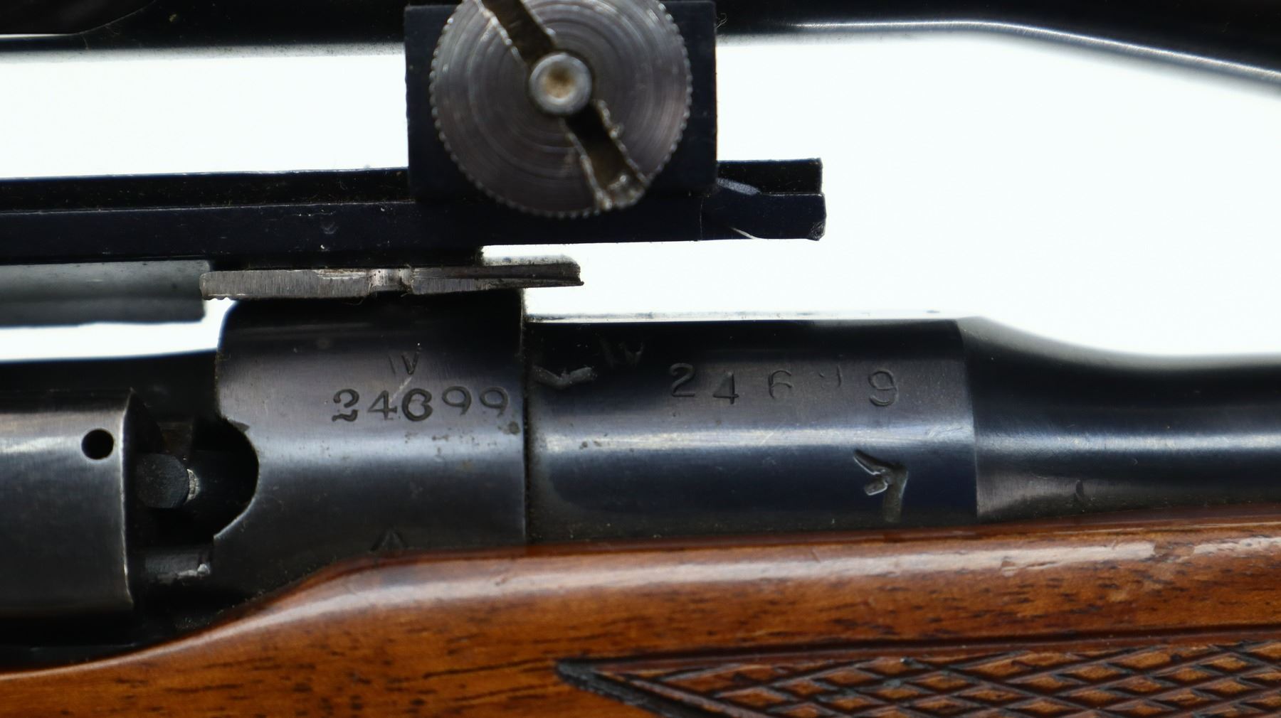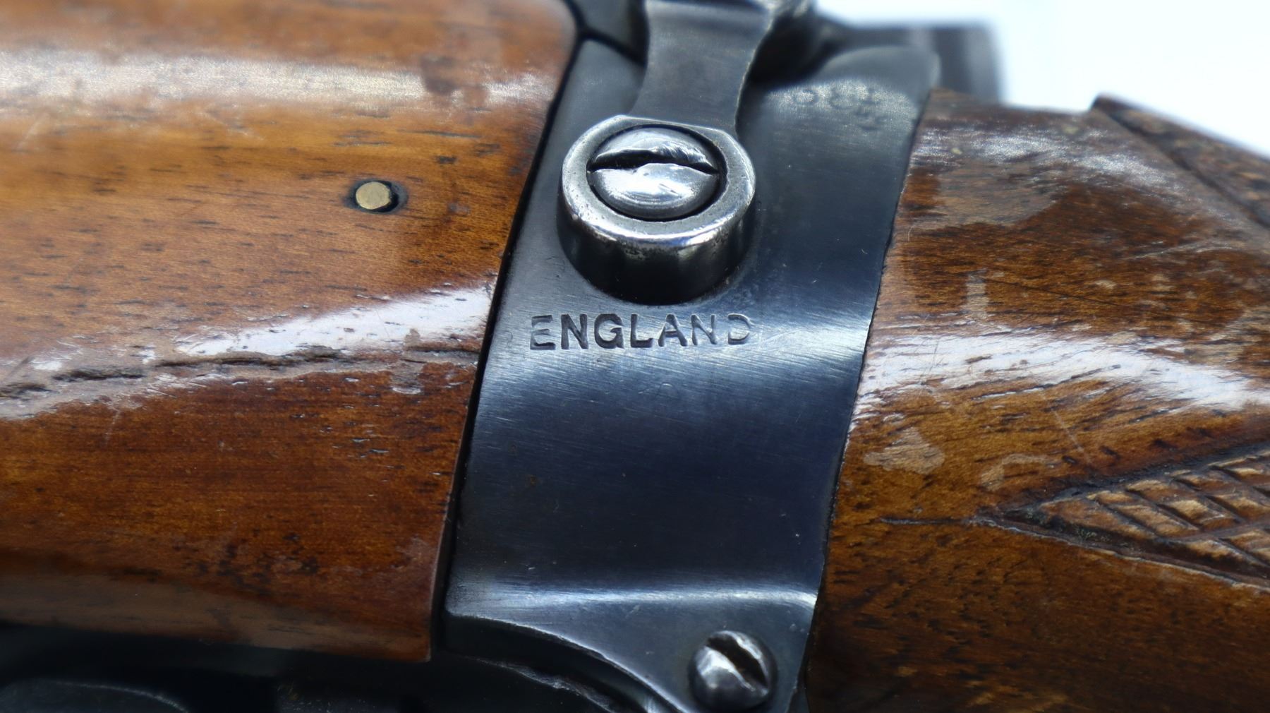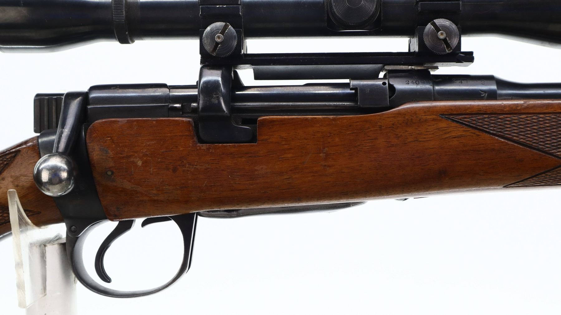 7/10, LEE ENFIELD, MODEL: NO1 MKIII SPORTER, CALIBER: 303 BR, COMES WITH MAGAZINE, BORE IS GOOD. MANUFACTURED BY BSA CO 1914, BOLT MISMATCHED. BLADE FRONT SIGHT WITH RAMP, ADJUSTABLE U NOTCHED REAR SIGHT, BLUED FINISH, RECEIVER DRILLED AND TAPPED WITH WEAVER K460-C SCOPE, CLEAR OPTICS, FINE CROSSHAIR. TWO PIECE MONTE CARLO WOOD STOCKS, BLACK POLYMER FOREND TIP AND PISTOL GRIP CAP, CHECKERED FOREARM AND PISTOL GRIP, CHEEK REST, CHECKERED BLACK POLYMER BUTT PLATE. METAL FINISH SHOWS SOME SCRATCHES, HANDLING AMRS AND WEAR. STOCKS SHOW SOME MARKS, SCRATCHES AND WEAR. ACTION: BOLT ACTION RIFLE, BARREL LENGTH: 23.25", SERIAL # W24699, CONDITION: 7/10, CLASS: CANADIAN NON RESTRICTED