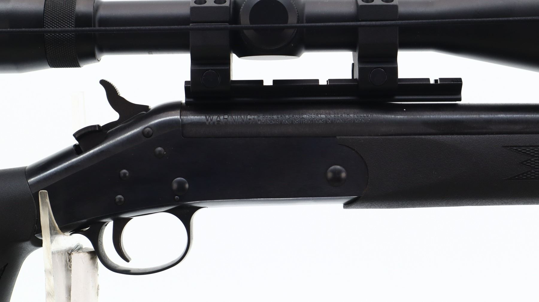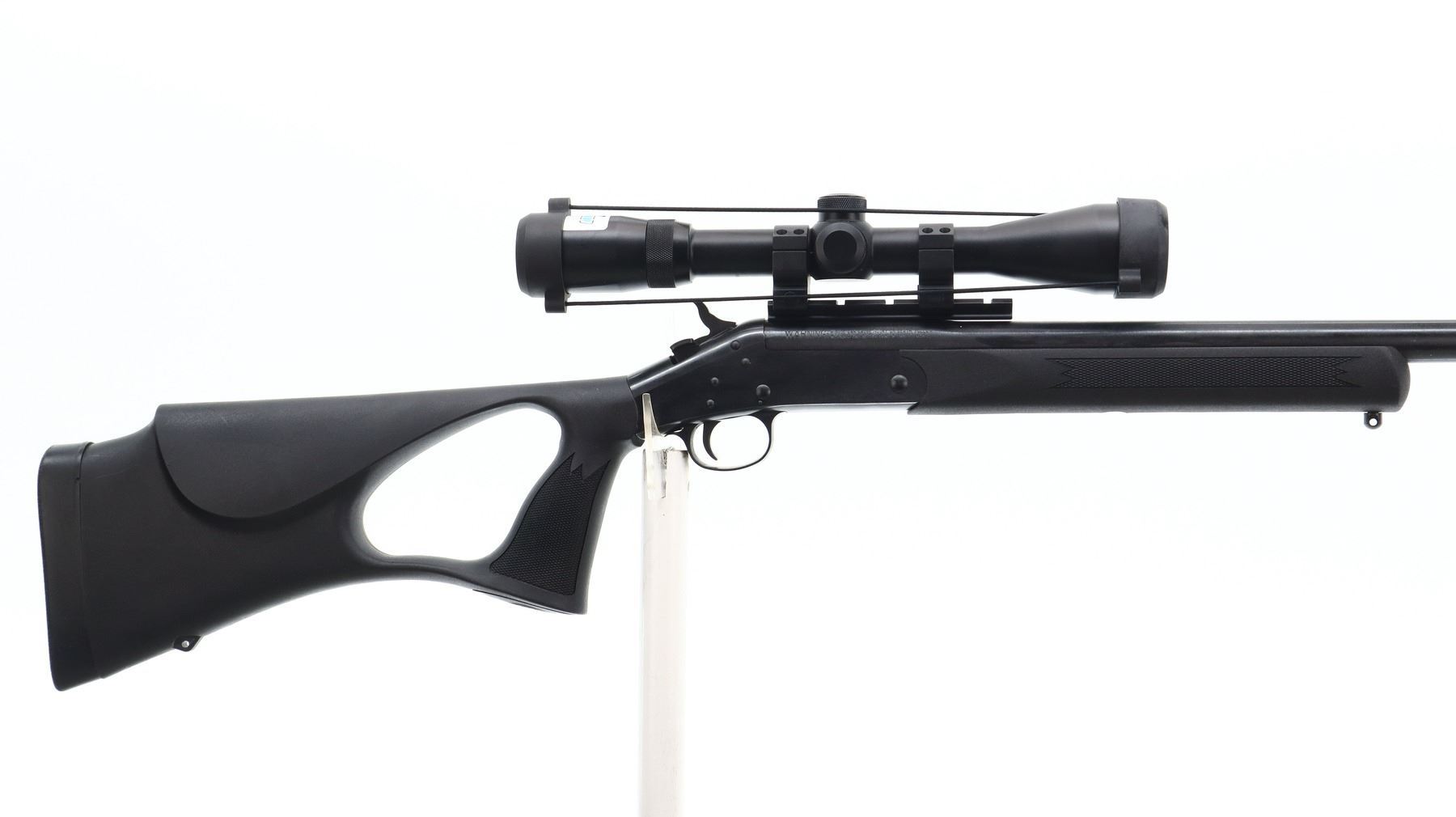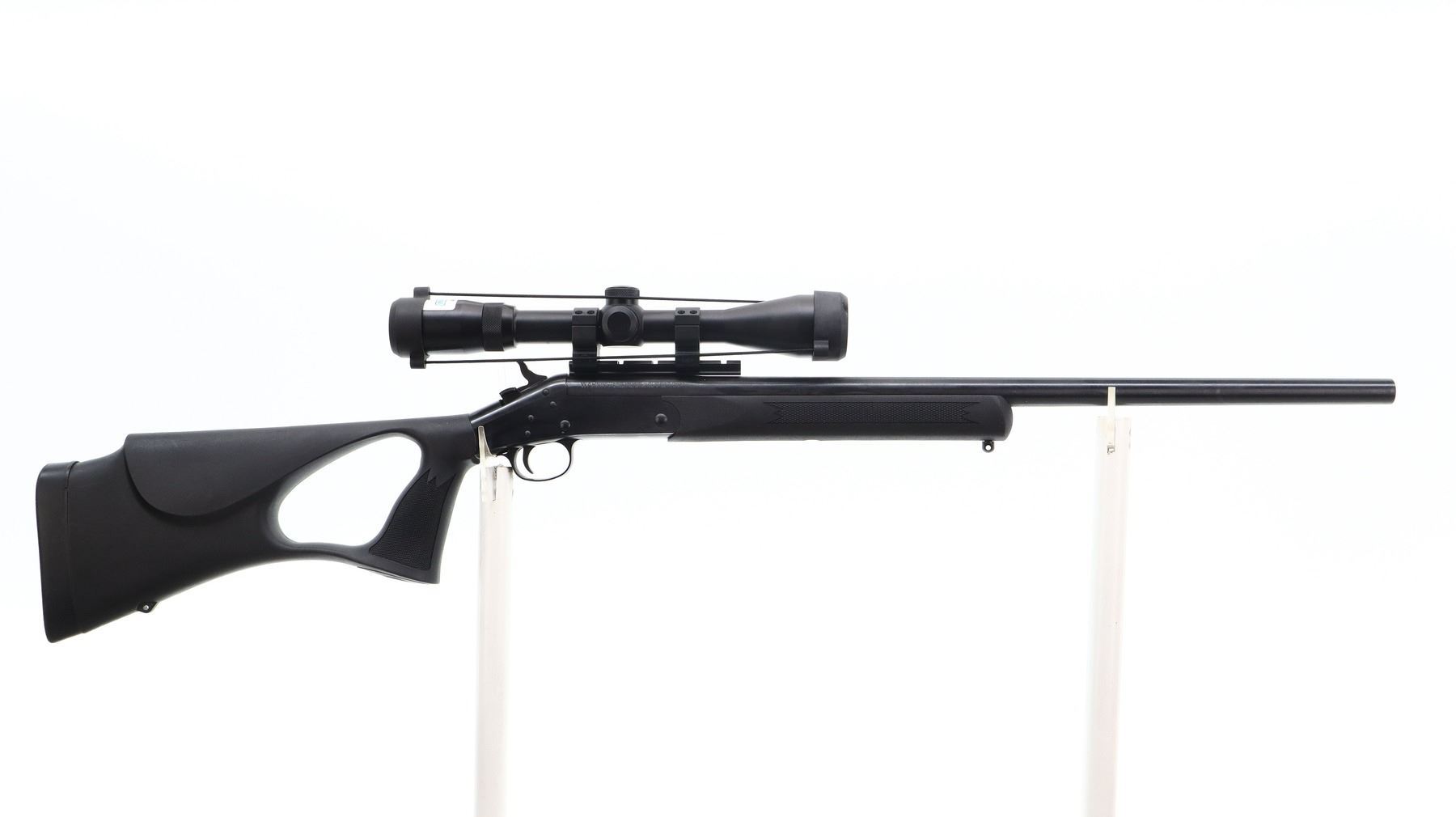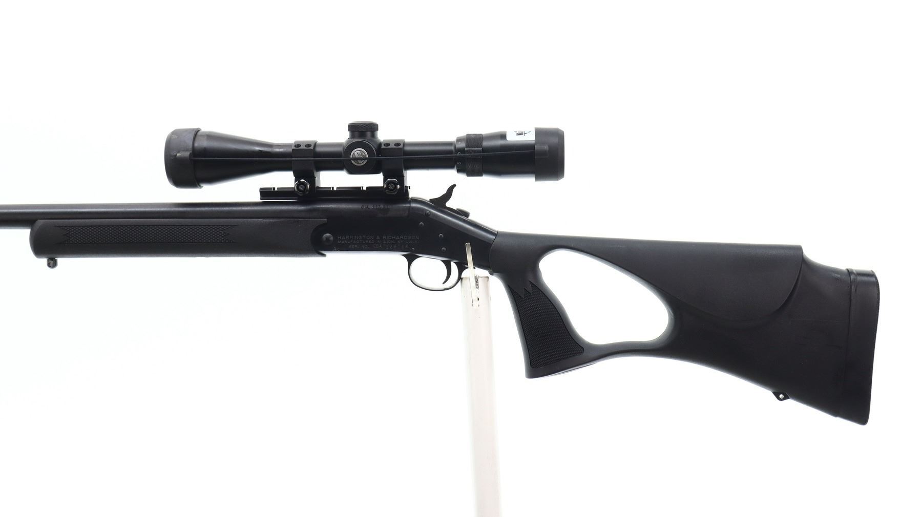 7+/10, HARRINGTON & RICHARDSON , MODEL: PARDNER, CALIBER: 223 REM, BORE IS VERY GOOD. HEAVY BARREL NO SIGHTS. BLUED FINISH. BARREL DRILLED AND TAPPED WITH BUSHNELL LEGEND ULTRA-HD 3-9 X 40 SCOPE, SIDE FOCUS, CLEAR OPTICS, DUPLEX CROSSHAIR. GROOVED SPUR HAMMER. EXTRACTOR. TWO PIECE BLACK SYNTHETIC STOCKS. CHECKERED FOREARM AND THUMBHOLE PISTOL GRIP. AMBI CHEEK REST. BLACK RUBBER RECOIL PAD. SWIVEL STUDS. METAL FINISH SHOWS SOME SCRATCHES, HANDLING MARKS AND WEAR. STOCK SHOWS SOME MARKS AND SCRATCHES. ACTION: HINGE SINGLE SHOT RIFLE , BARREL LENGTH: 24", SERIAL # CBA189795, CONDITION: 7+/10, CLASS: CANADIAN NON RESTRICTED