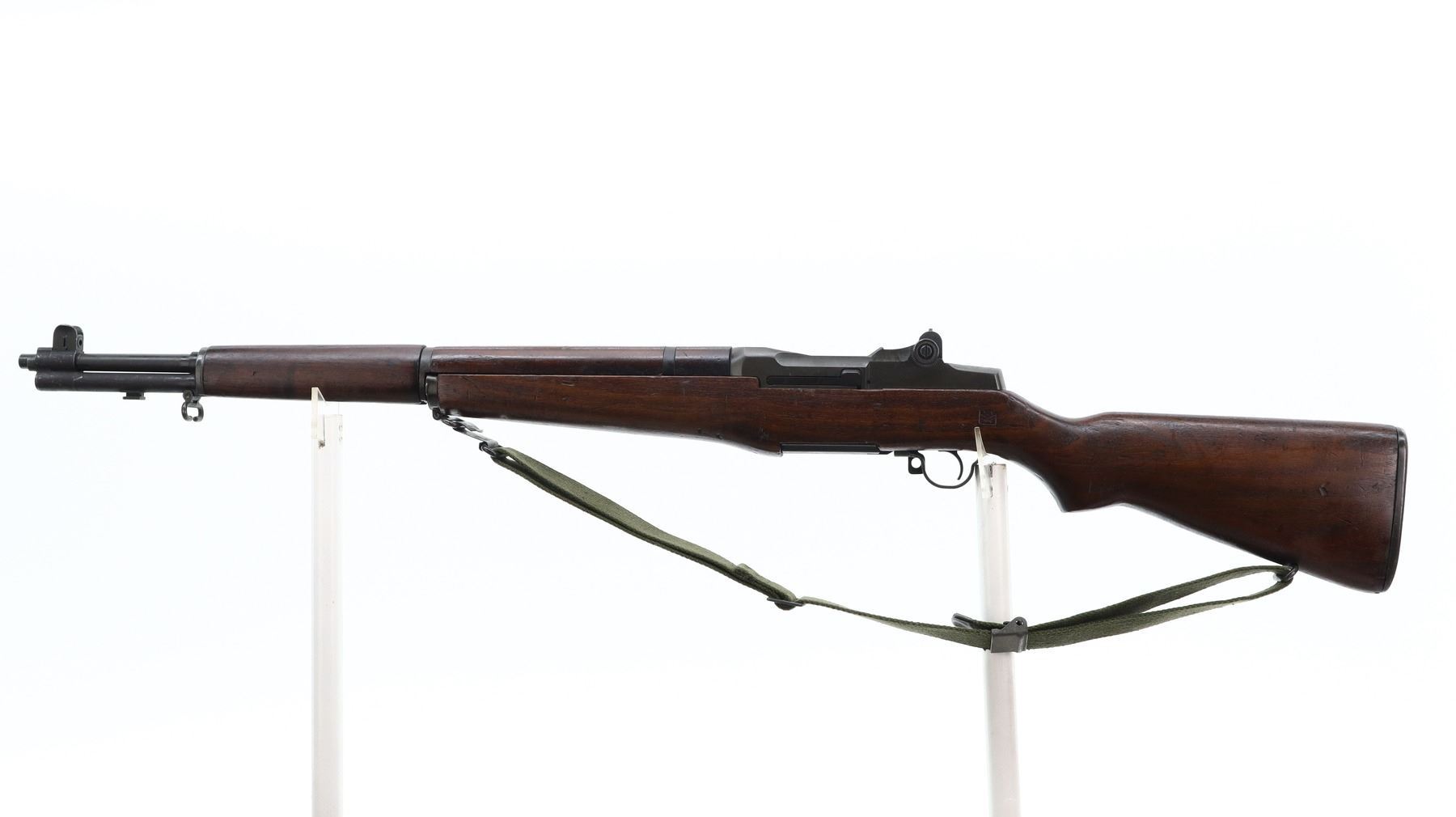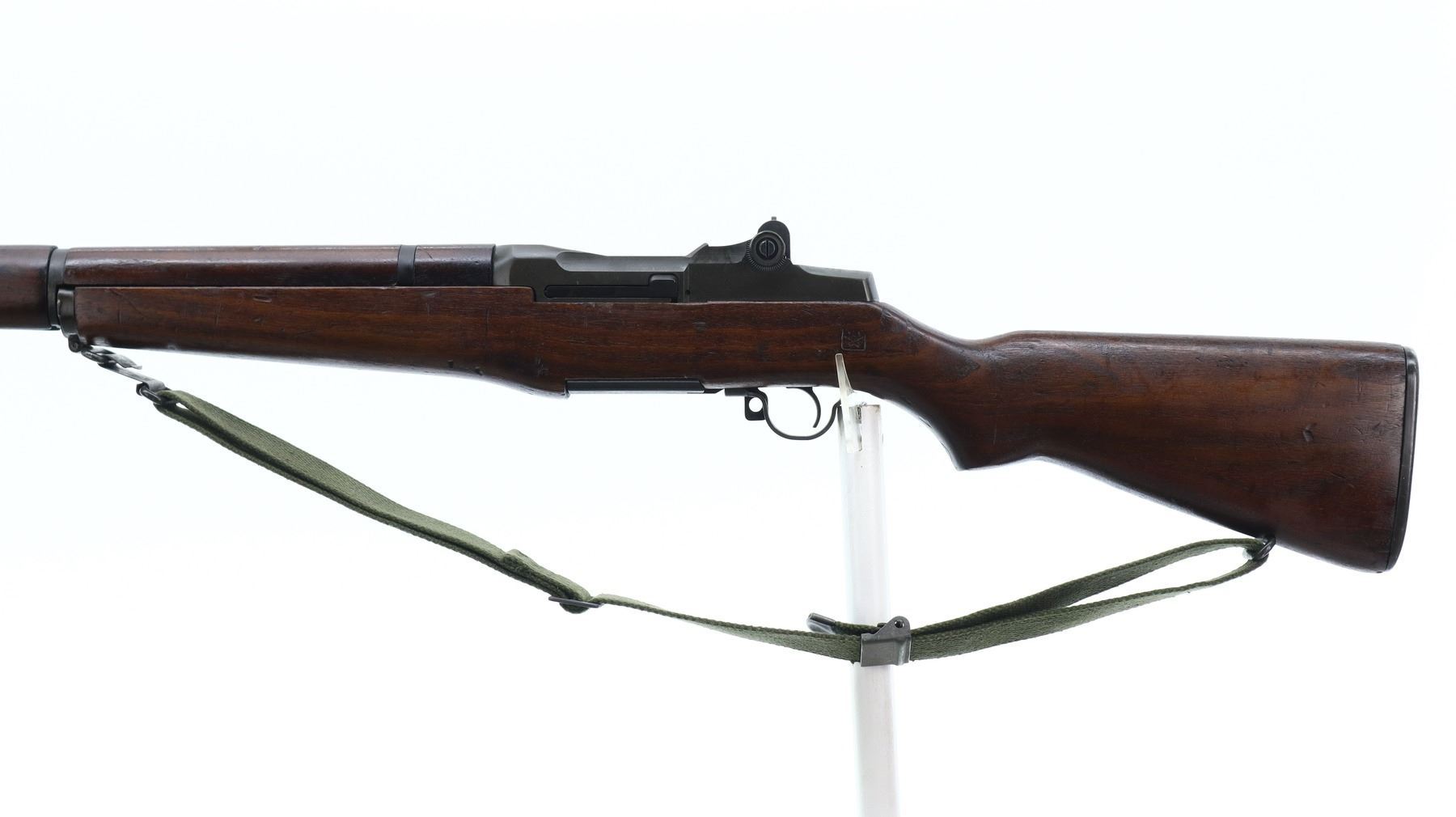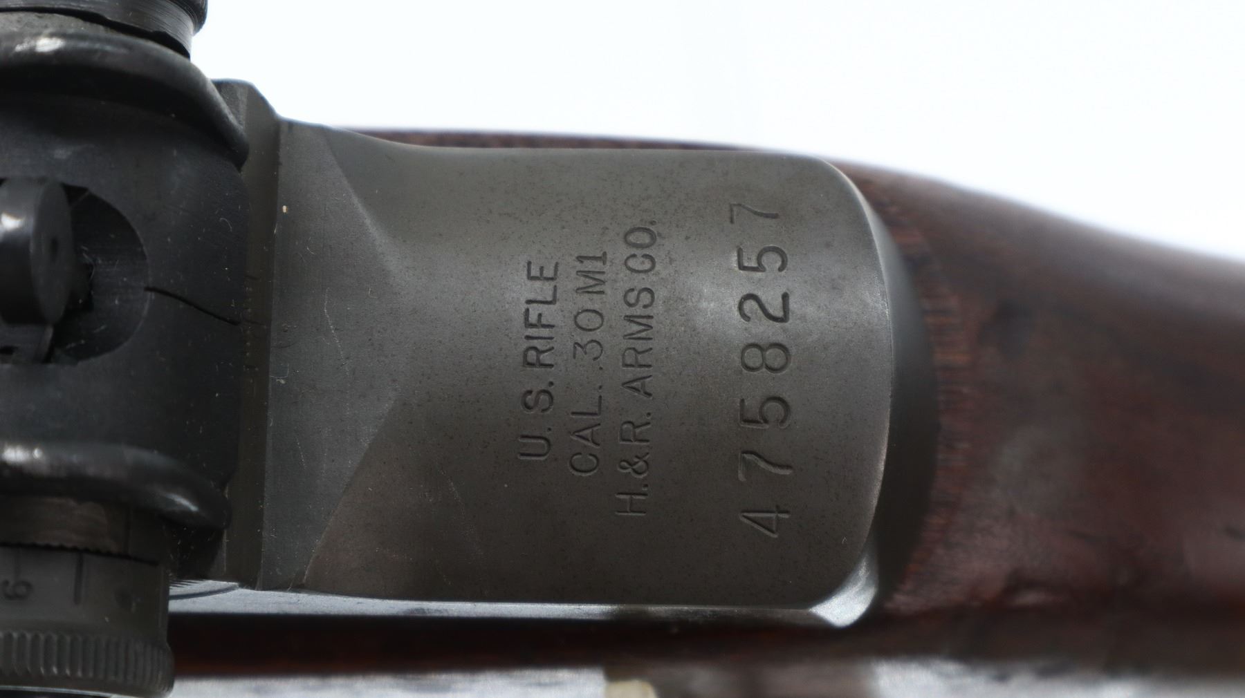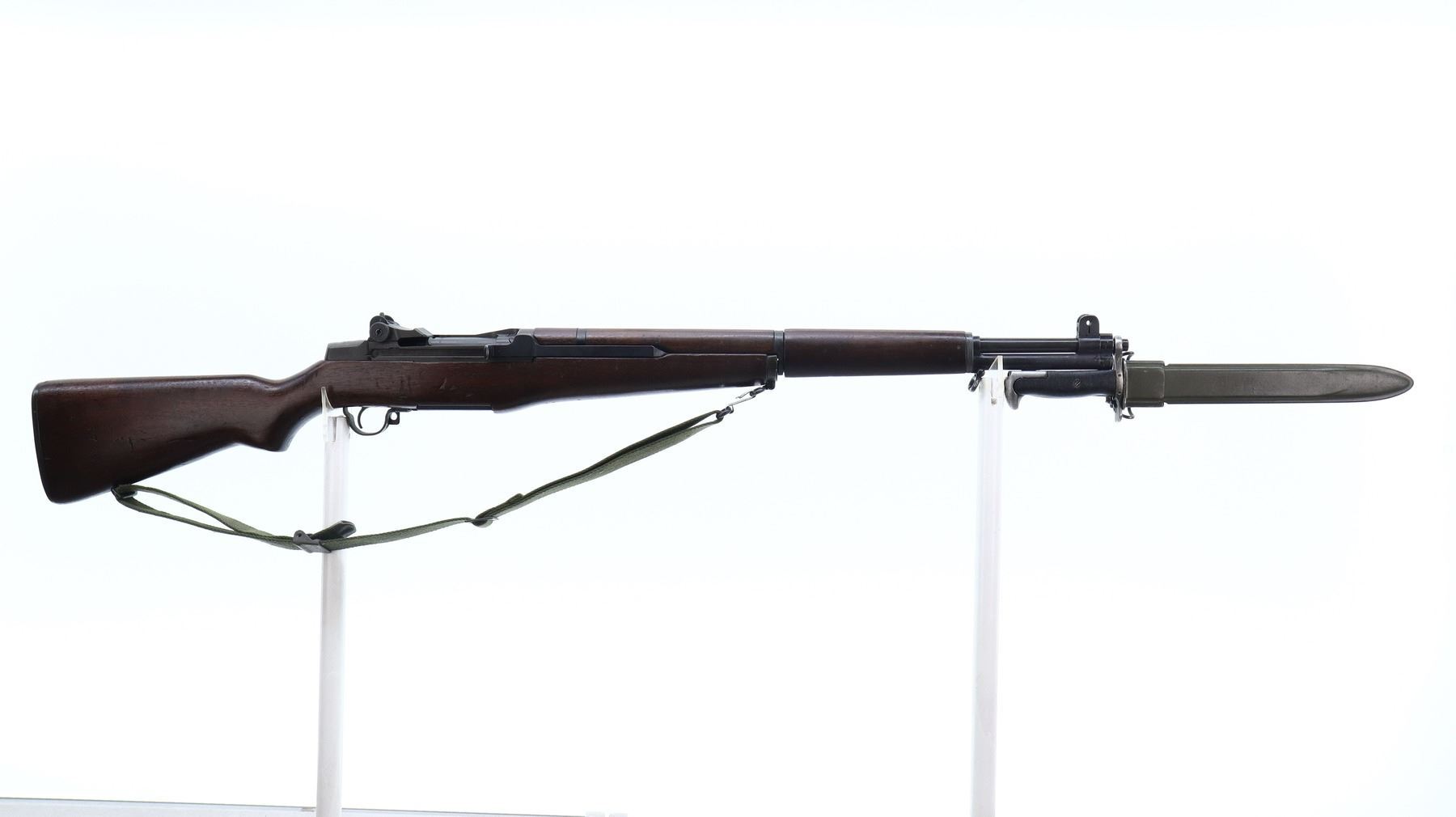 7+/10, US RIFLE , MODEL: M1 GARAND , CALIBER: 30-06 SPRG , COMES WITH BAYONET, BORE IS EXCELLENT. MANUFACTURED BY HARRINGTON & RICHARDSON. BLADE FRONT SIGHT WITH EARS. ADJUSTABLE REAR PEEP SIGHT. PARKERIZED FINISH. BARREL MARKED HRA 5-54. 3 PIECE FULL MILITARY WOOD STOCKS. PISTOL GRIP. CARTOOSH ON LEFT SIDE. CHECKERED STEEL BUTT PLATE WITH TRAP. SLING SWIVELS WITH CANVAS MILITARY SLING. BAYONET LUG. STACKING SWIVEL. BAYONET IS A M1 MANUFACTURED BY AMERICAN FORK AND HOE, WITH BLACK GRIPS, GREEN FIBERGLASS SCABBARD WITH BELT HOOKS. METAL FINISH SHOWS SOME SCRATCHES, HANDLING MARKS AND WEAR. STOCKS SHOWS SOME MARKS, SCRATCHES AND WEAR. ACTION: SEMI AUTOMATIC RIFLE, BARREL LENGTH: 24", SERIAL # 4758257, CONDITION: 7+/10, CLASS: CANADIAN NON RESTRICTED
