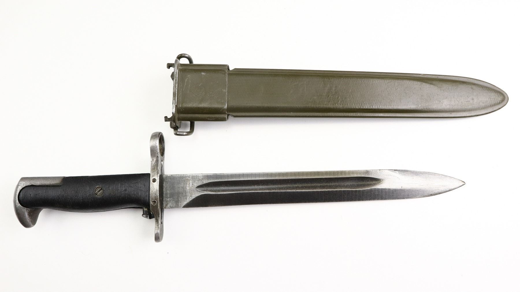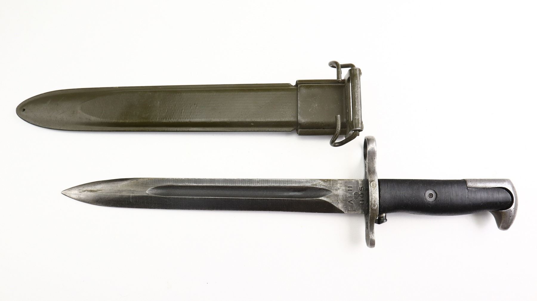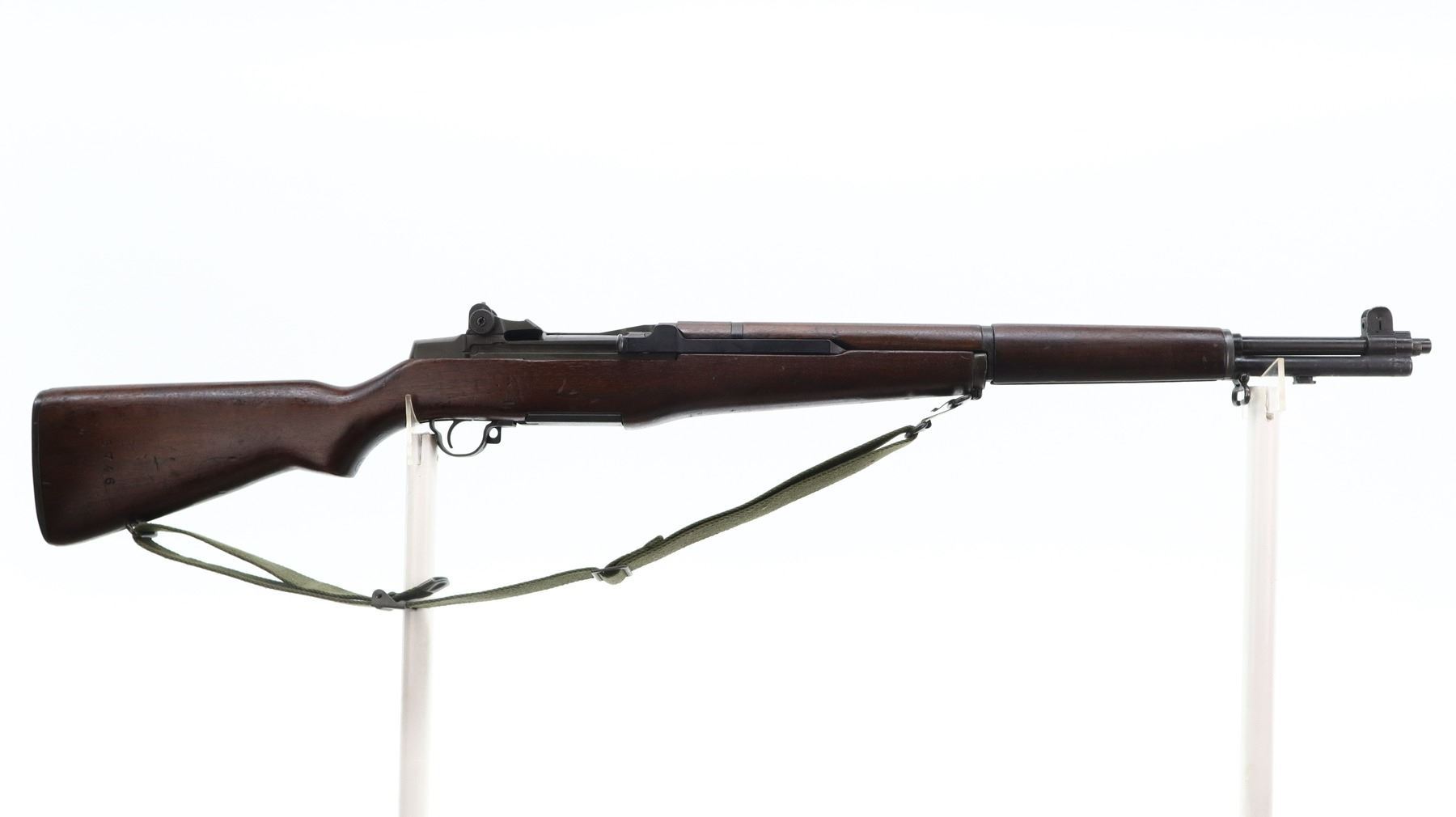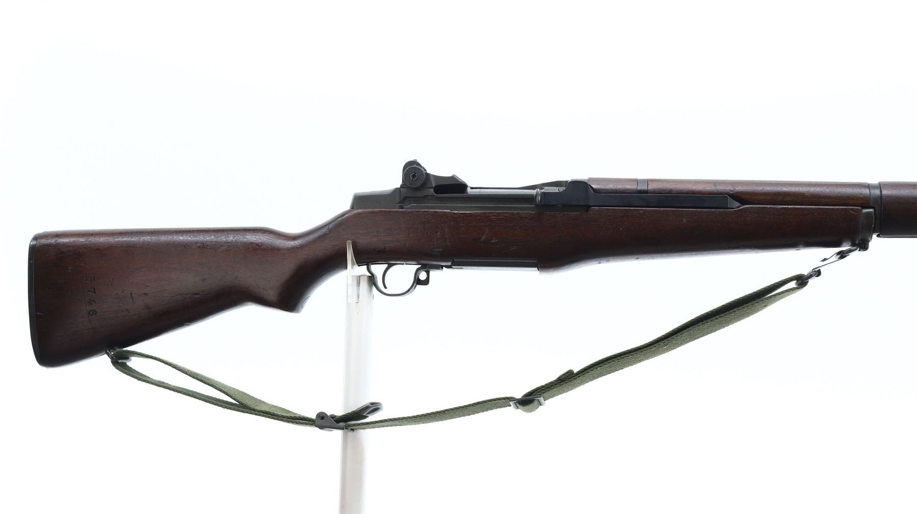 7+/10, US RIFLE , MODEL: M1 GARAND , CALIBER: 30-06 SPRG , COMES WITH BAYONET, BORE IS EXCELLENT. MANUFACTURED BY HARRINGTON & RICHARDSON. BLADE FRONT SIGHT WITH EARS. ADJUSTABLE REAR PEEP SIGHT. PARKERIZED FINISH. BARREL MARKED HRA 5-54. 3 PIECE FULL MILITARY WOOD STOCKS. PISTOL GRIP. CARTOOSH ON LEFT SIDE. CHECKERED STEEL BUTT PLATE WITH TRAP. SLING SWIVELS WITH CANVAS MILITARY SLING. BAYONET LUG. STACKING SWIVEL. BAYONET IS A M1 MANUFACTURED BY AMERICAN FORK AND HOE, WITH BLACK GRIPS, GREEN FIBERGLASS SCABBARD WITH BELT HOOKS. METAL FINISH SHOWS SOME SCRATCHES, HANDLING MARKS AND WEAR. STOCKS SHOWS SOME MARKS, SCRATCHES AND WEAR. ACTION: SEMI AUTOMATIC RIFLE, BARREL LENGTH: 24", SERIAL # 4758257, CONDITION: 7+/10, CLASS: CANADIAN NON RESTRICTED