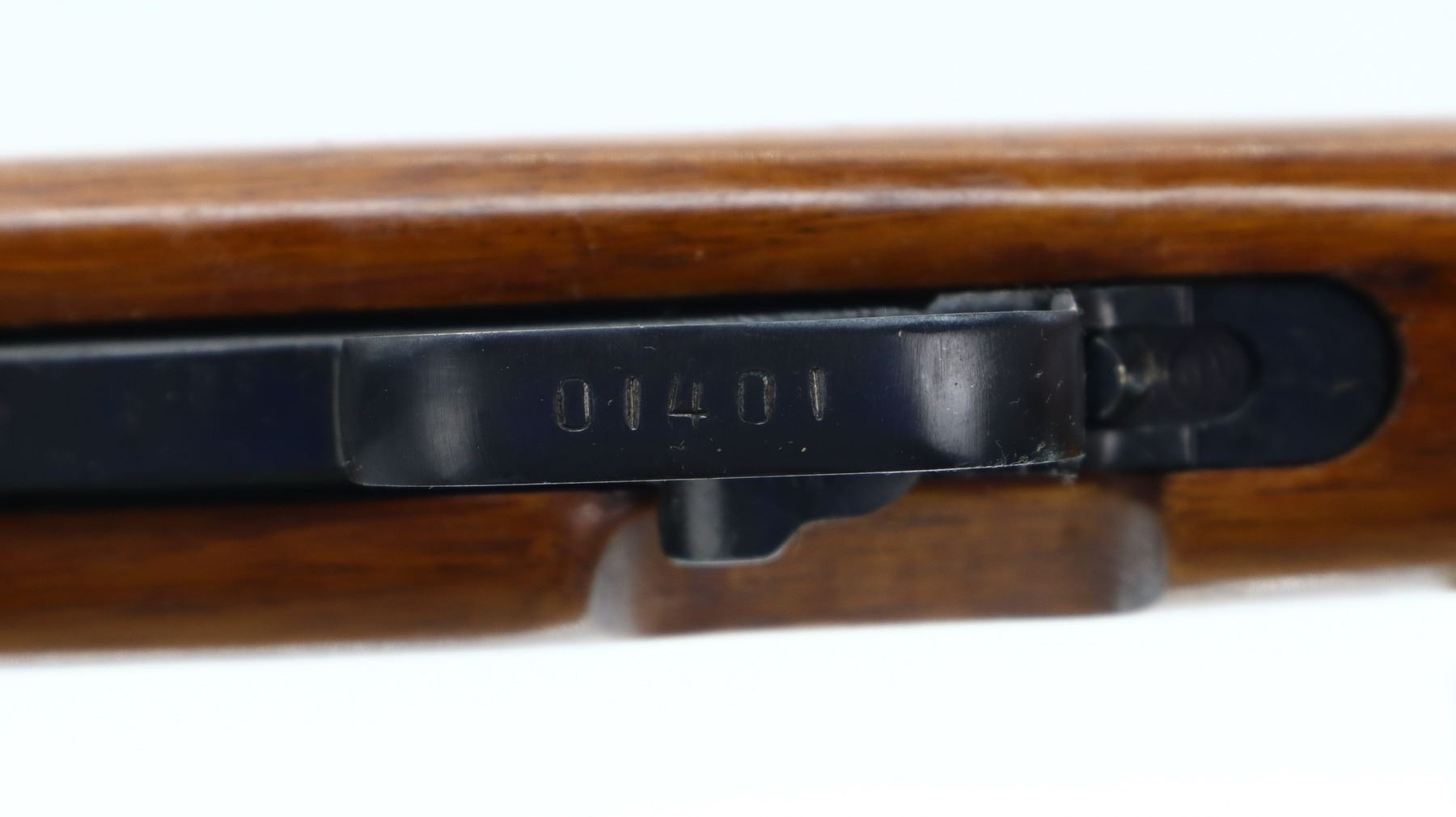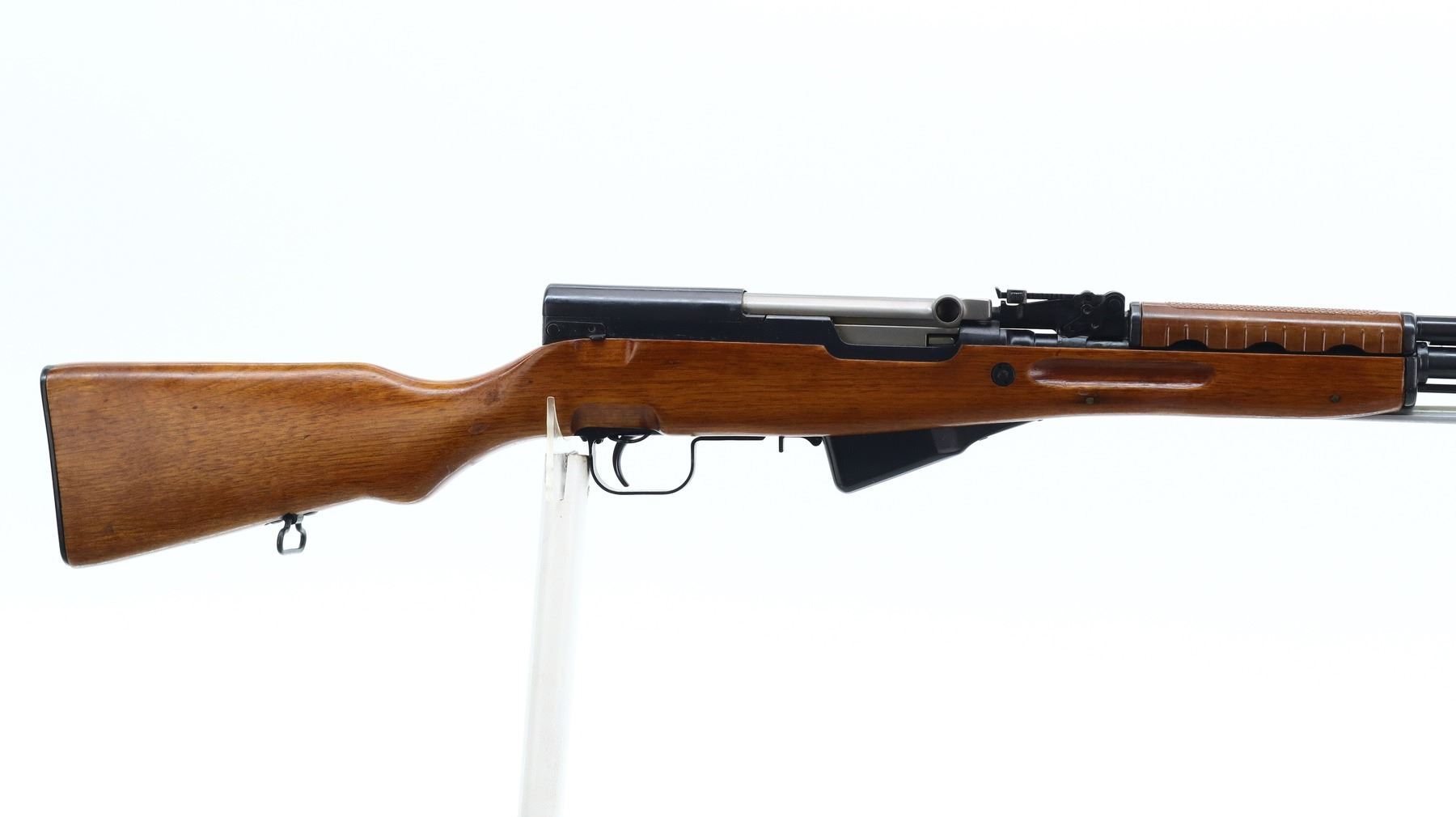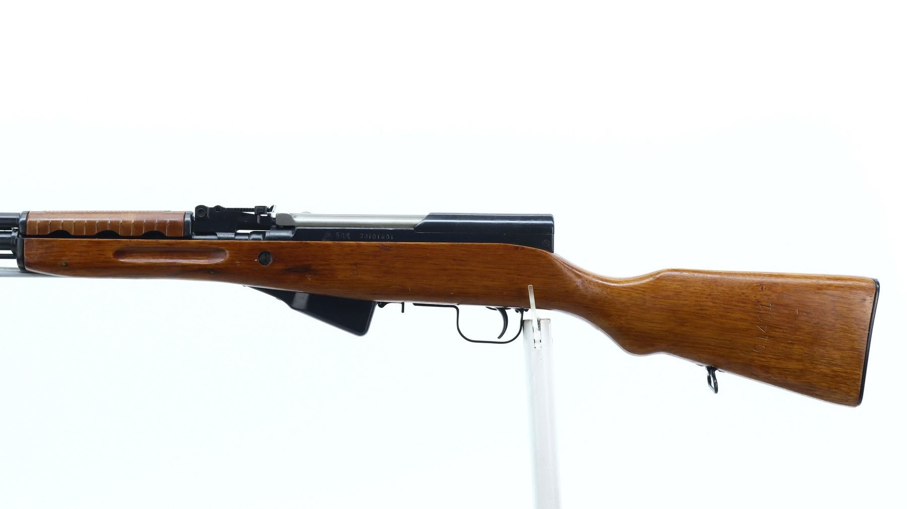 9/10, NORINCO, MODEL: SKS 56, CALIBER: 7.62 X 39, COMES WITH BOX, OILER, BORE IS EXCELLENT. ALL VISIBLE SERIAL #'S MATCH. POST FRONT SIGHT WITH HOOD AND RAMP. ADJUSTABLE U NOTCH REAR SIGHT. SILVER BOLT AND CARRIER. ONE PIECE CHECKERED BROWN POLYMER HANDGUARD. ONE PIECE SMOOTH WOOD STOCK. GROOVED FOREARM. PISTOL GRIP. SMOOTH STEEL BUTT PLATE WITH TRAP AND CLEANING KIT. SLING SWIVELS. CLEANING ROD. ATTACHED FOLDING CRUCIFORM BAYONET. METAL FINISH SHOWS SOME SCRATCHES AND HANDLING MARKS, STOCK SHOWS SOME MARKS AND SCRATCHES. ACTION: SEMI AUTOMATIC RIFLE, BARREL LENGTH: 20.5", SERIAL # 23101401, CONDITION: 9/10, CLASS: CANADIAN NON RESTRICTED