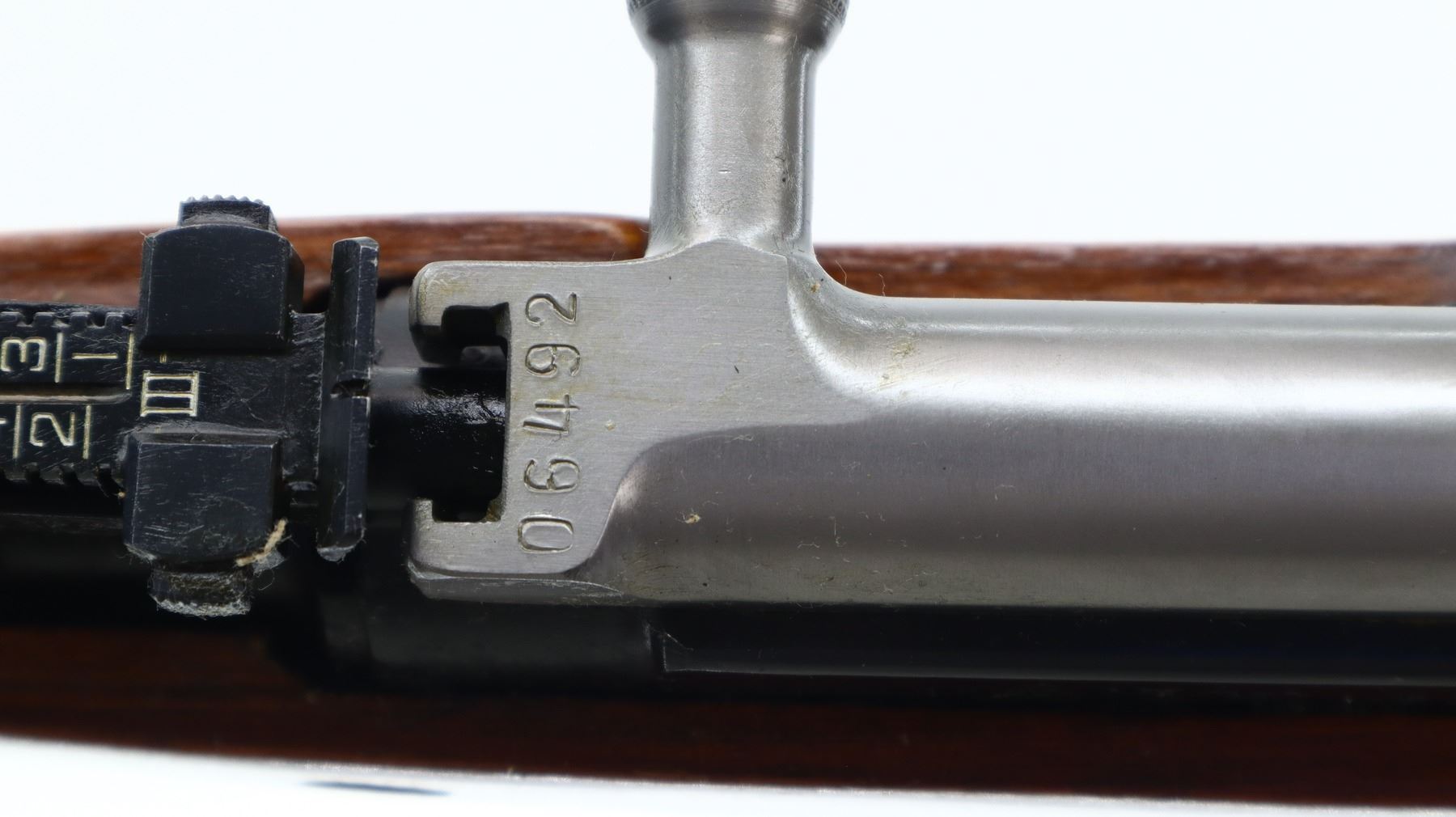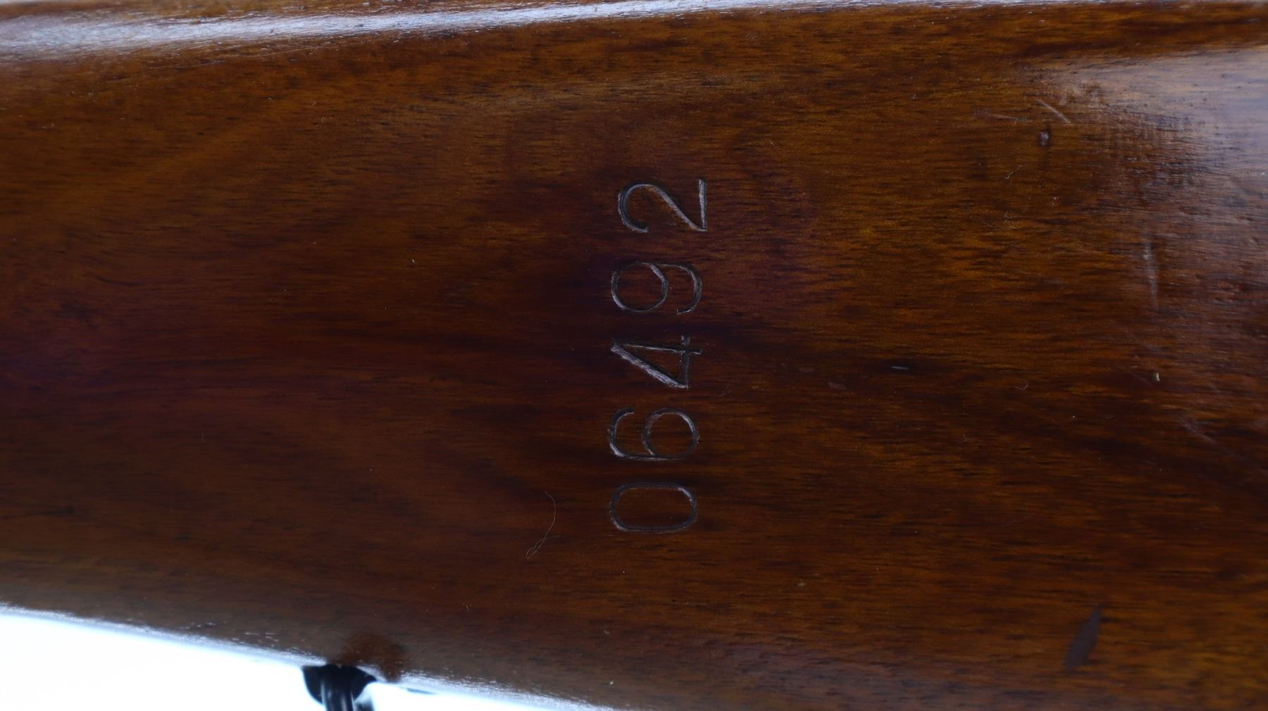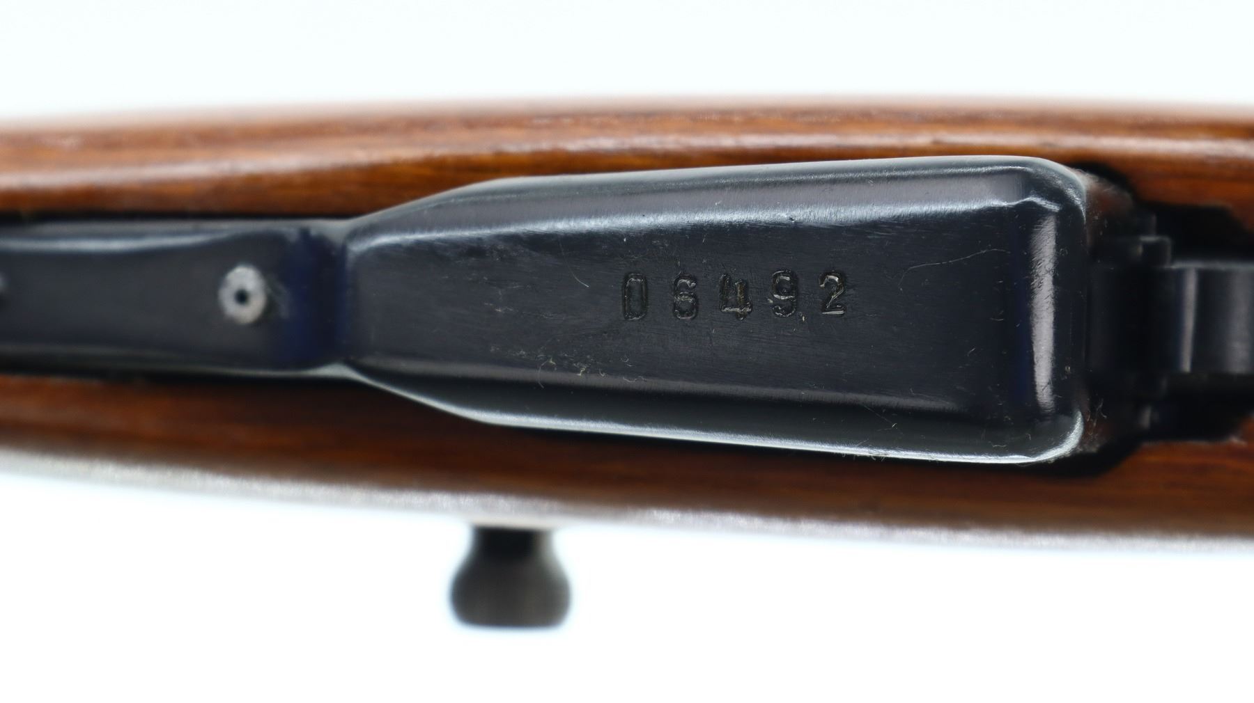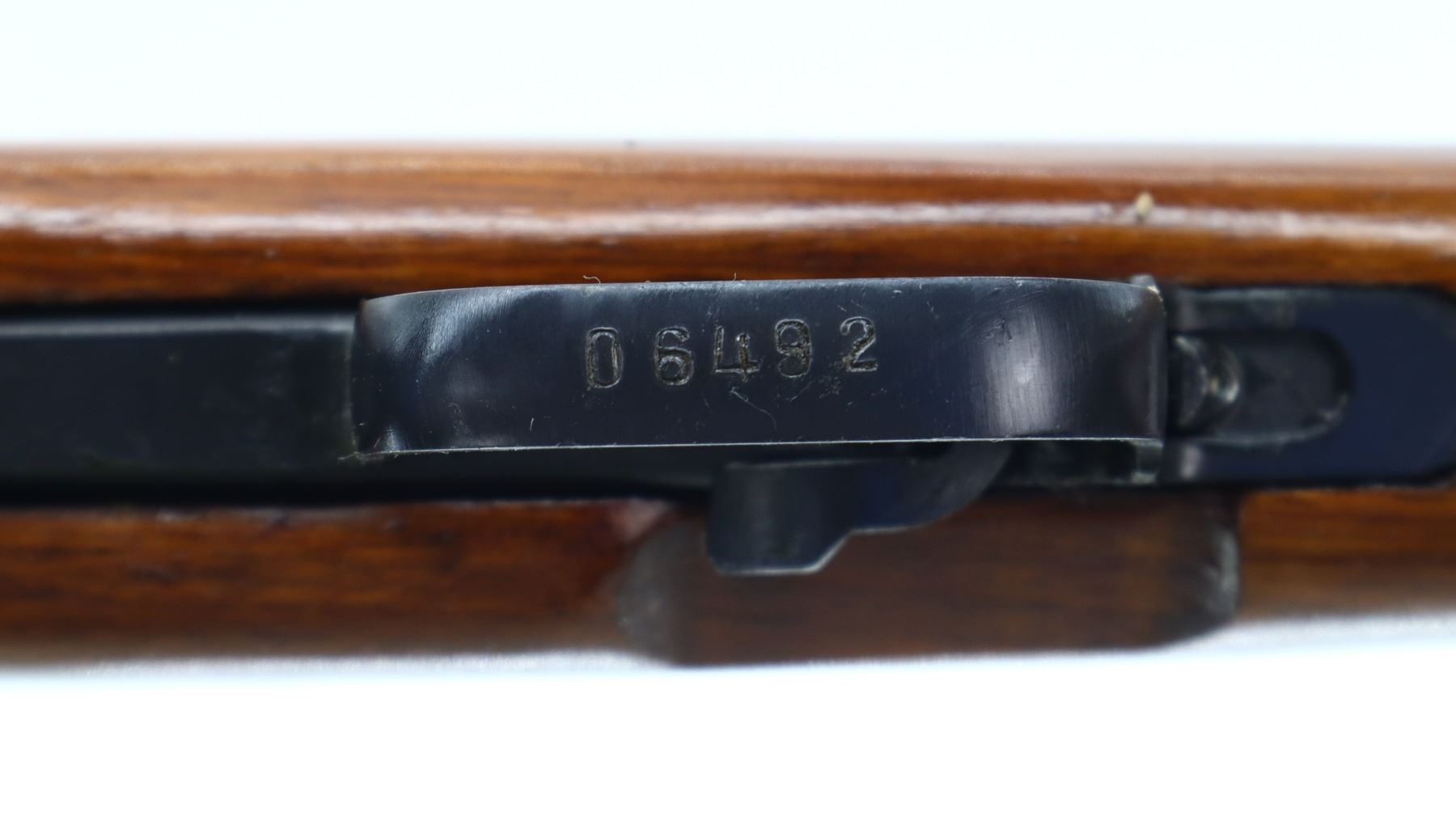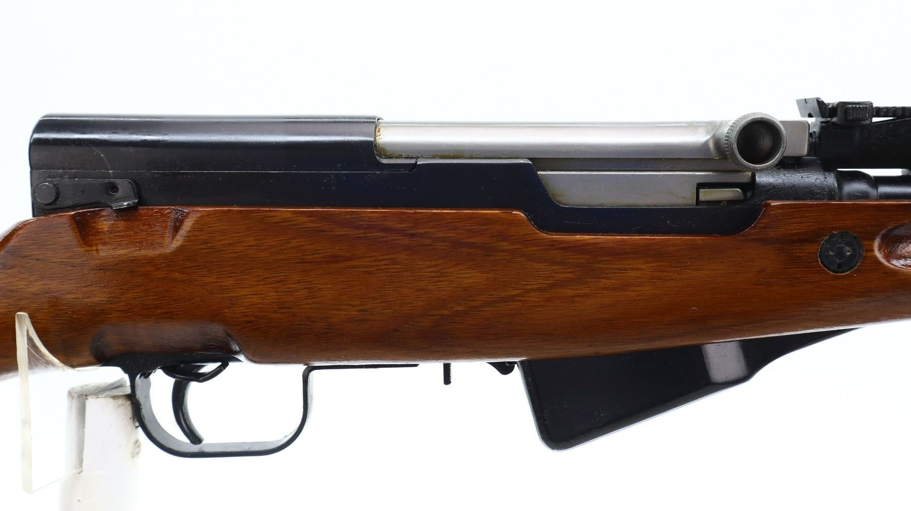 9/10, NORINCO, MODEL: SKS 56, CALIBER: 7.62 X 39, COMES WITH BOX, OILER, BORE IS EXCELLENT. ALL VISIBLE SERIAL #'S MATCH. POST FRONT SIGHT WITH HOOD AND RAMP. ADJUSTABLE U NOTCH REAR SIGHT. SILVER BOLT AND CARRIER. ONE PIECE CHECKERED BROWN POLYMER HANDGUARD. ONE PIECE SMOOTH WOOD STOCK. GROOVED FOREARM. PISTOL GRIP. SMOOTH STEEL BUTT PLATE WITH TRAP AND CLEANING KIT. SLING SWIVELS. CLEANING ROD. ATTACHED FOLDING CRUCIFORM BAYONET. METAL FINISH SHOWS SOME SCRATCHES AND HANDLING MARKS, STOCK SHOWS SOME MARKS AND SCRATCHES. ACTION: SEMI AUTOMATIC RIFLE, BARREL LENGTH: 20.5", SERIAL # 23006492, CONDITION: 9/10, CLASS: CANADIAN NON RESTRICTED