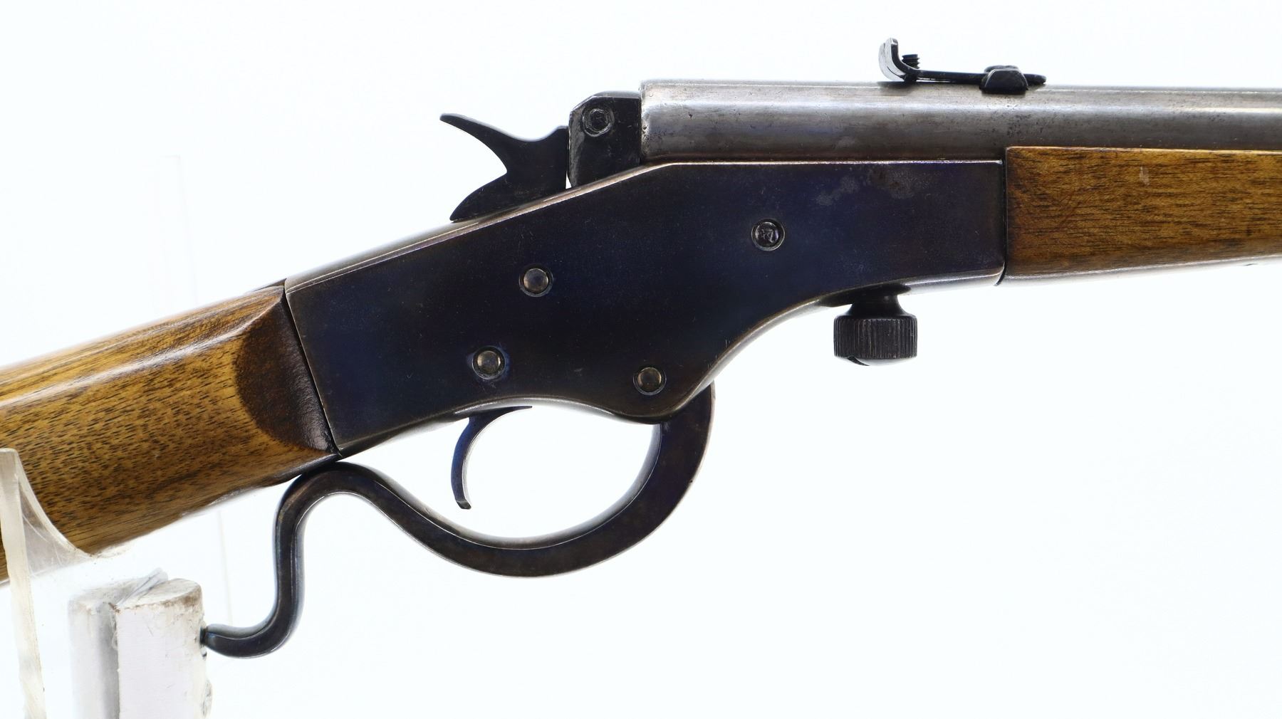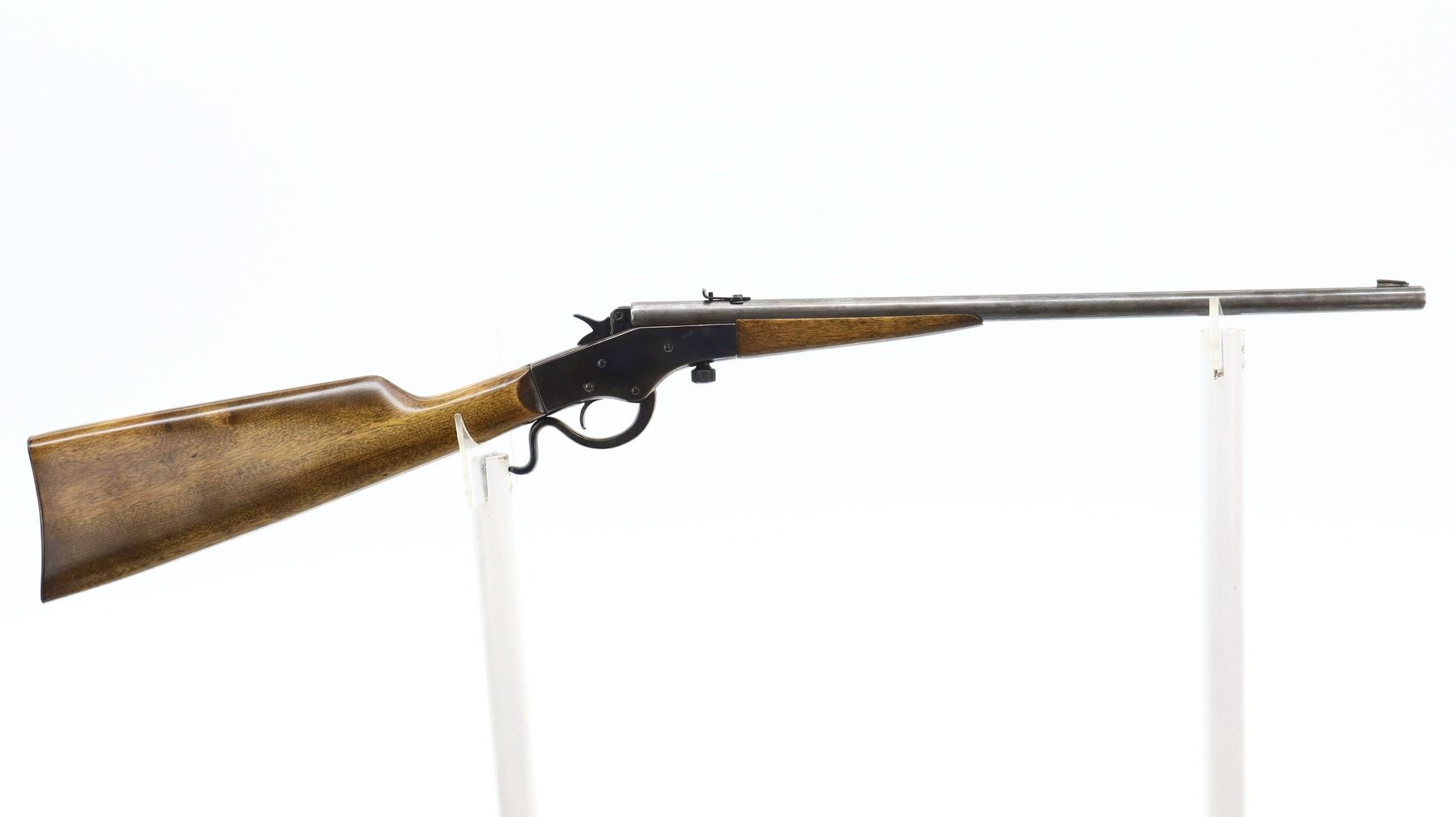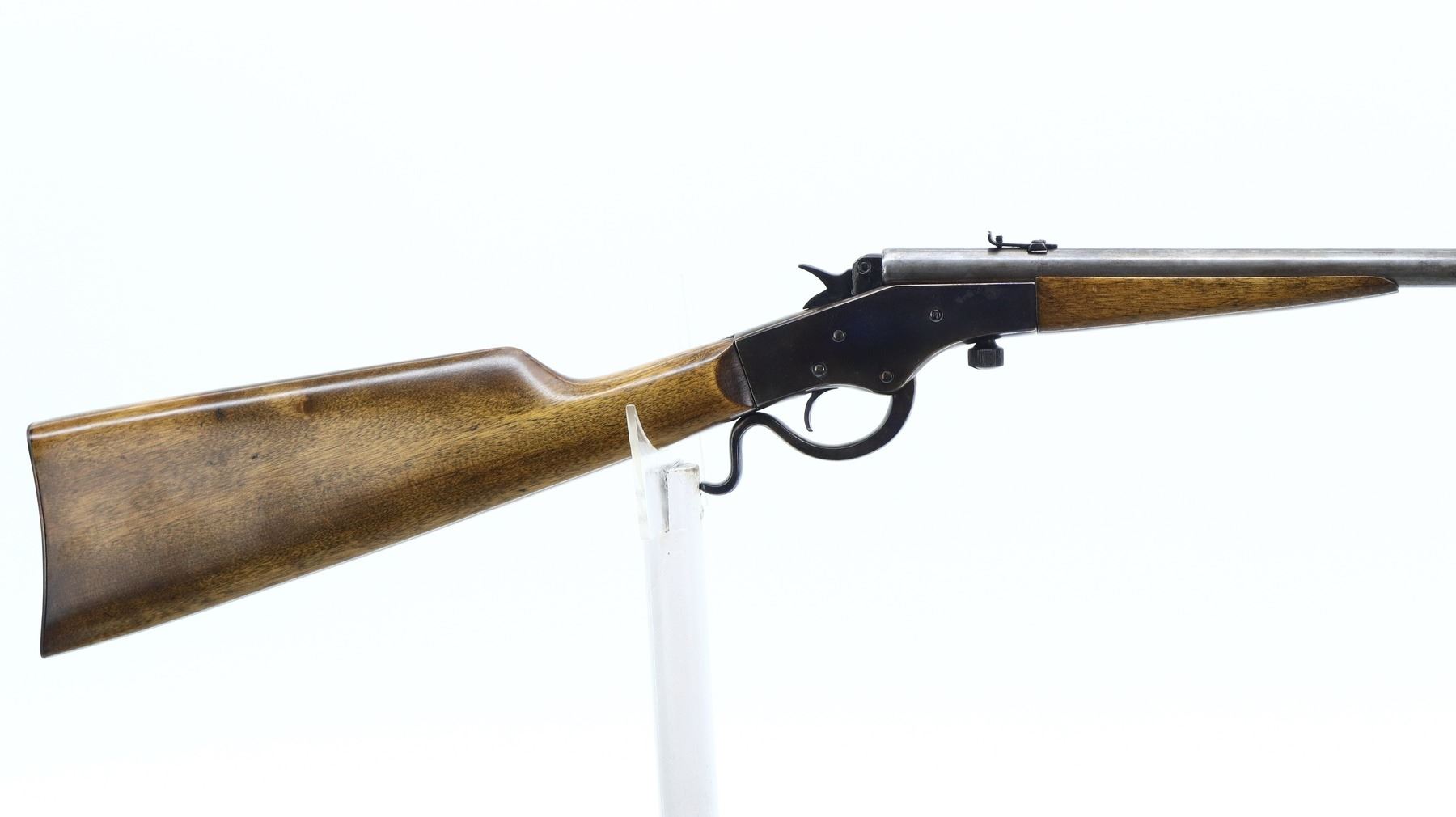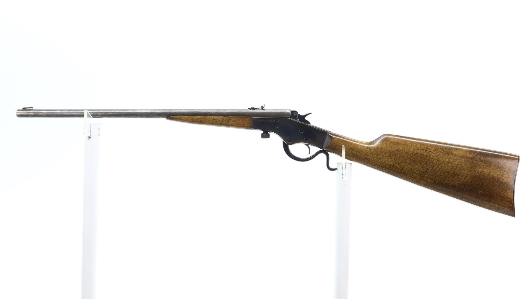 4/10, STEVENS, MODEL: CRACKSHOT 26, CALIBER: 22 LR, BORE IS FAIR, LIGHT PITTING. BLADE FRONT SIGHT, ADJUSTABLE U NOTCHED REAR SIGHT, ROUND BARREL, CHECKERED SPUR HAMMER, EXTRACTOR. TWO PIECE SMOOTH WOOD STOCKS, STRAIGHT GRIP, SMOOTH STEEL BUTT PLATE. METAL FINISH TURNING SILVER GREY WITH SCRATCHES, HANDLING MARKS AND WEAR. STOCKS SHOW MARKS, SCRATCHES AND WEAR. ACTION: SINGLE SHOT DROP BLOCK RIFLE, BARREL LENGTH: 18", SERIAL # NA, CONDITION: 4/10, CLASS: CANADIAN NON RESTRICTED
