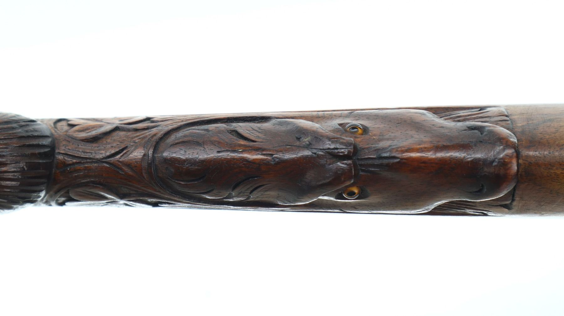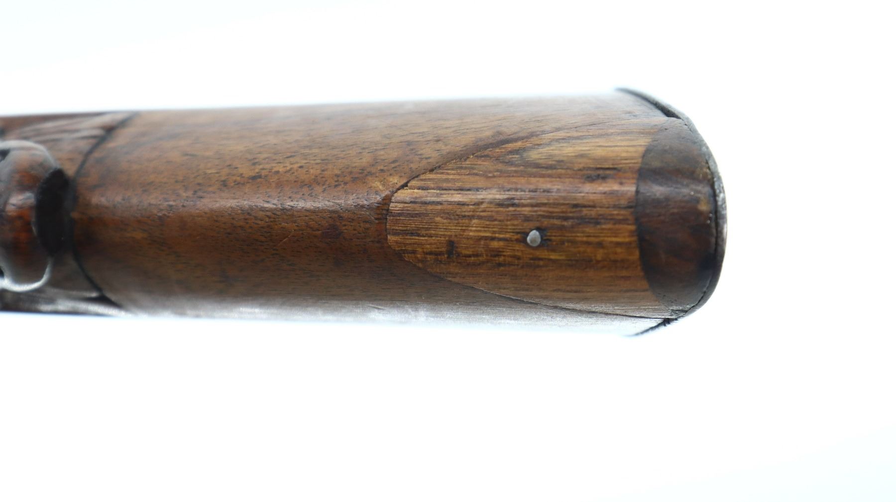 2/10, WALTHERS & SON, MODEL: SIDE BY SIDE HAMMER GUN, CALIBER: 12 G X 2 5/8", BORES ARE FAIR AND PITTED. FIXED MOD AND IC CHOKES. BRASS BEAD. DAMASCUS BARRELS. LOOSE ON FACE. ENGRAVED RECEIVER. SIDE LOCKS WITH GROOVED SPUR HAMMERS THAT FUNCTION. EXTRACTOR. DOUBLE TRIGGERS. TWO PIECE WOOD STOCKS. REPLACED SMOOTH FOREND WHICH IS LOOSE AND CRACKED. CHECKERED PISTOL GRIP. SMOOTH STEEL BUTT PLATE. STOCK CRACKED AND REPAIRED AT TOE. STOCK HAS ANIMAL CARVING ON THE BOTTOM. METAL FINISH TURNING SILVER GREY WITH LIGHT RUST SPECKLES, SCRATCHES, HANDLING MARKS AND WEAR. STOCKS SHOW MARKS, SCRATCHES AND WEAR. ACTION: HINGED SIDE BY SIDE SHOTGUN, BARREL LENGTH: 30", SERIAL # 13317, CONDITION: 2/10, CLASS: CANADIAN NON RESTRICTED