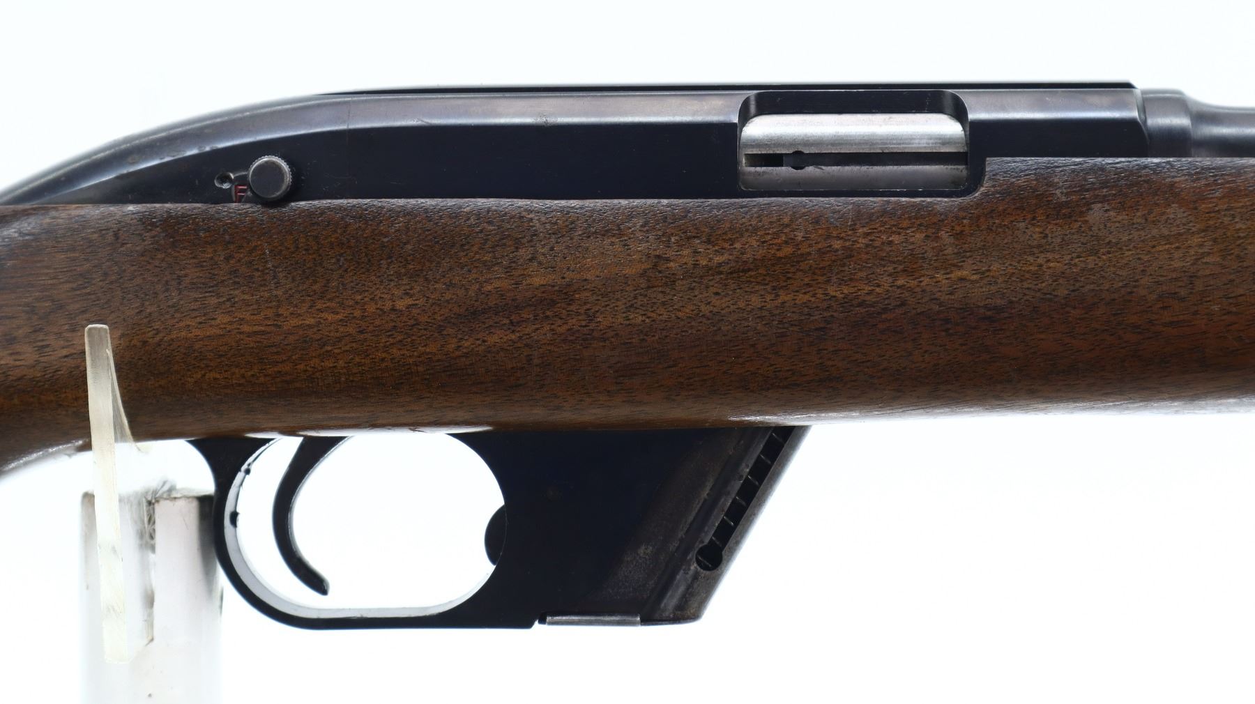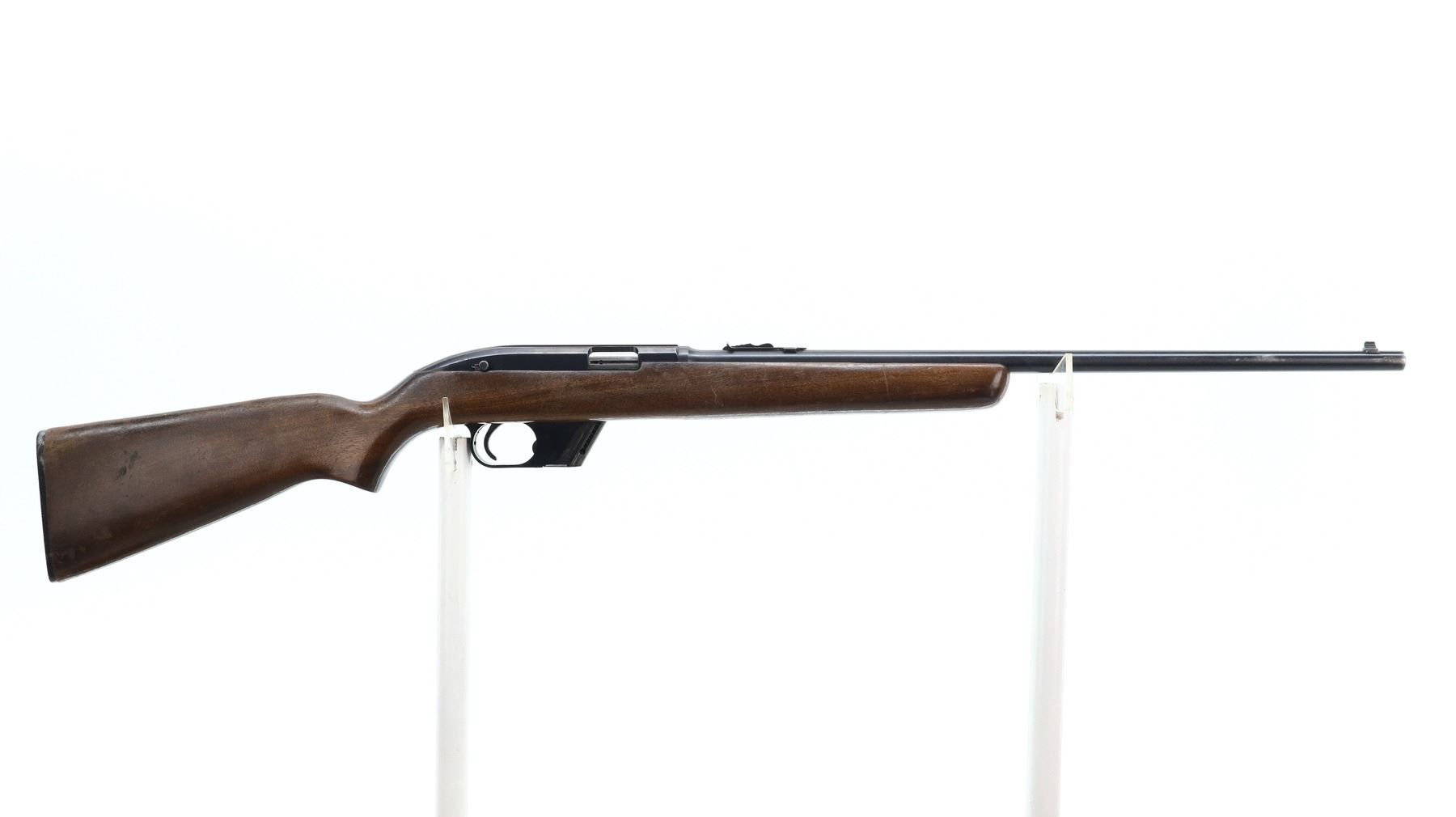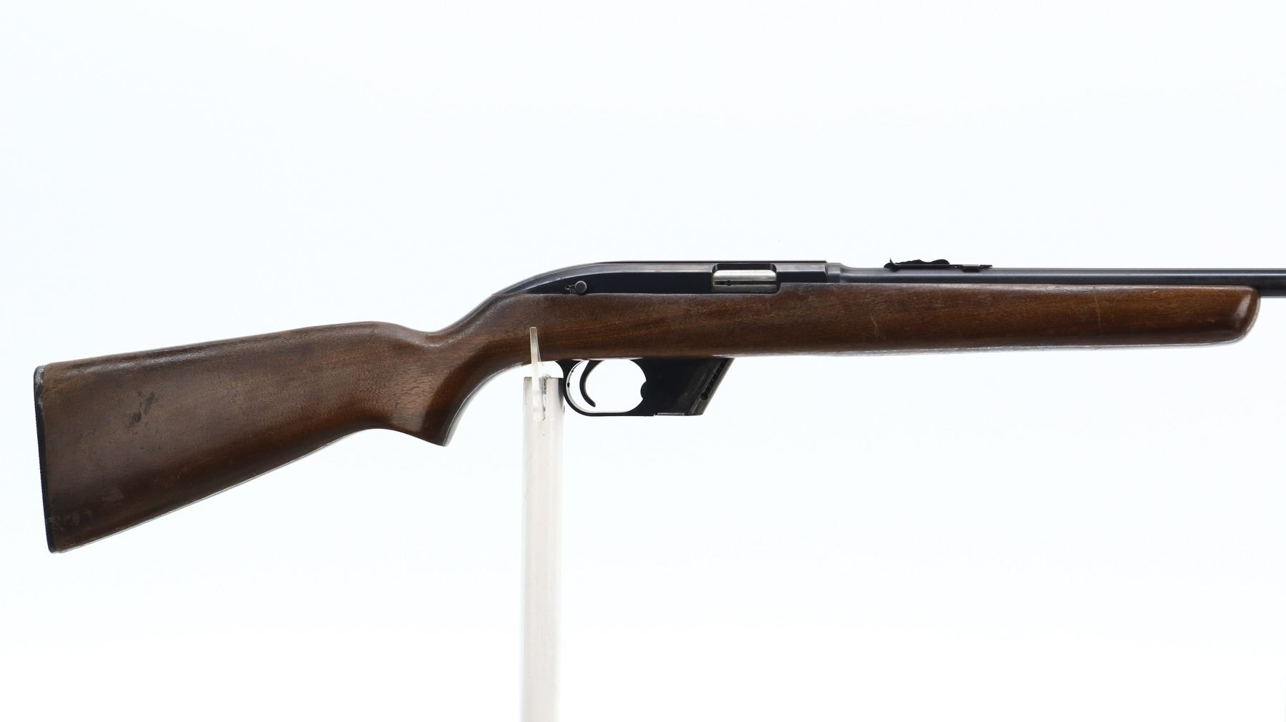 5/10, WINCHESTER, MODEL: 77, CALIBER: 22 LR, COMES WITH MAGAZINE, BORE IS VERY GOOD. BLADE FRONT SIGHT. ADJUSTABLE U NOTCH REAR SIGHT. RECEIVER GROOVED FOR SCOPE MOUNT. ONE PIECE SMOOTH WOOD STOCK. PISTOL GRIP. CHECKERED BLACK POLYMER BUTT PLATE. METAL FINISH SHOWS SOME LIGHT RUST SPECKLES, SCRATCHES, HANDLING MARKS AND WEAR. STOCK SHOWS SOME MARKS, SCRATCHES AND WEAR. ACTION: SEMI AUTOMATIC RIFLE, BARREL LENGTH: 22", SERIAL # 124683, CONDITION: 5/10, CLASS: CANADIAN NON RESTRICTED