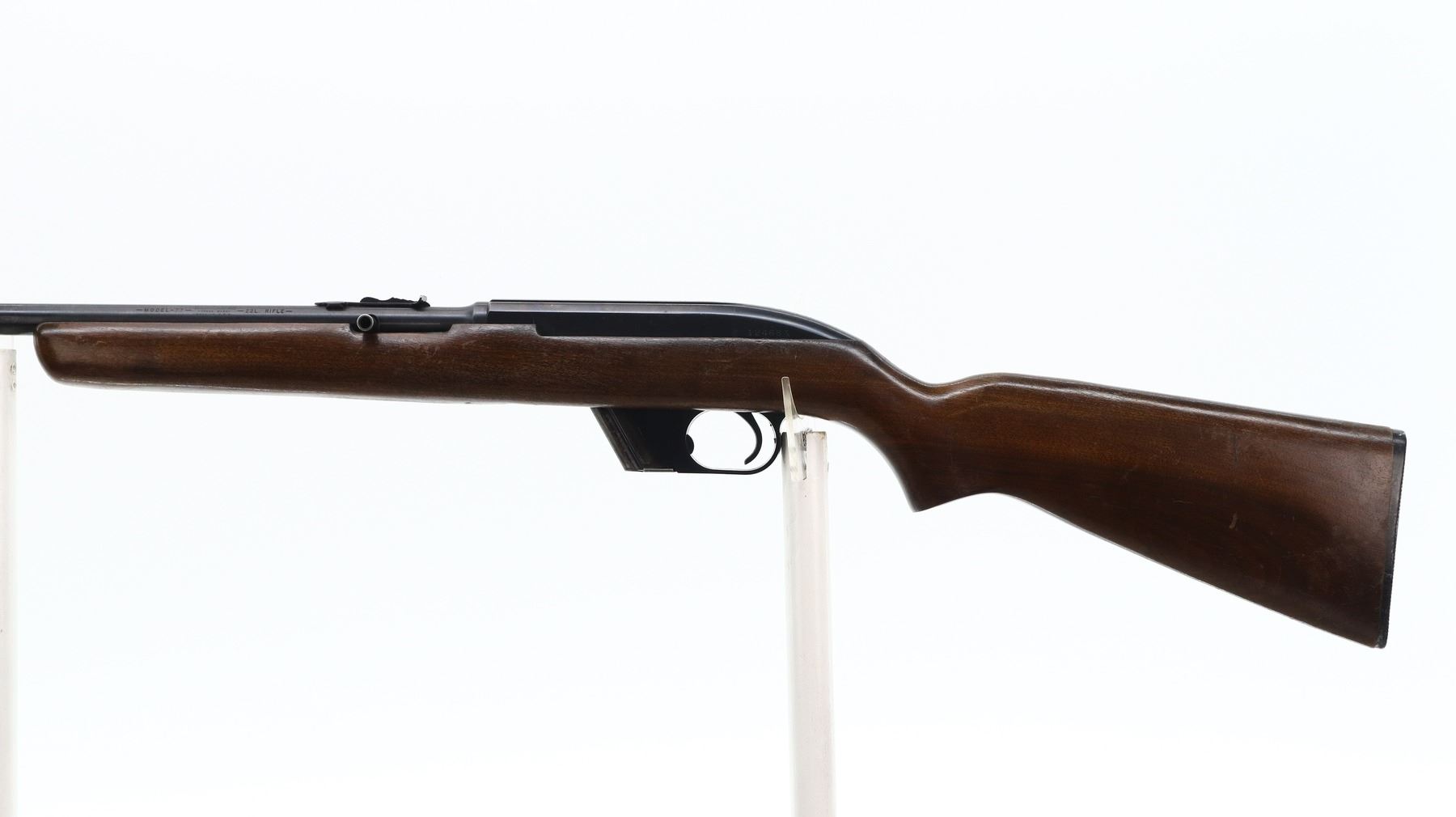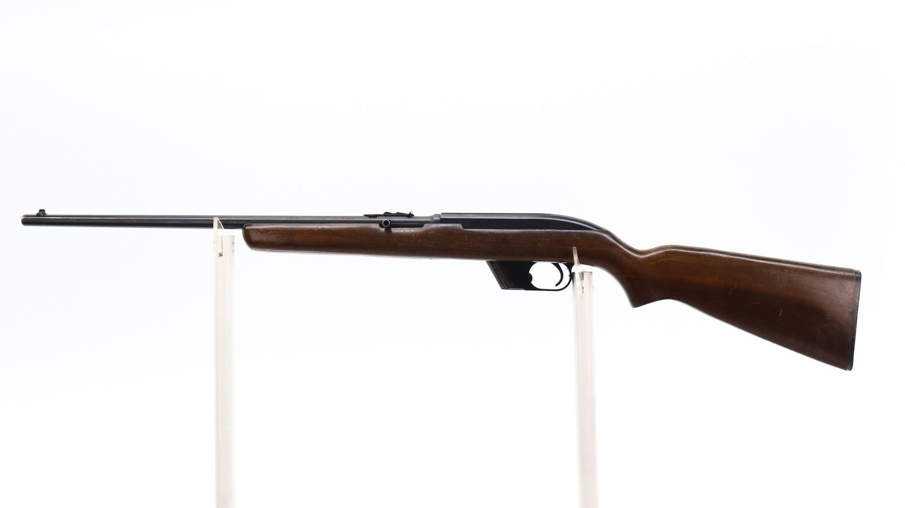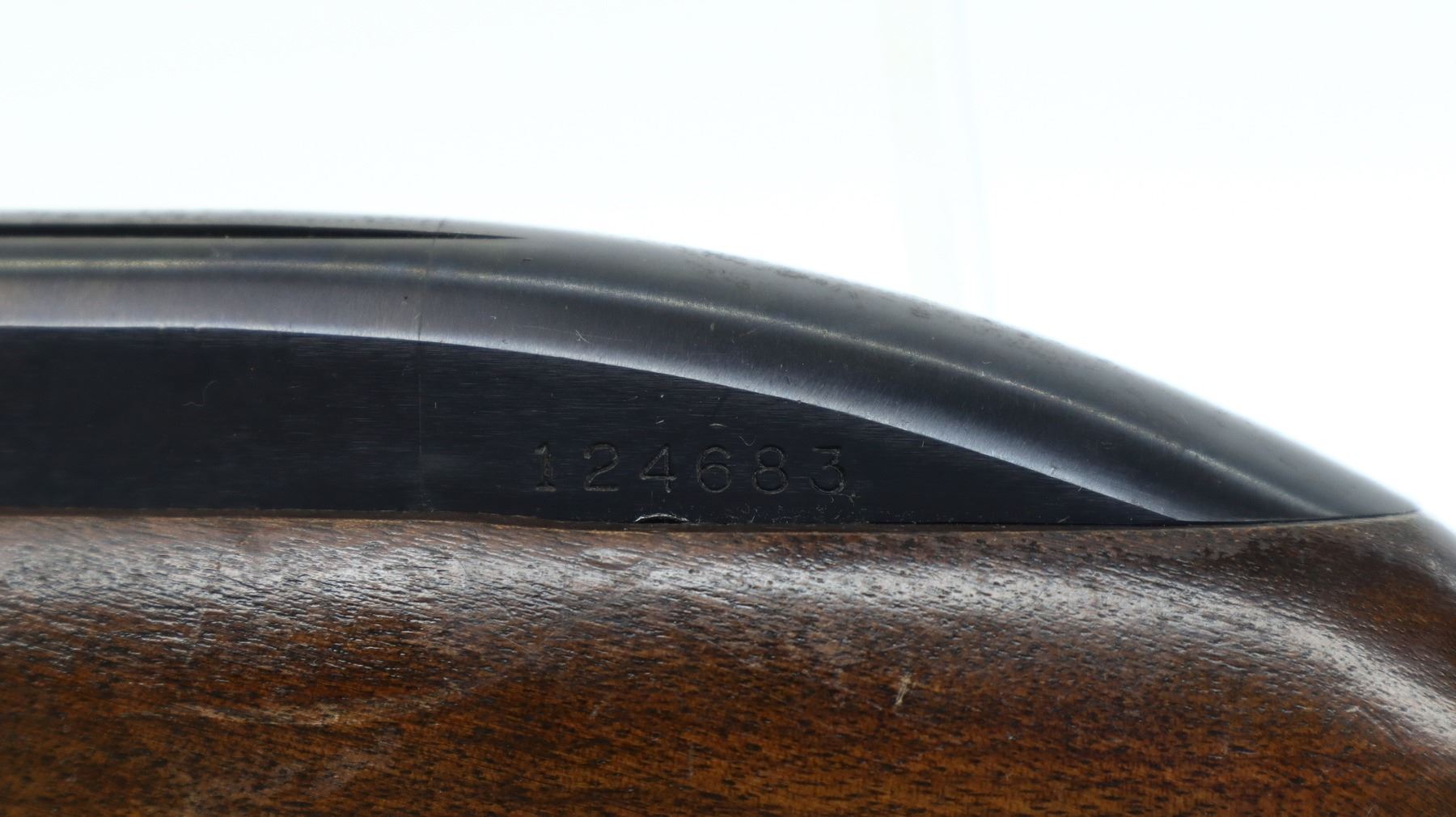 5/10, WINCHESTER, MODEL: 77, CALIBER: 22 LR, COMES WITH MAGAZINE, BORE IS VERY GOOD. BLADE FRONT SIGHT. ADJUSTABLE U NOTCH REAR SIGHT. RECEIVER GROOVED FOR SCOPE MOUNT. ONE PIECE SMOOTH WOOD STOCK. PISTOL GRIP. CHECKERED BLACK POLYMER BUTT PLATE. METAL FINISH SHOWS SOME LIGHT RUST SPECKLES, SCRATCHES, HANDLING MARKS AND WEAR. STOCK SHOWS SOME MARKS, SCRATCHES AND WEAR. ACTION: SEMI AUTOMATIC RIFLE, BARREL LENGTH: 22", SERIAL # 124683, CONDITION: 5/10, CLASS: CANADIAN NON RESTRICTED