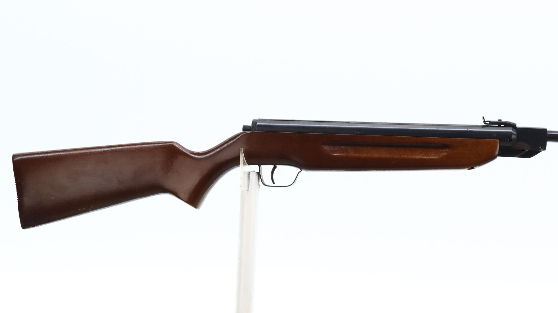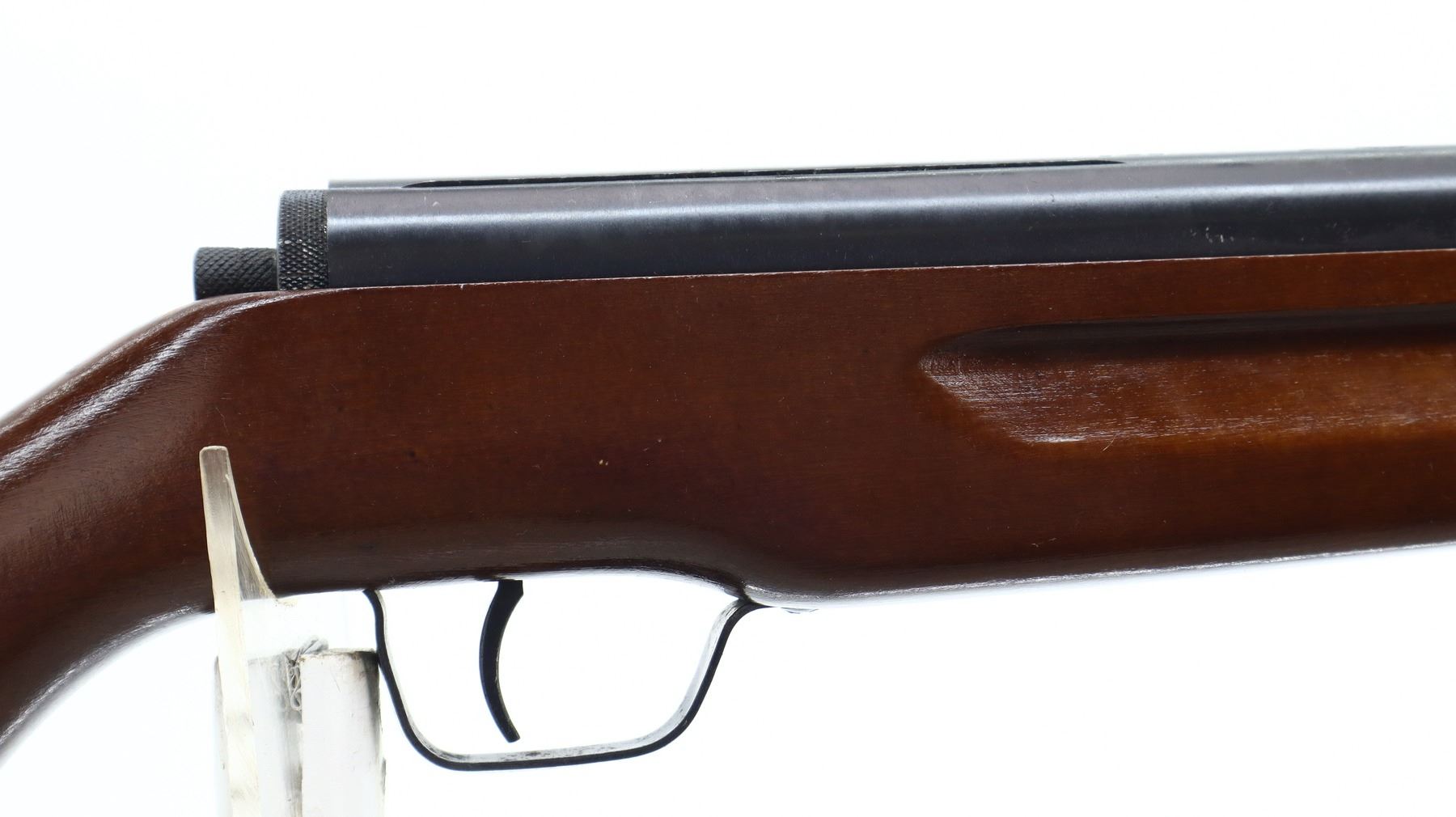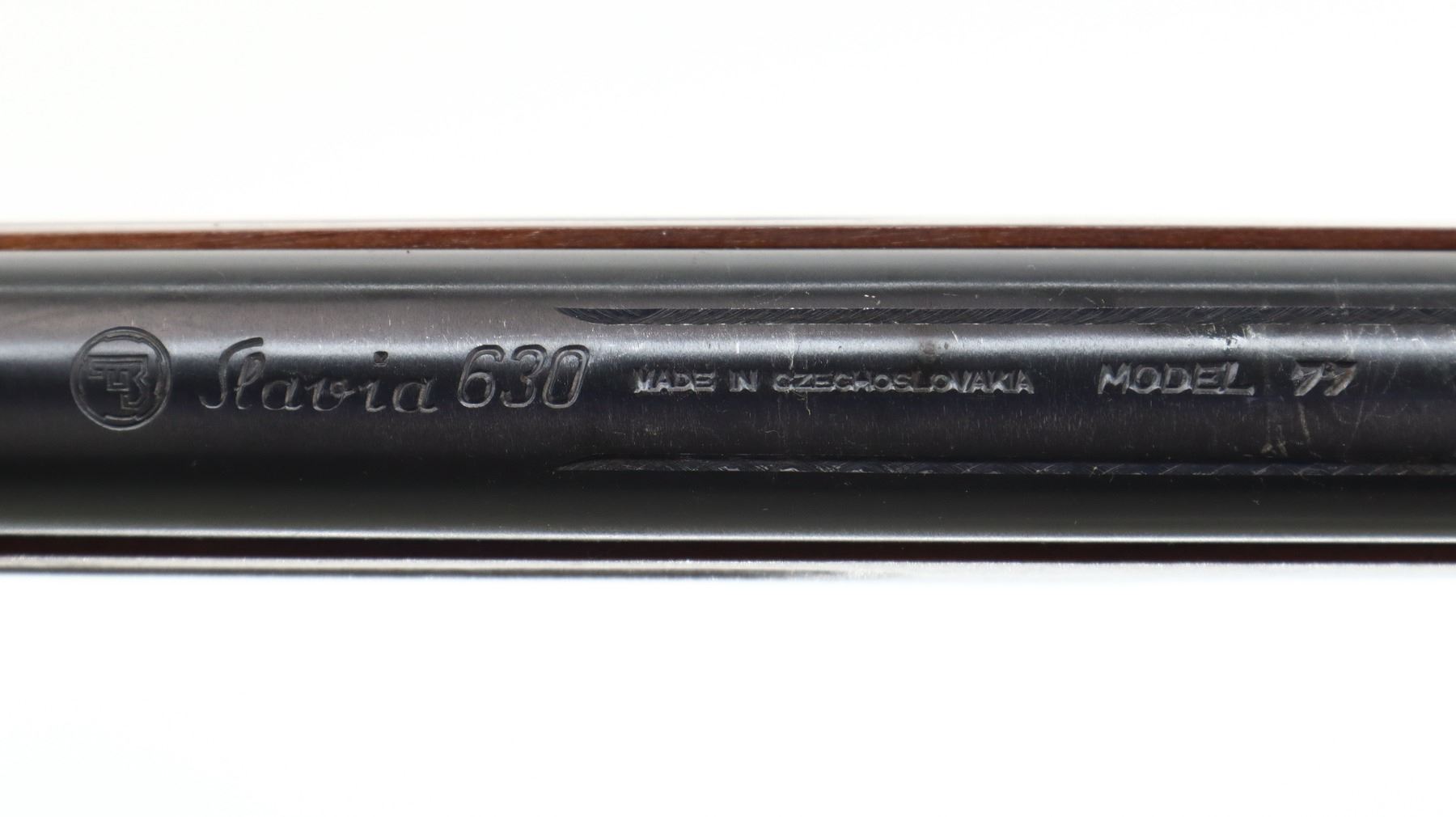 4/10, GECO SLAVIA , MODEL: 630-77, CALIBER: 22 CAL PELLET , BORE IS VERY GOOD. MISSING FRONT SIGHT. ADJUSTABLE U NOTCH REAR SIGHT. BLUED FINISH. RECEIVER GROOVED FOR SCOPE MOUNT. ONE PIECE SMOOTH WOOD STOCK. FINGER GROOVED FOREND. PISTOL GRIP. GROOVED BUTT. METAL FINISH SHOWS SOME LIGHT RUST SPOTS, SCRATCHES, HANDLING MARKS AND WEAR. STOCKS SHOWS MARKS, SCRATCHES AND WEAR. ACTION: HINGE BREAK AIR RIFLE , BARREL LENGTH: 21", SERIAL # 498531, CONDITION: 4/10, CLASS: CANADIAN NON RESTRICTED