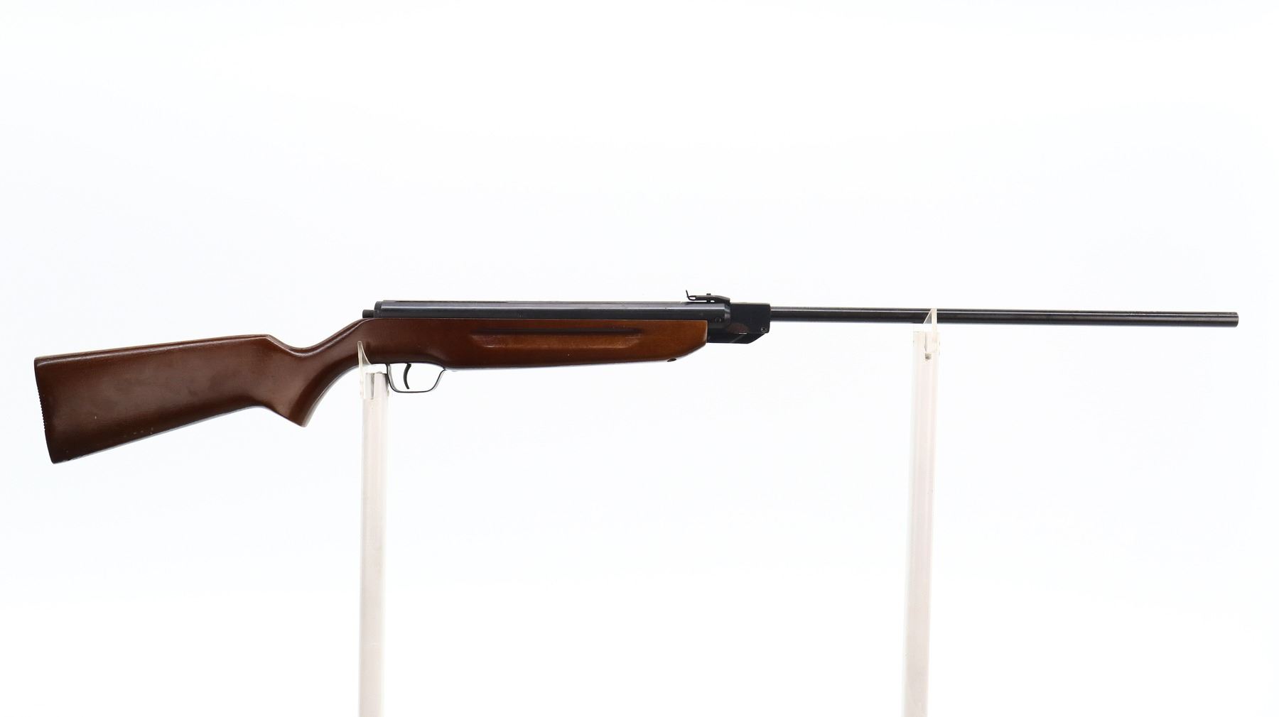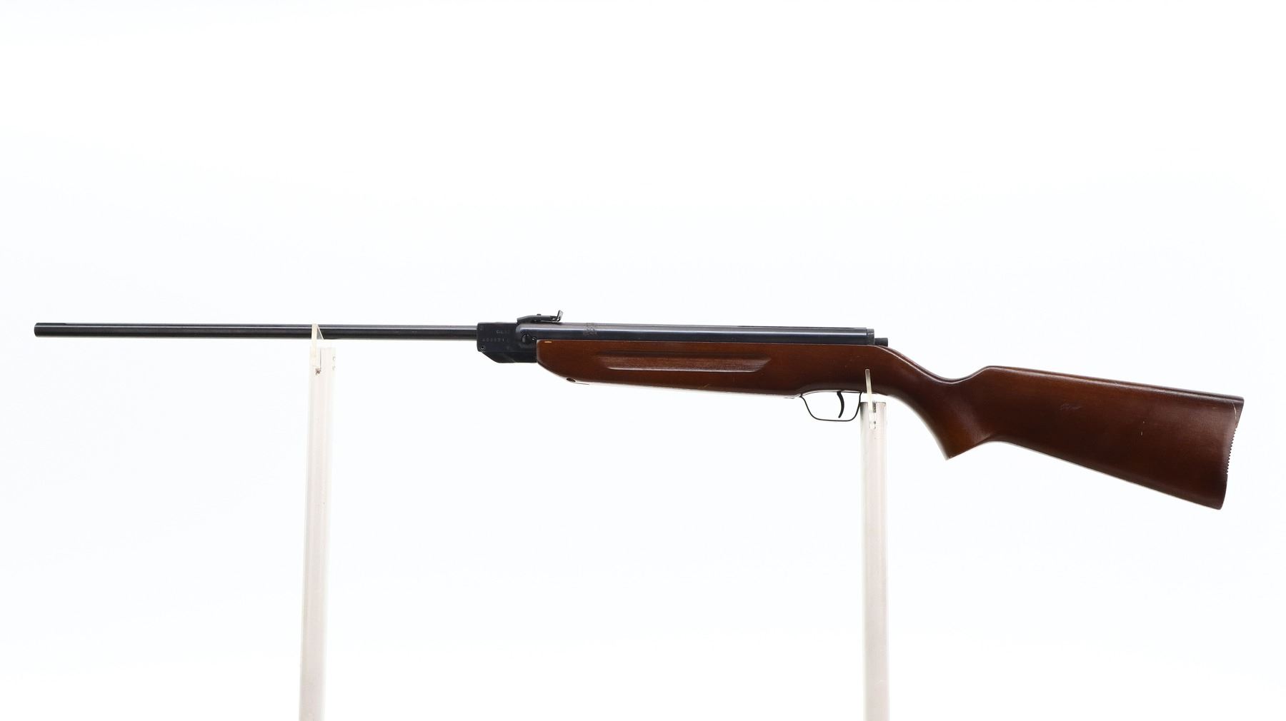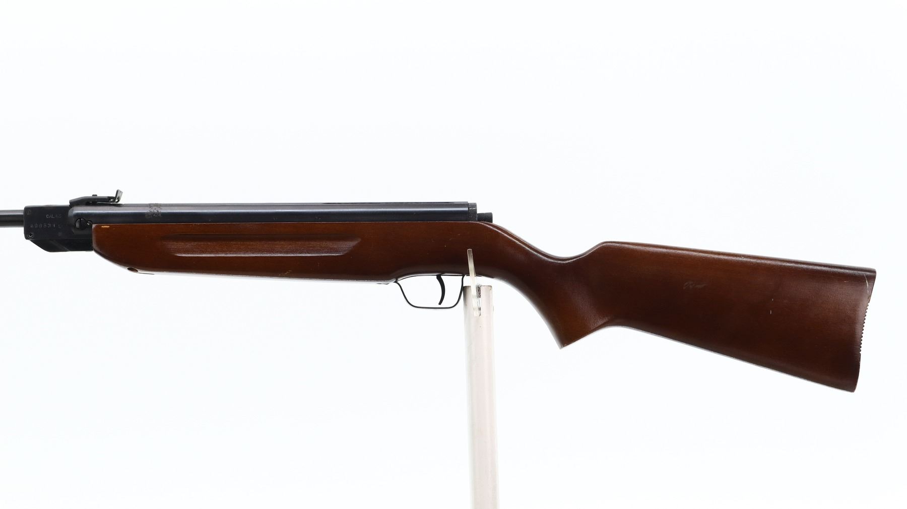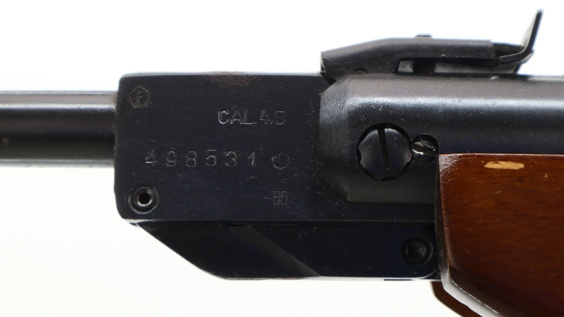 4/10, GECO SLAVIA , MODEL: 630-77, CALIBER: 22 CAL PELLET , BORE IS VERY GOOD. MISSING FRONT SIGHT. ADJUSTABLE U NOTCH REAR SIGHT. BLUED FINISH. RECEIVER GROOVED FOR SCOPE MOUNT. ONE PIECE SMOOTH WOOD STOCK. FINGER GROOVED FOREND. PISTOL GRIP. GROOVED BUTT. METAL FINISH SHOWS SOME LIGHT RUST SPOTS, SCRATCHES, HANDLING MARKS AND WEAR. STOCKS SHOWS MARKS, SCRATCHES AND WEAR. ACTION: HINGE BREAK AIR RIFLE , BARREL LENGTH: 21", SERIAL # 498531, CONDITION: 4/10, CLASS: CANADIAN NON RESTRICTED