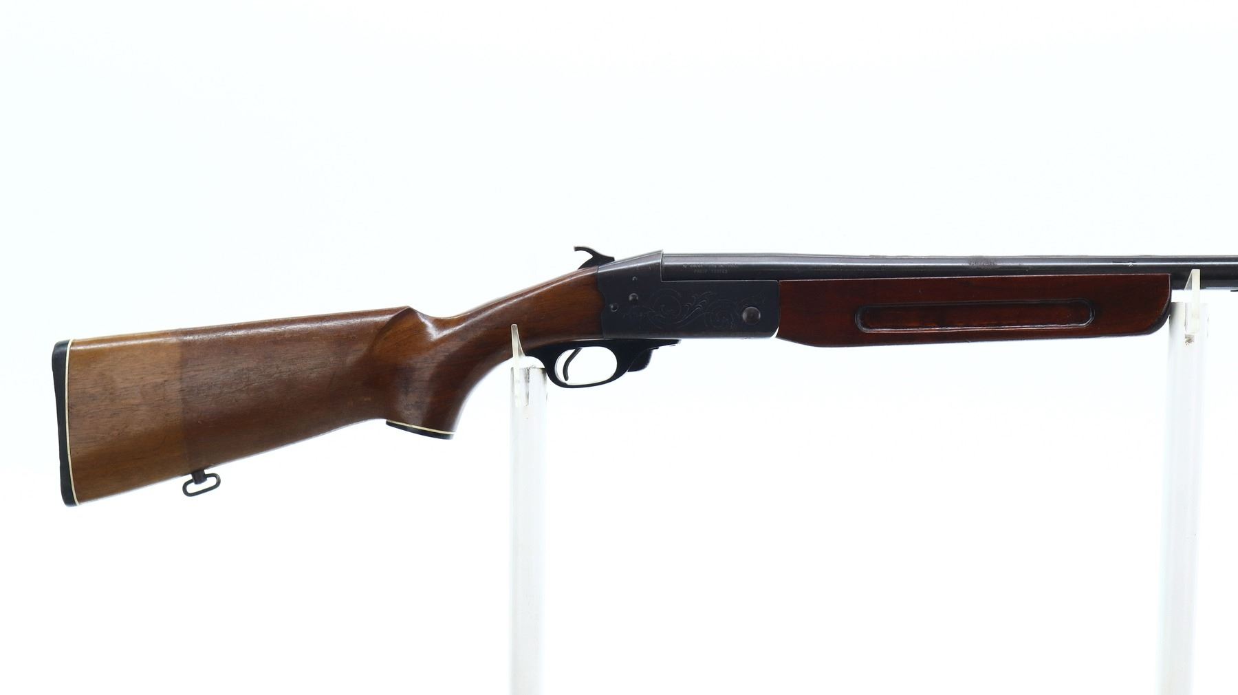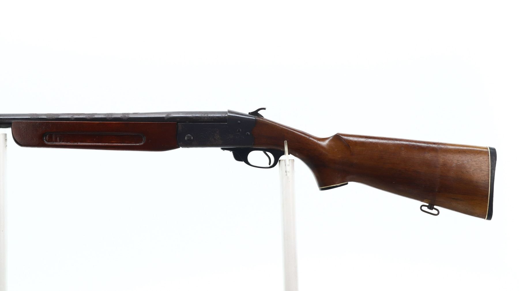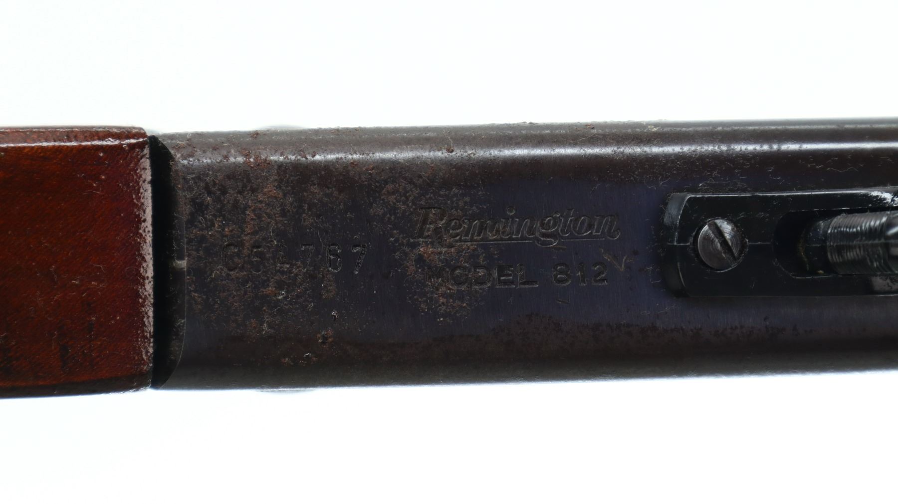 2/10, REMINGTON, MODEL: 812, CALIBER: 12 G X 2 3/4", BORE IS GOOD. FIXED FULL CHOKE. BRASS BEAD. ROUND BARREL. GROOVED SPUR HAMMER. EJECTOR. TWO PIECE SMOOTH WOOD STOCKS. REPLACED FOREND WITH FINGER GROOVE. PISTOL GRIP, CRACKED BEHIND THE RECEIVER. GROOVED BLACK POLYMER BUTT PLATE. GRIP CAP. SLING SWIVELS. METAL FINISH SHOWS RUST. SCRATCHES, HANDLING MARKS AND WEAR. STOCKS SHOW MARKS, SCRATCHES AND WEAR. ACTION: HINGE SINGLE SHOT SHOTGUN , BARREL LENGTH: 30", SERIAL # C54767, CONDITION: 2/10, CLASS: CANADIAN NON RESTRICTED