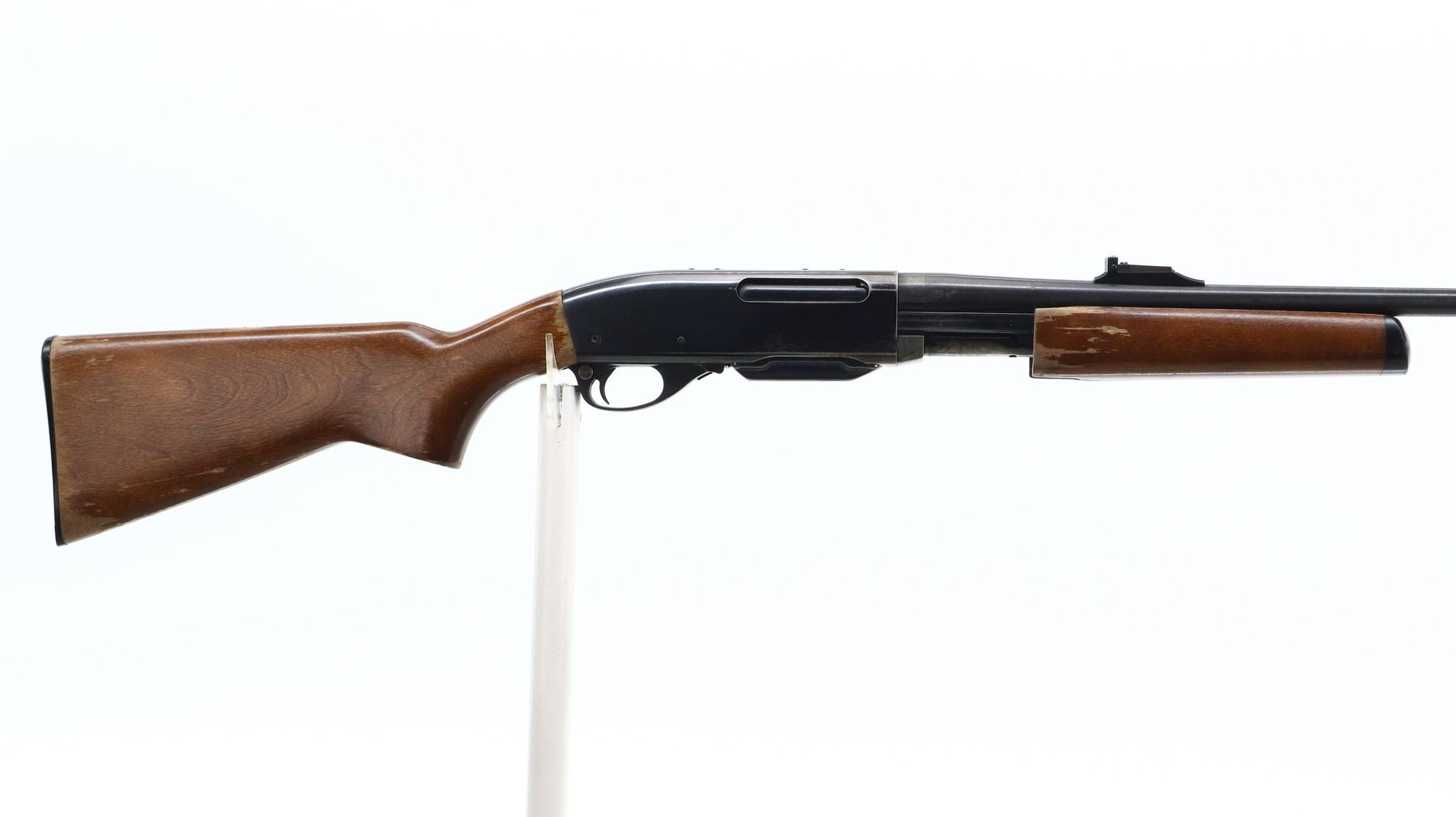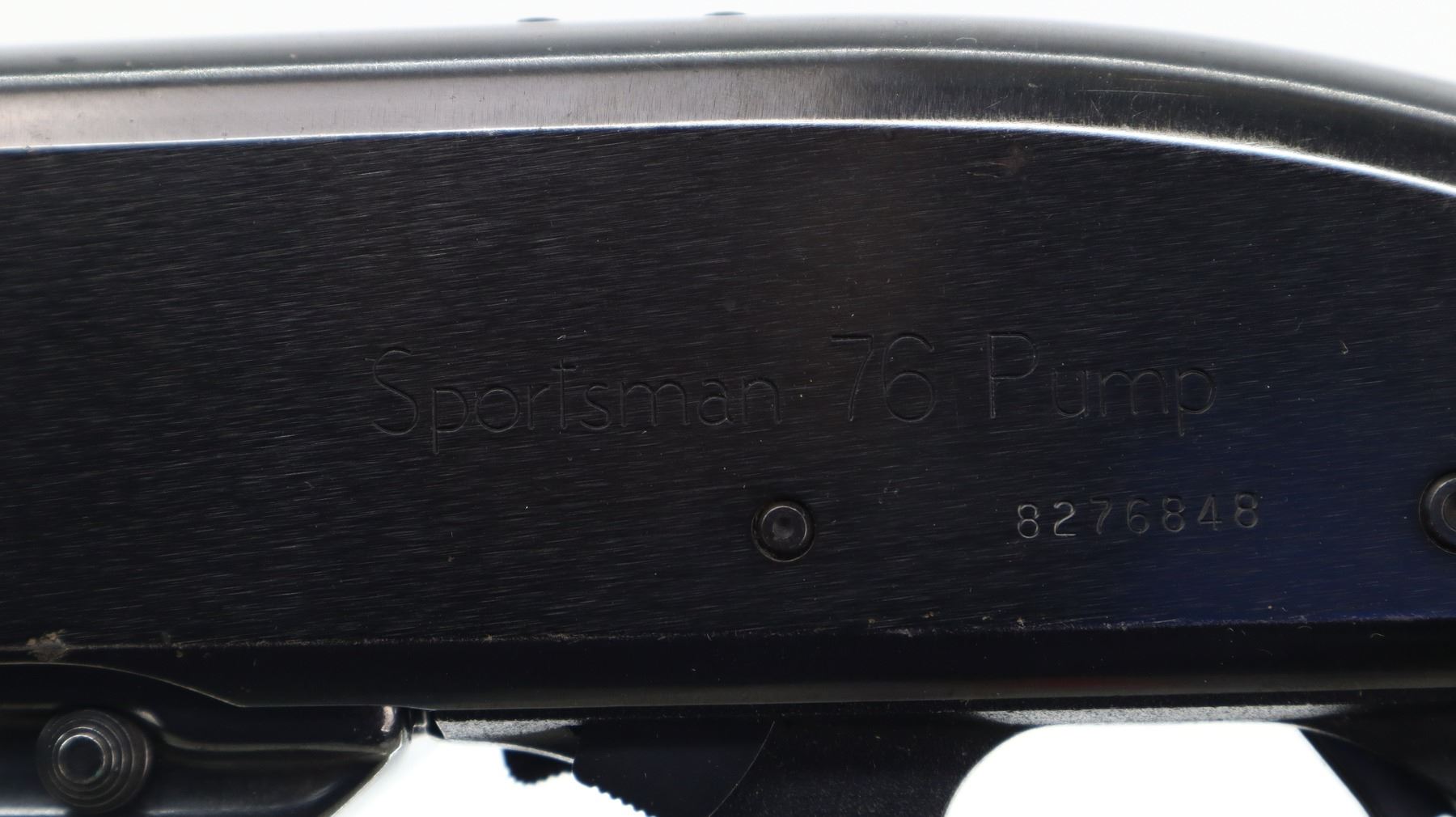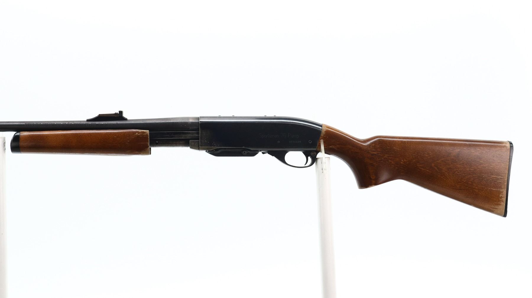 6/10, REMINGTON, MODEL: 76 PUMP, CALIBER:30-06 SPRG, COMES WITH MAGAZINE AND MANUAL. BORE IS VERY GOOD. BLADE FRONT SIGHT WITH RAMP, ADJUSTABLE U NOTCHED REAR SIGHT, BLUED FINISH, RECEIVER DRILLED AND TAPPED FOR SCOPE MOUNT WITH PLUG SCREWS INSTALLED. TWO PIECE SMOOTH WOOD STOCKS, PISTOL GRIP, CHECKERED BLACK POLYMER BUTT PLATE. METAL FINISH SHOWS A FEW LIGHT PITTED SPOTS, RUST SPECKLES, SCRATCHES, HANDLING MARKS AND WEAR. STOCKS SHOW MARKS, SCRATCHES AND WEAR. , ACTION: PUMP ACTION RIFLE, BARREL LENGTH: 22", SERIAL # 8276848, CONDITION: 6/10, CLASS: CANADIAN NON RESTRICTED